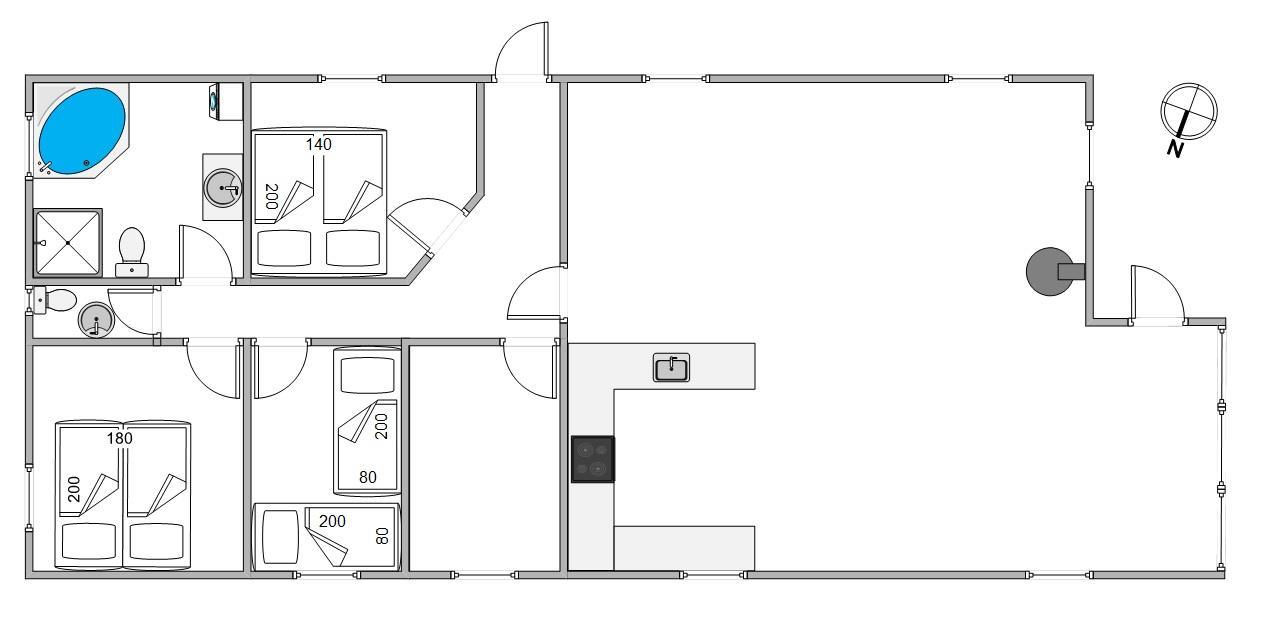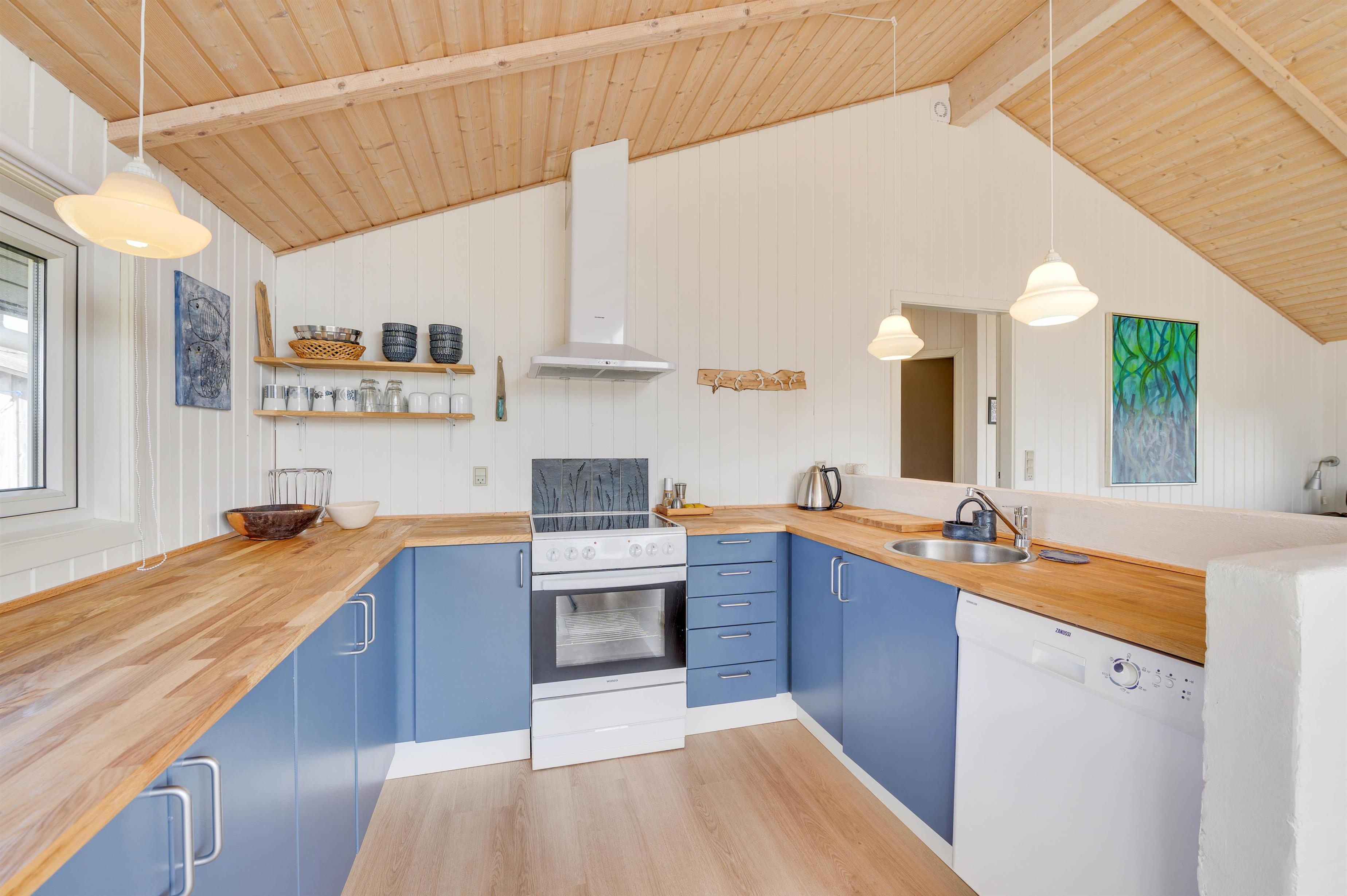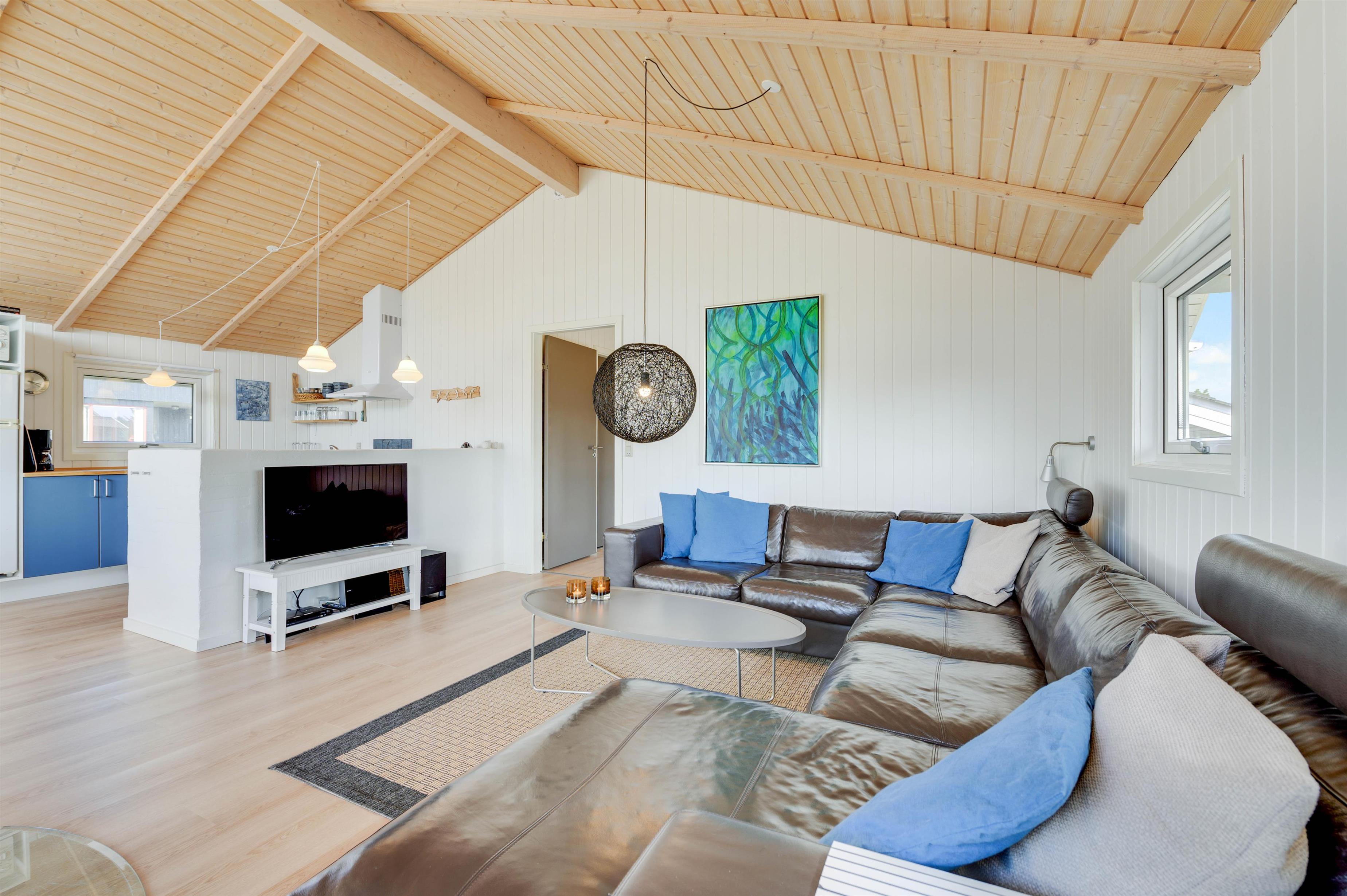 Sommerhusets hjerte er det åbne opholdsrum med integreret køkken. Her kan hele familien samles til en masse skønne feriestunder langt væk fra hverdagens ståhej. Brændeovn, energibesparende varmepumpe og et varmeflytningsanlæg sørger for, at I altid har en god temperatur og en hyggelig ferieatmosfære.