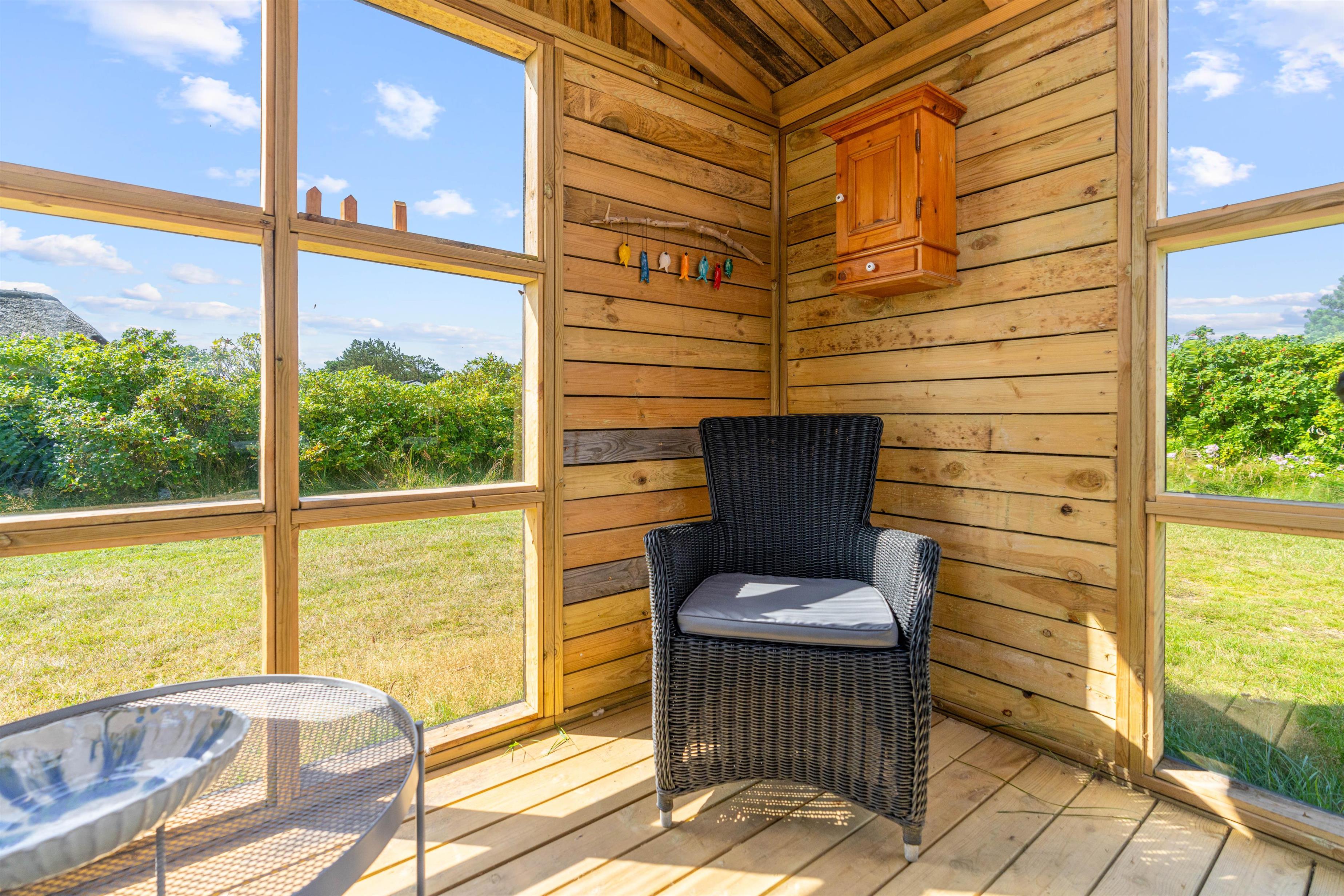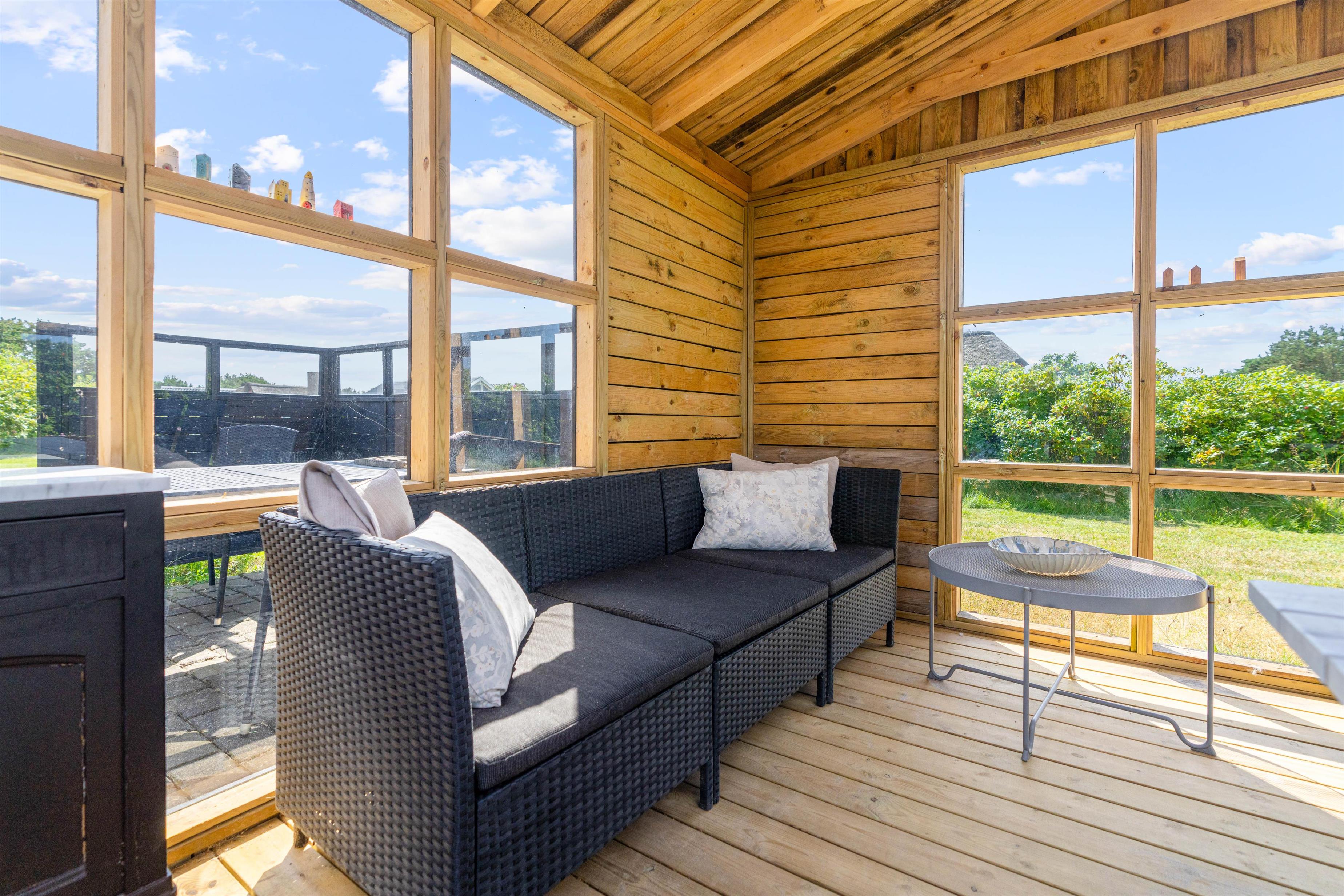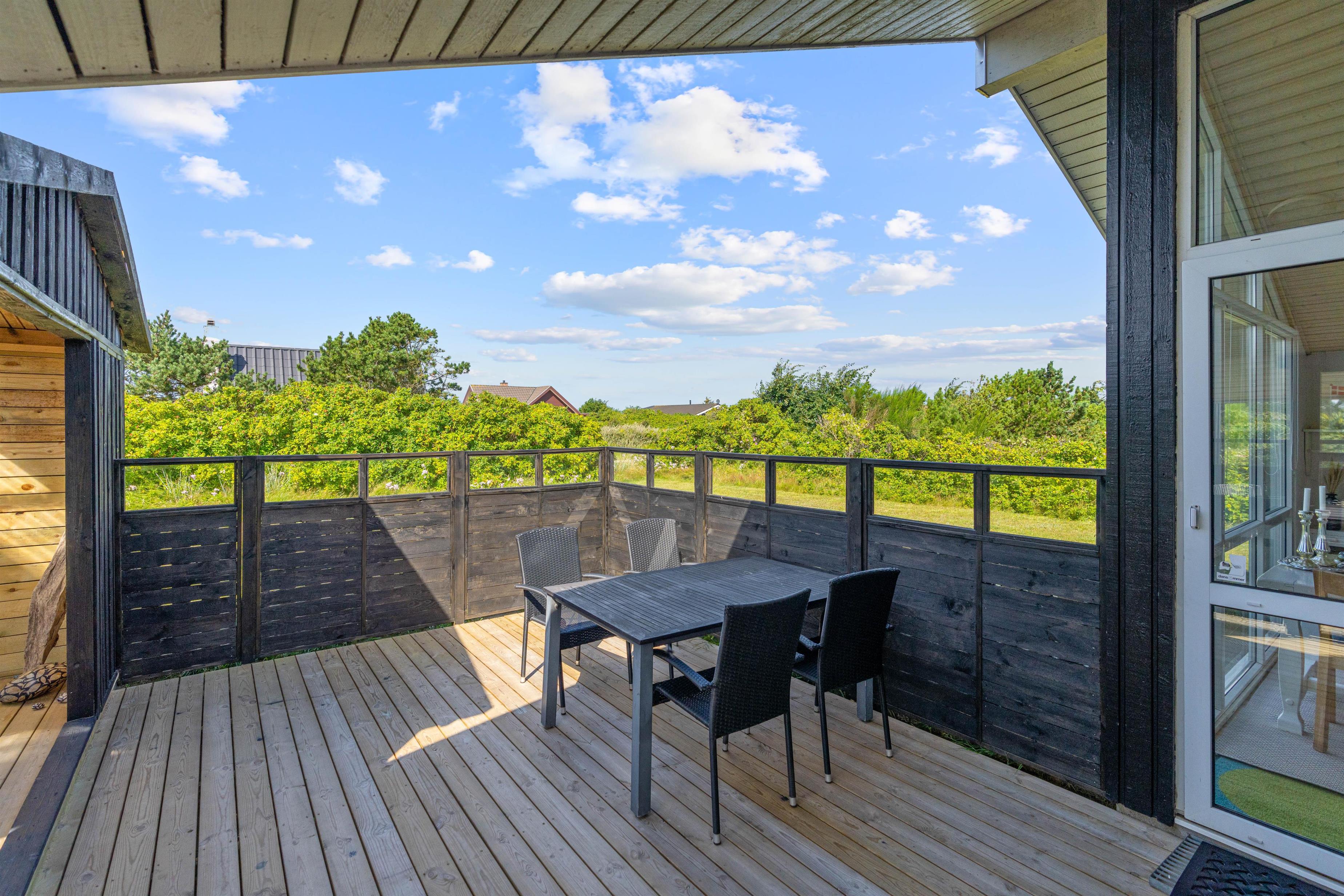 Med til feriehuset hører et skønt udeareal. Rundt om feriehuset finder I flere hyggelige siddekroge, blandt andet en lukket og delvist overdækket terrasse, hvor I uden problemer kan lade hundene trække frisk luft, mens I slapper af i solen.