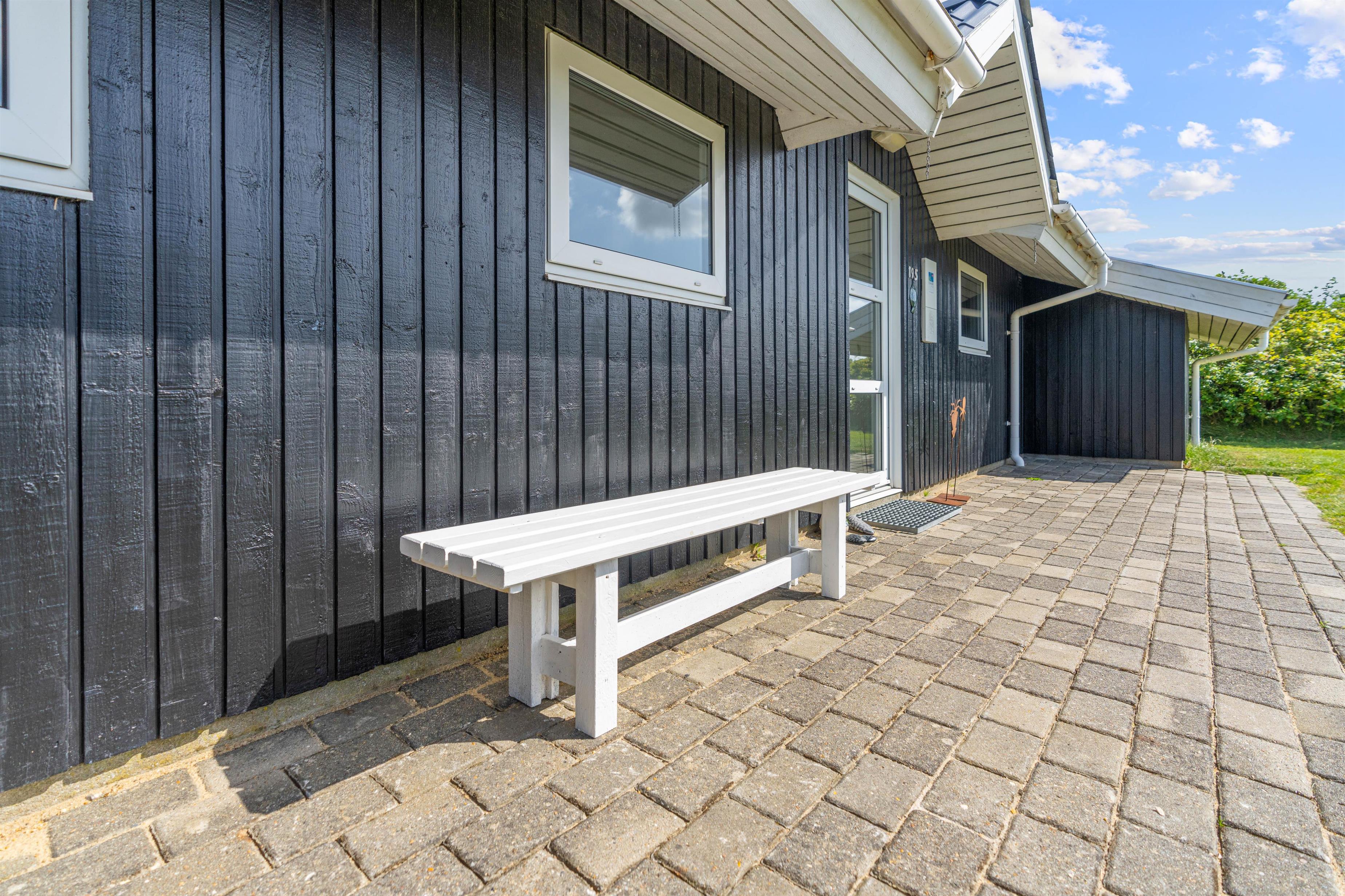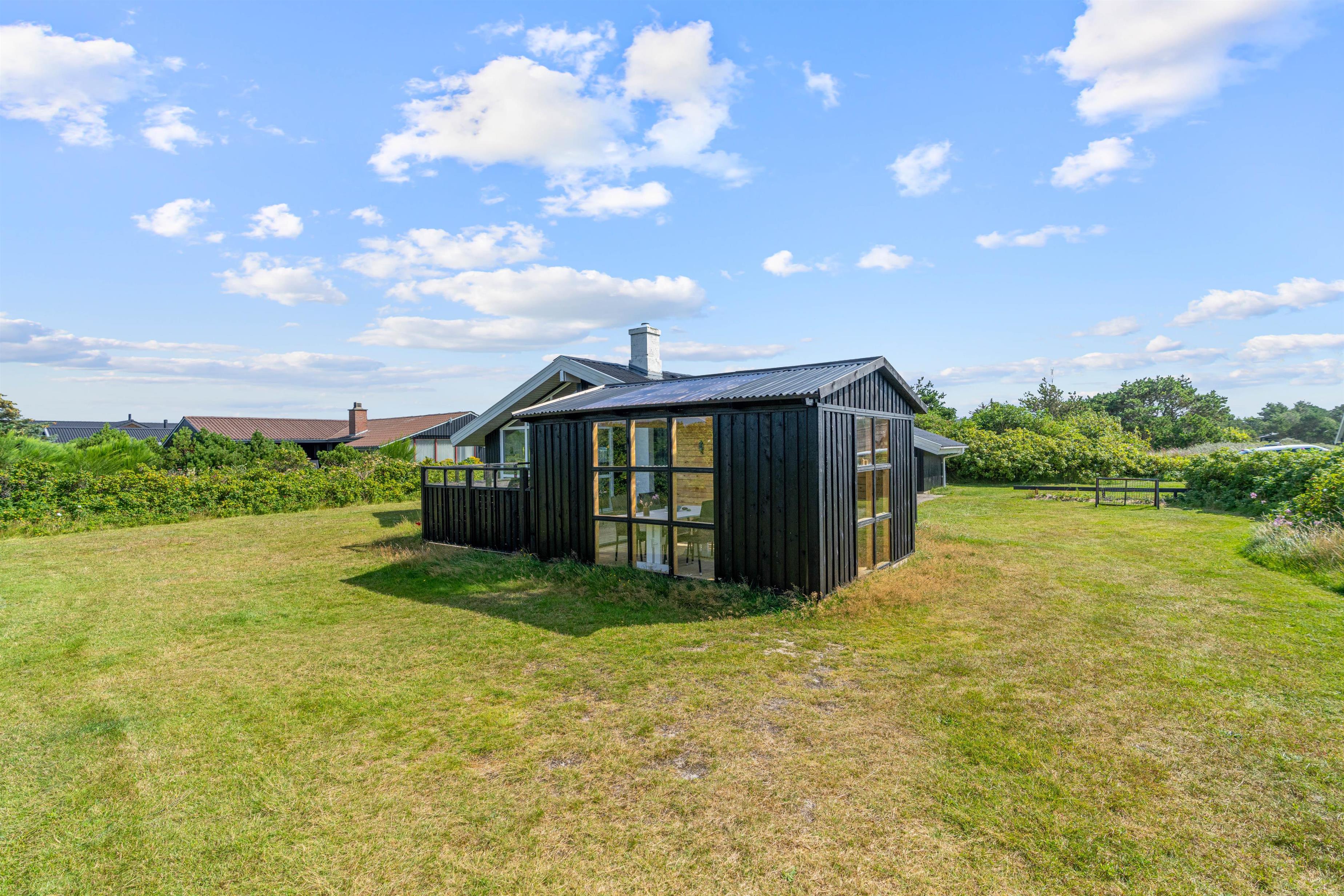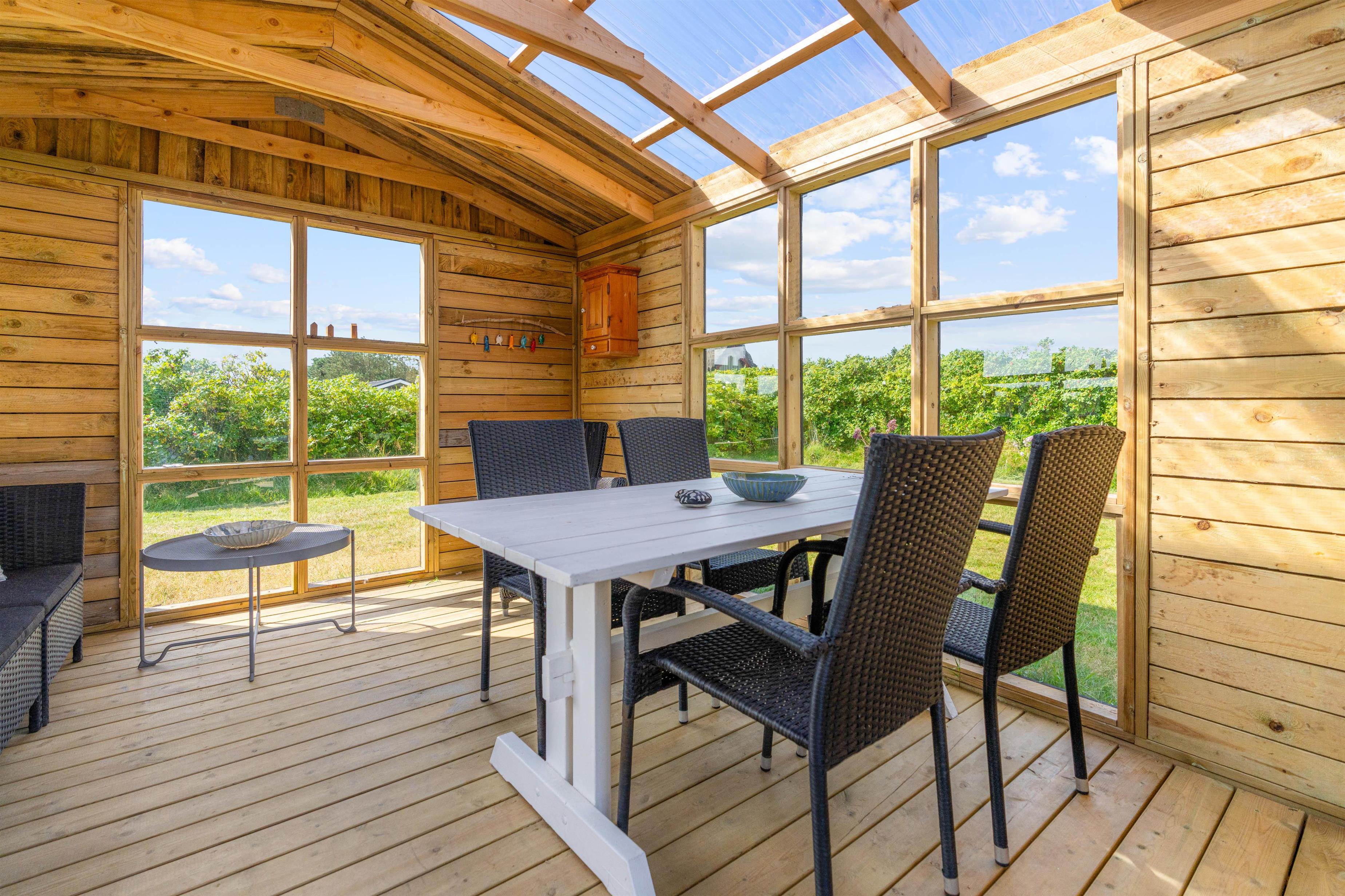 Med til feriehuset hører et skønt udeareal. Rundt om feriehuset finder I flere hyggelige siddekroge, blandt andet en lukket og delvist overdækket terrasse, hvor I uden problemer kan lade hundene trække frisk luft, mens I slapper af i solen.