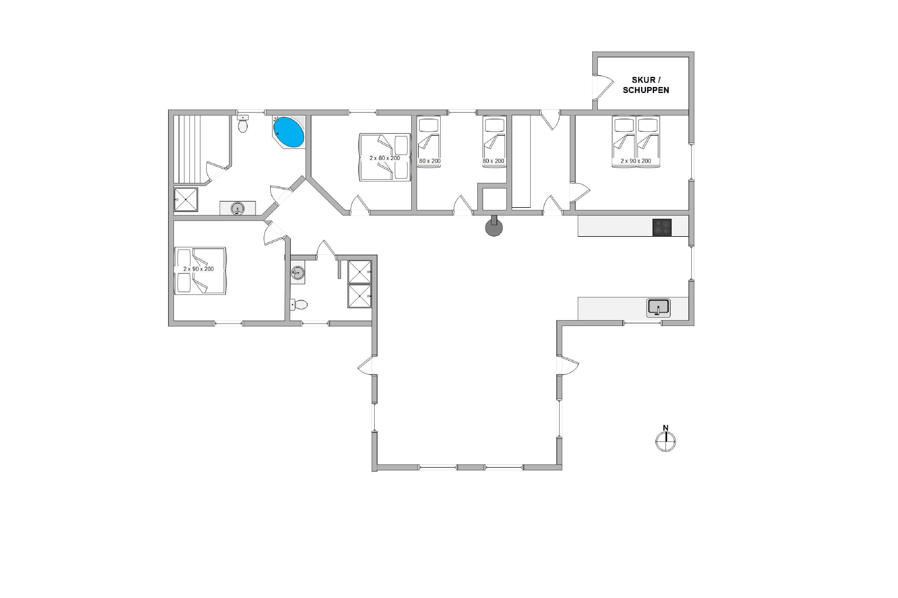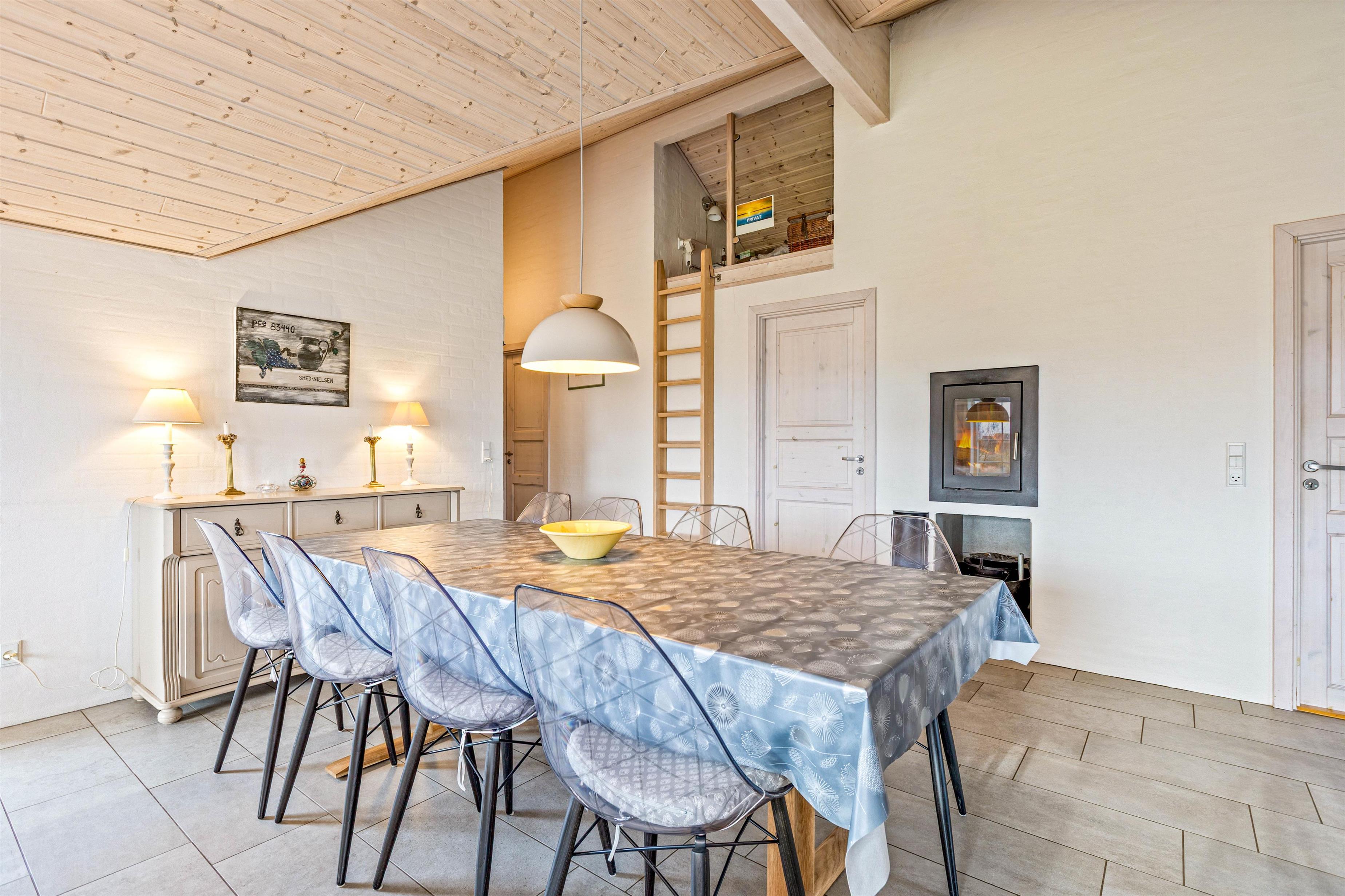 Sommerhuset er præget af en hyggelig og velindrettet stil, her er der både plads til hyggeligt samvær og feriestemning med familien. Midt i sommerhuset er køkkenalrummet placeret, hvor alle kan samles under måltiderne, men her kan sjove spilleaftener, planlægning af udflugter eller tilberedning af lækre måltider også foregå.