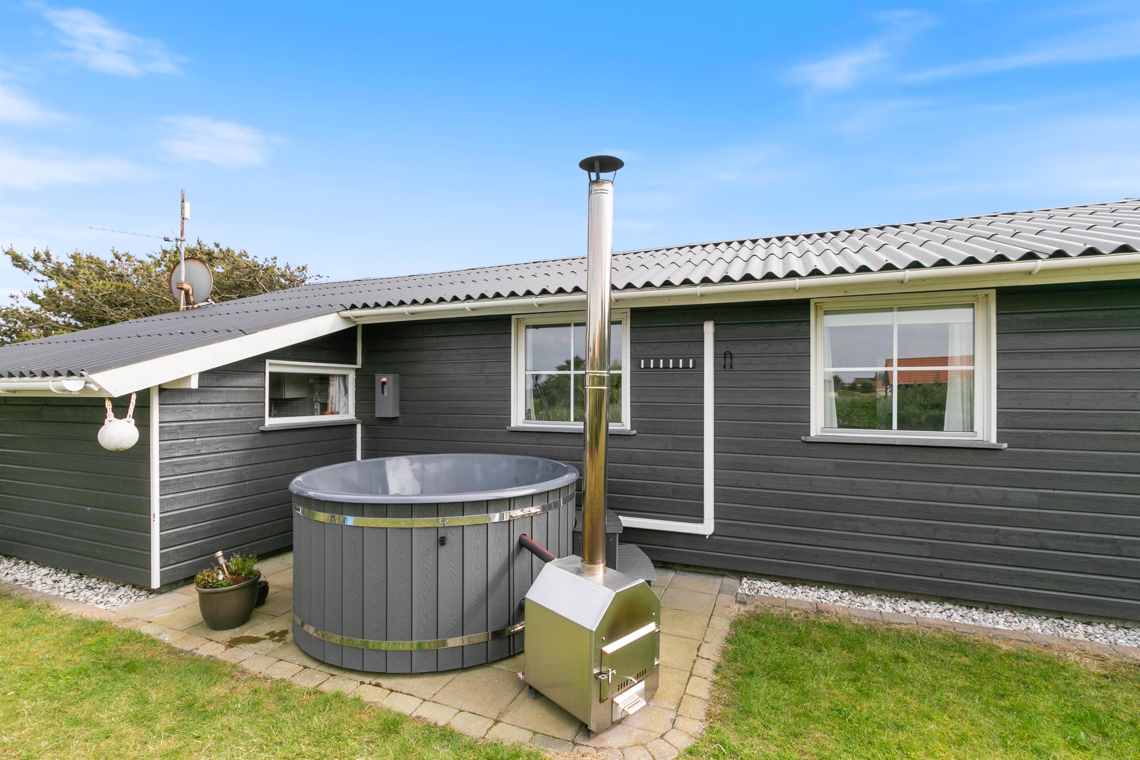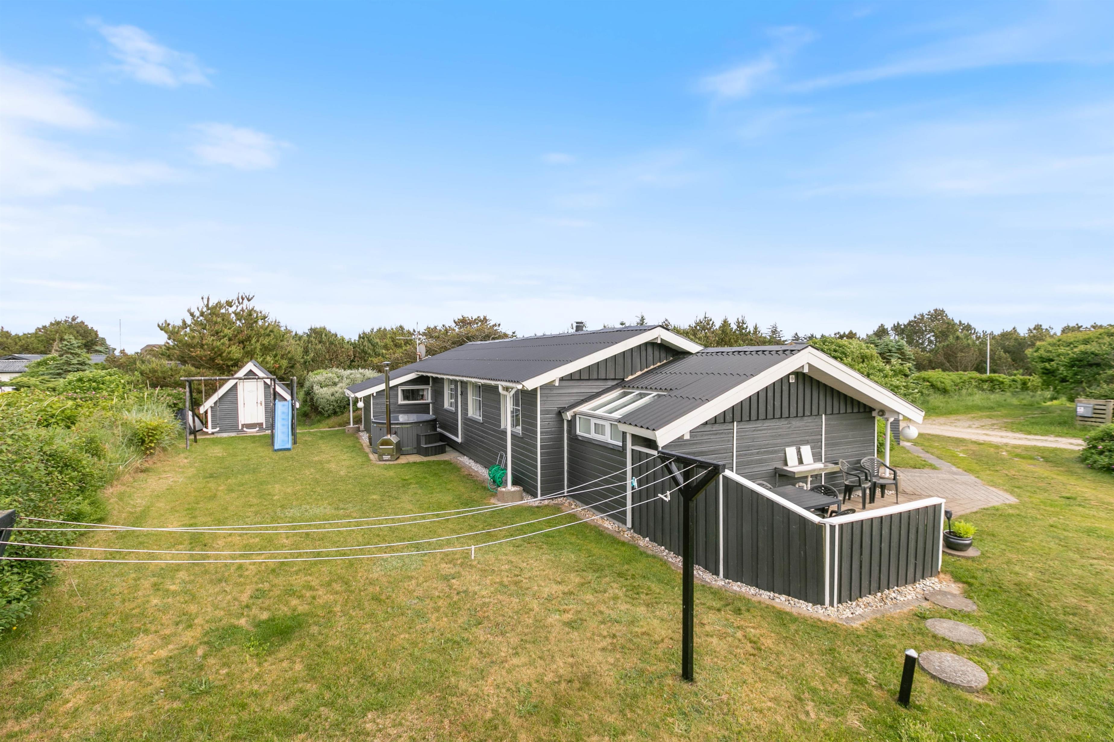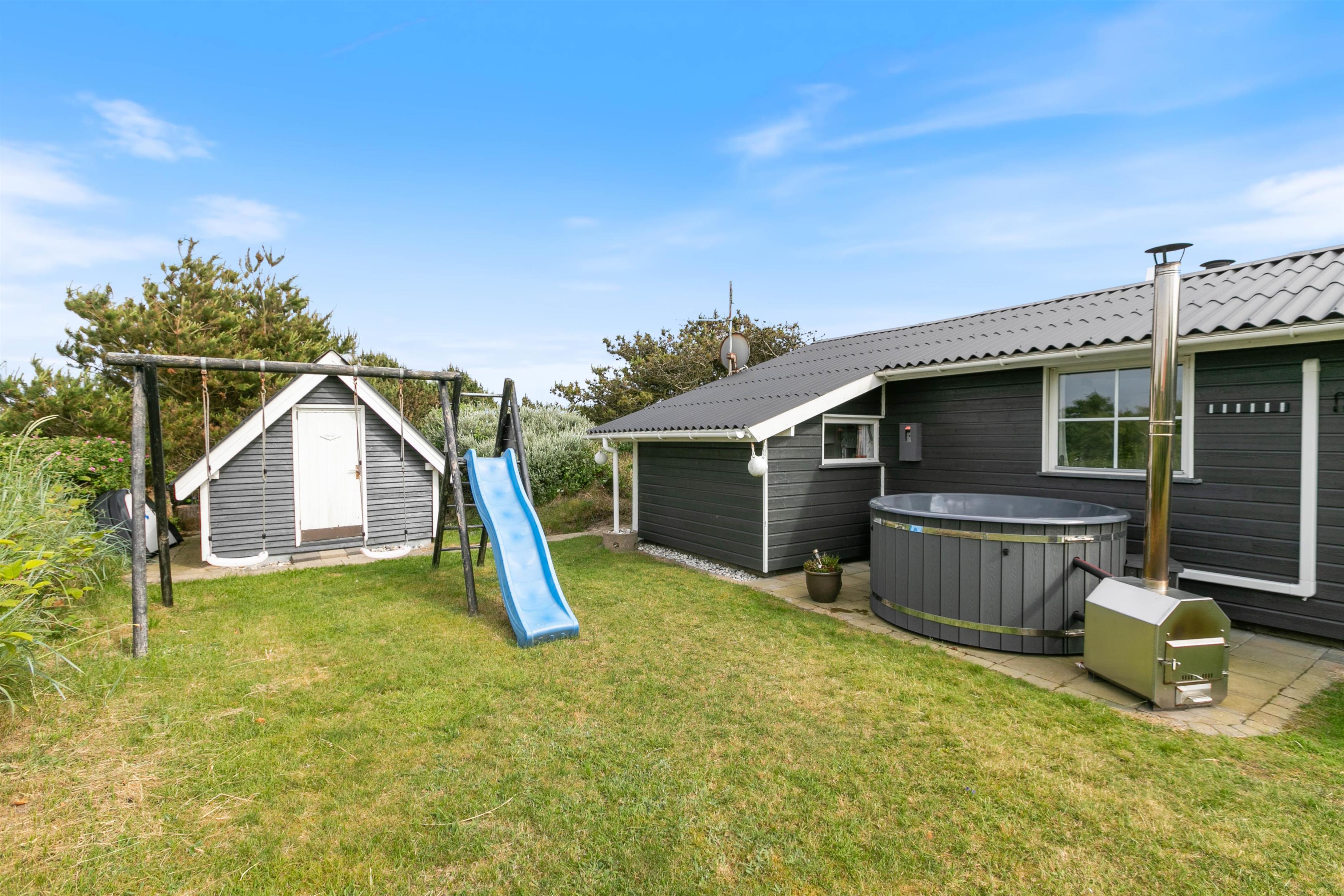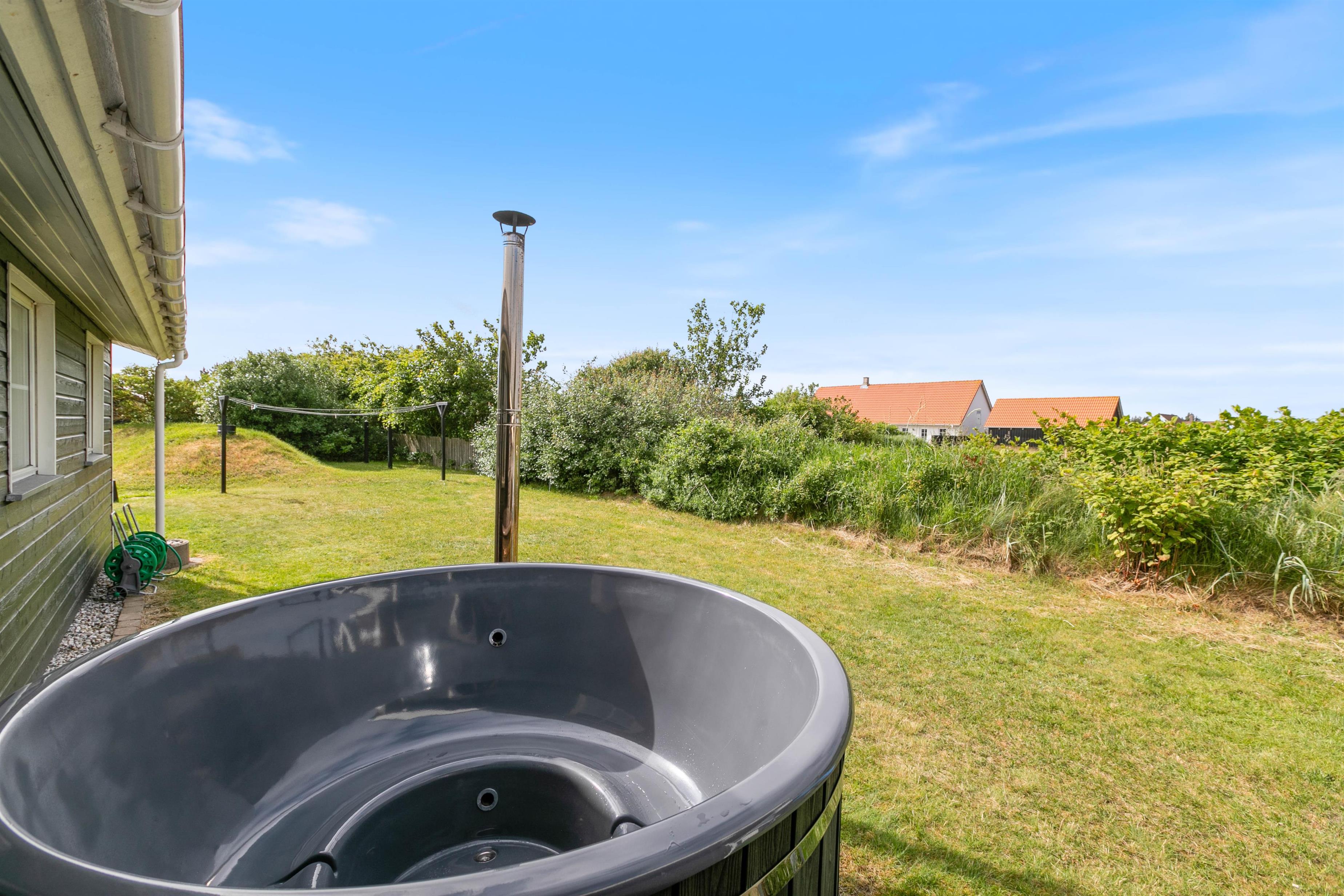 Når I trænger til frisk luft, kan I sætte jer ud i vildmarksbadet, og nyde den dejlige ro. Udenfor finder I også en dejlig terrasse med nogle hyggelige kroge, hvor der er plads til at I kan sidde og nyde vejret, imens børnene leger ved gyngen. Når vejret byder op til det, kan I rykke aftensmaden udenfor, og benytte jer af sommerhusets grill.