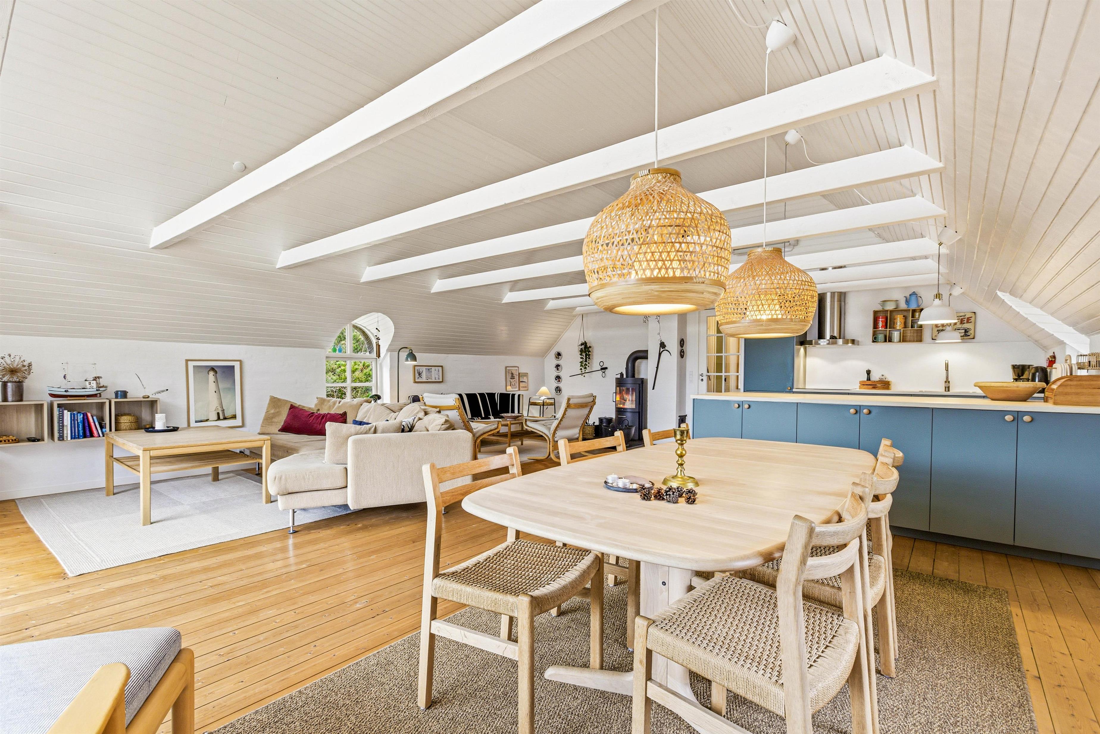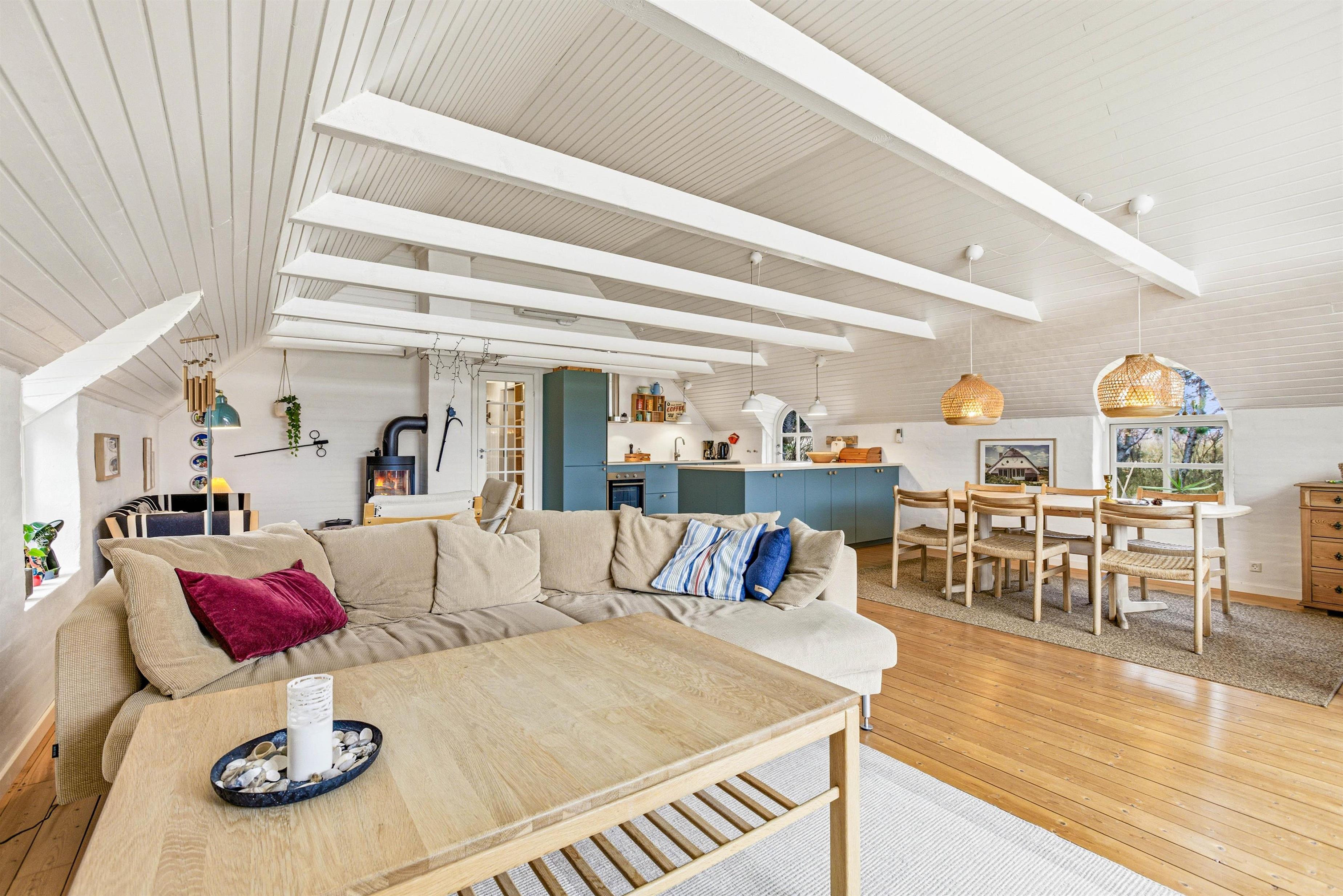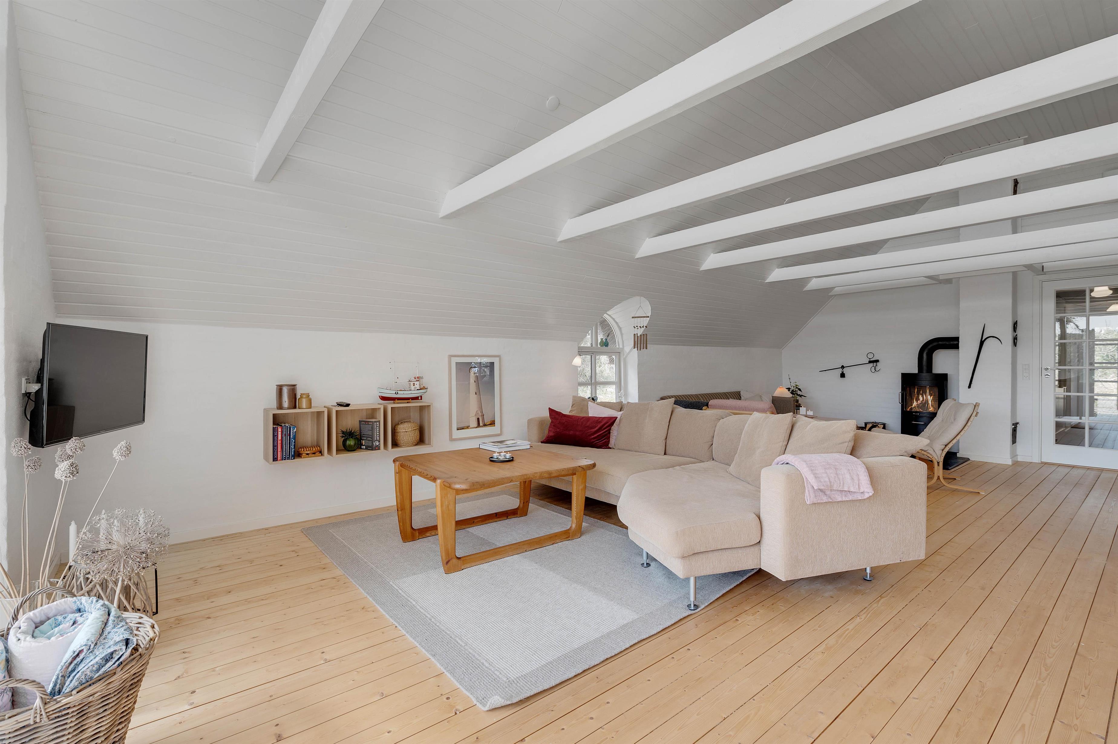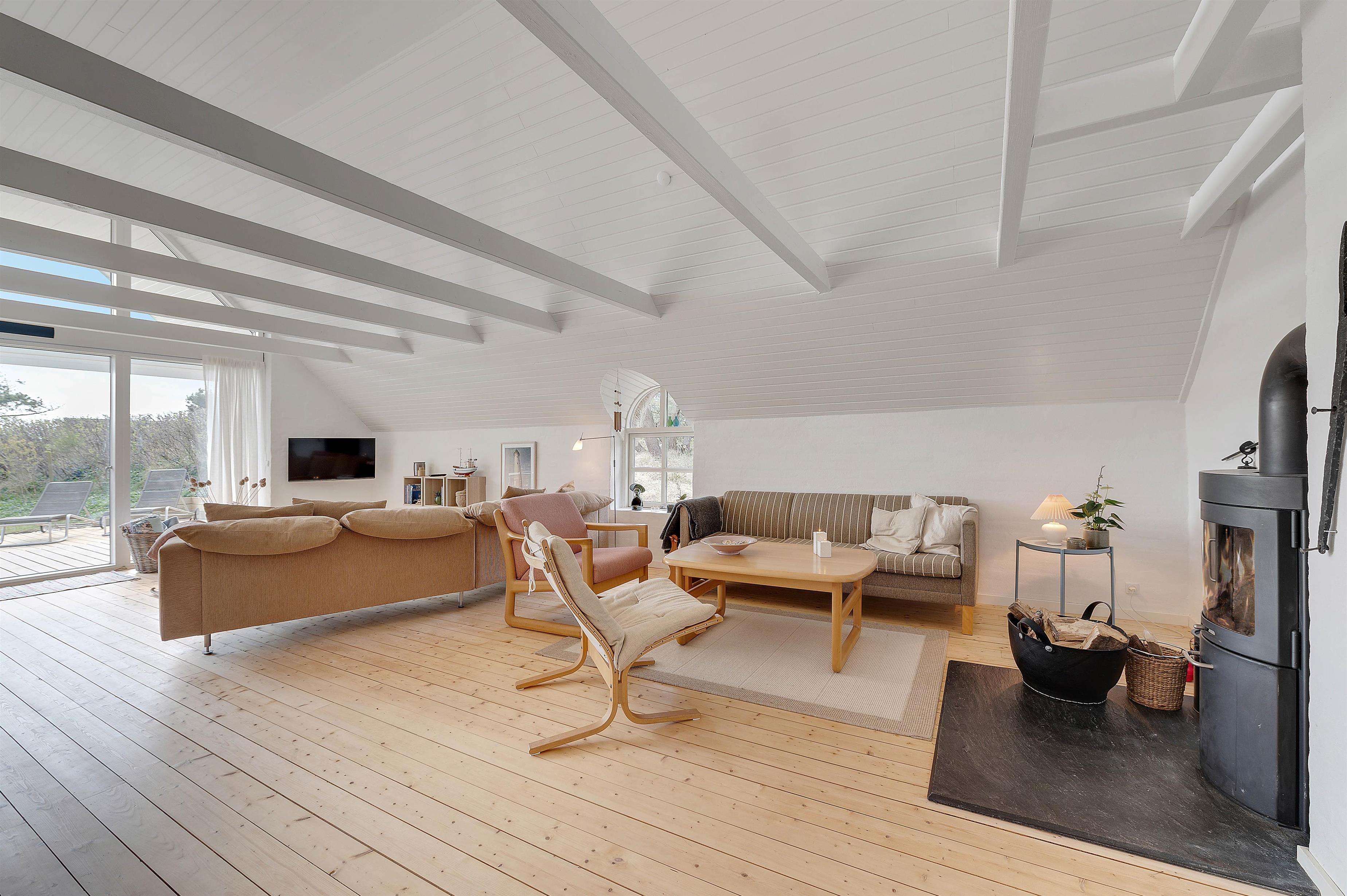 Ferieboligen råder over 3 soverum, hvor hvert rum er udstyret med 2 enkeltsenge. Sommerhusets hjerte er bestemt den store stue- og spiseafdeling mod syd, der ligger i åben forbindelse med køkkenet. Det hyggelige fællesrum kommer med garanti til at danne ramme om masser af gode ferieminder; i køkkenet kan I samles om madlavningen, og sofaafdelingen lægger op til afslapning og filmaftener, mens brændeovnen knitrer i baggrunden. Fjernsynet er udstyret med Chromecast, og feriehuset har en hurtig og stabil internetforbindelse, så I kan se alle jeres yndlingsfilm og -serier. Et stort vinduesparti i stuen sørger for et godt lysindfald og et kig til den omkringliggende og ikke mindst skønne natur.