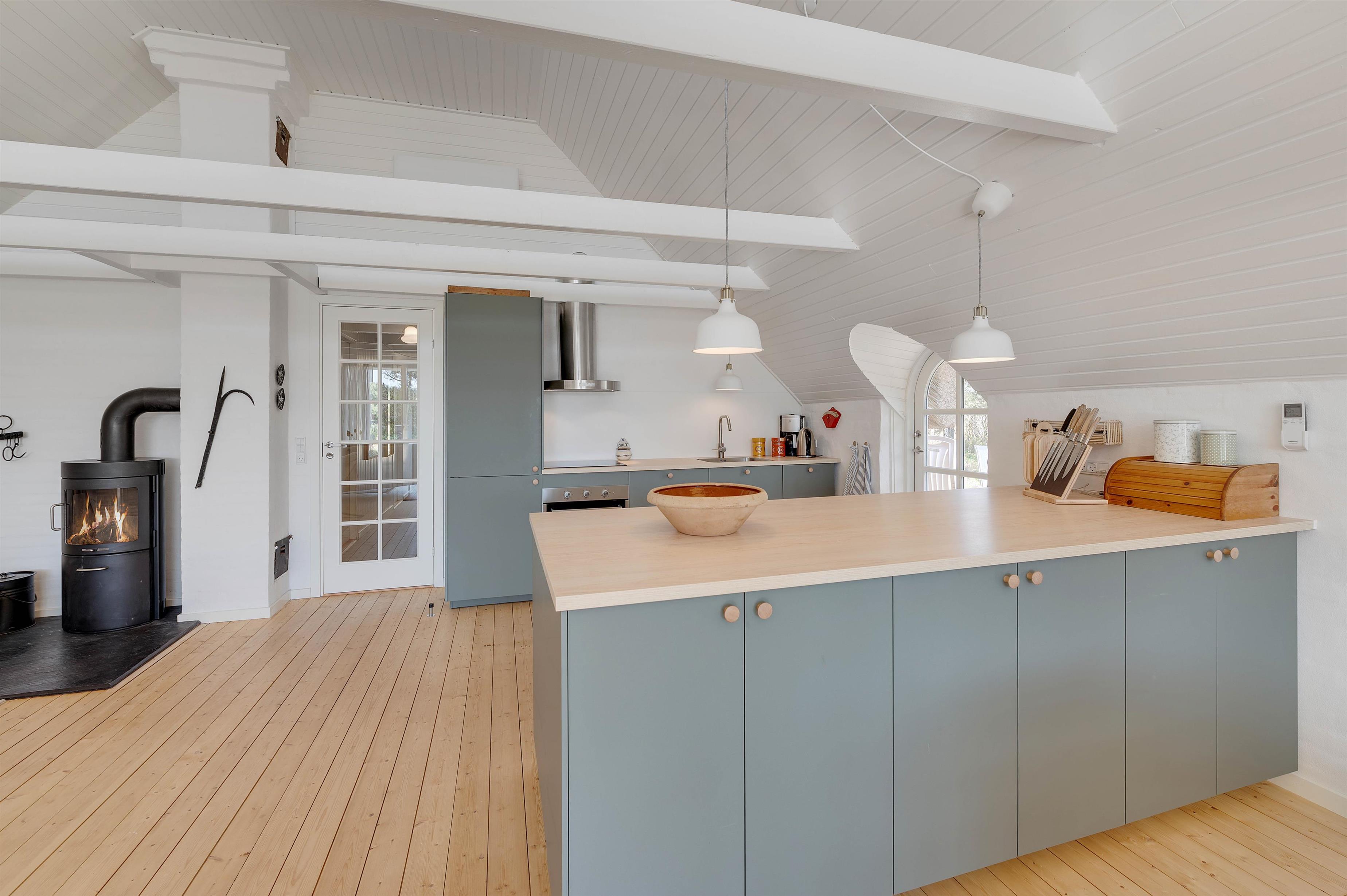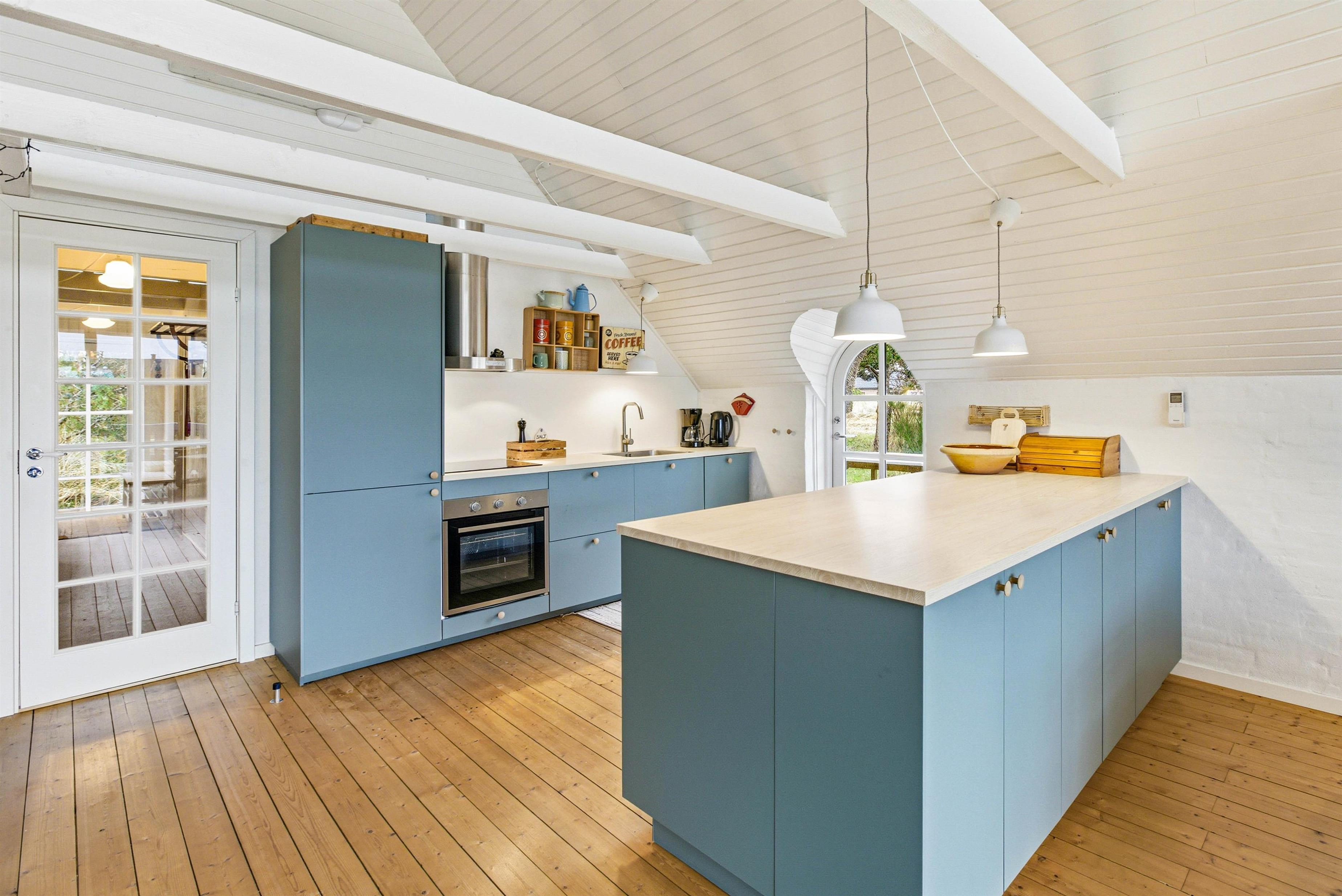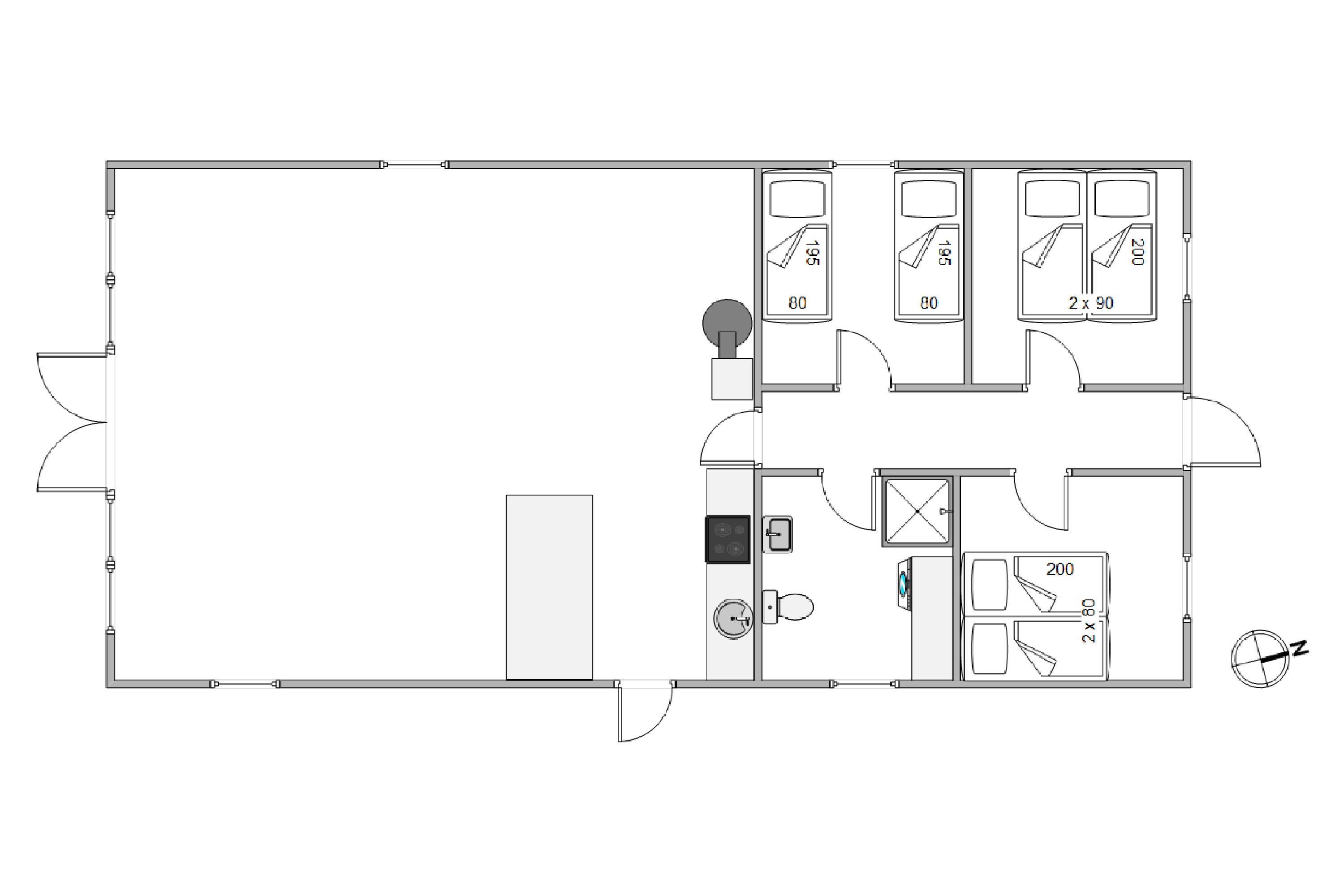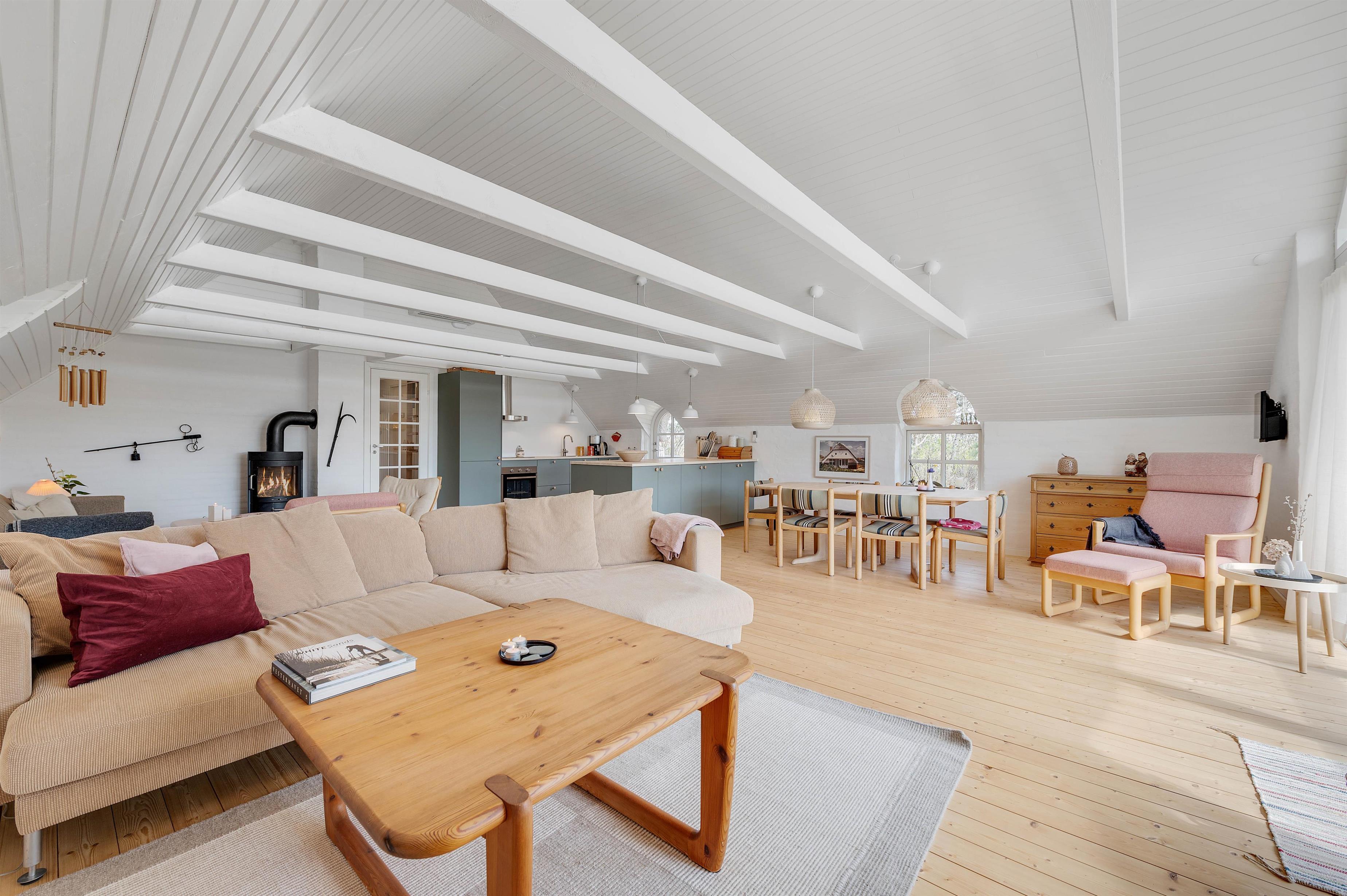 Ferieboligen råder over 3 soverum, hvor hvert rum er udstyret med 2 enkeltsenge. Sommerhusets hjerte er bestemt den store stue- og spiseafdeling mod syd, der ligger i åben forbindelse med køkkenet. Det hyggelige fællesrum kommer med garanti til at danne ramme om masser af gode ferieminder; i køkkenet kan I samles om madlavningen, og sofaafdelingen lægger op til afslapning og filmaftener, mens brændeovnen knitrer i baggrunden. Fjernsynet er udstyret med Chromecast, og feriehuset har en hurtig og stabil internetforbindelse, så I kan se alle jeres yndlingsfilm og -serier. Et stort vinduesparti i stuen sørger for et godt lysindfald og et kig til den omkringliggende og ikke mindst skønne natur.