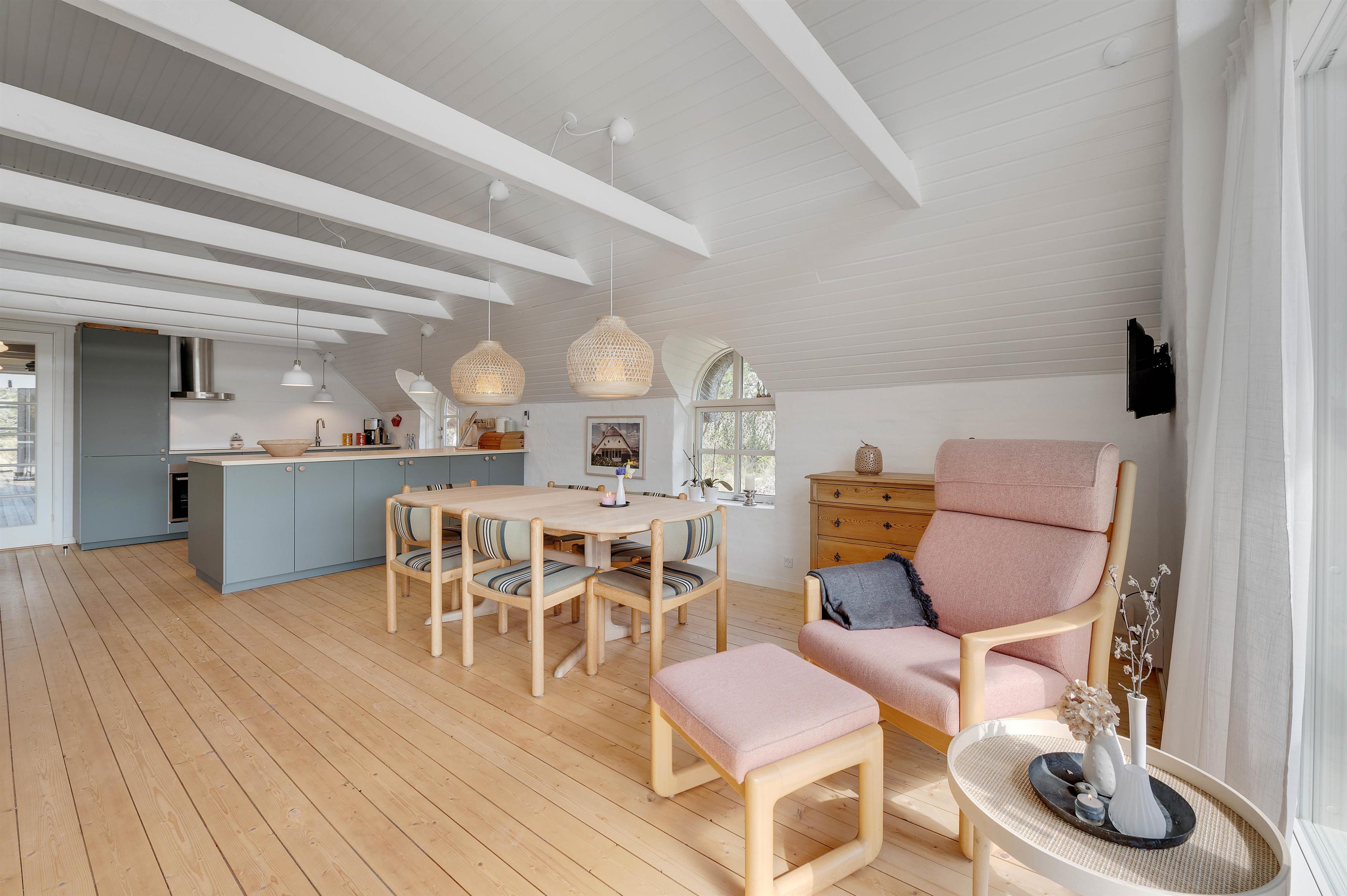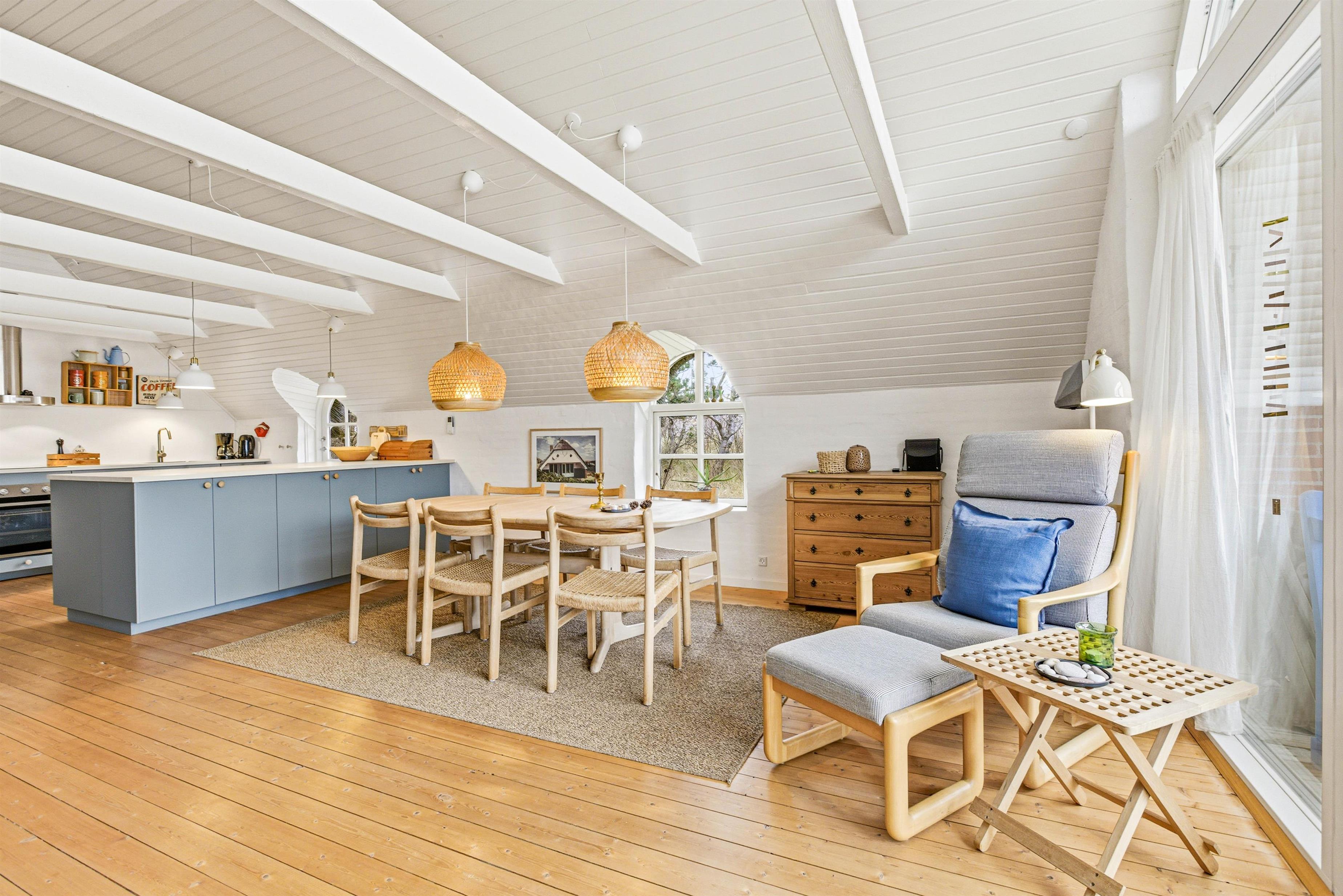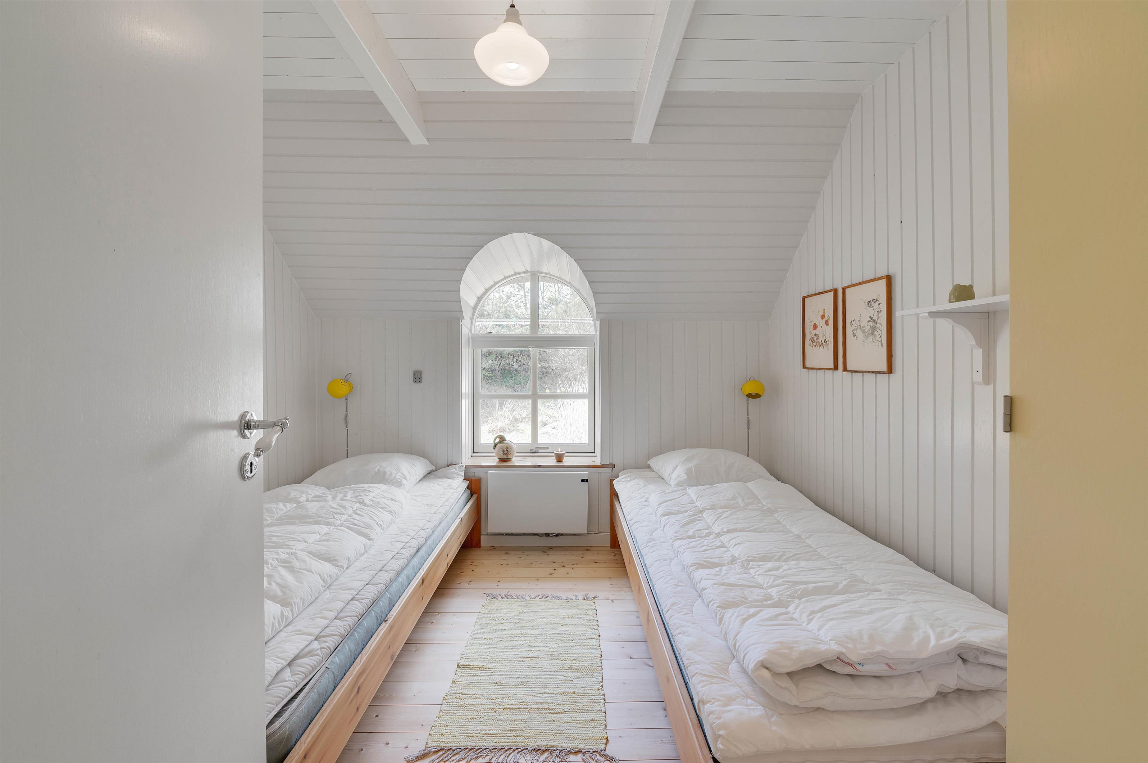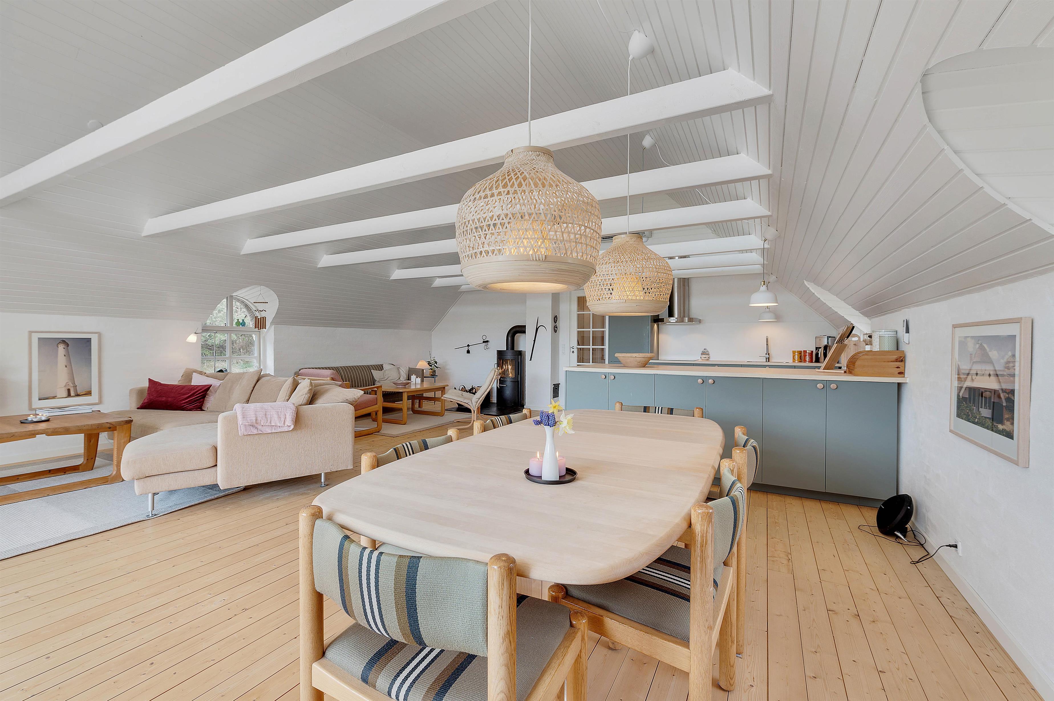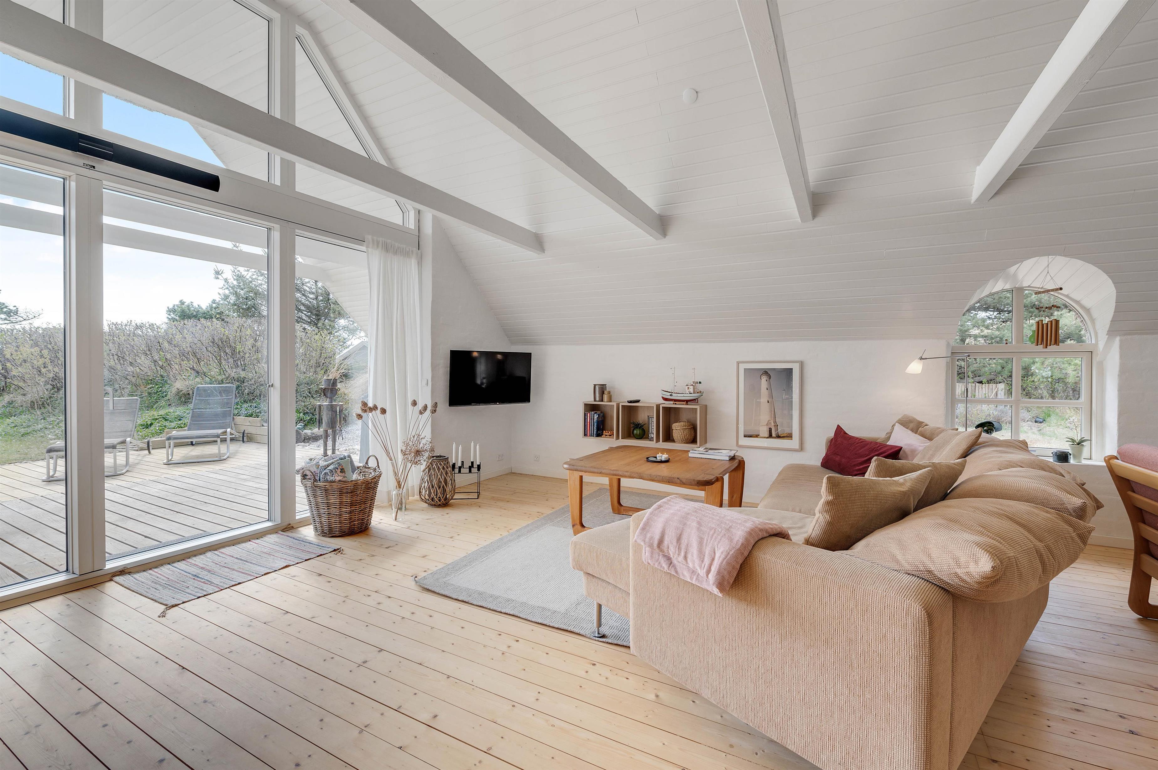 Ferieboligen råder over 3 soverum, hvor hvert rum er udstyret med 2 enkeltsenge. Sommerhusets hjerte er bestemt den store stue- og spiseafdeling mod syd, der ligger i åben forbindelse med køkkenet. Det hyggelige fællesrum kommer med garanti til at danne ramme om masser af gode ferieminder; i køkkenet kan I samles om madlavningen, og sofaafdelingen lægger op til afslapning og filmaftener, mens brændeovnen knitrer i baggrunden. Fjernsynet er udstyret med Chromecast, og feriehuset har en hurtig og stabil internetforbindelse, så I kan se alle jeres yndlingsfilm og -serier. Et stort vinduesparti i stuen sørger for et godt lysindfald og et kig til den omkringliggende og ikke mindst skønne natur.