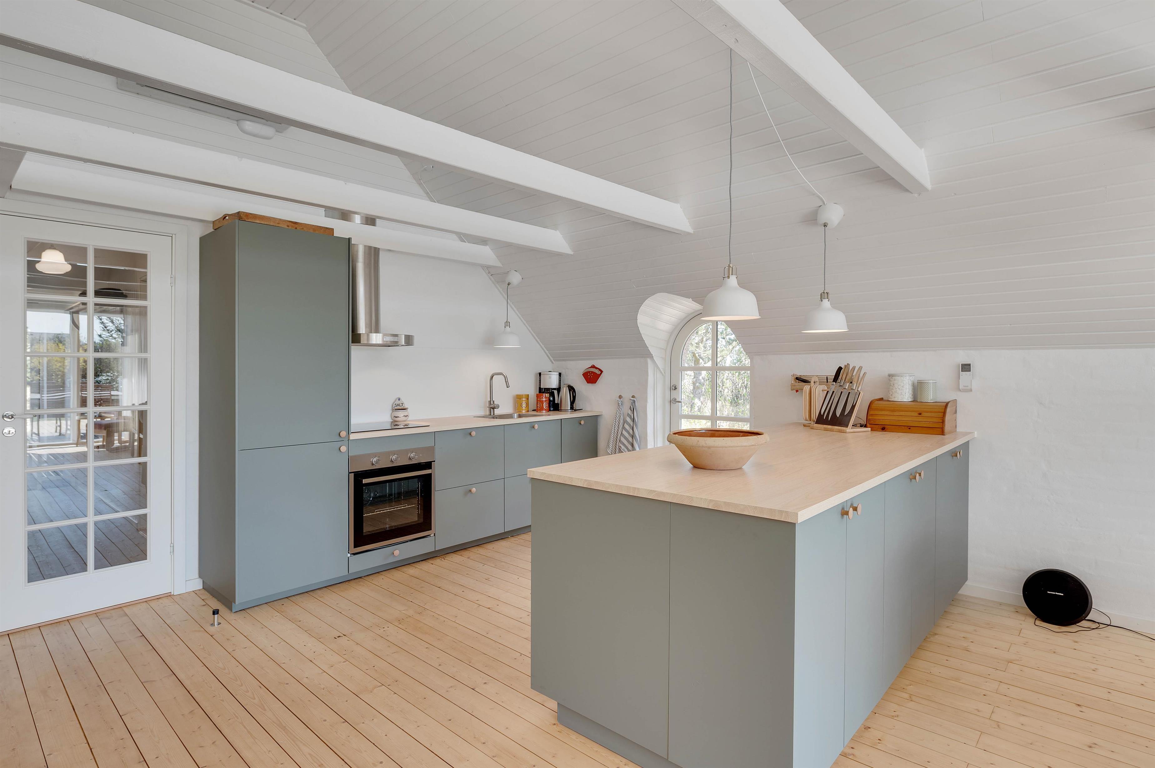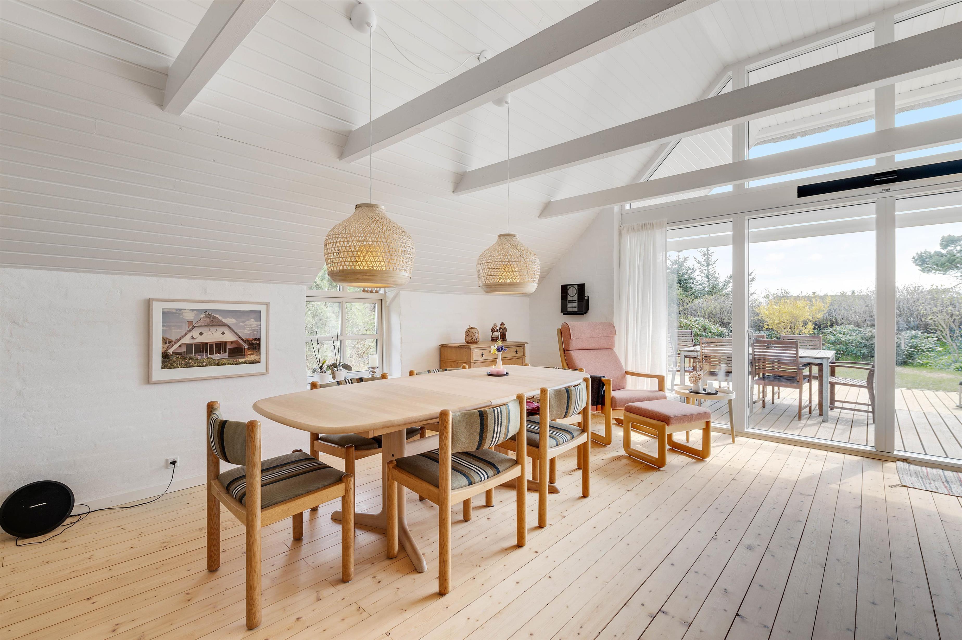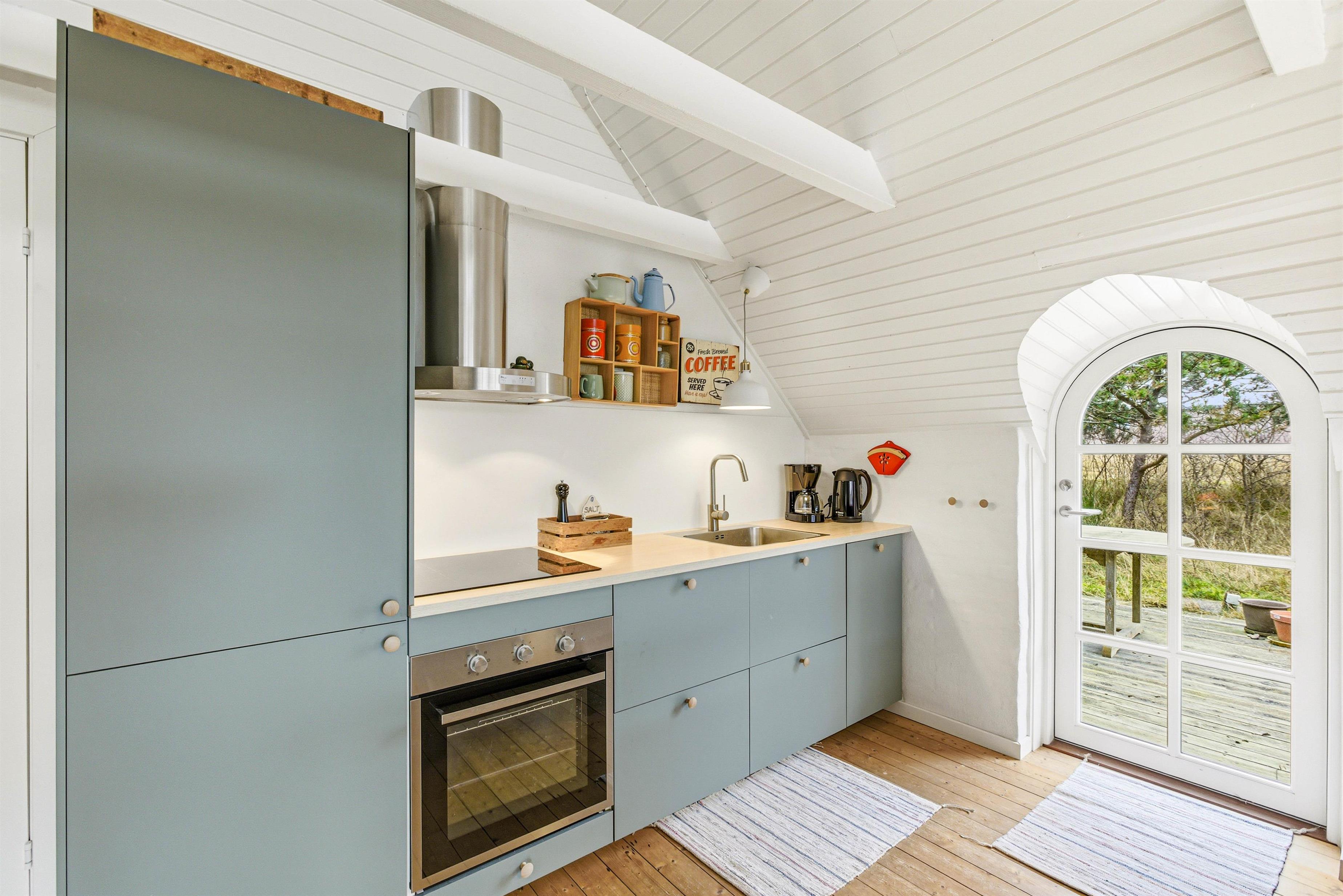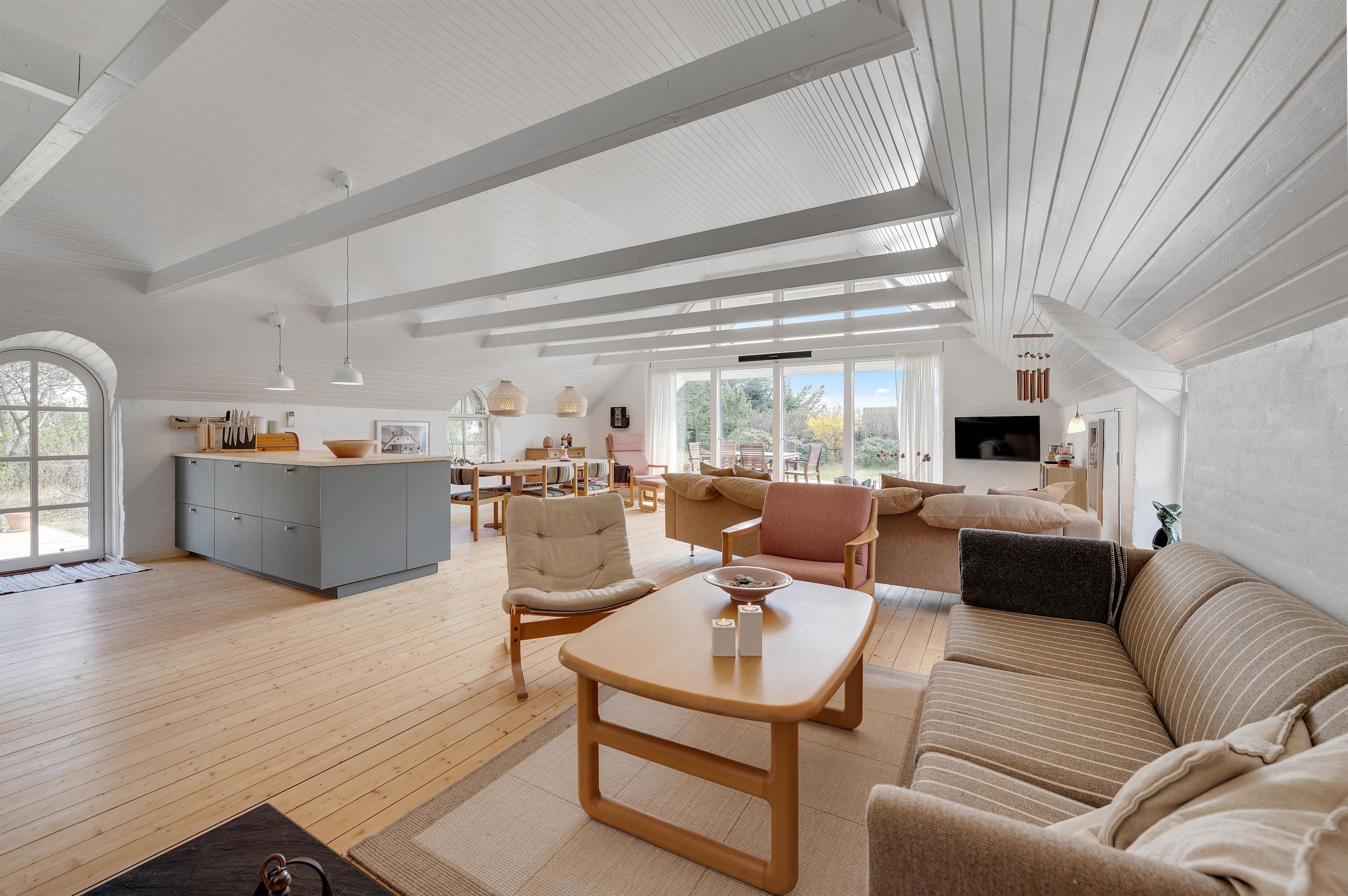 Ferieboligen råder over 3 soverum, hvor hvert rum er udstyret med 2 enkeltsenge. Sommerhusets hjerte er bestemt den store stue- og spiseafdeling mod syd, der ligger i åben forbindelse med køkkenet. Det hyggelige fællesrum kommer med garanti til at danne ramme om masser af gode ferieminder; i køkkenet kan I samles om madlavningen, og sofaafdelingen lægger op til afslapning og filmaftener, mens brændeovnen knitrer i baggrunden. Fjernsynet er udstyret med Chromecast, og feriehuset har en hurtig og stabil internetforbindelse, så I kan se alle jeres yndlingsfilm og -serier. Et stort vinduesparti i stuen sørger for et godt lysindfald og et kig til den omkringliggende og ikke mindst skønne natur.
