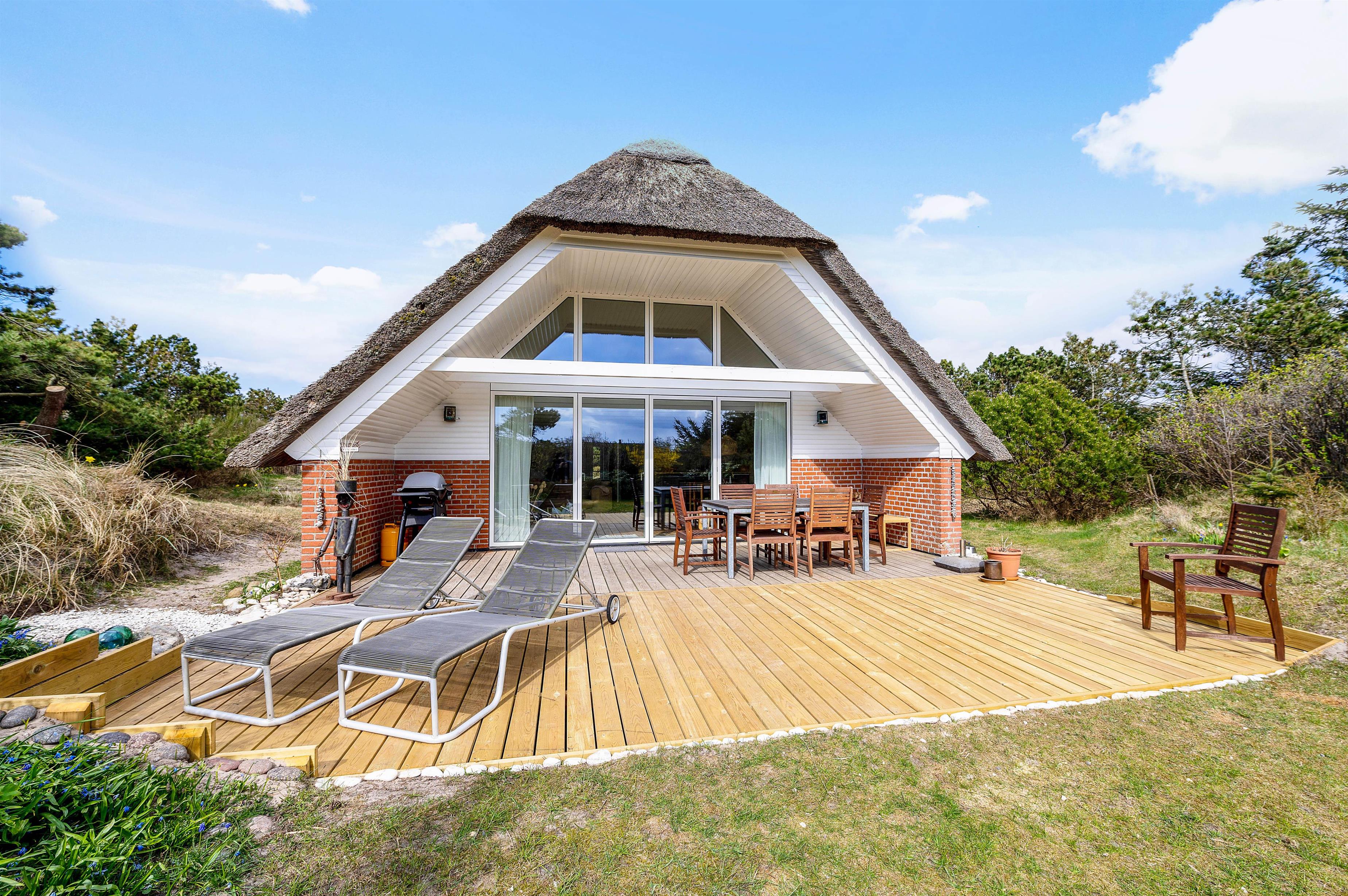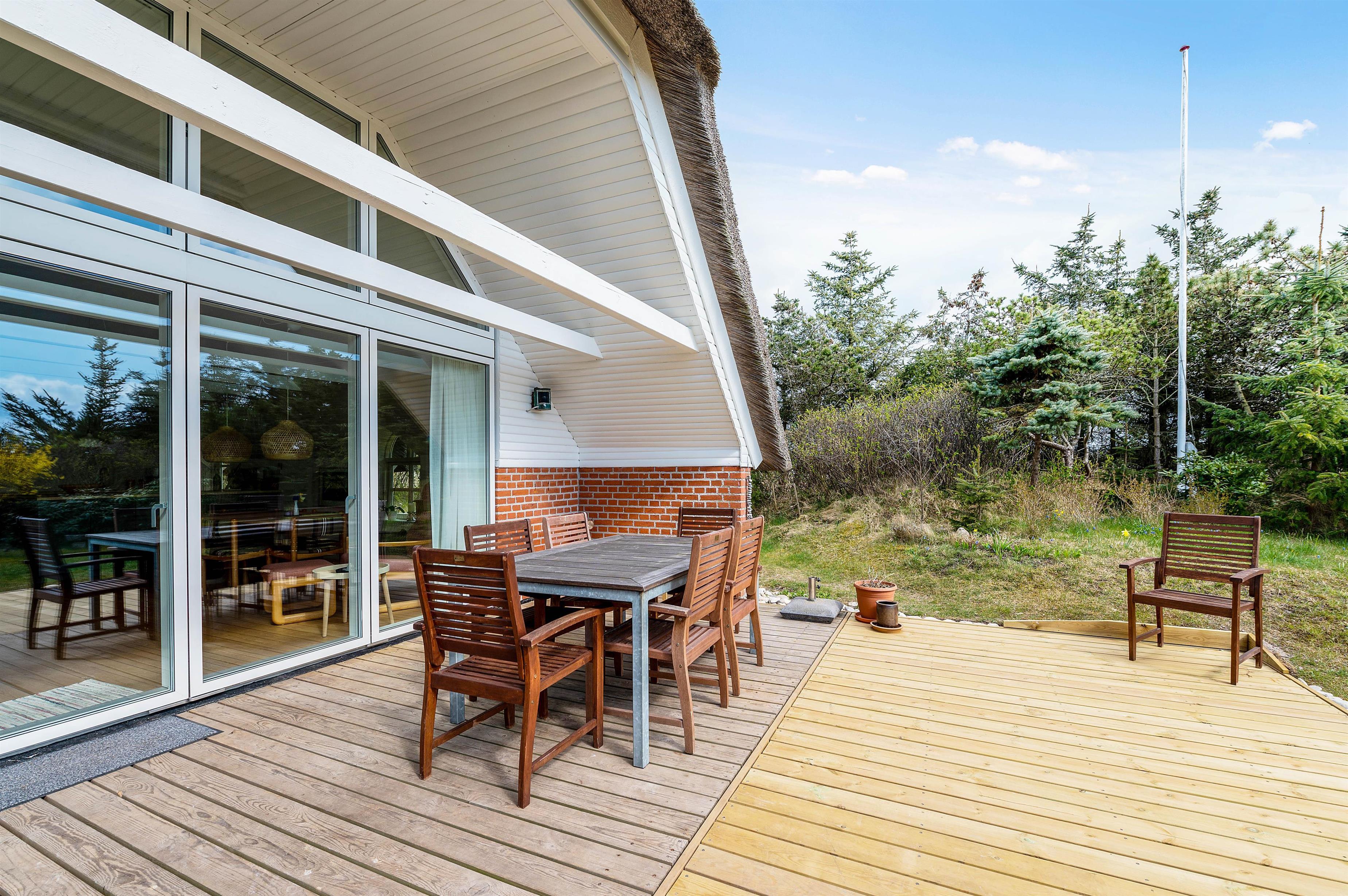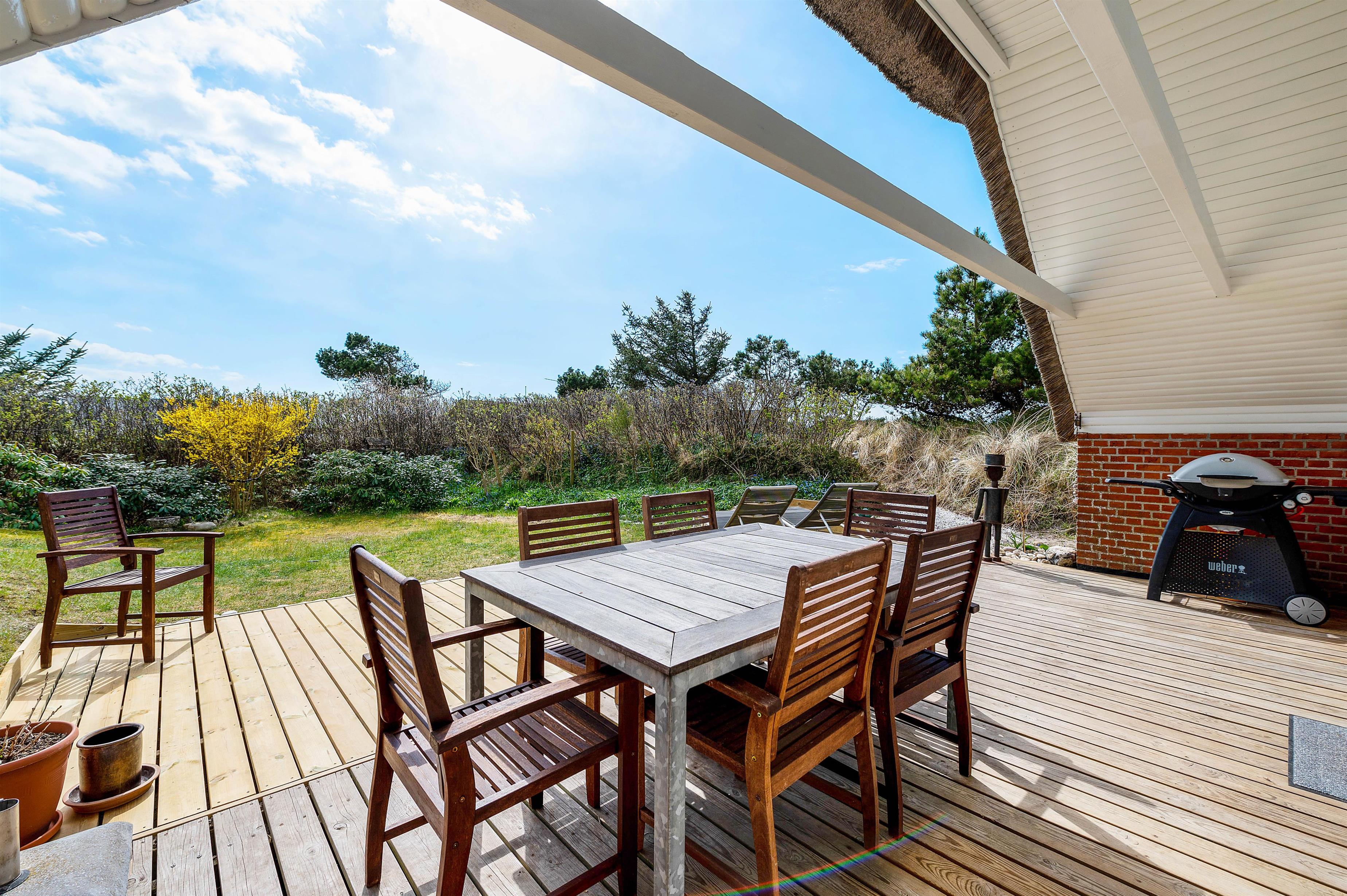 Fra opholdsrummet træder I ud på den skønne, sydvendte terrasse. Terrassen har både en afskærmet og overdækket del, og den mere end 1.600 kvadratmeter store naturgrund er omgivet af tæt buskads, så de solrige dage som I bl.a. kan nyde på terrassen bliver dermed ekstra ugenerede. Når dagen går på hæld, kan I tilberede middagen på feriehusets praktiske gasgrill imens I nyder et glas vin eller lignende.