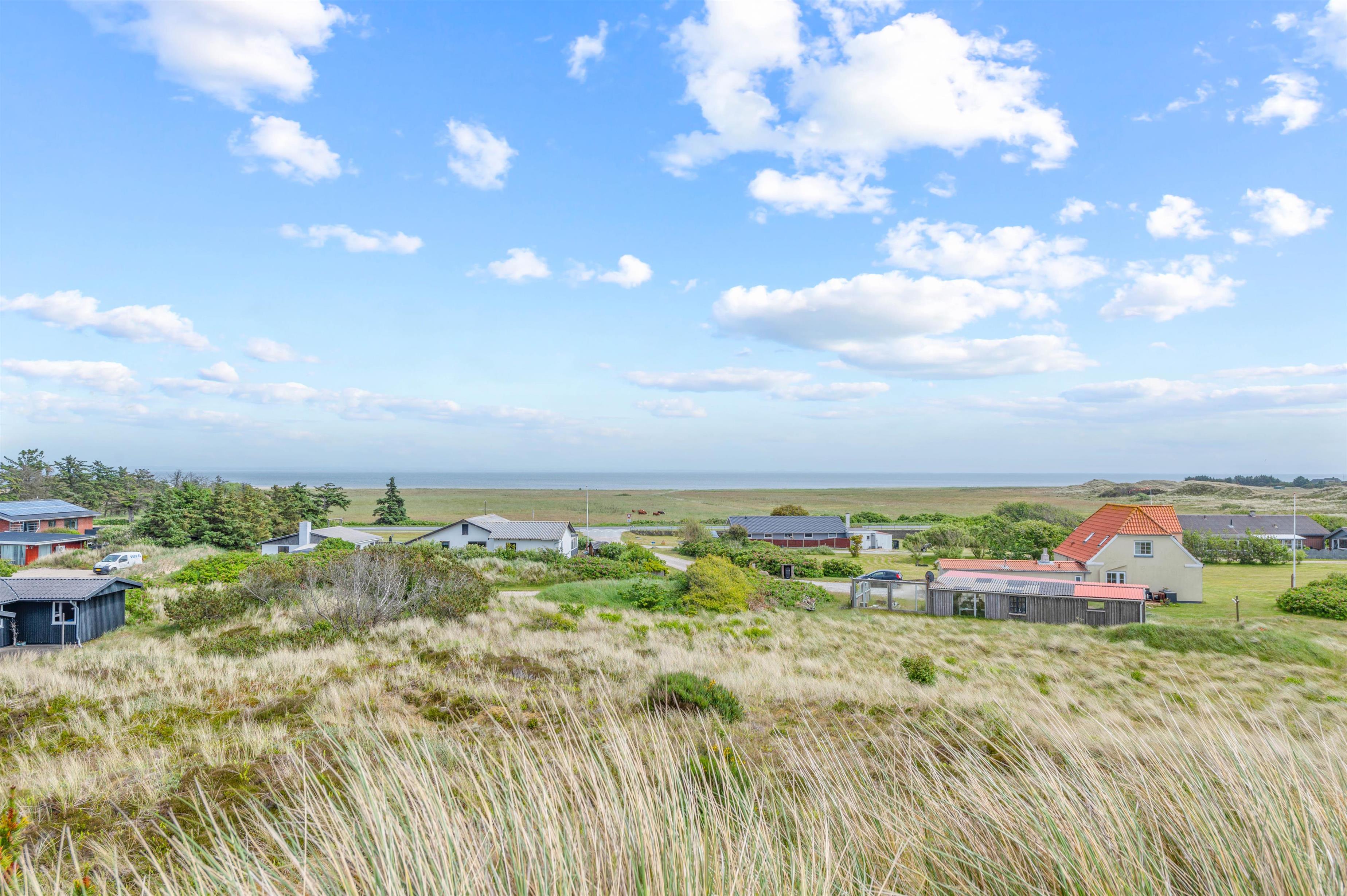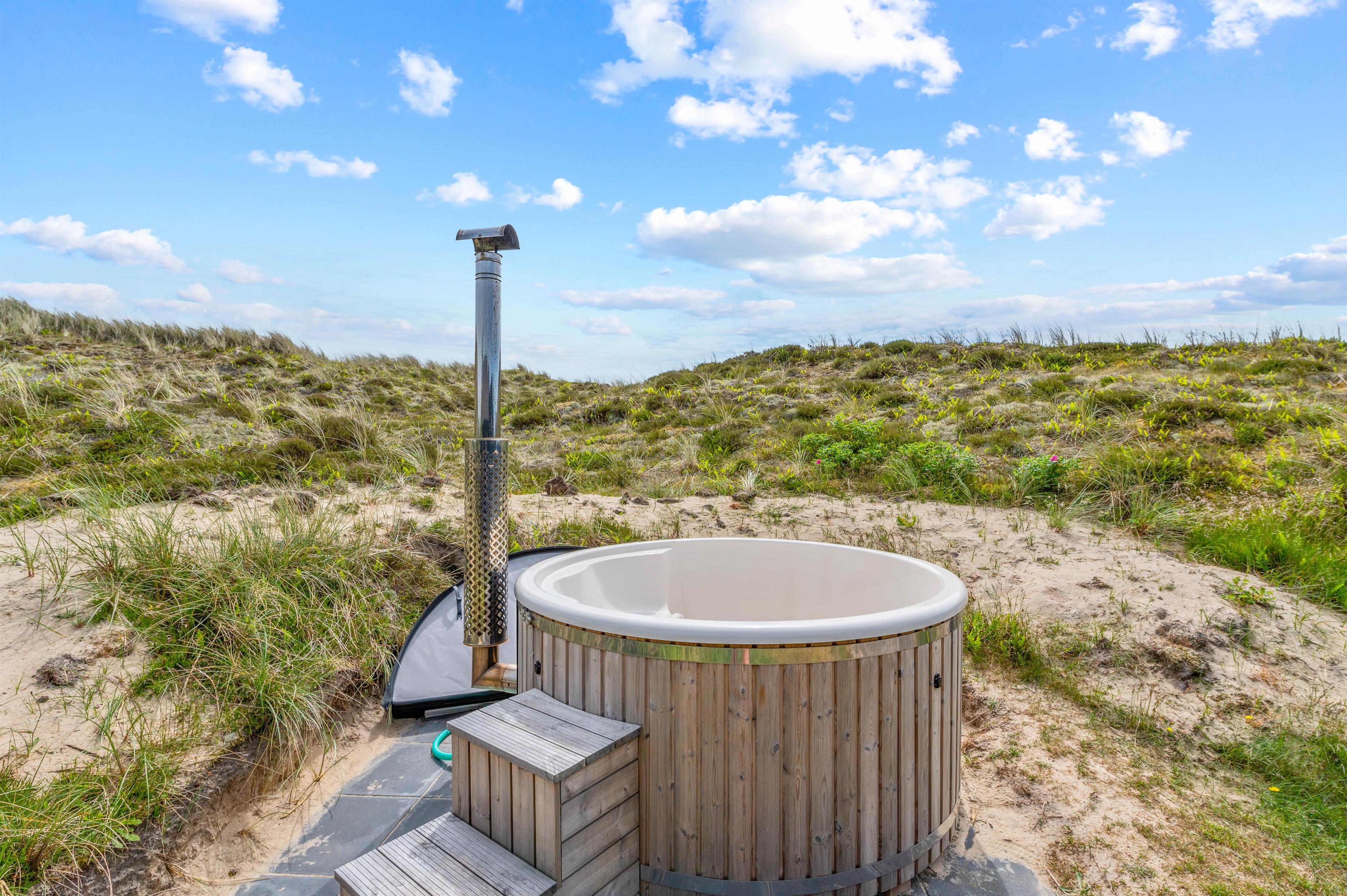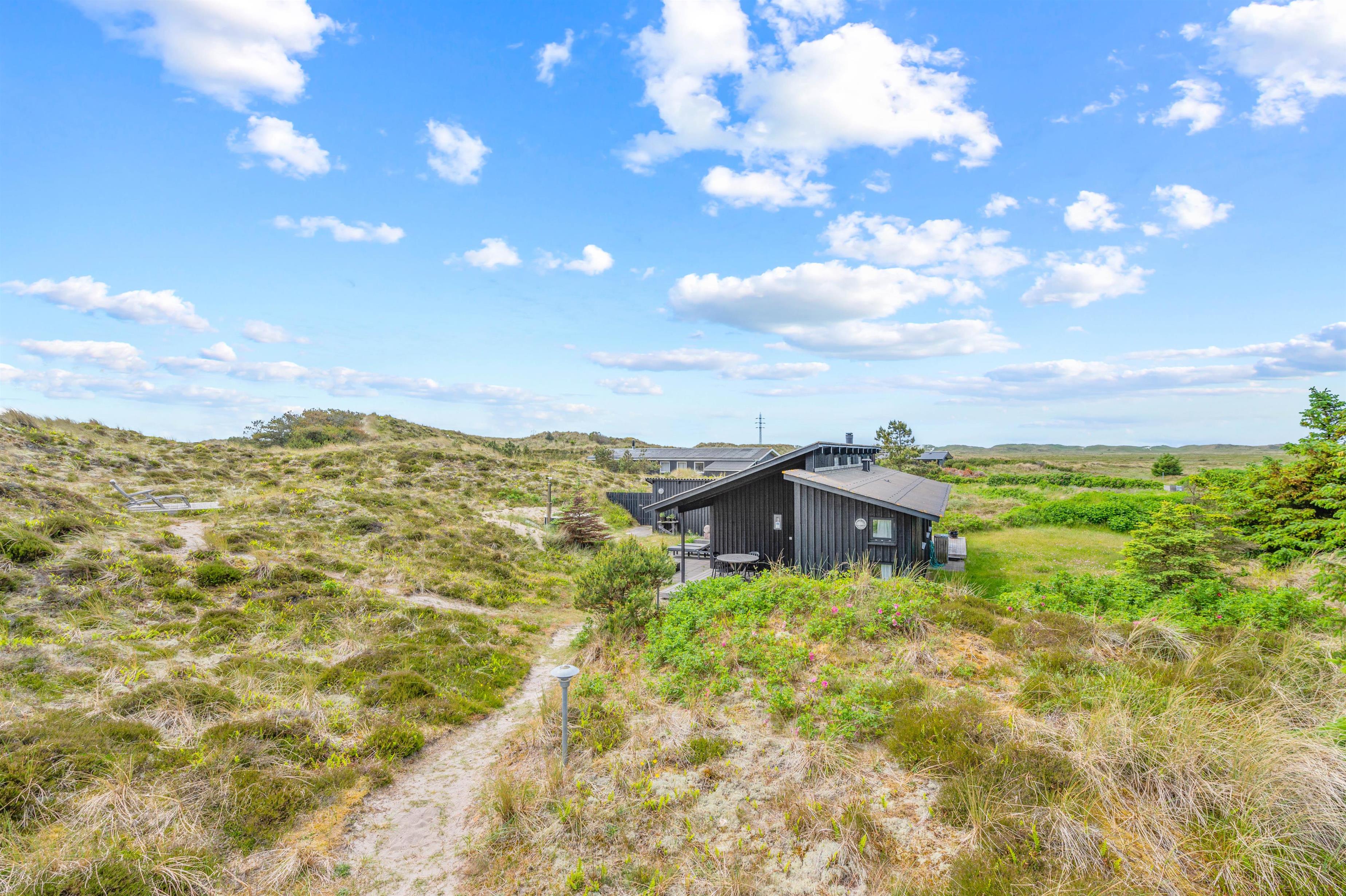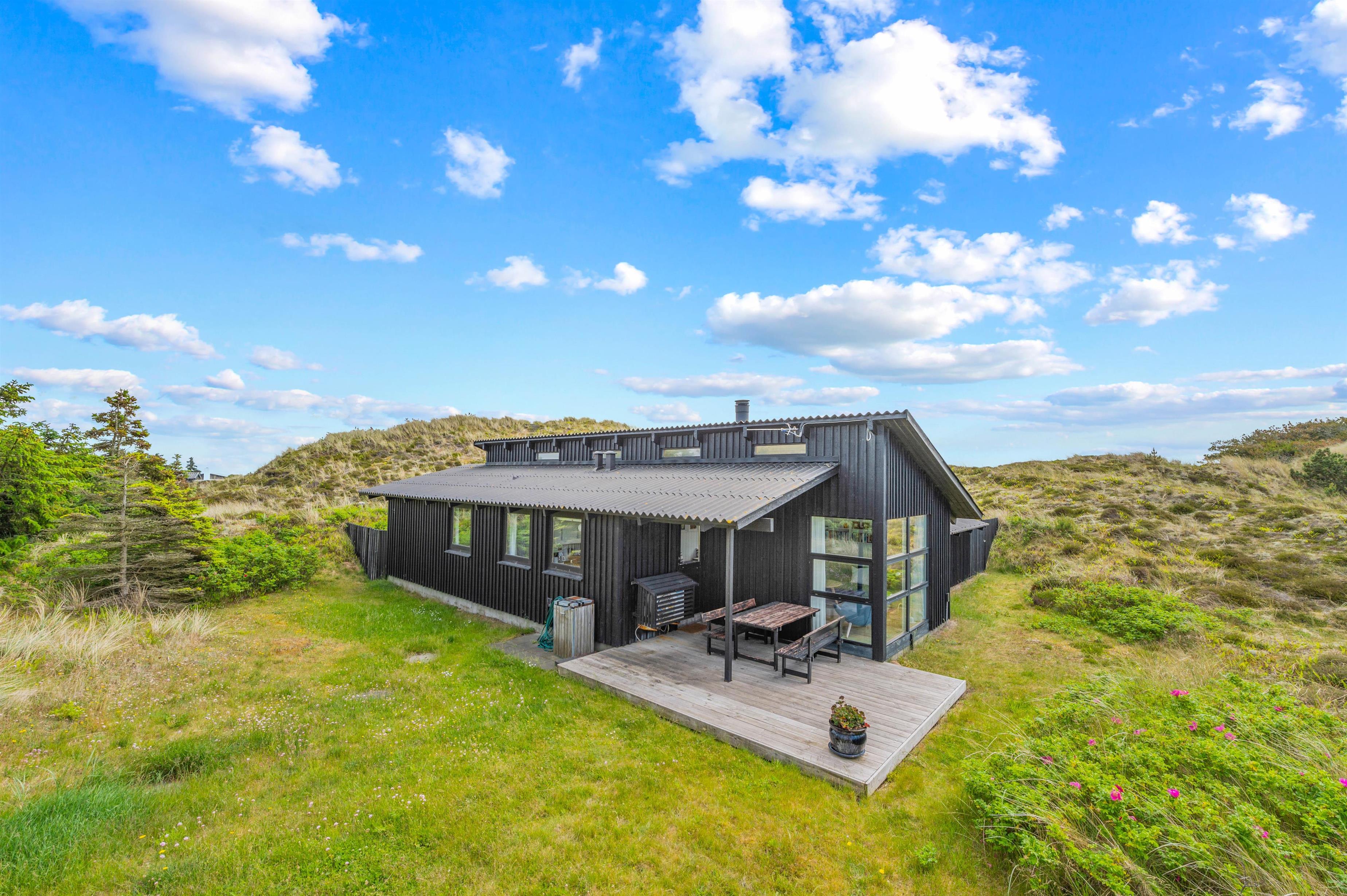 Den 3.000 m2 store naturgrund er stærkt kuperet, og feriehuset er bygget flot ind i landskabet. Desuden finder I et lækkert vildmarksbad ved feriehuset, hvor I efter en god tur til stranden kan nyde varmen herfra. Fra feriehuset kan man gå op på klitten mod øst hvorfra der er en vidunderlig panoramaudsigt i alle retninger med både fjord, hede, klitter og Nr. Lyngvig Fyr.