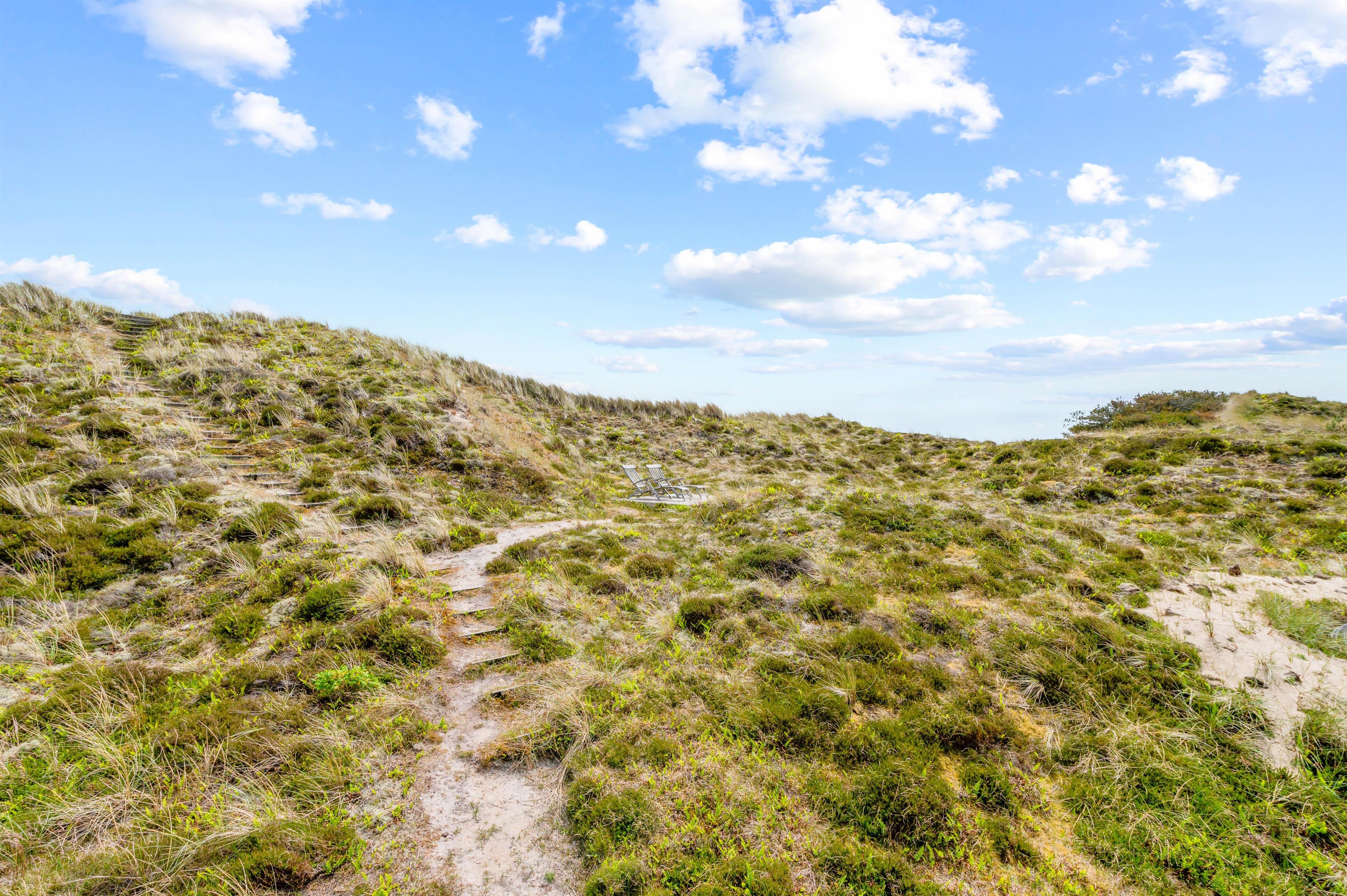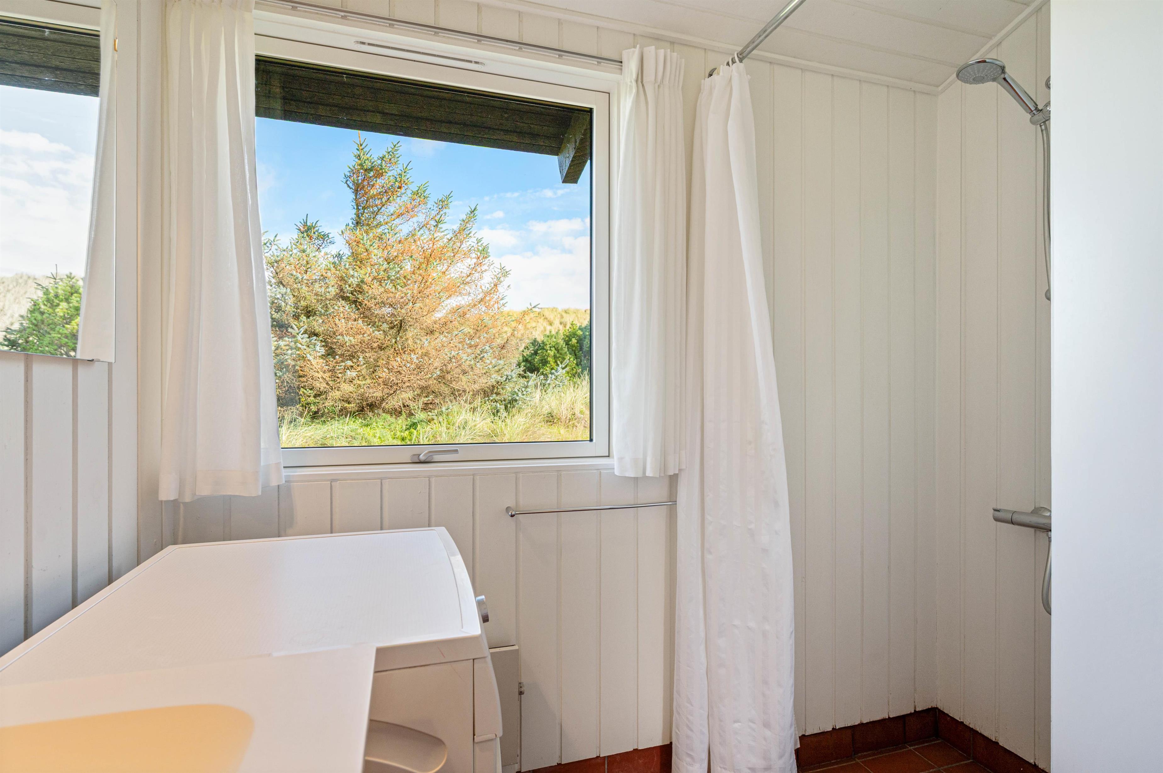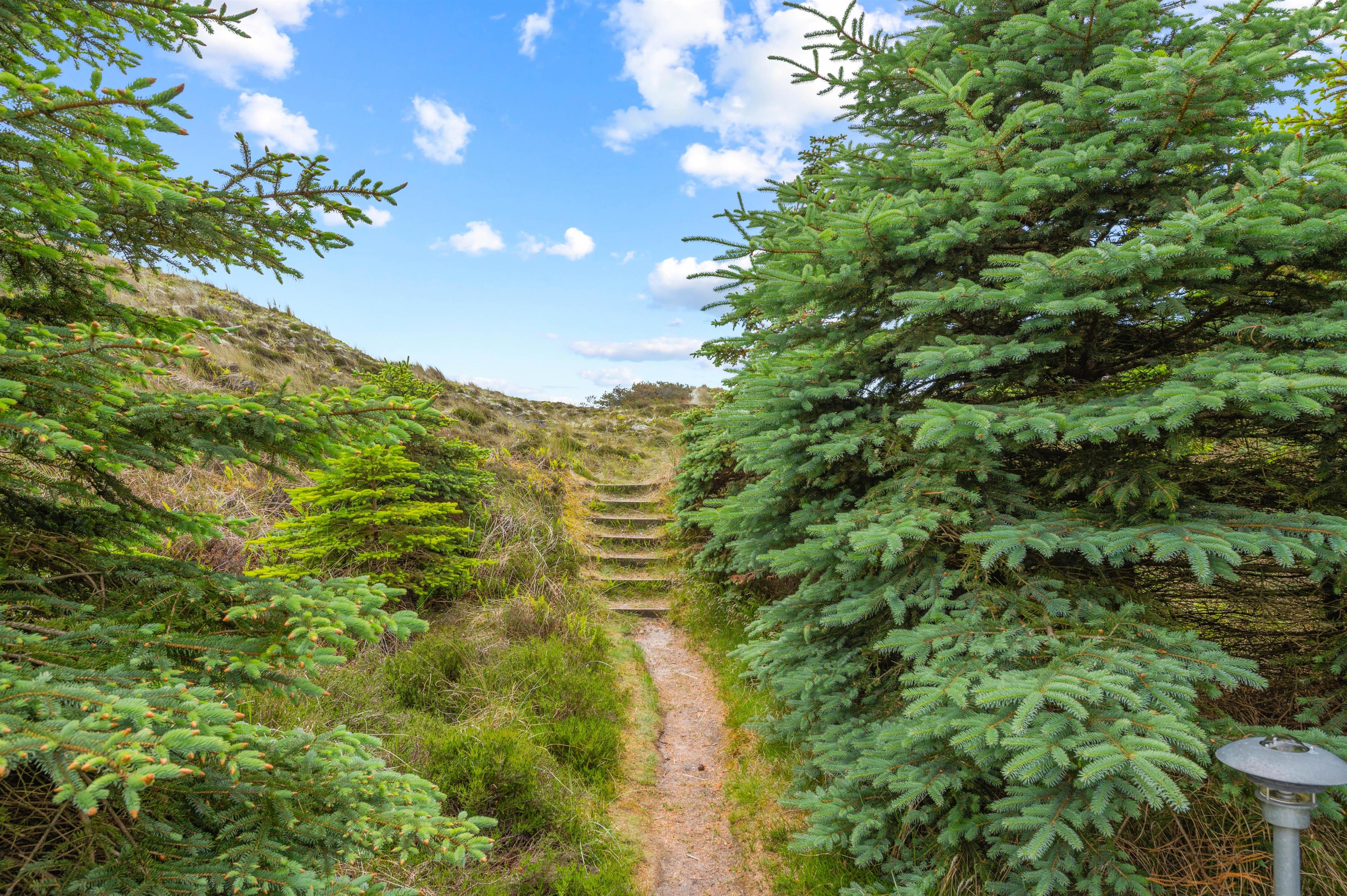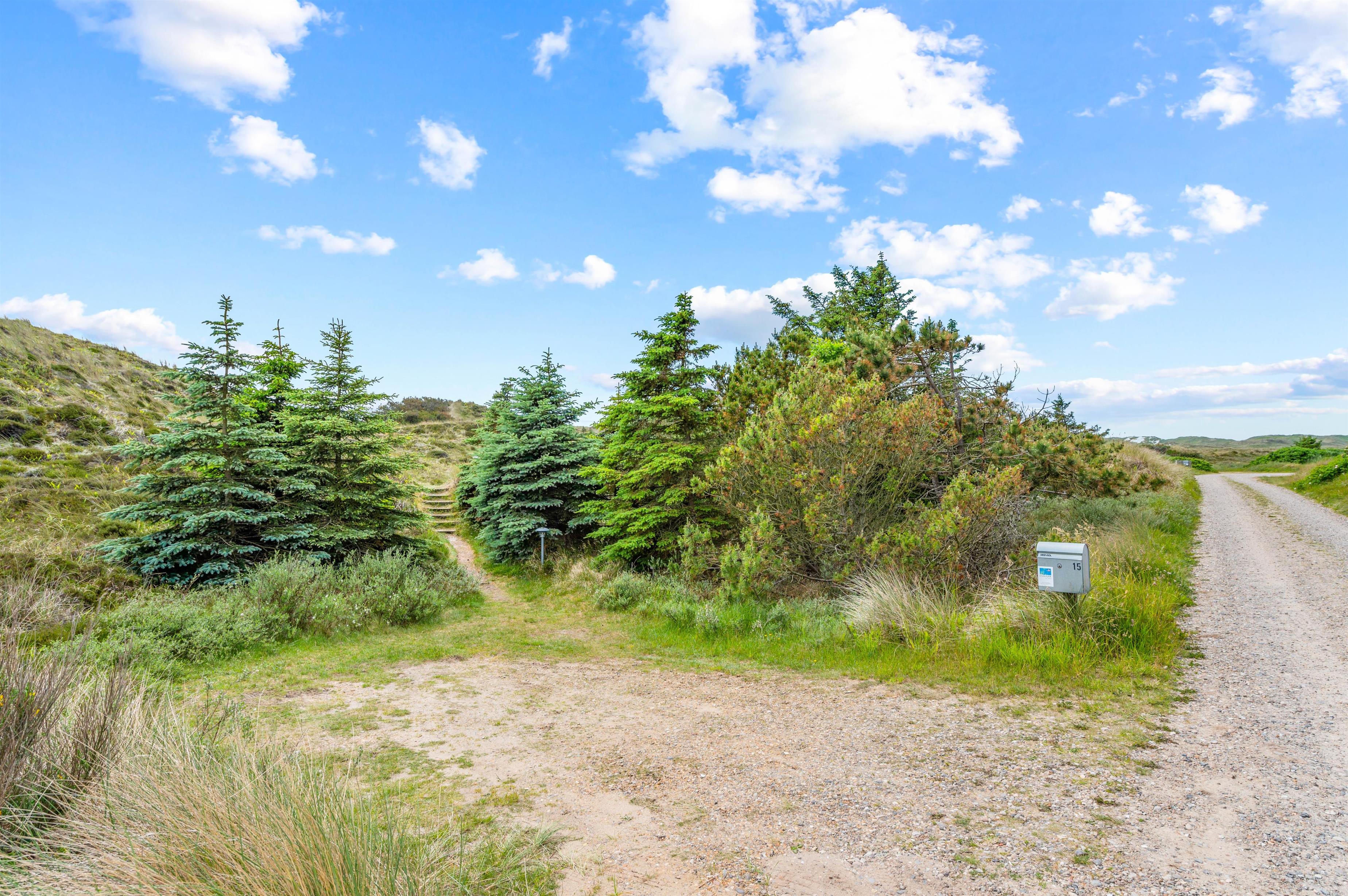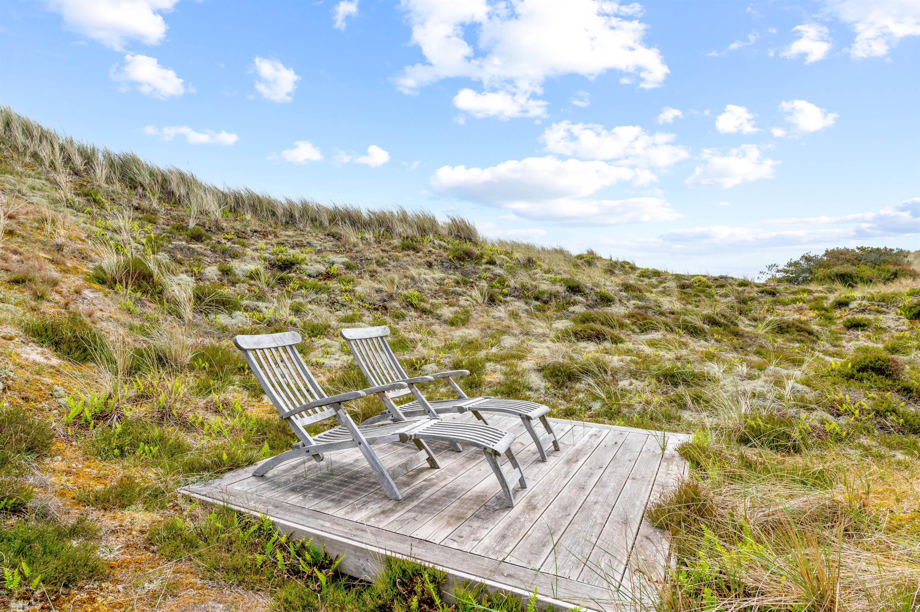 Den 3.000 m2 store naturgrund er stærkt kuperet, og feriehuset er bygget flot ind i landskabet. Desuden finder I et lækkert vildmarksbad ved feriehuset, hvor I efter en god tur til stranden kan nyde varmen herfra. Fra feriehuset kan man gå op på klitten mod øst hvorfra der er en vidunderlig panoramaudsigt i alle retninger med både fjord, hede, klitter og Nr. Lyngvig Fyr.