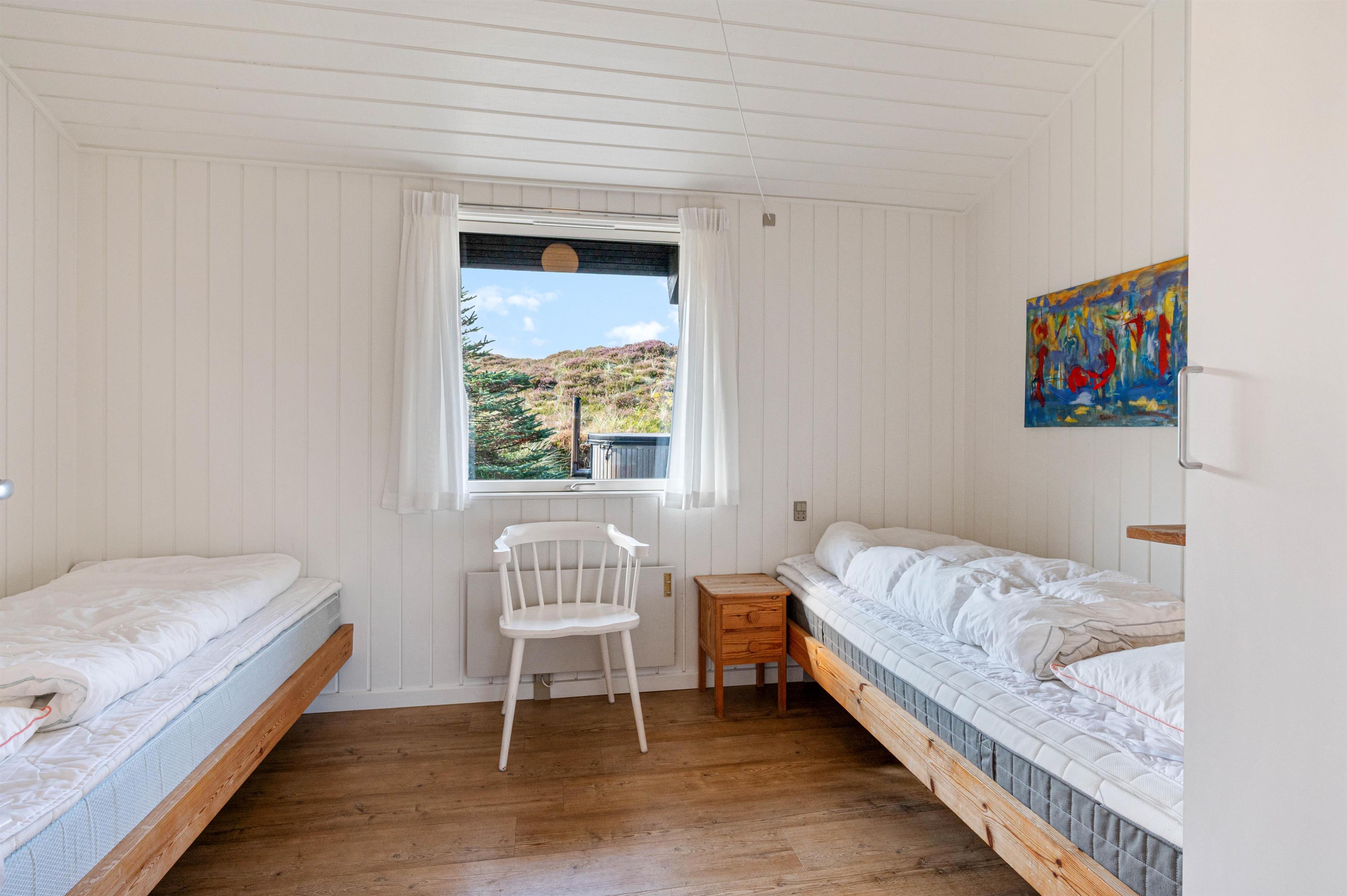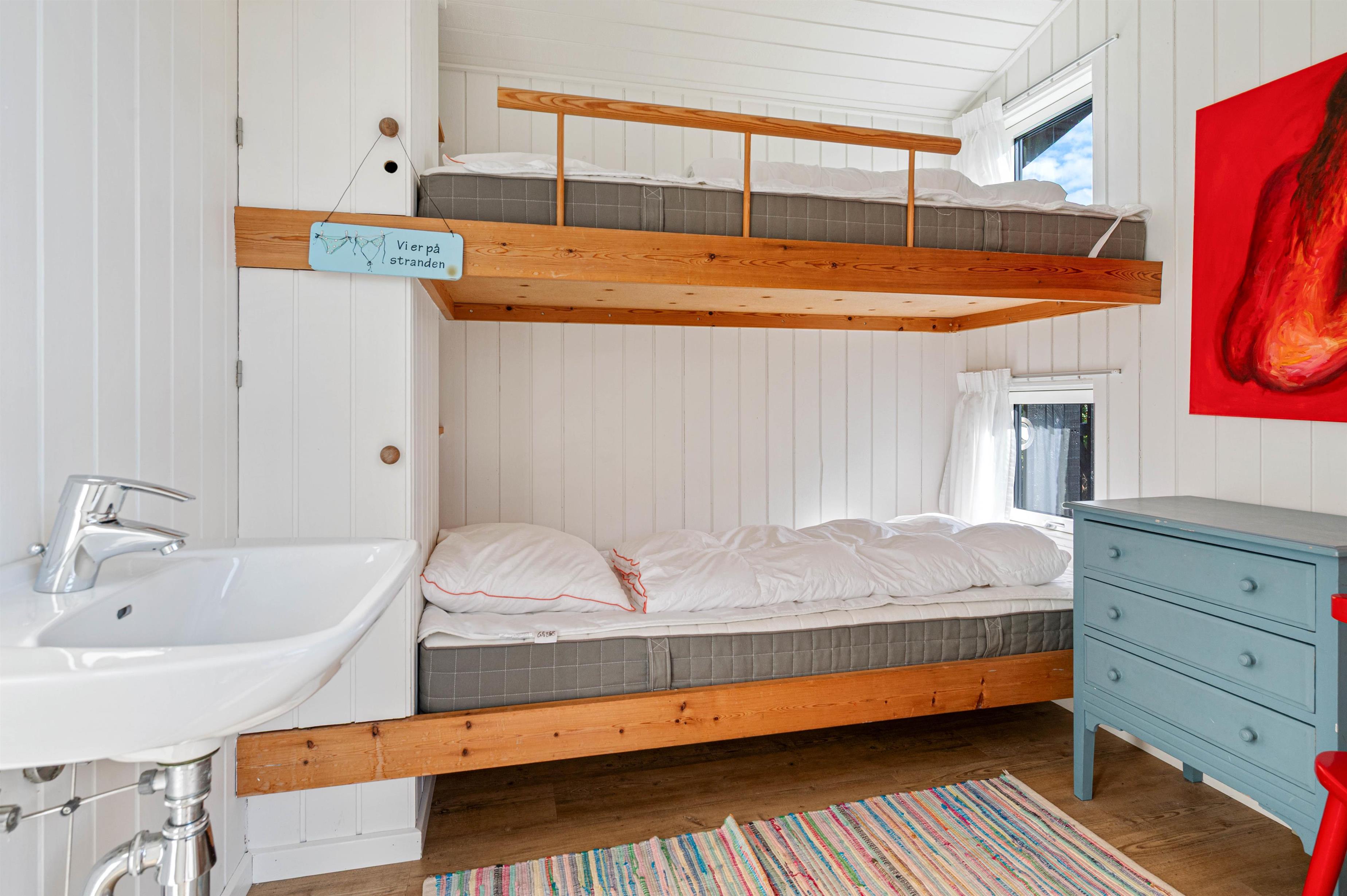 Dette sommerhus er opført i 1979 og fremstår yderst velholdt. Arkitekturen er flot og alle detaljer er gennemtænkt. Møbleringen er foretaget i samme ånd og giver et rigtigt fint helhedsindtryk. Der er 2 soveværelser i selve huset og ét i annekset. Der er køjeseng i det ene værelse og 2 enkeltsenge i det andet. Annekset befinder sig umiddelbart uden for hoveddøren og indgangen er under en overdækket terrasse. I annekset er der udover endnu en køjeseng også installeret en håndvask. I husets badeværelse er der vaskemaskine, gulvvarme og bruseniche.