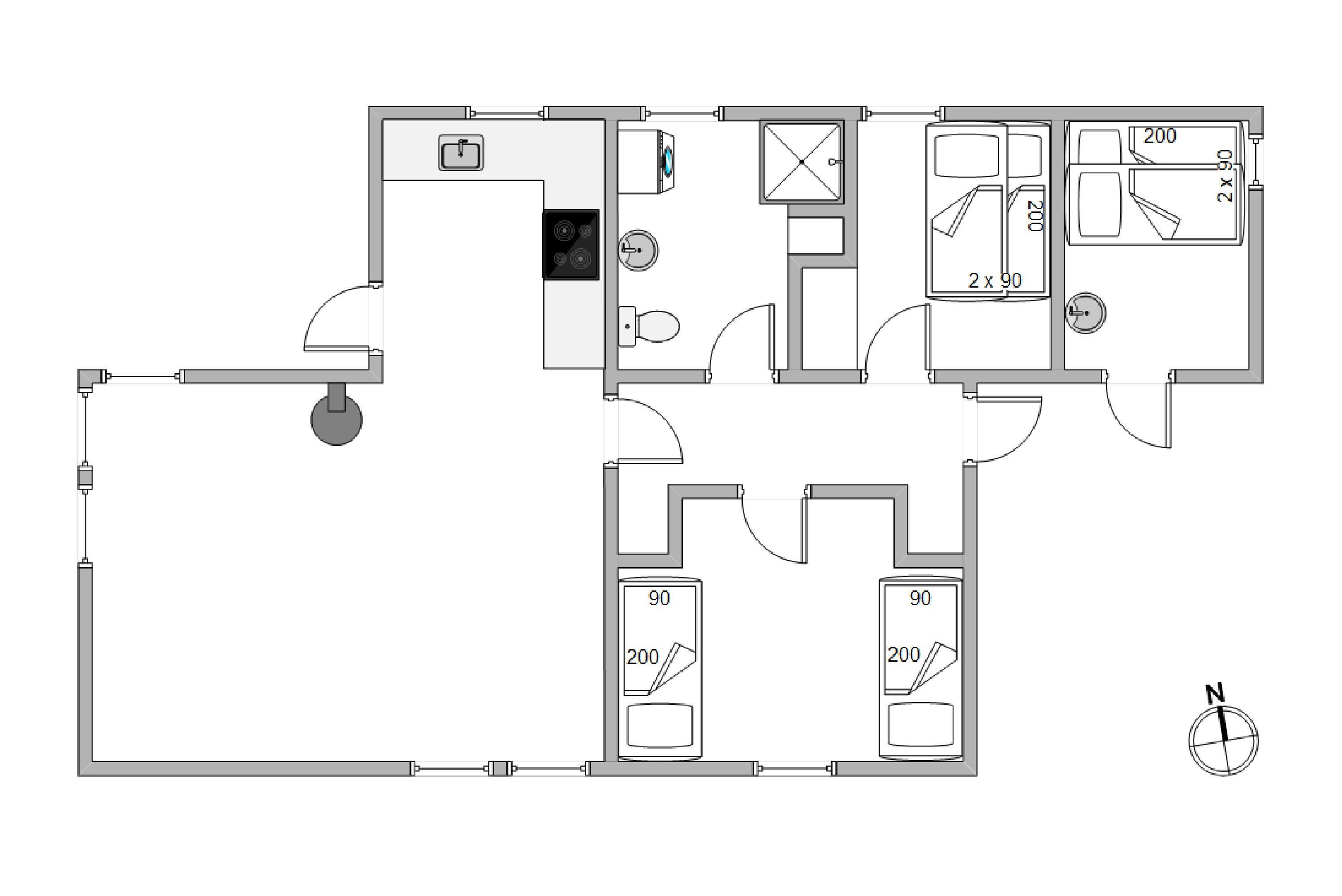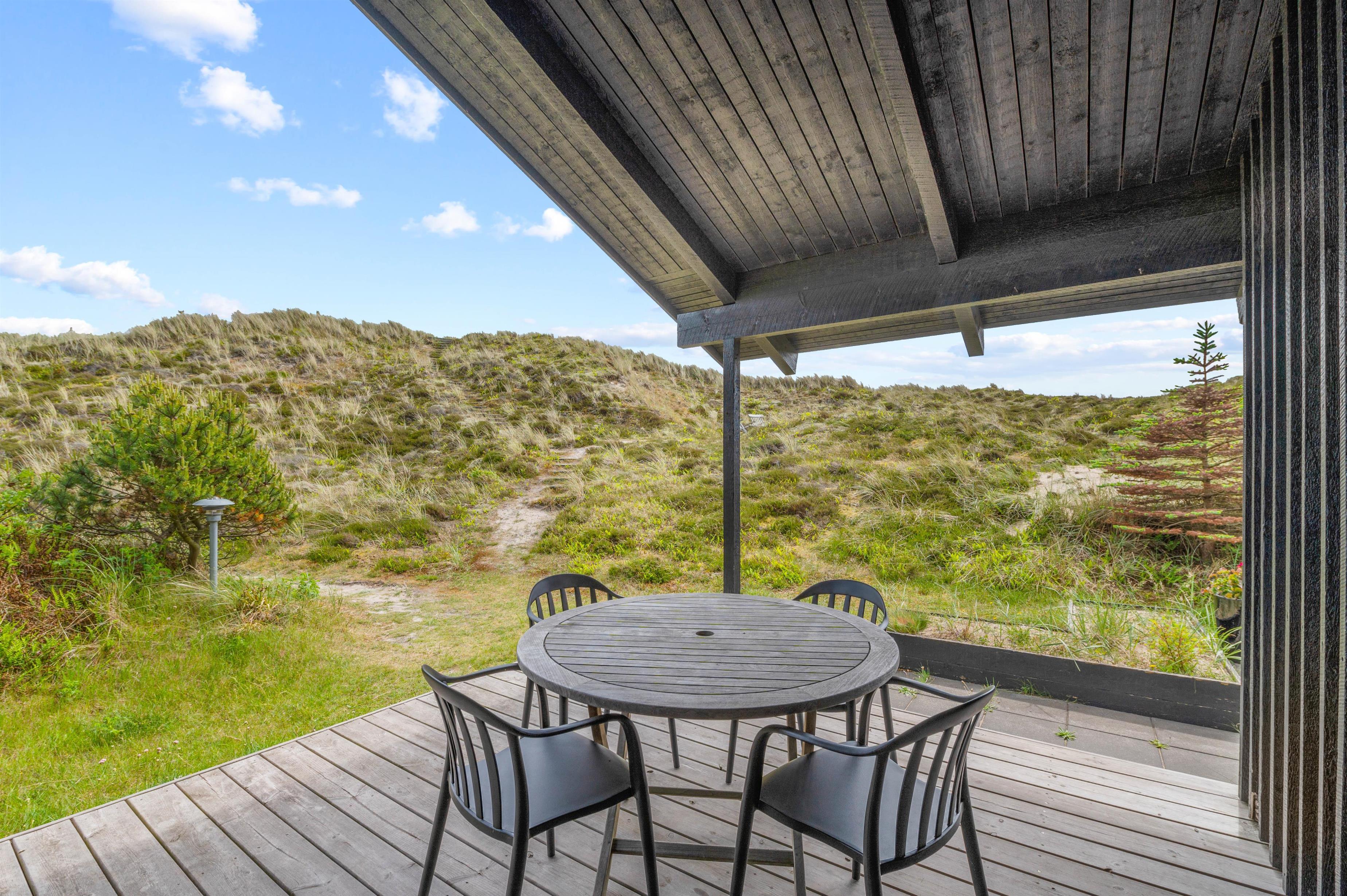Til sommerhuset hører flere gode terrasser. Både ved indgangspartiet mod sydøst og udenfor køkkenet mod nordvest kan du nyde ferien på overdækkede terrasser. I hjørnet af huset mod syd er der endnu en skøn terrasse, hvor huset giver læ, når vinden suser fra vest eller nord. Der er desuden en lille hundegård og udenfor terrassen er der også en sandkasse til de yngste feriegæster.