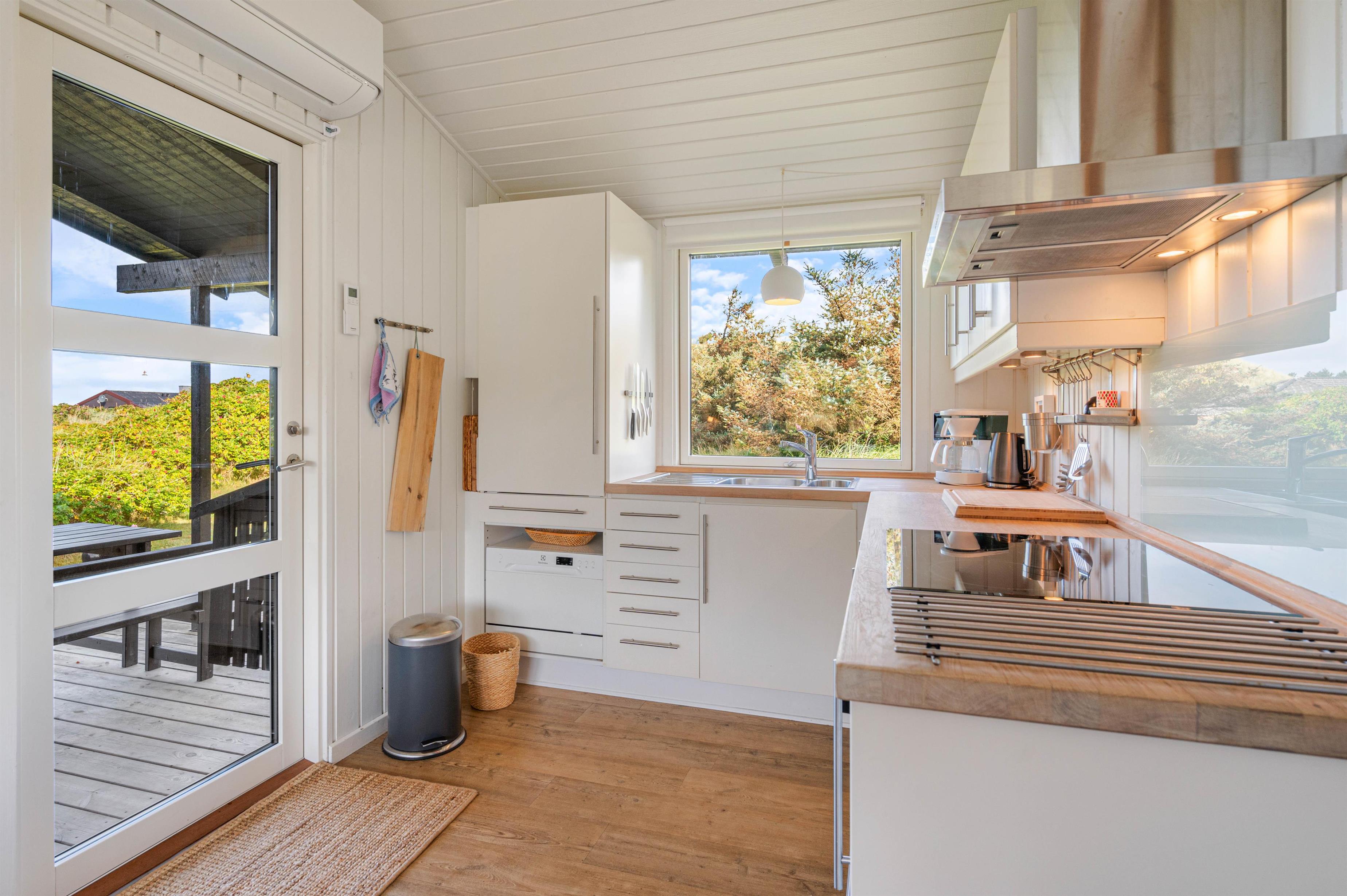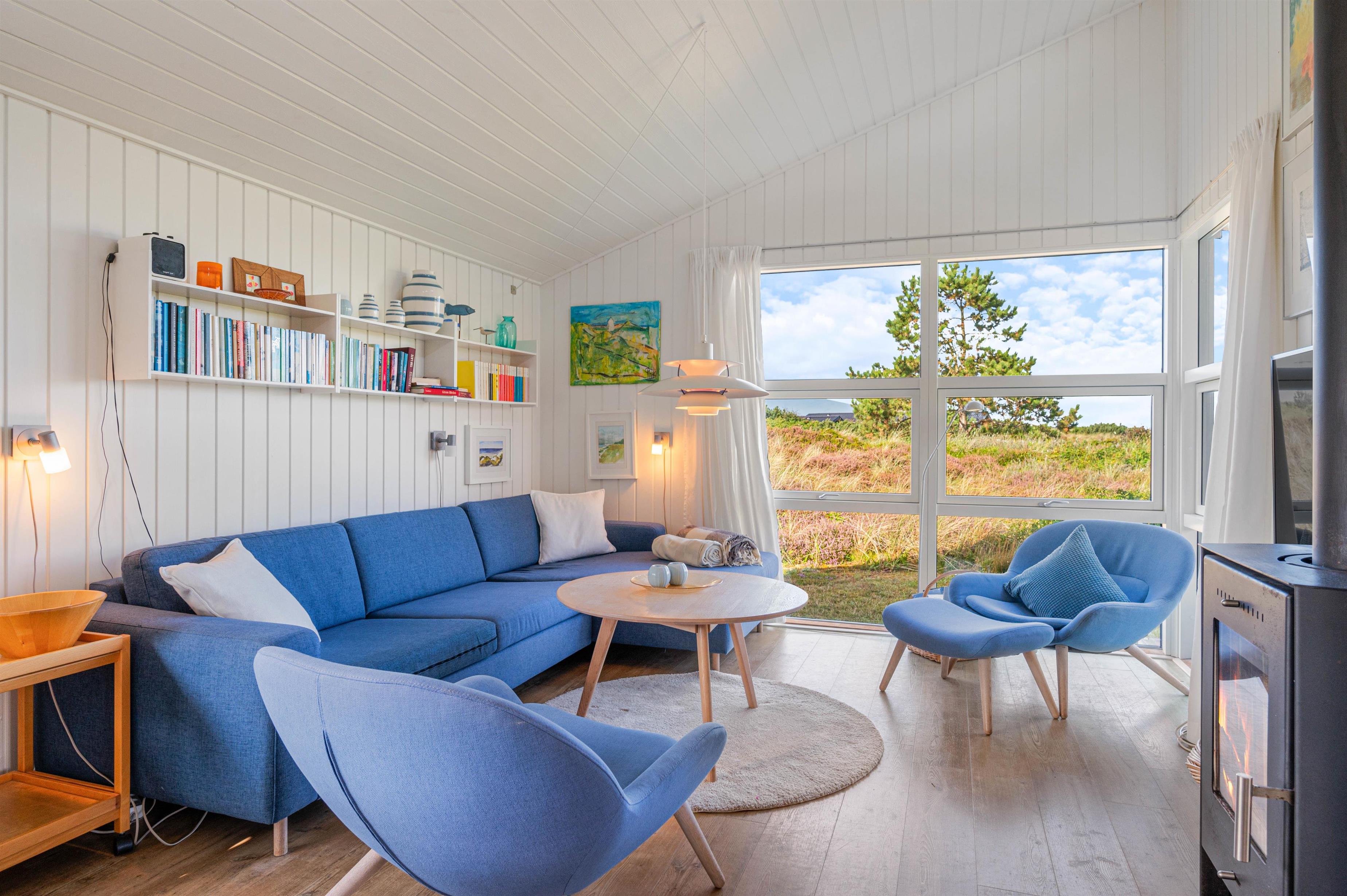 Køkkenet står i åben forbindelse med stuen og råder bl.a. over opvaskemaskine, placeret i skabet under køleskabet, og frostboks i køleskabet. Stuen har loft til kip og vinduerne er placeret således, at man kan nyde den gode udsigt mod Nr. Lyngvig Fyr uden at måtte gå på kompromis med privatlivet. Stuen byder herudover på fladskærms-TV, DVD, internetforbindelse samt en skøn brændeovn.