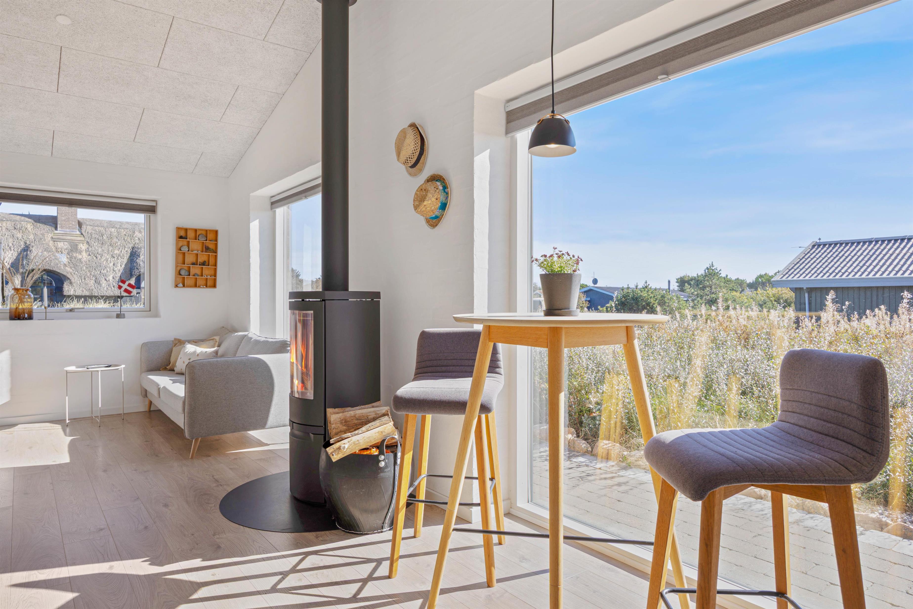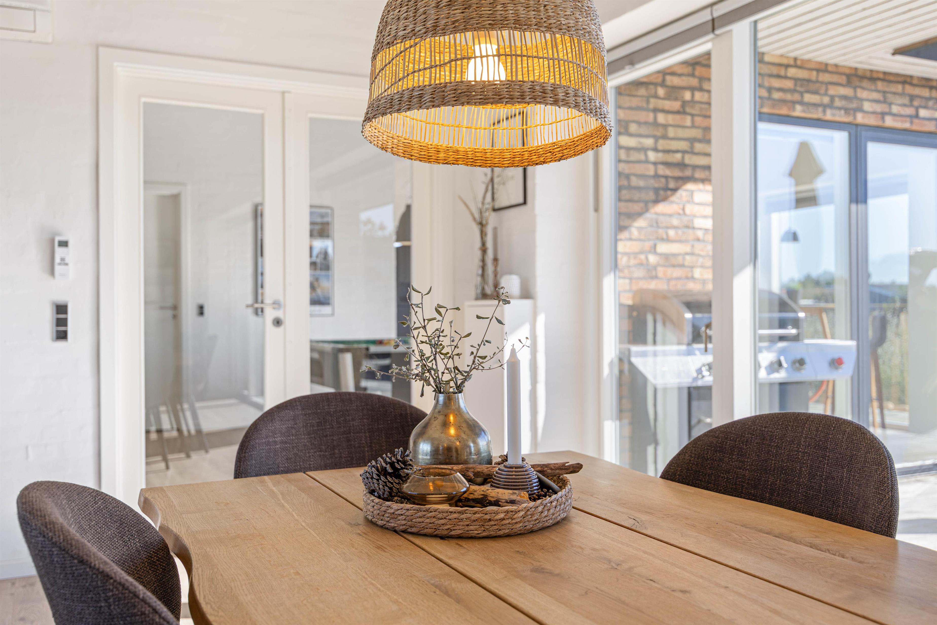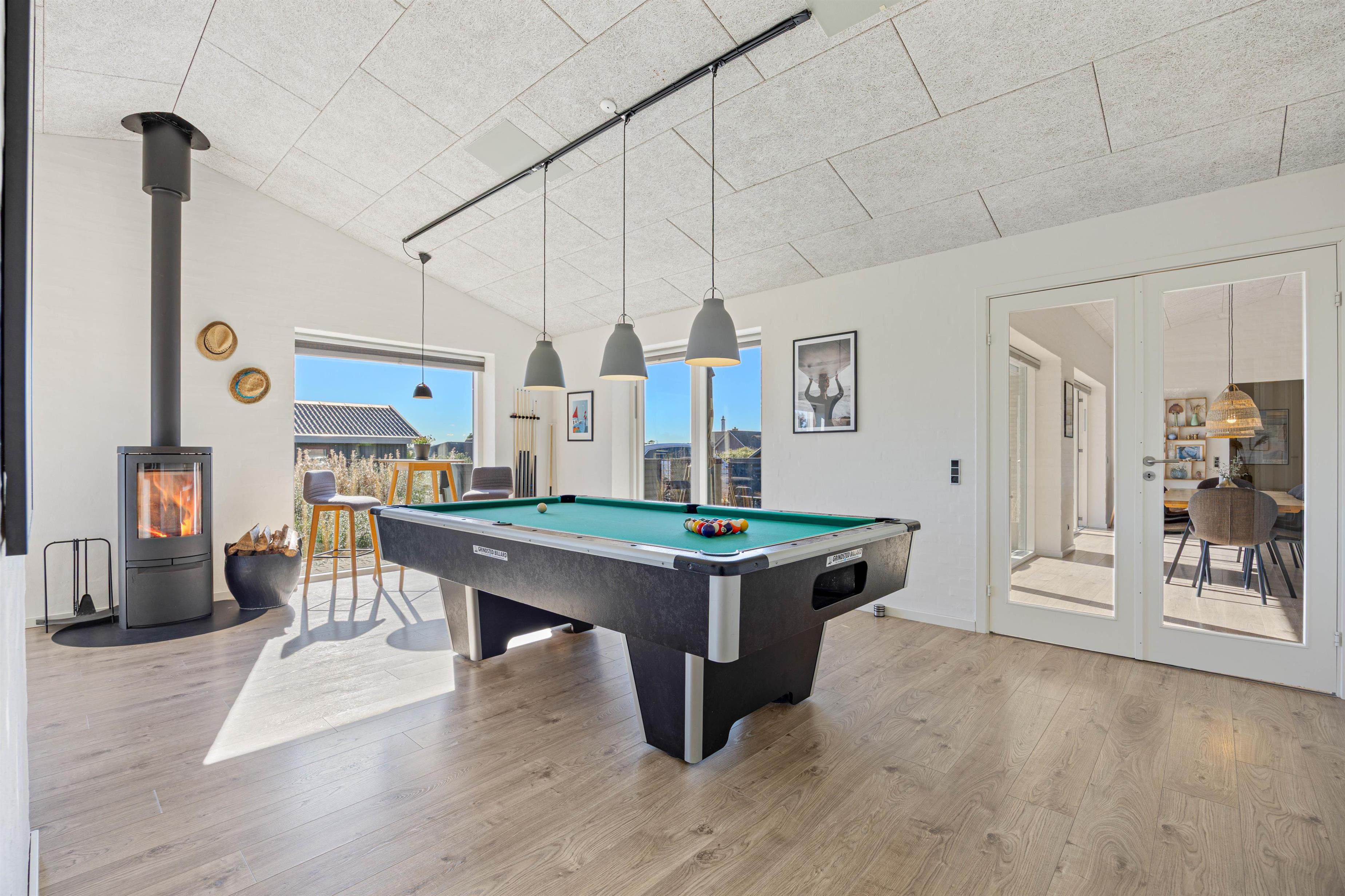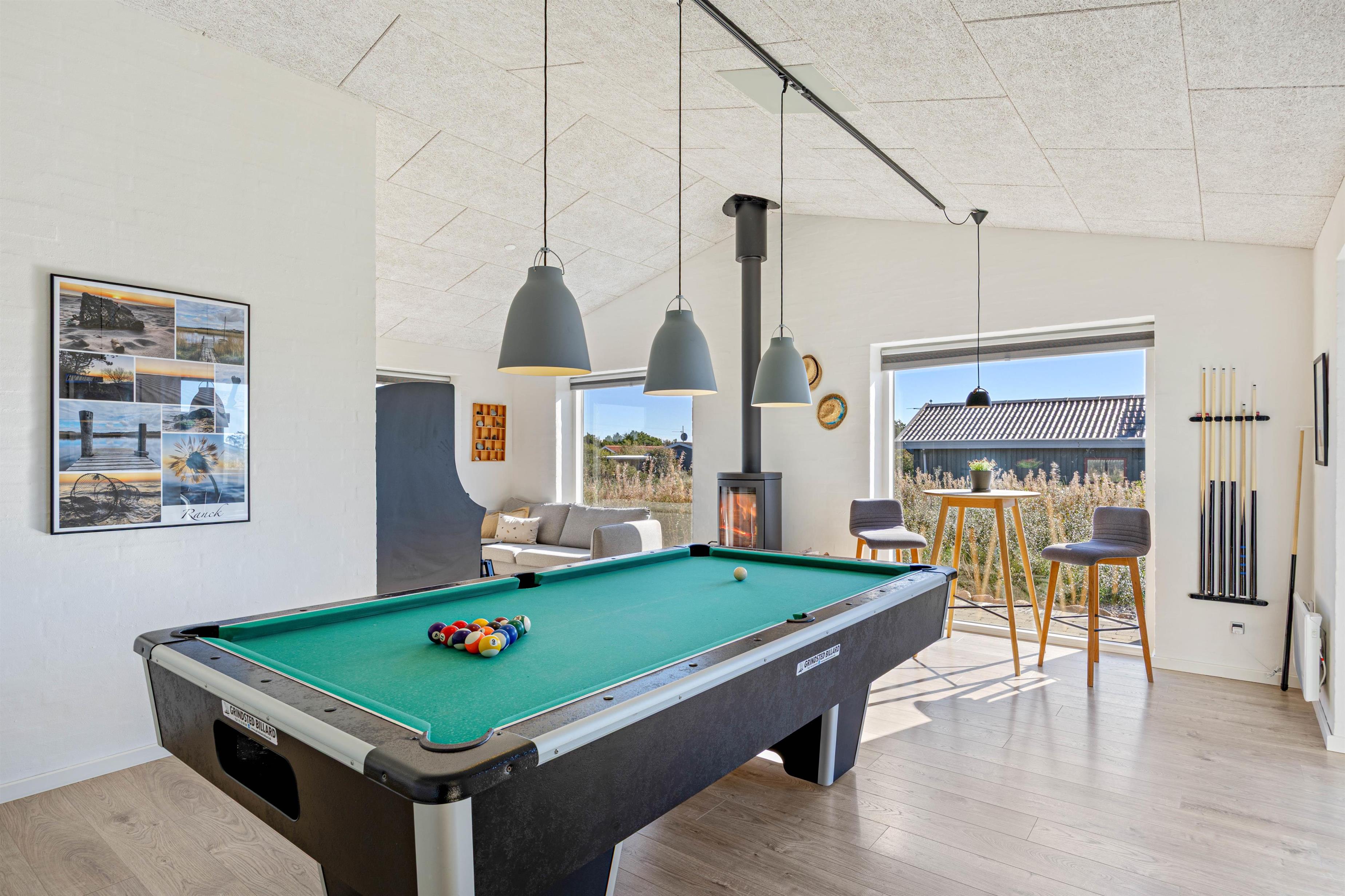 Feriehusets centrum og hjerte er det stilfulde opholdsrum, der kombinerer både køkken, spiseafdeling og stue i ét. Og ved siden af det, finder I aktivitetsrummet med billardbord, der med sikkerhed bliver omdrejningspunktet for mange hyggelige feriestunder med billardturneringer - og den knitrende ild i brændeovn i baggrunden.