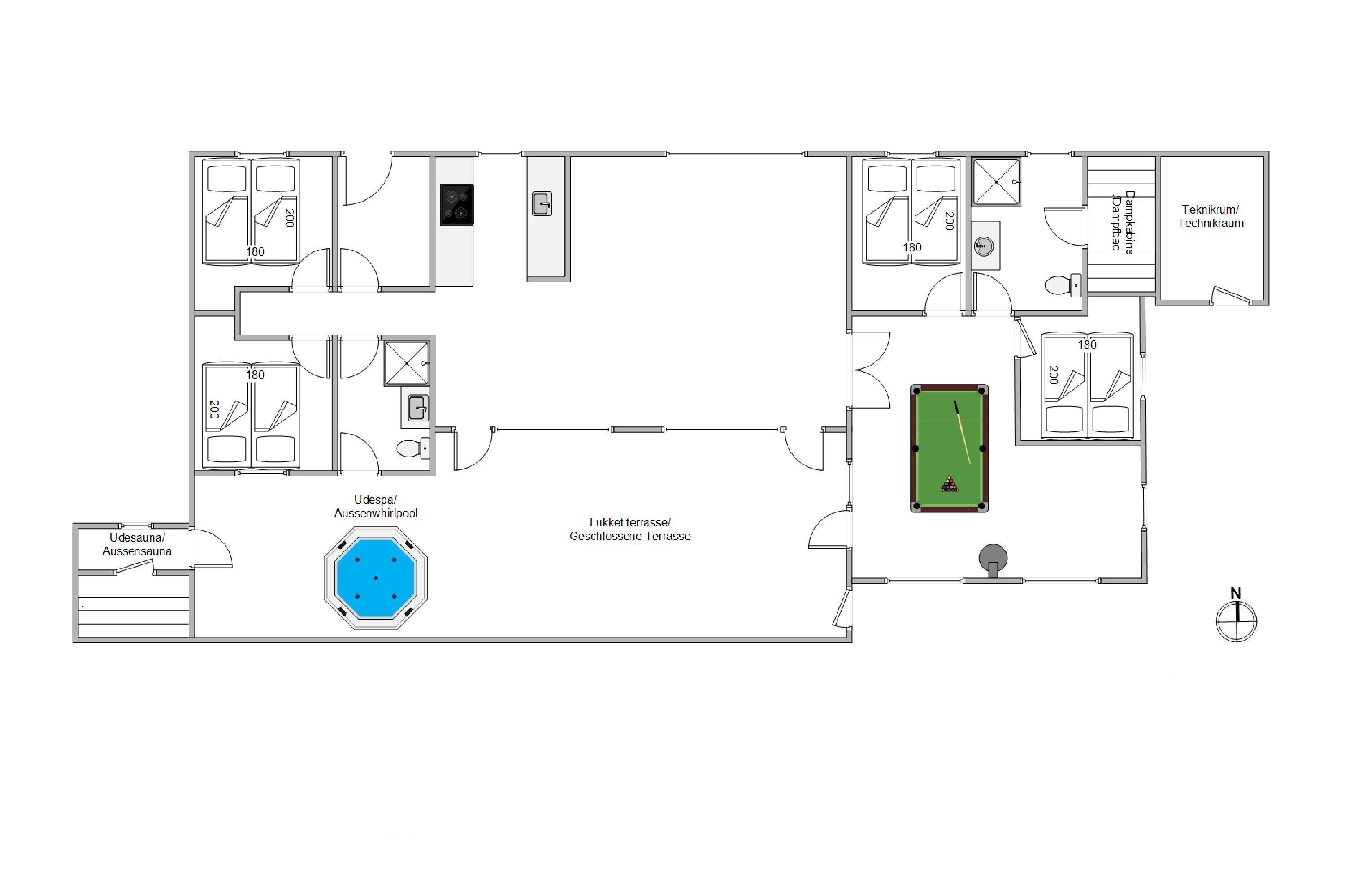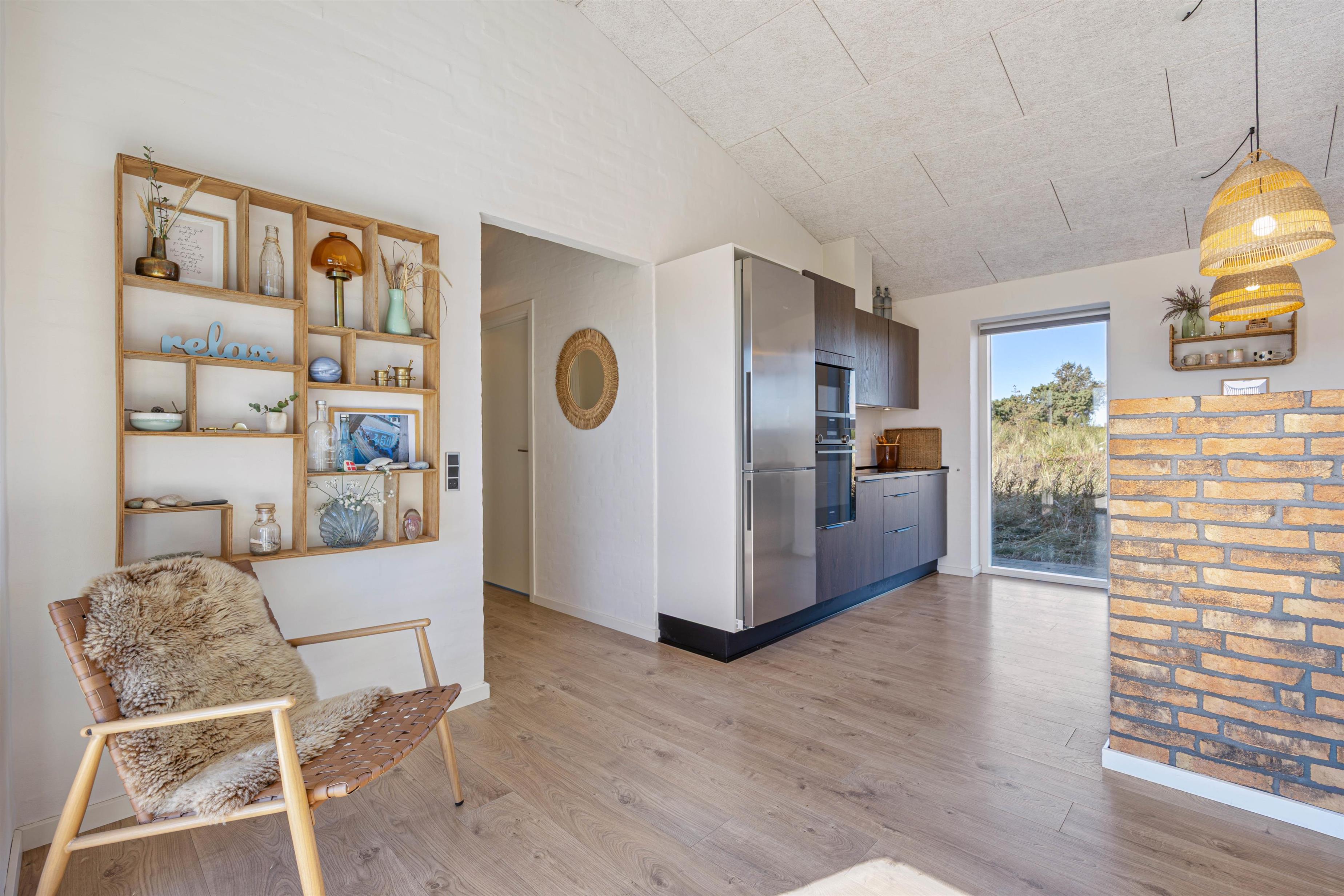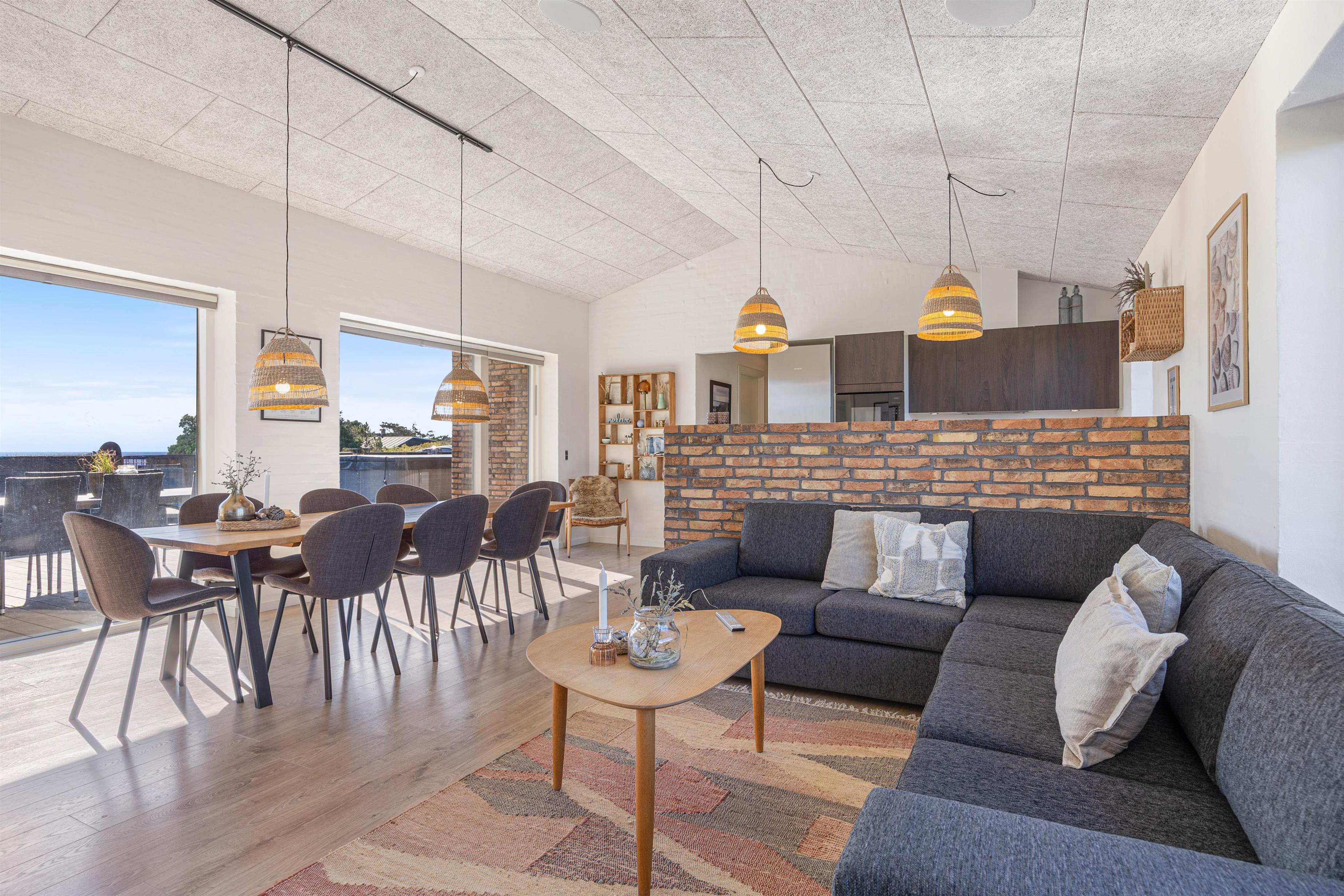 Feriehusets centrum og hjerte er det stilfulde opholdsrum, der kombinerer både køkken, spiseafdeling og stue i ét. Og ved siden af det, finder I aktivitetsrummet med billardbord, der med sikkerhed bliver omdrejningspunktet for mange hyggelige feriestunder med billardturneringer - og den knitrende ild i brændeovn i baggrunden.