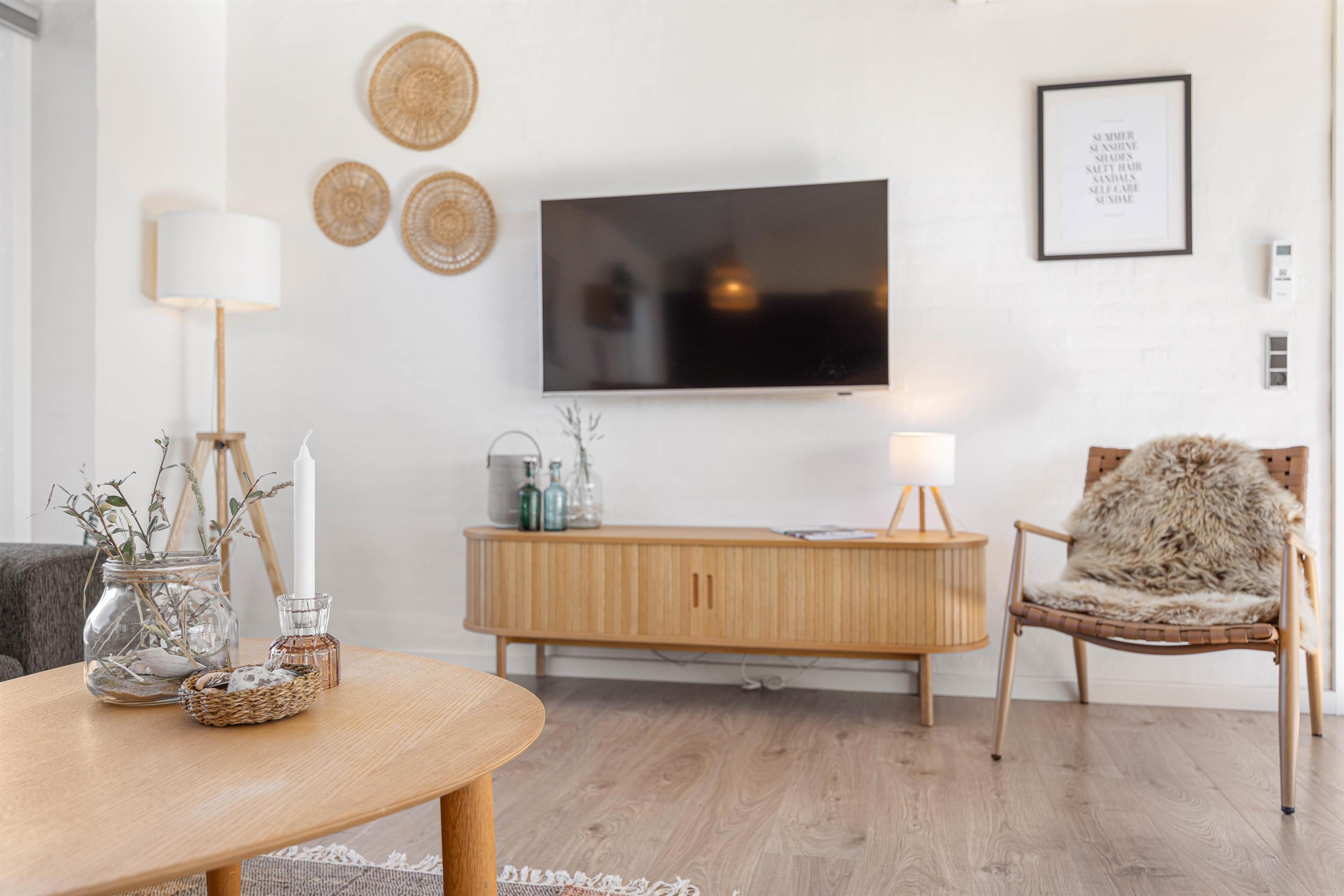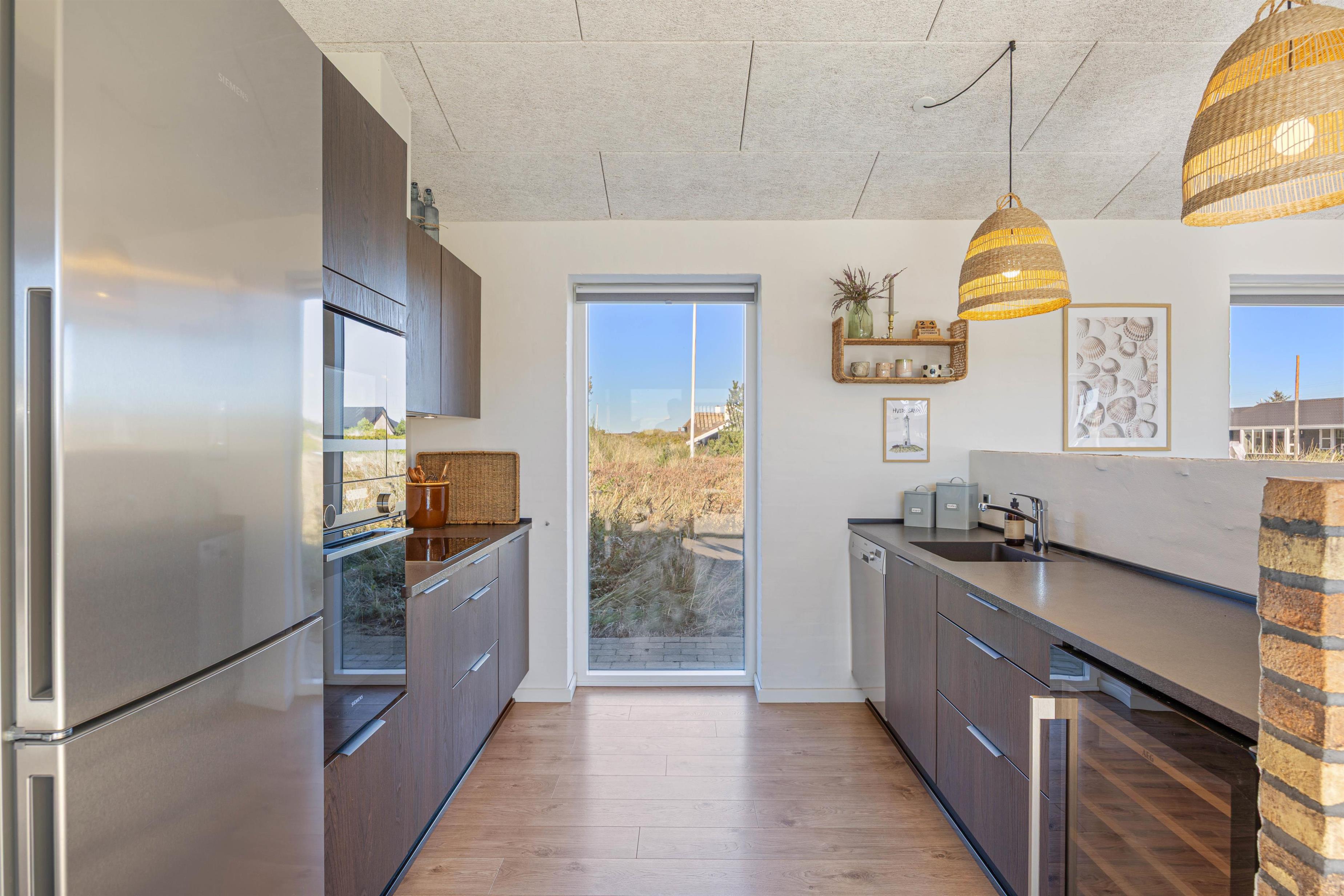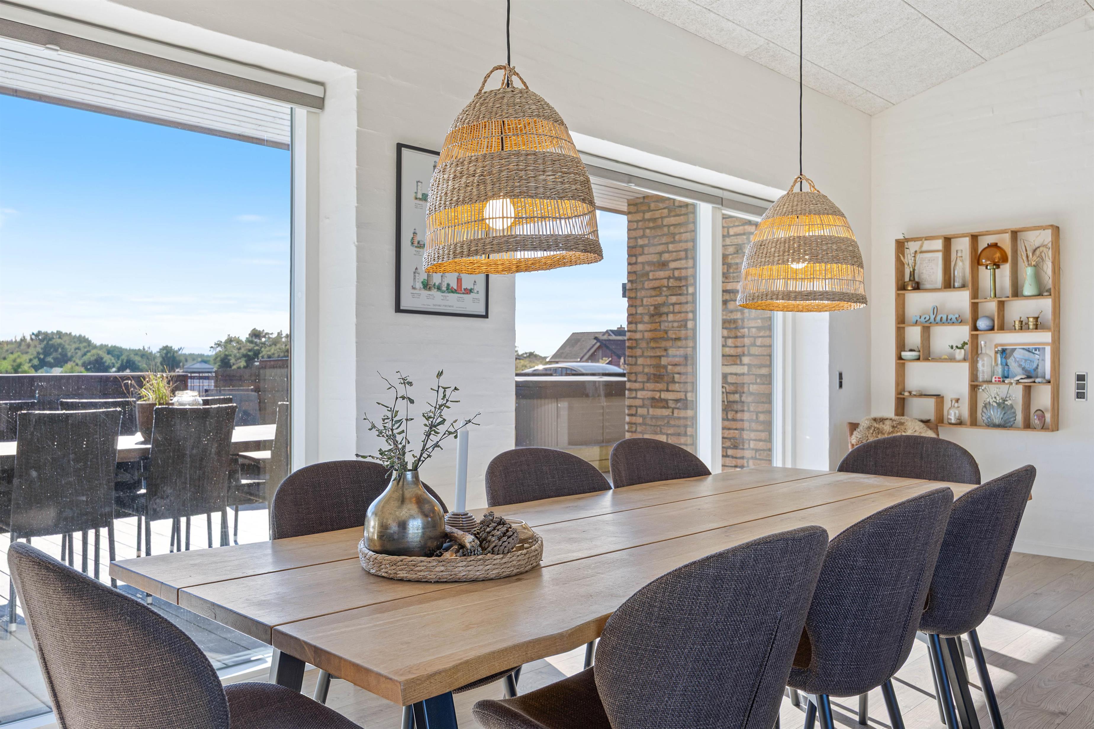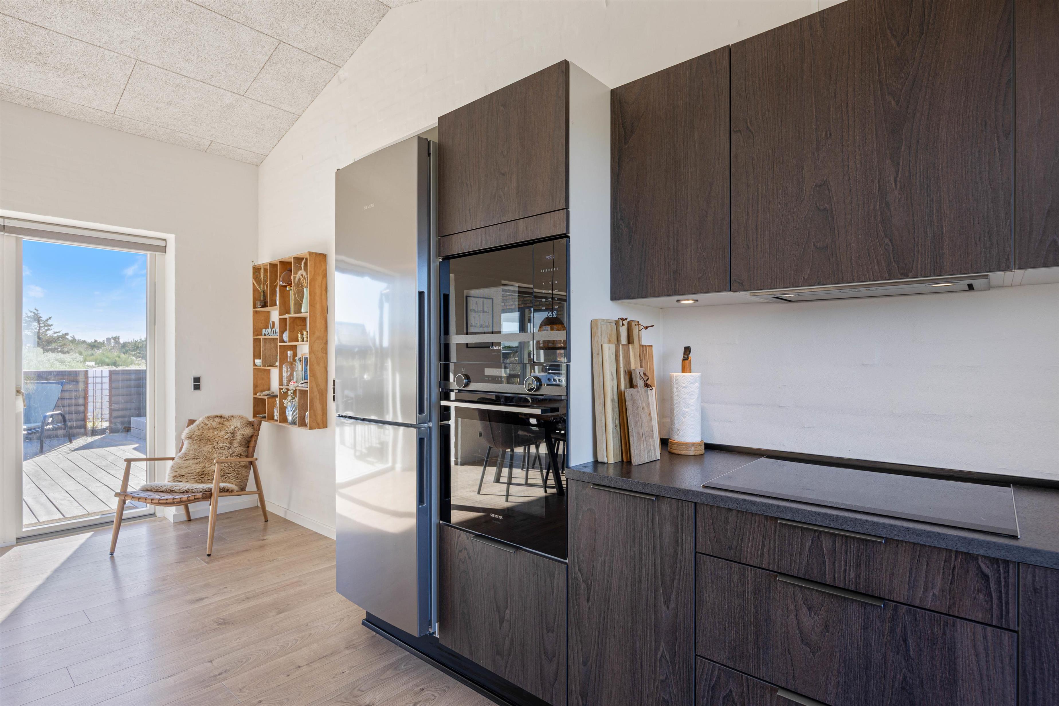 Feriehusets centrum og hjerte er det stilfulde opholdsrum, der kombinerer både køkken, spiseafdeling og stue i ét. Og ved siden af det, finder I aktivitetsrummet med billardbord, der med sikkerhed bliver omdrejningspunktet for mange hyggelige feriestunder med billardturneringer - og den knitrende ild i brændeovn i baggrunden.