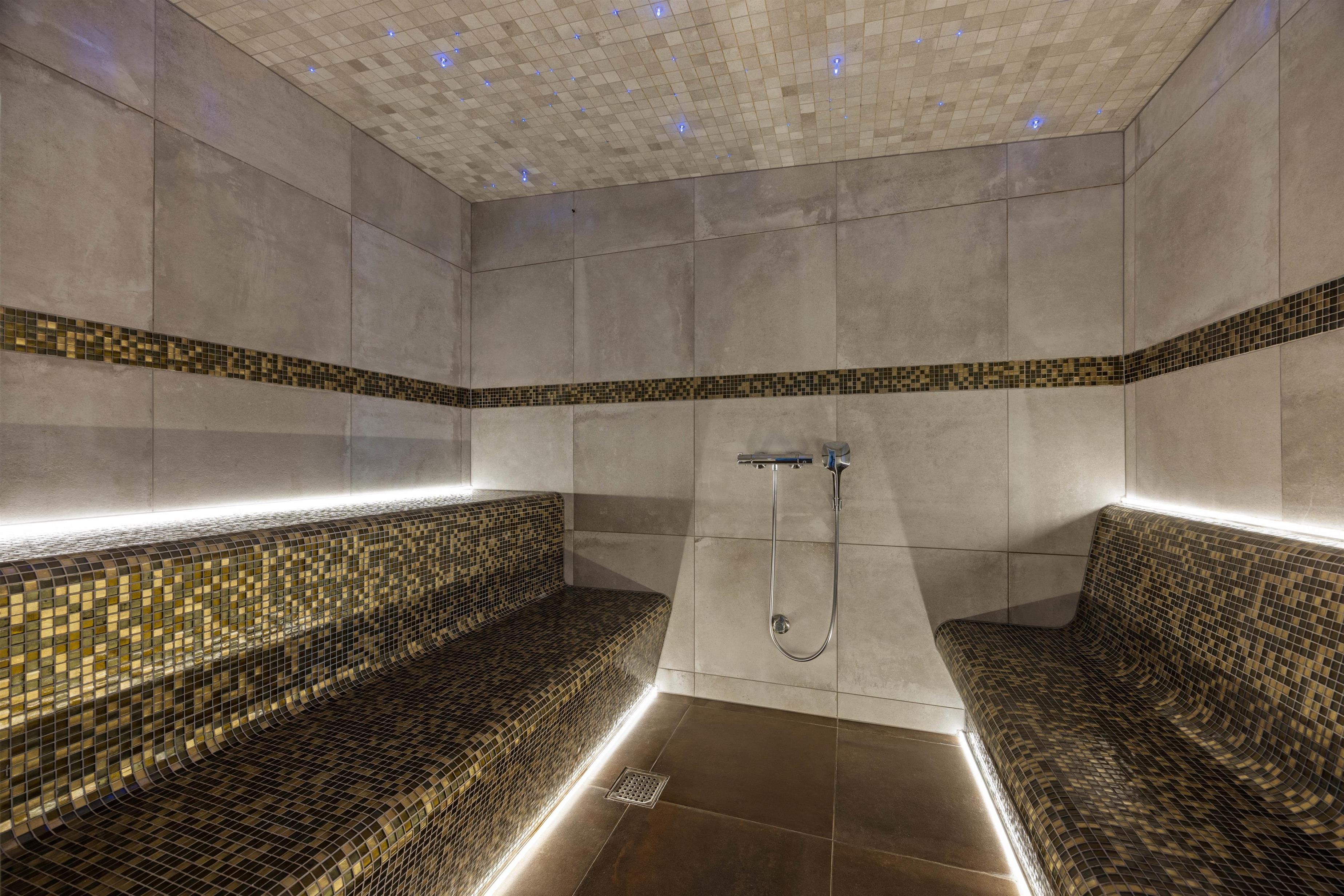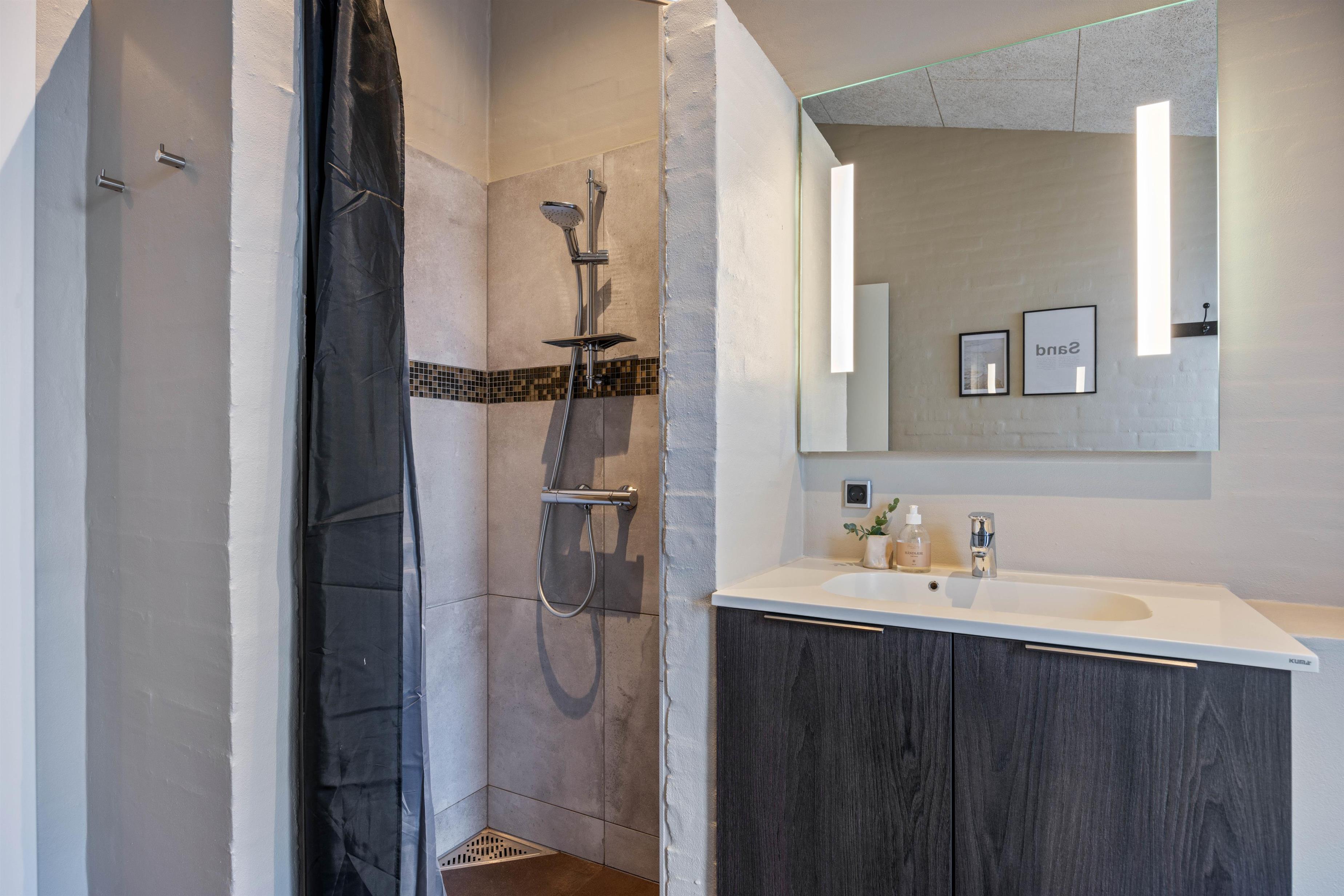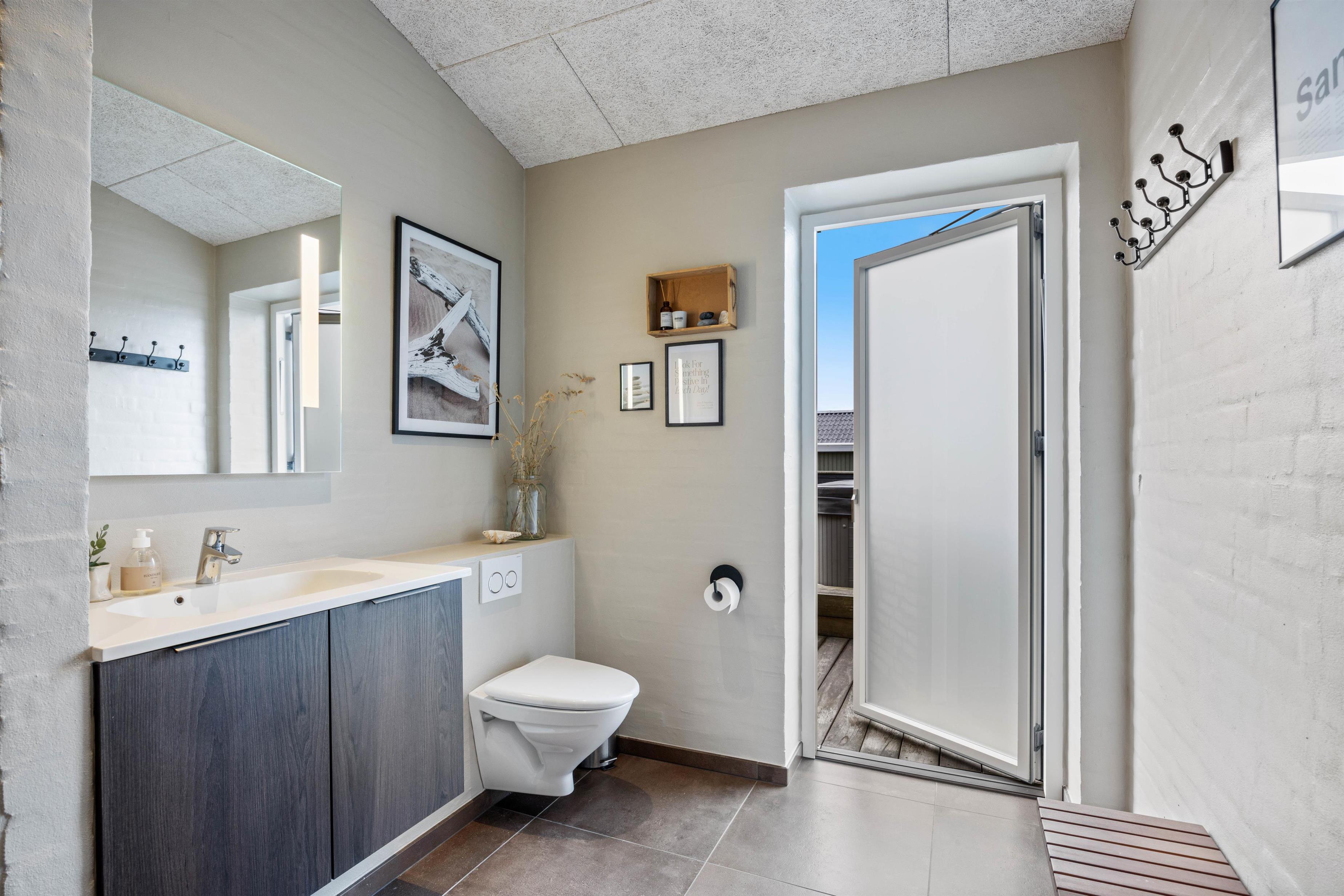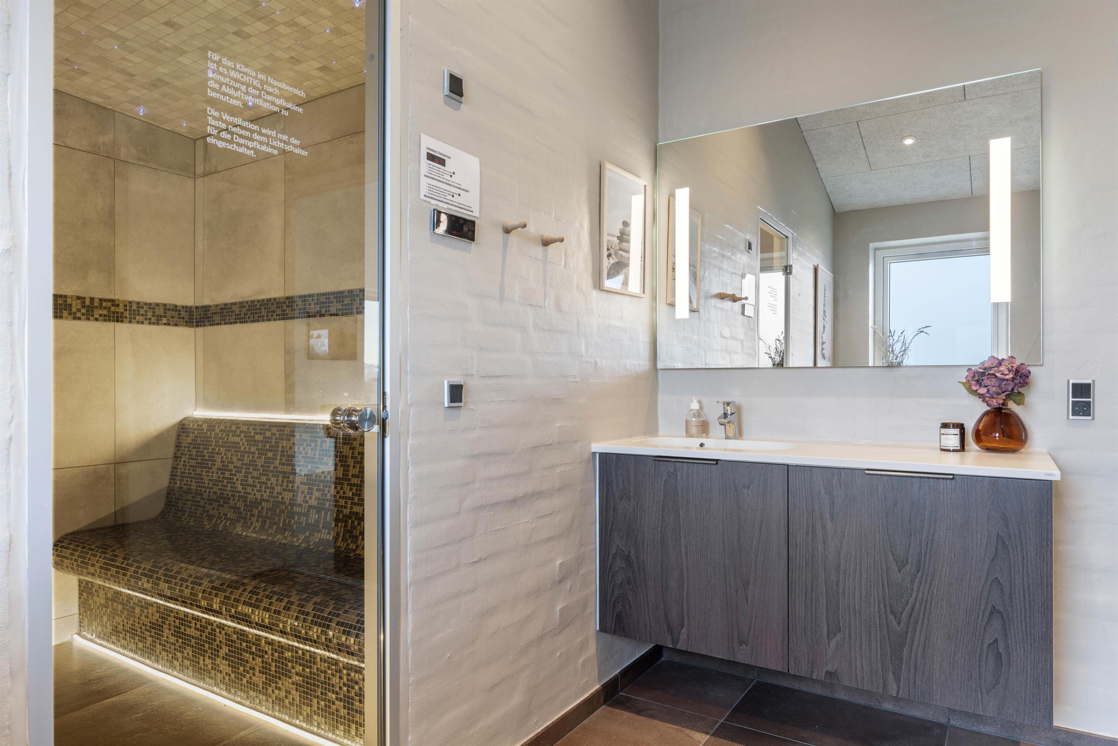 Sovepladserne er fordelt i to afdelinger – en mod vest og en mod øst, begge med et badeværelse med gulvvarme tilknyttet. Det ene af badeværelserne gemmer også på en af feriehusets wellness-highlights: Jeres helt eget dampbad!