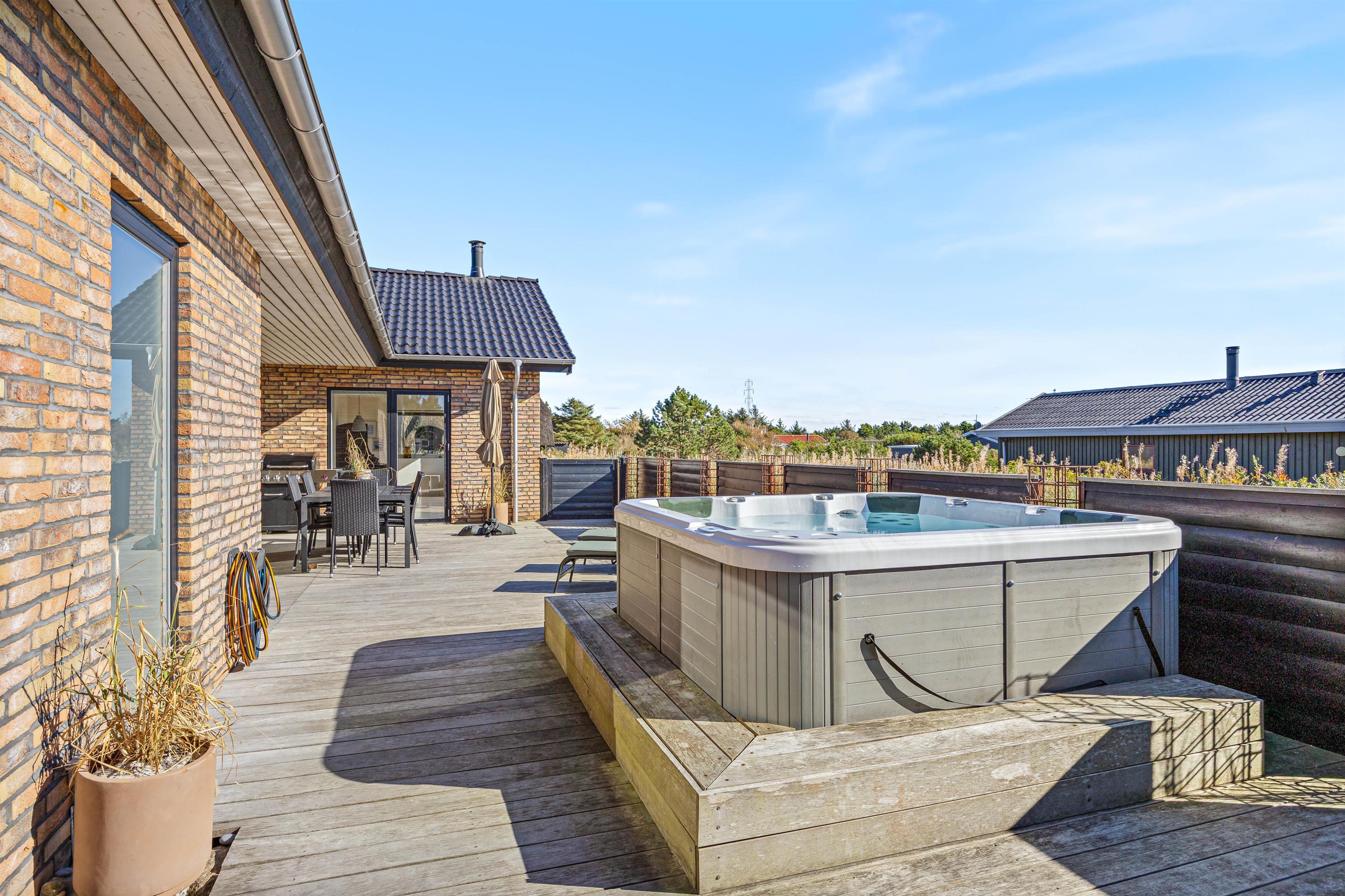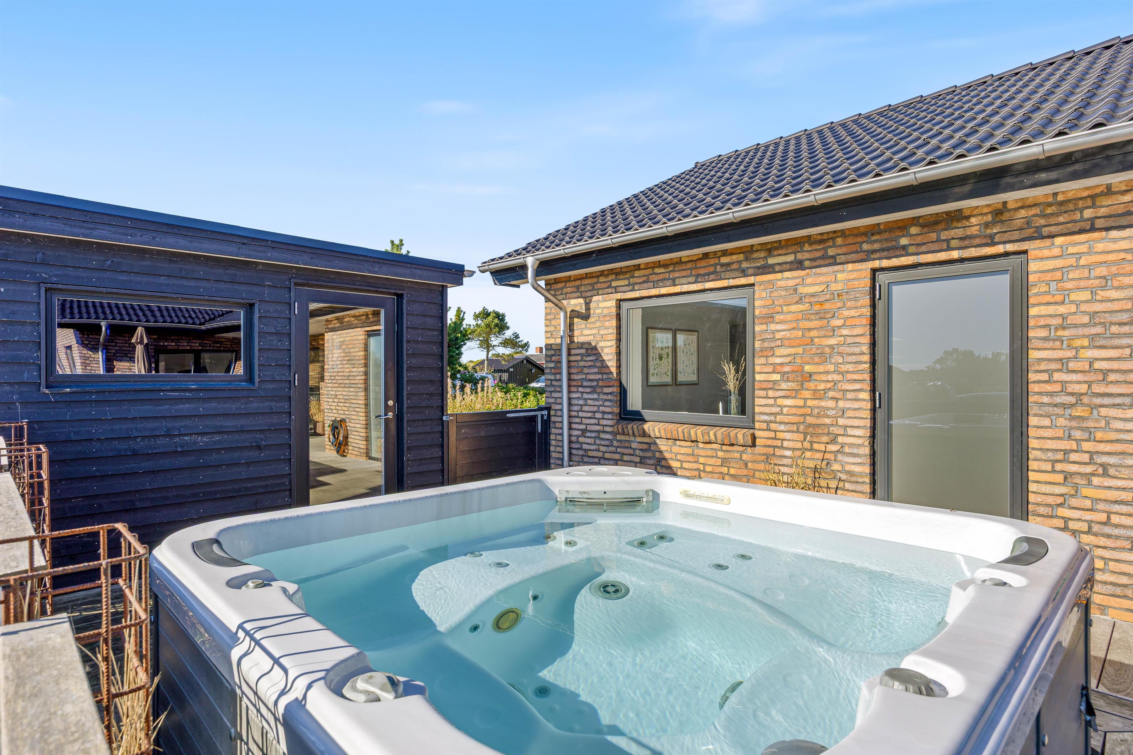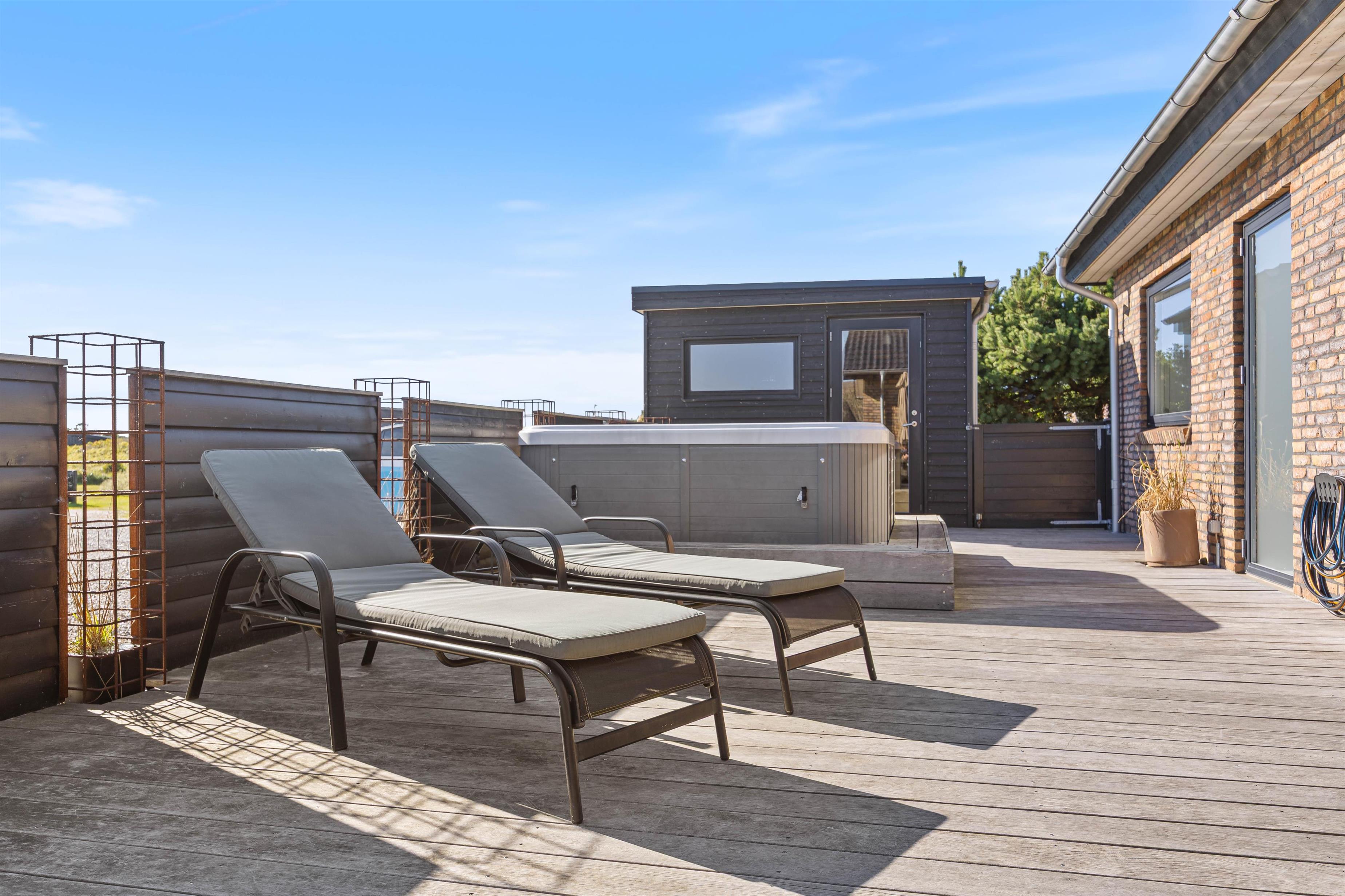 Det er ikke kun indvendigt, aktivitetshuset imponerer. Også de udendørs omgivelser byder på fede highlights. Her er der ikke kun sørget for gode havemøbler, liggestole og en stor gasgrill til de hyggelige grillaftener – der er også et udendørs spabad, der indbyder til lækre luksusoplevelser i den friske havluft. Terrassen er lukket hele vejen rundt, så I uden bekymringer kan lufte hundene.