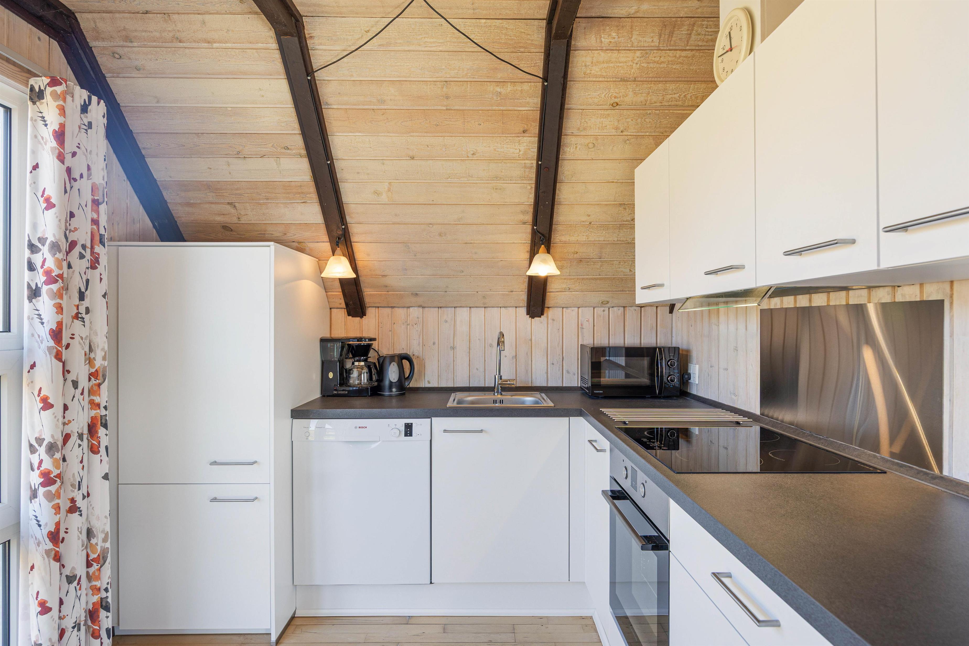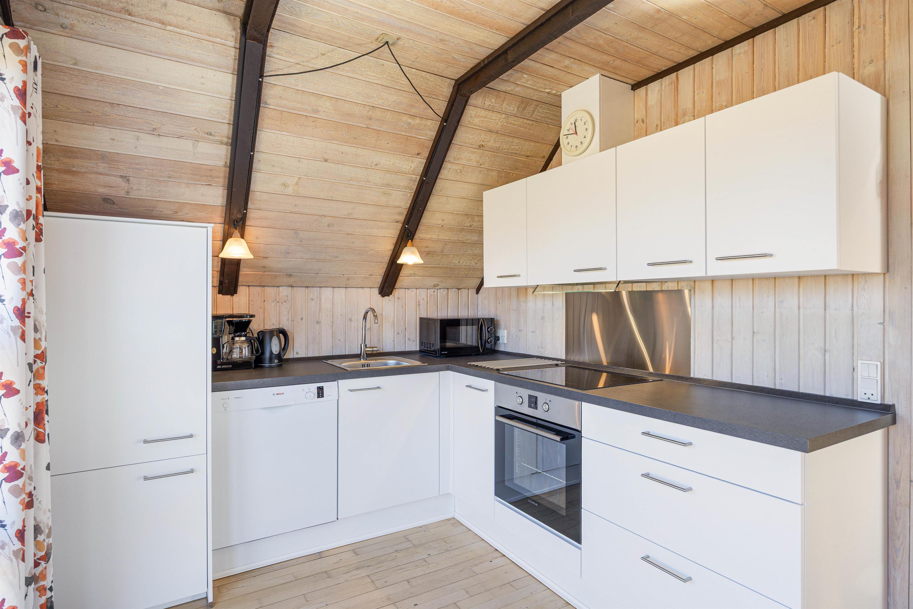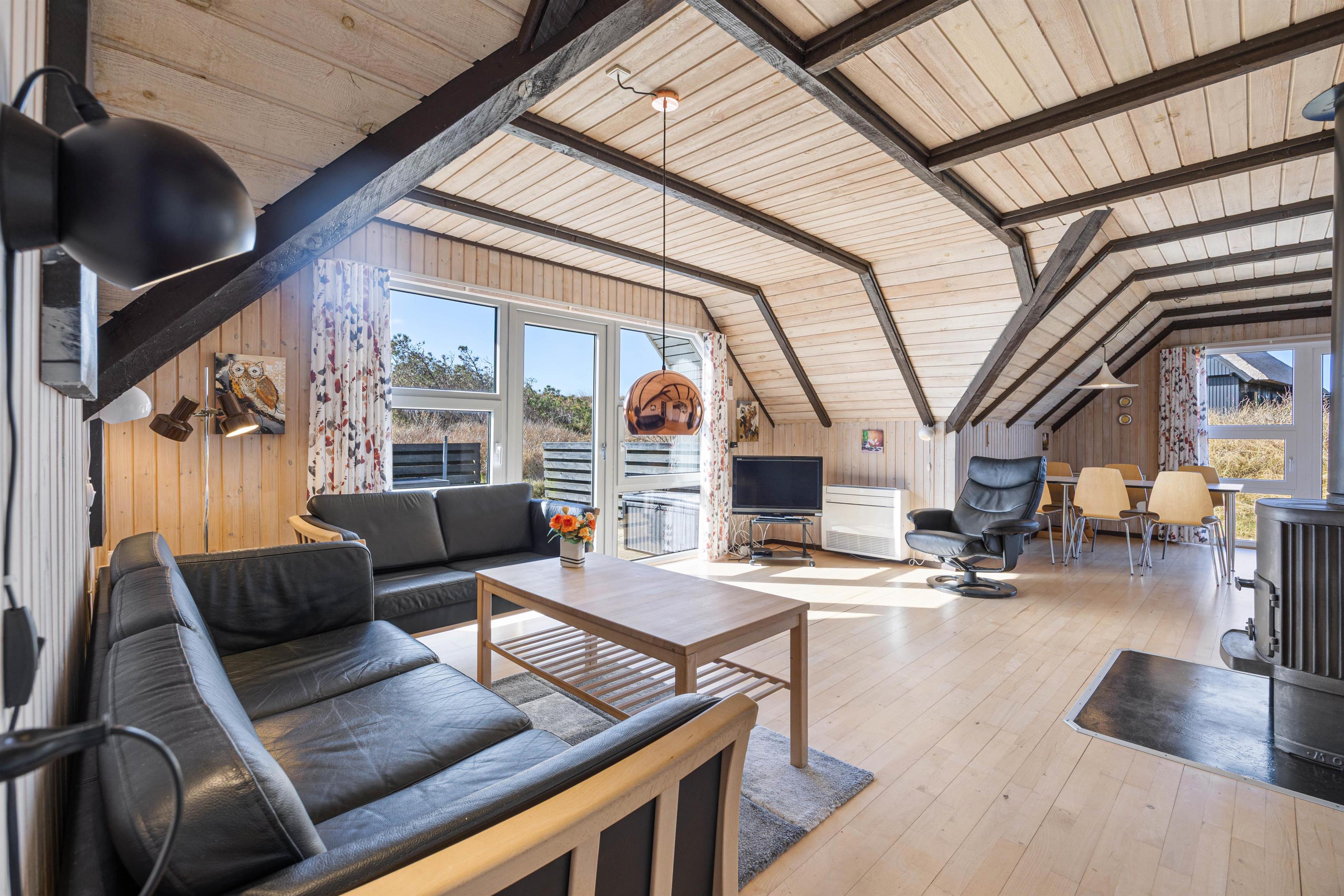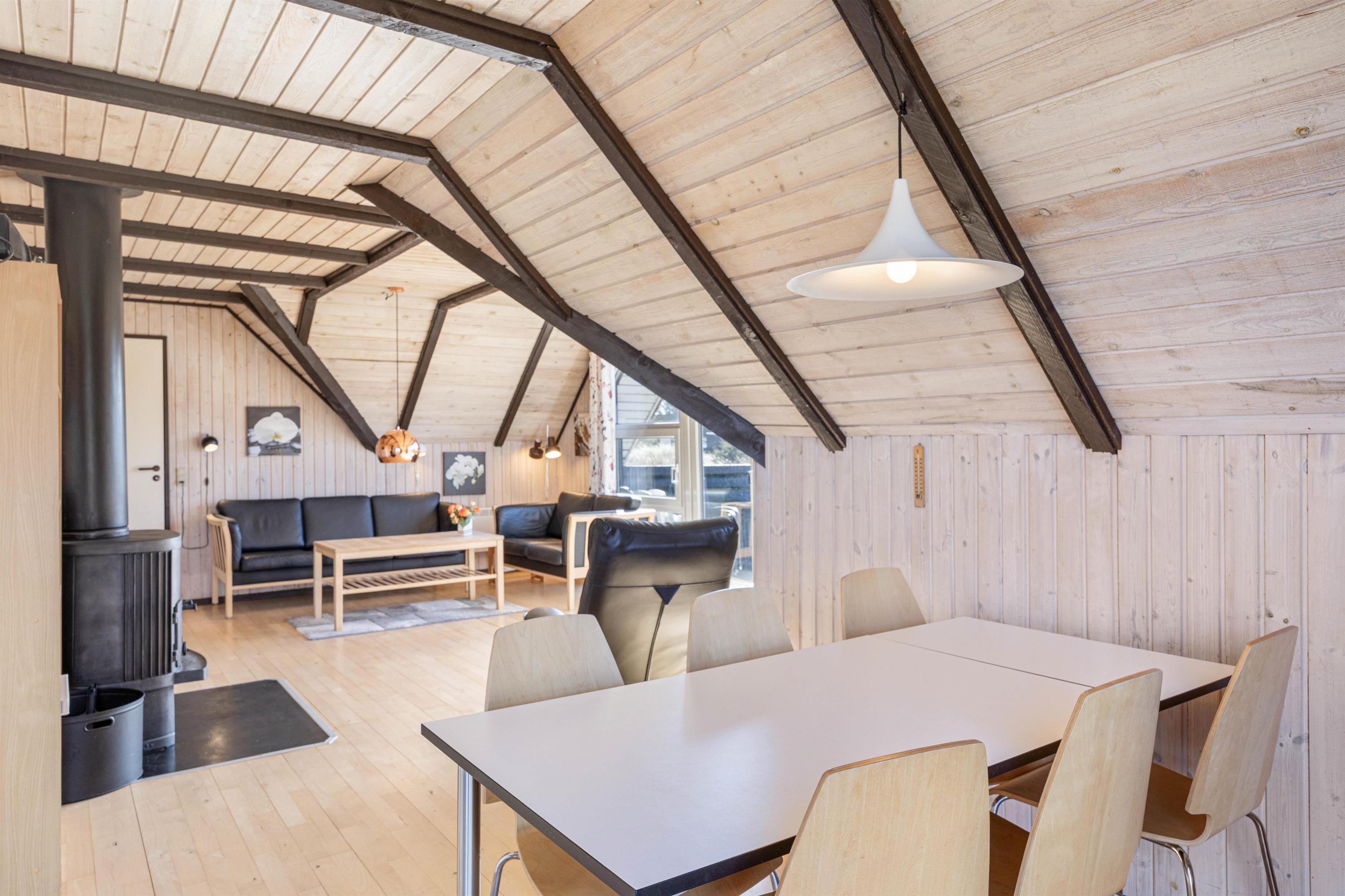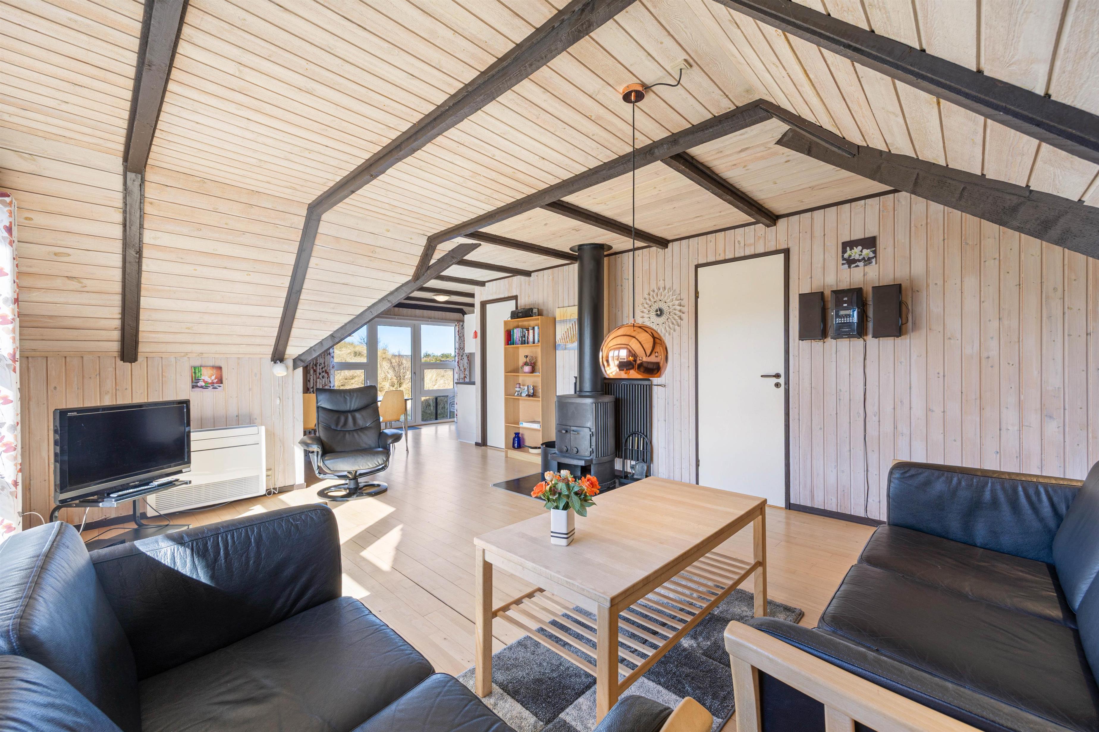 Hjertet i sommerhuset er det åbne opholdsrum, der forener køkken og stue i ét stort rum, hvor I kan samles til feriens mange hyggelige stunder. Vær sammen om madlavningen eller find en sjov film i tv'et - mulighederne er mange. Brændeovnen fuldender den gode feriestemning med sin knitren i baggrunden, og ellers sørger en energivenlig varmepumpe for et behageligt indeklima i sommerhuset.