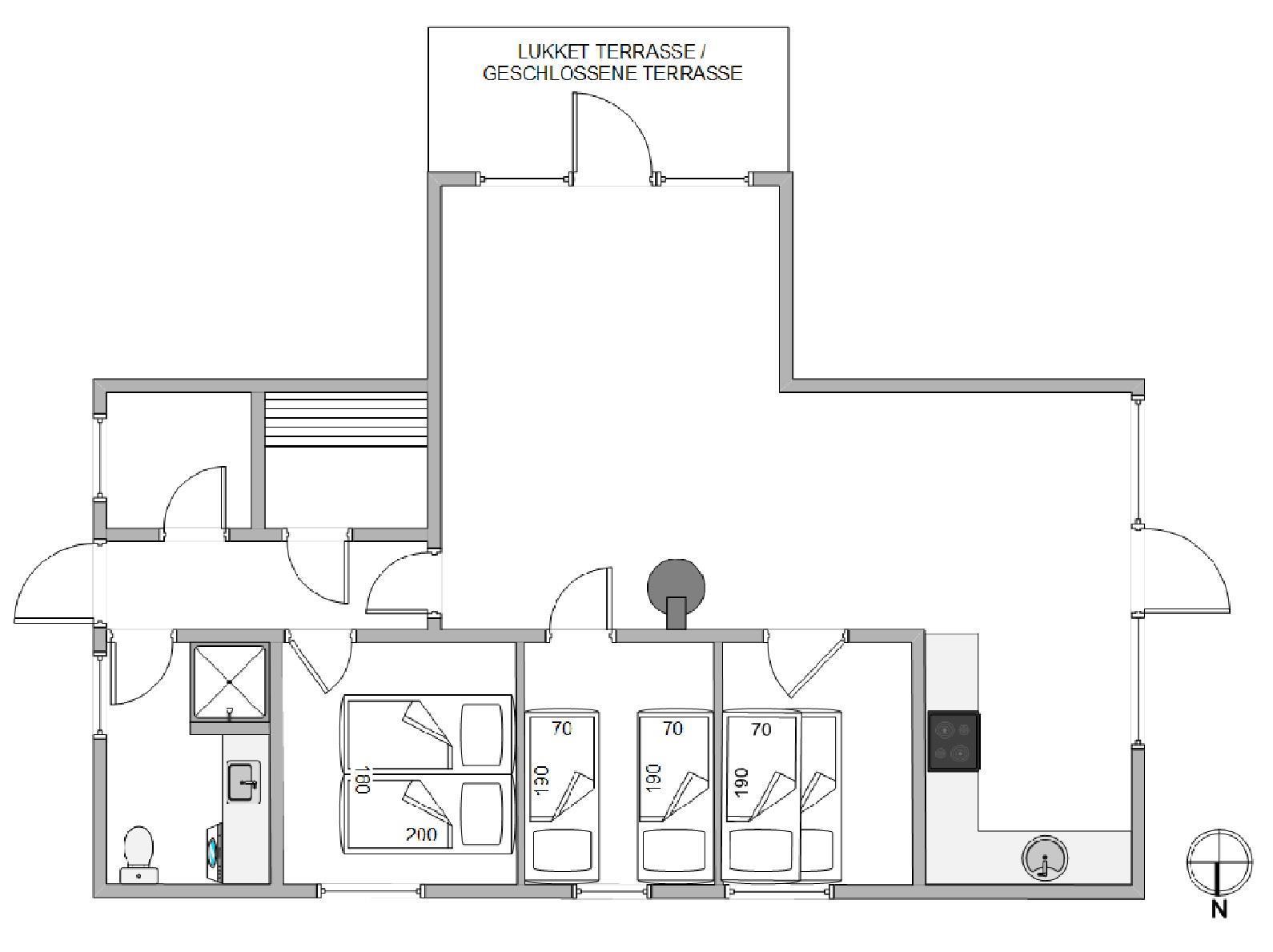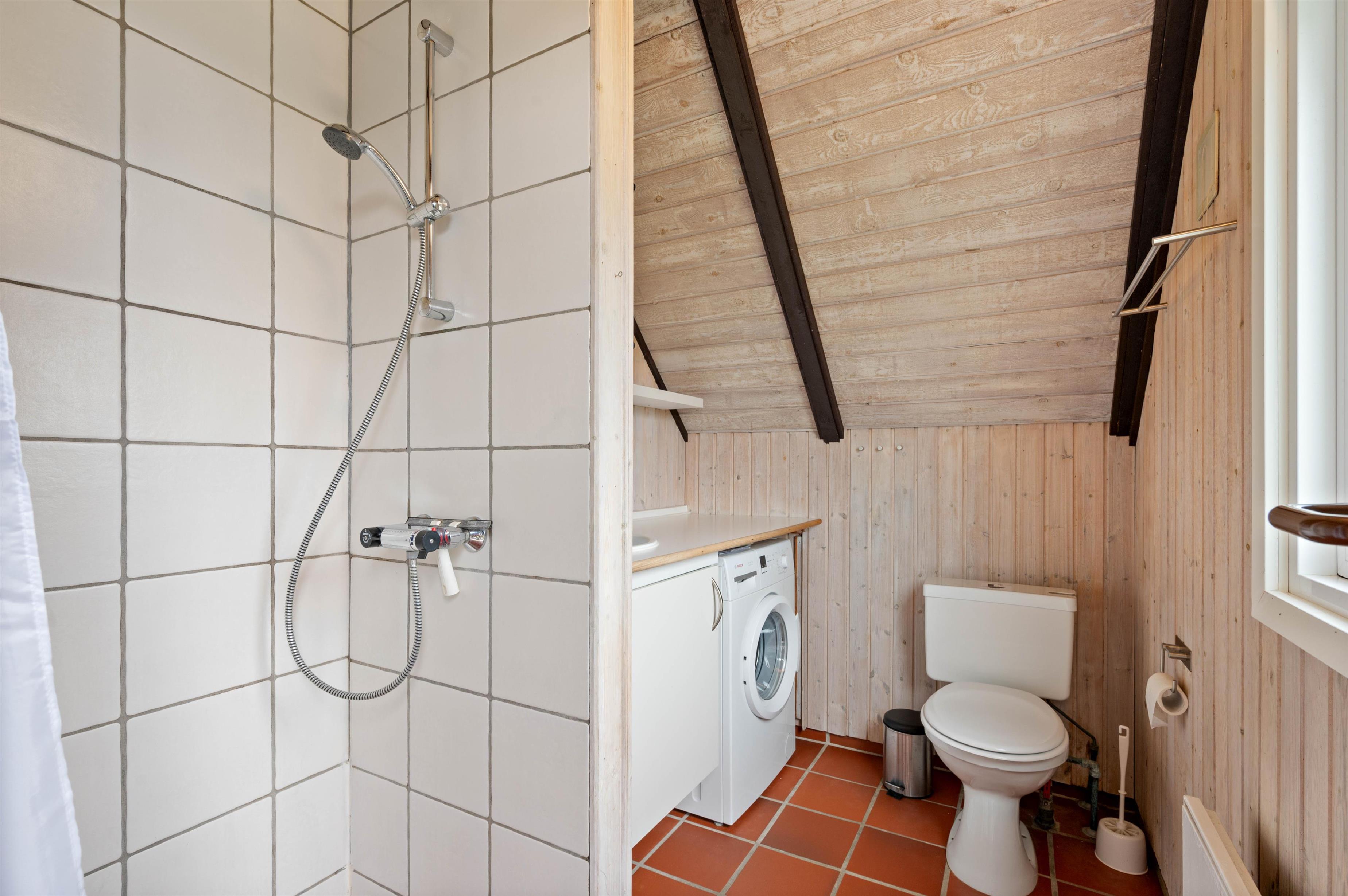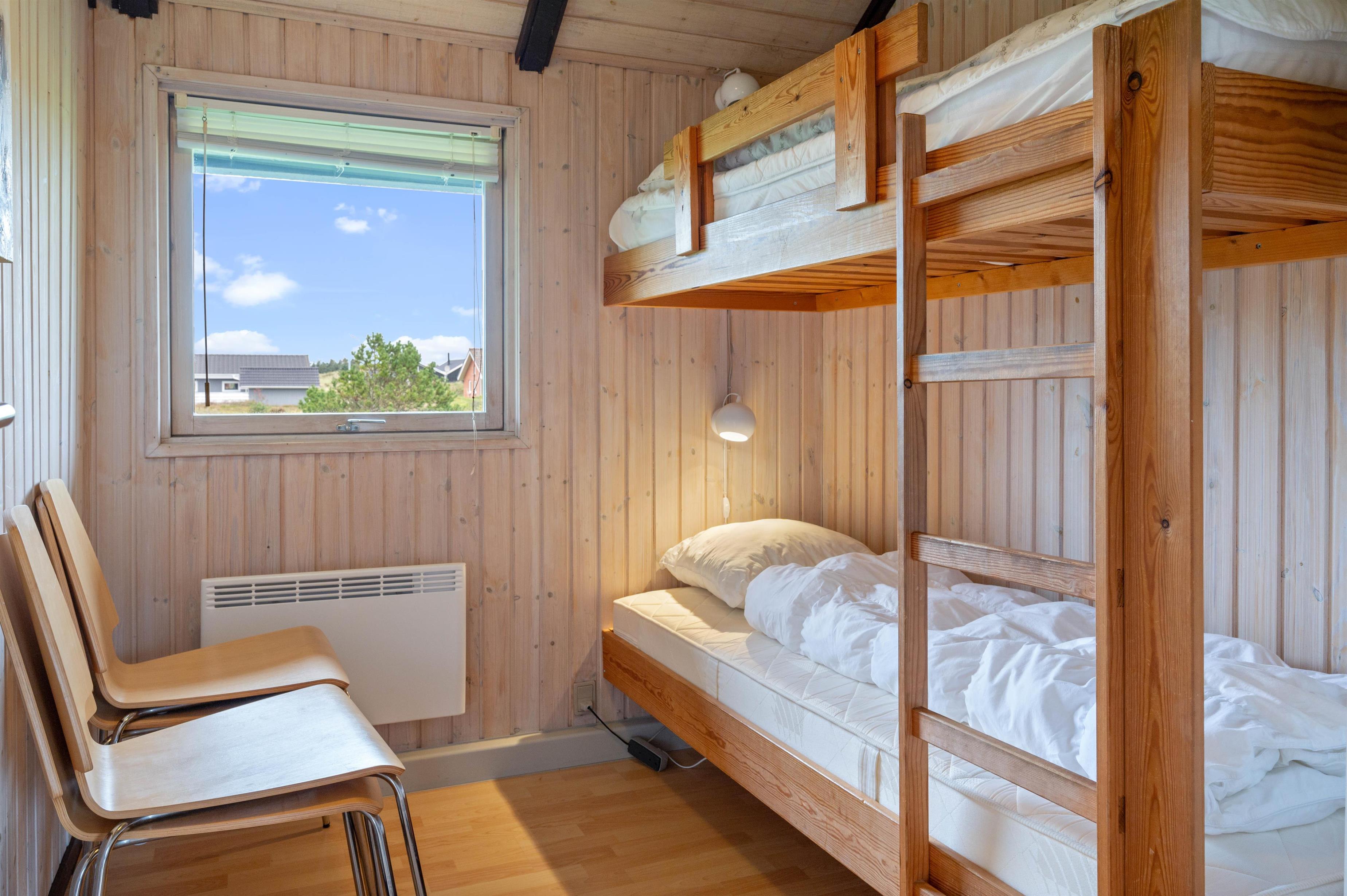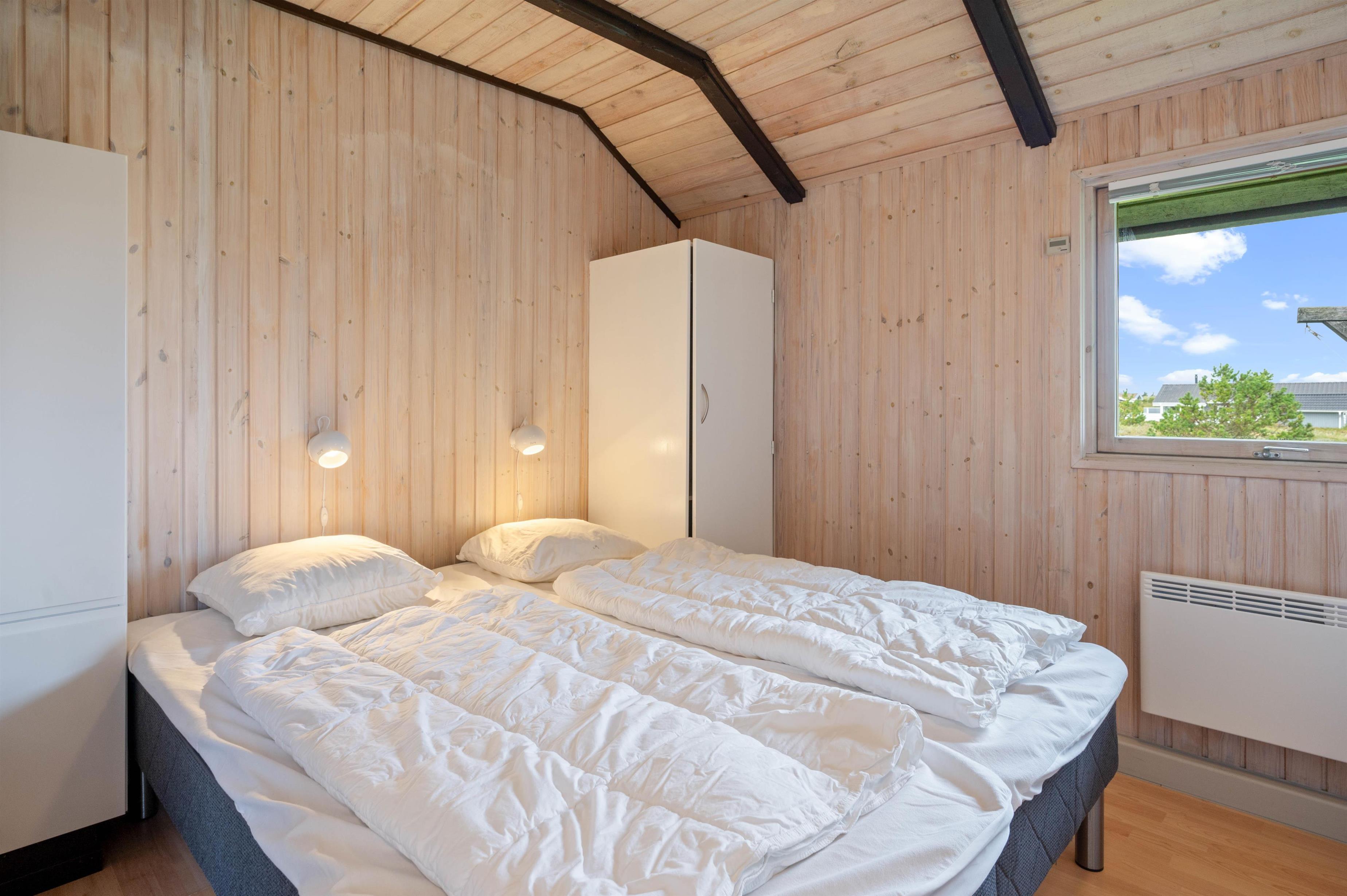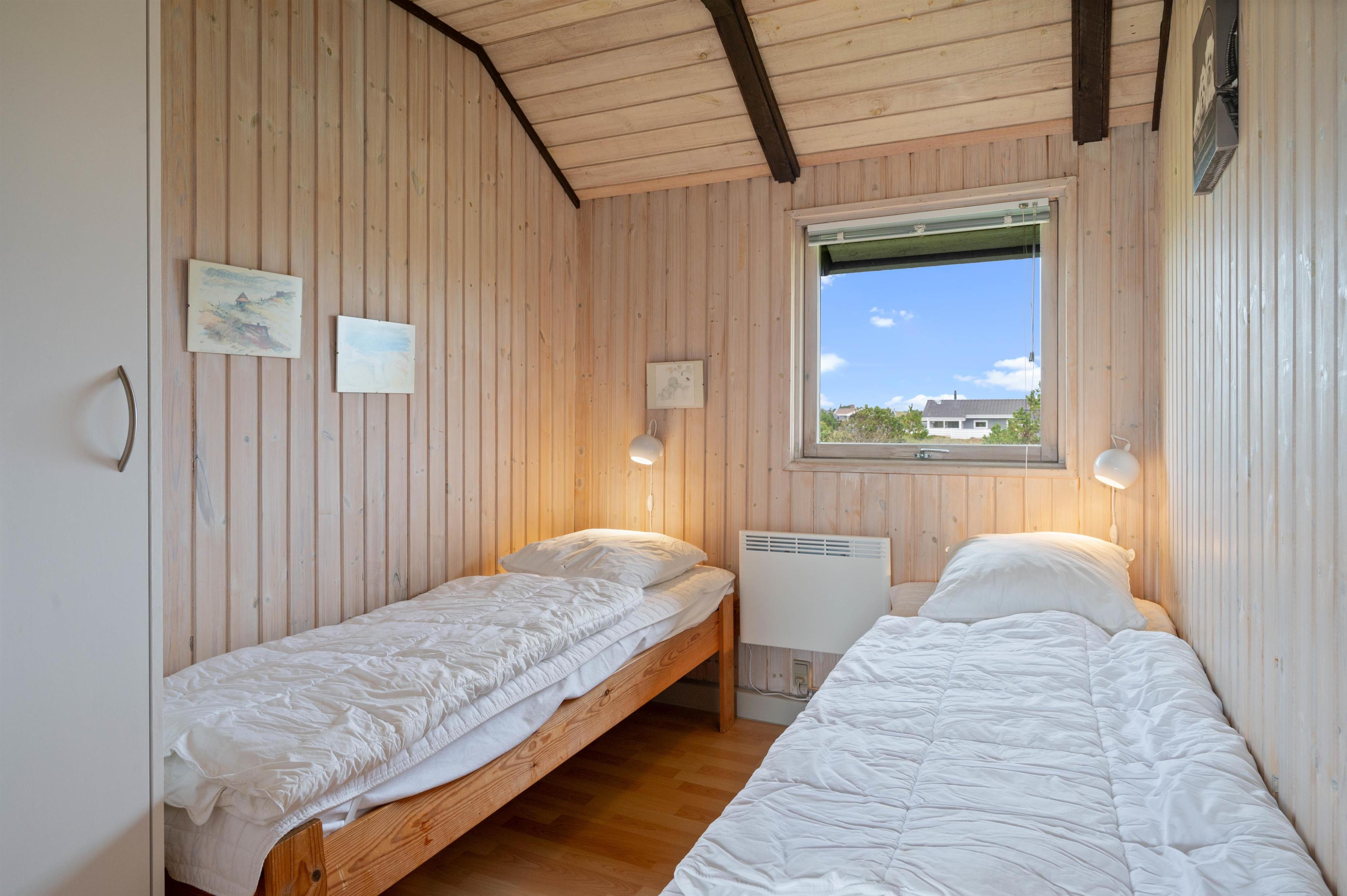 Sommerhuset er indrettet med 3 soveværelser - 1 med dobbeltseng, 1 med enkeltsenge og 1 med køjesenge - og 1 badeværelse med gulvvarme. I samme ende af sommerhuset, som badeværelset ligger, finder I også den skønne sauna, der forkæler jer med masser af afslapning på ferien. Her kan I slappe fuldstændig af, mens I bliver varmet godt igennem - også helt perfekt efter en tur ved Vesterhavet.