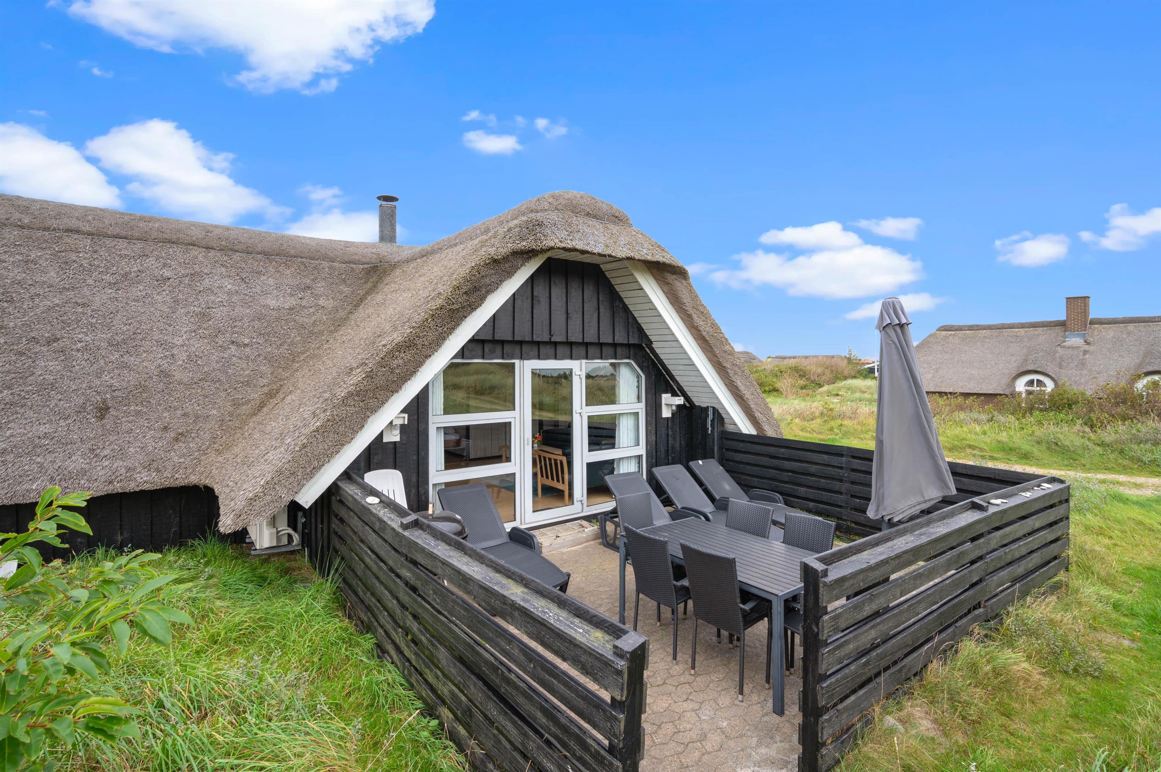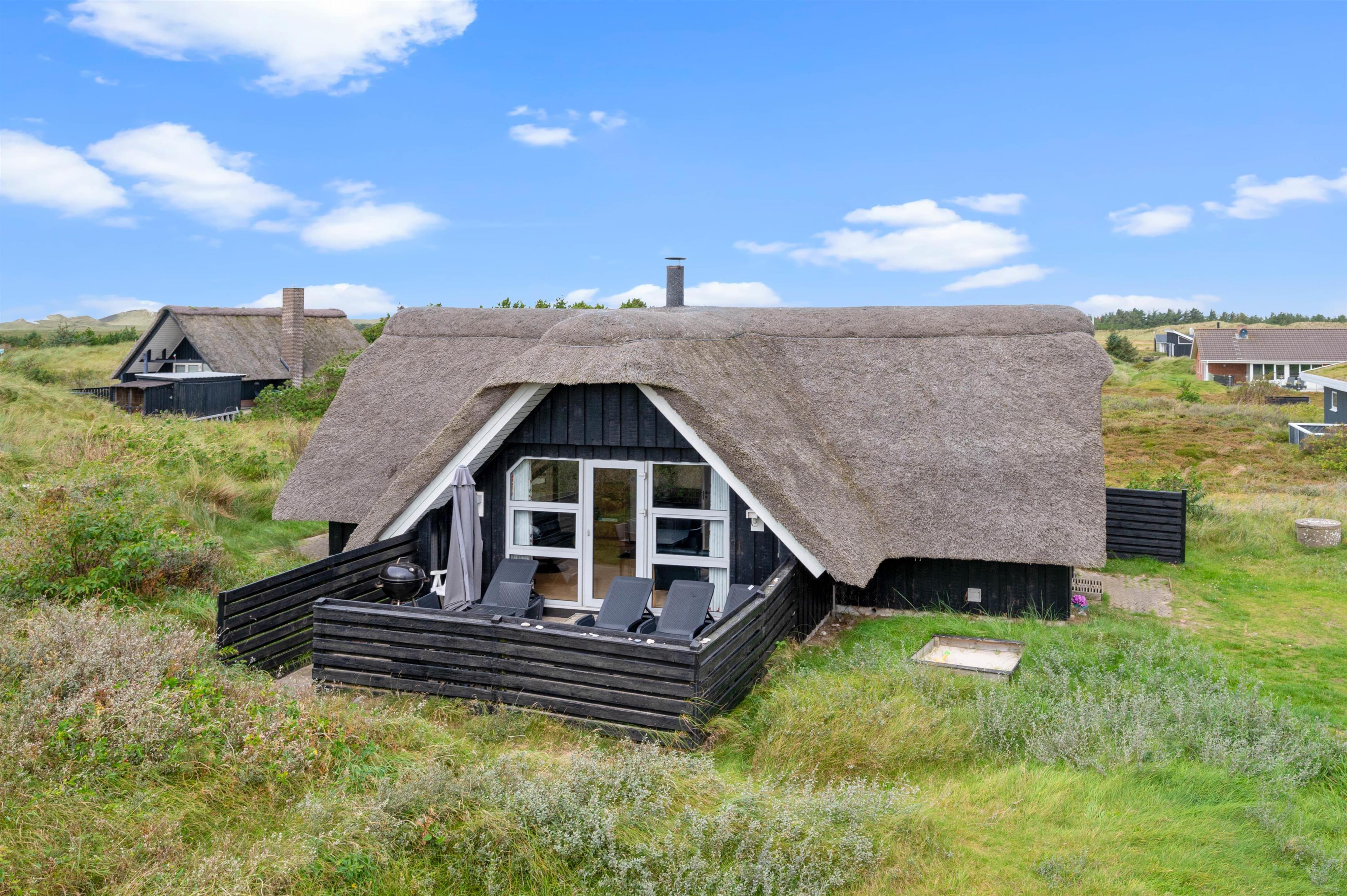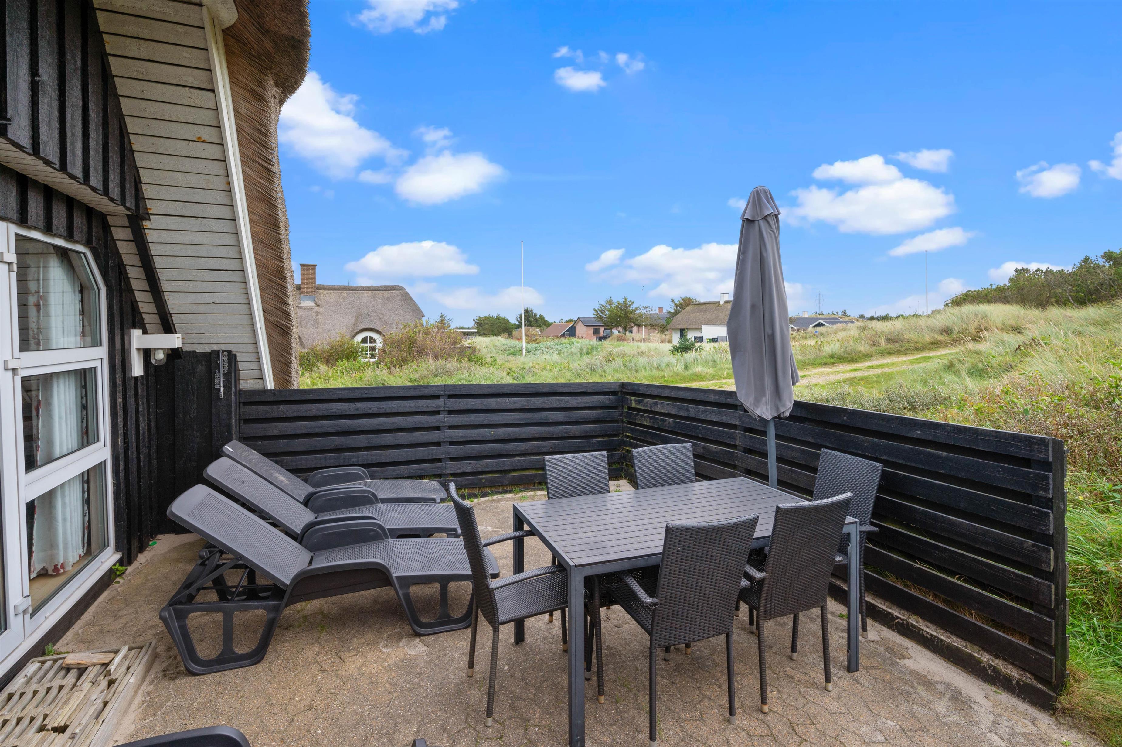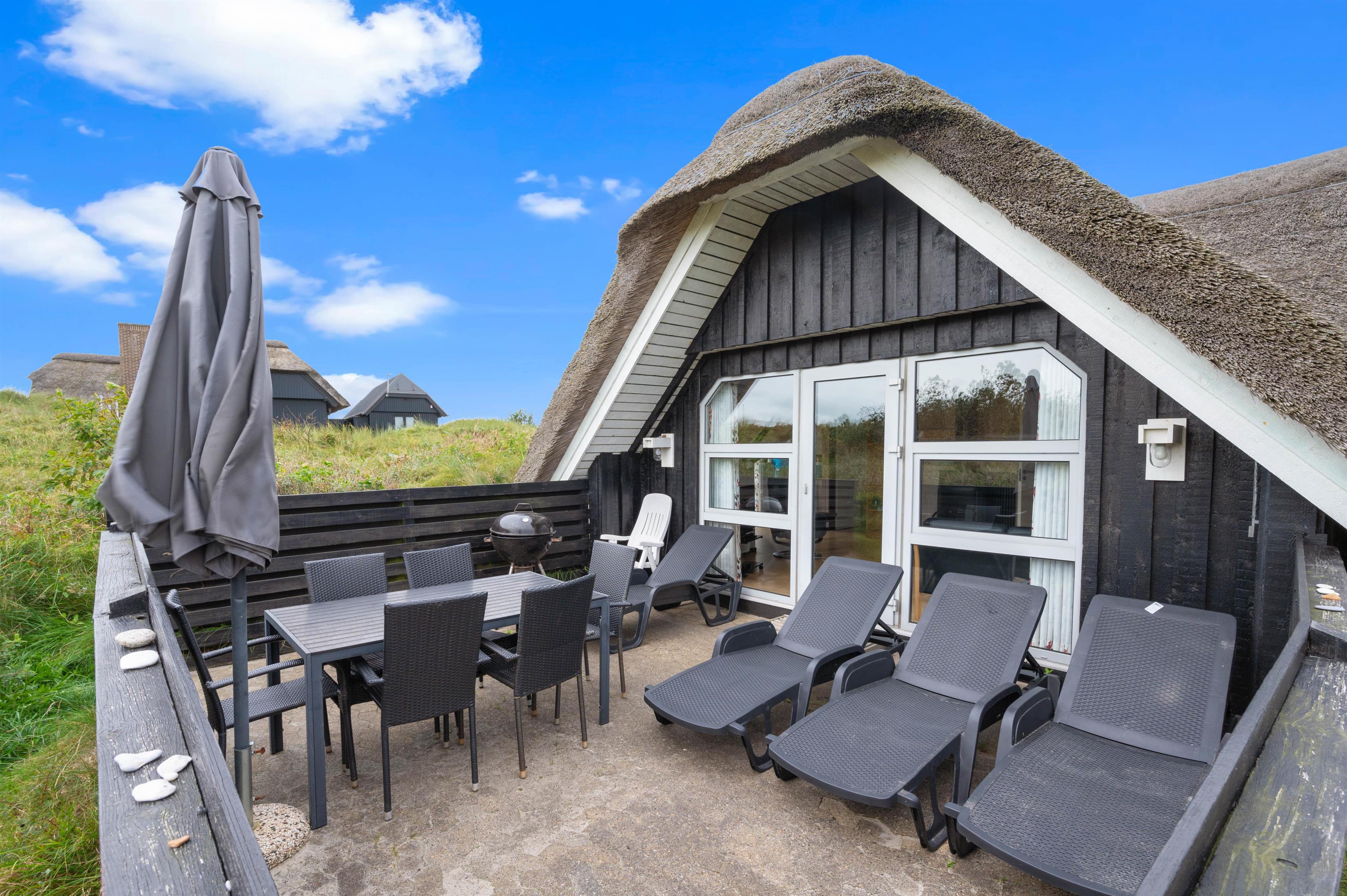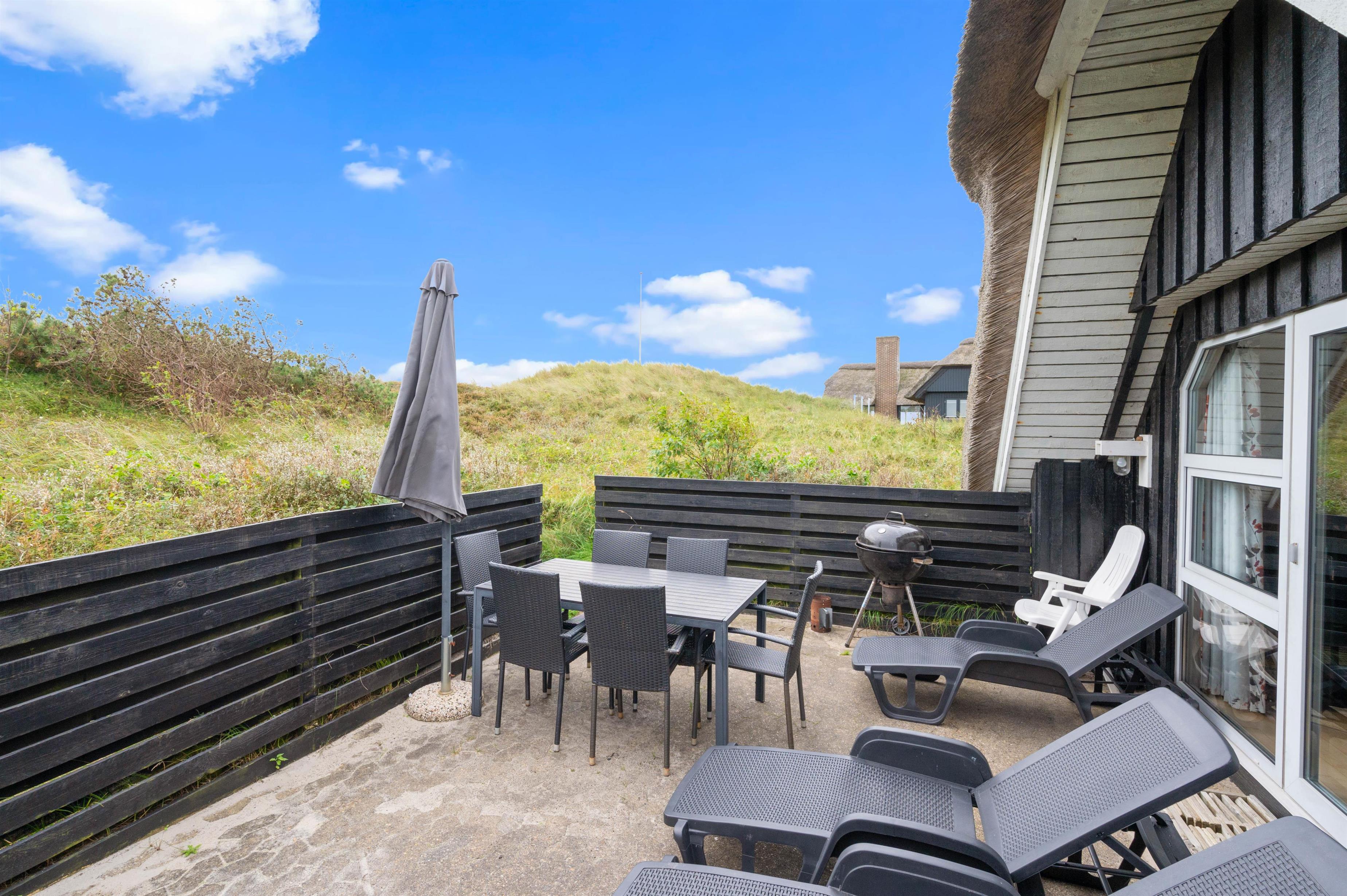 Efter mange dejlige timer i den friske luft og bagende sol, er det tid til aftensmaden - og hvorfor ikke nyde den på terrassen? En grill står klar til jer, så I kan få jer en lækker grillmiddag med gode bøffer og kolde drikkevarer. Efter aftensmaden kan I gå ned til stranden, der ligger blot 900 meter væk, hvor I kan opleve en helt fantastisk udsigt til solnedgangen fra toppen af klitterne.