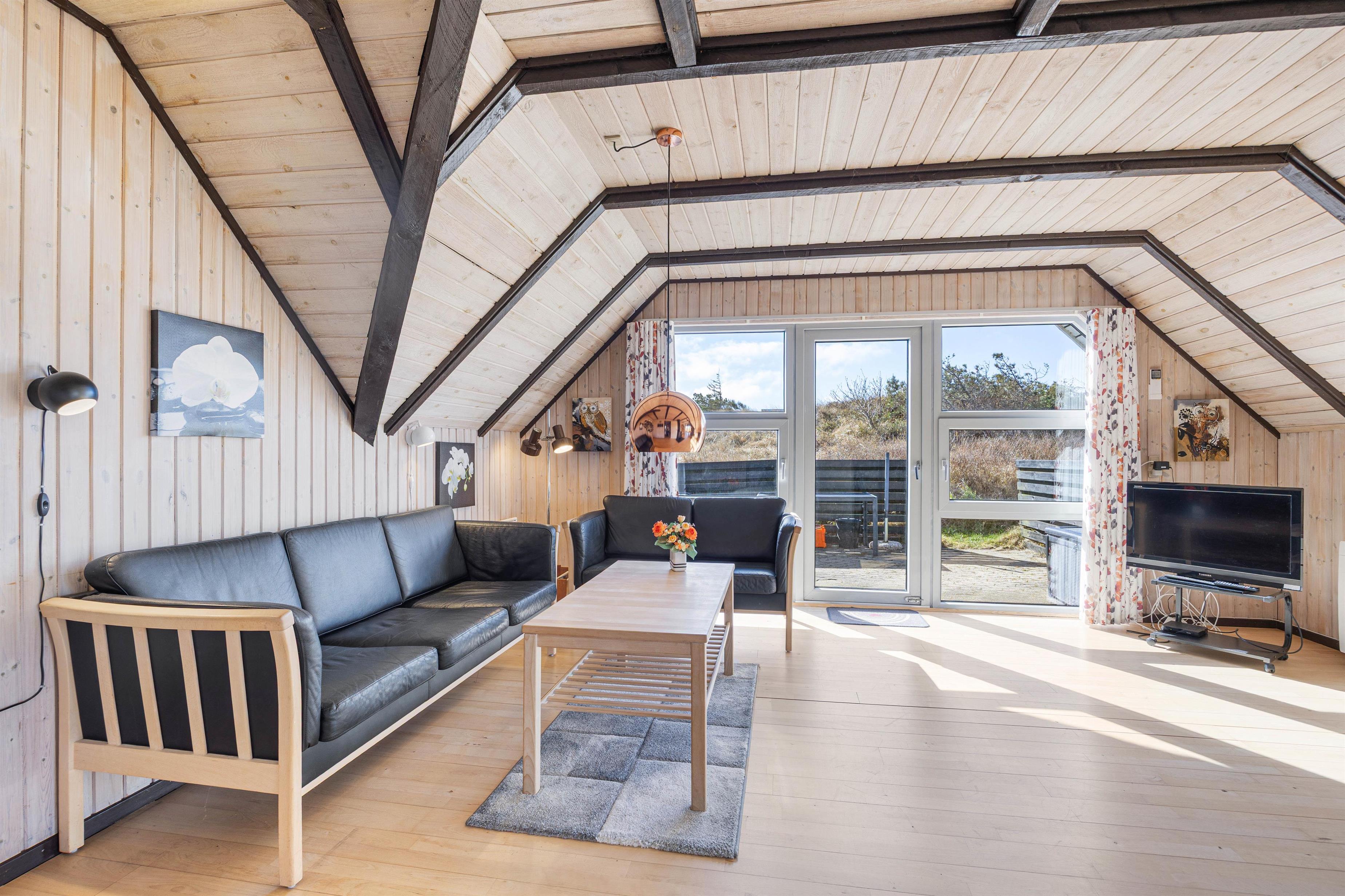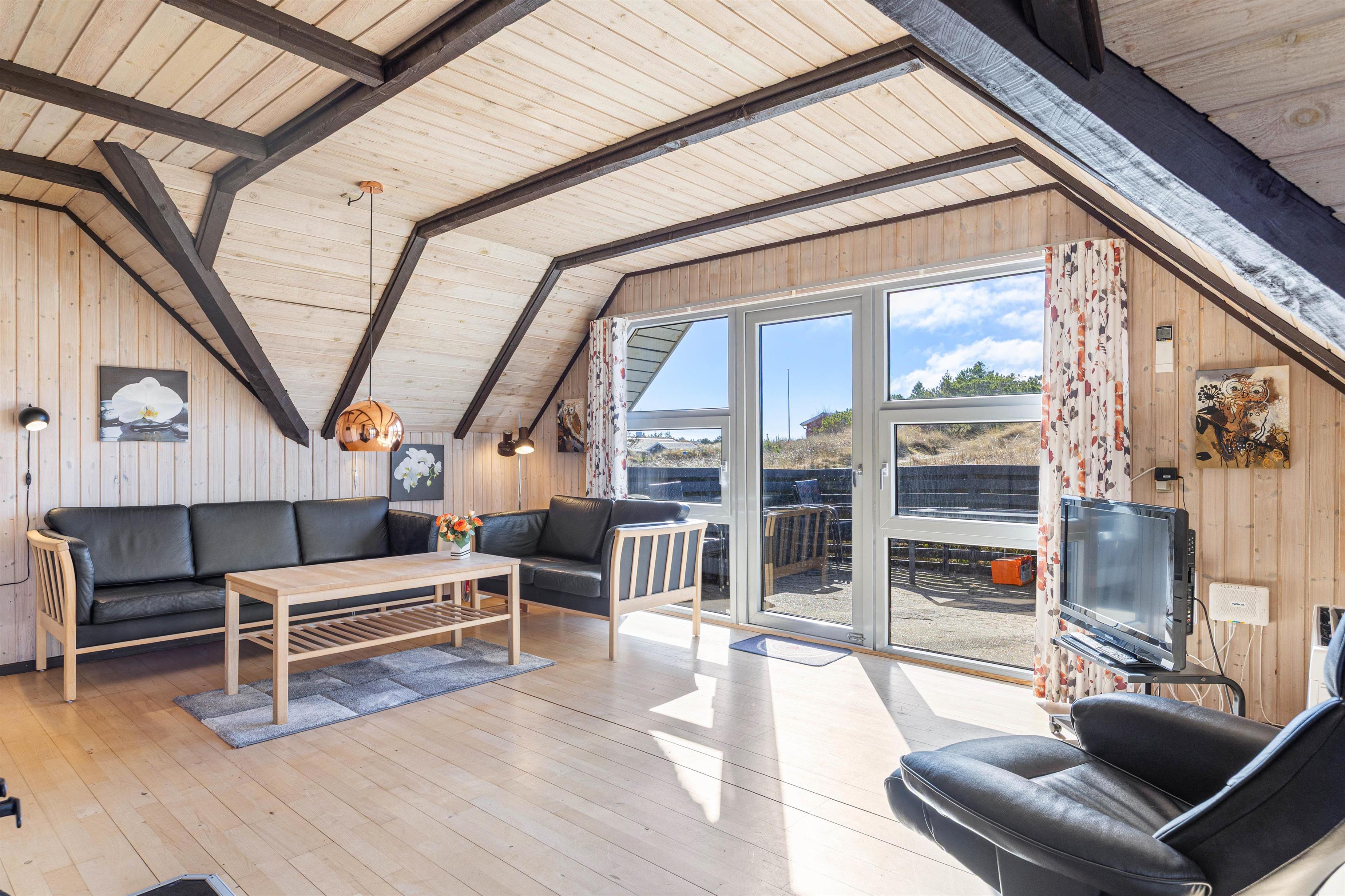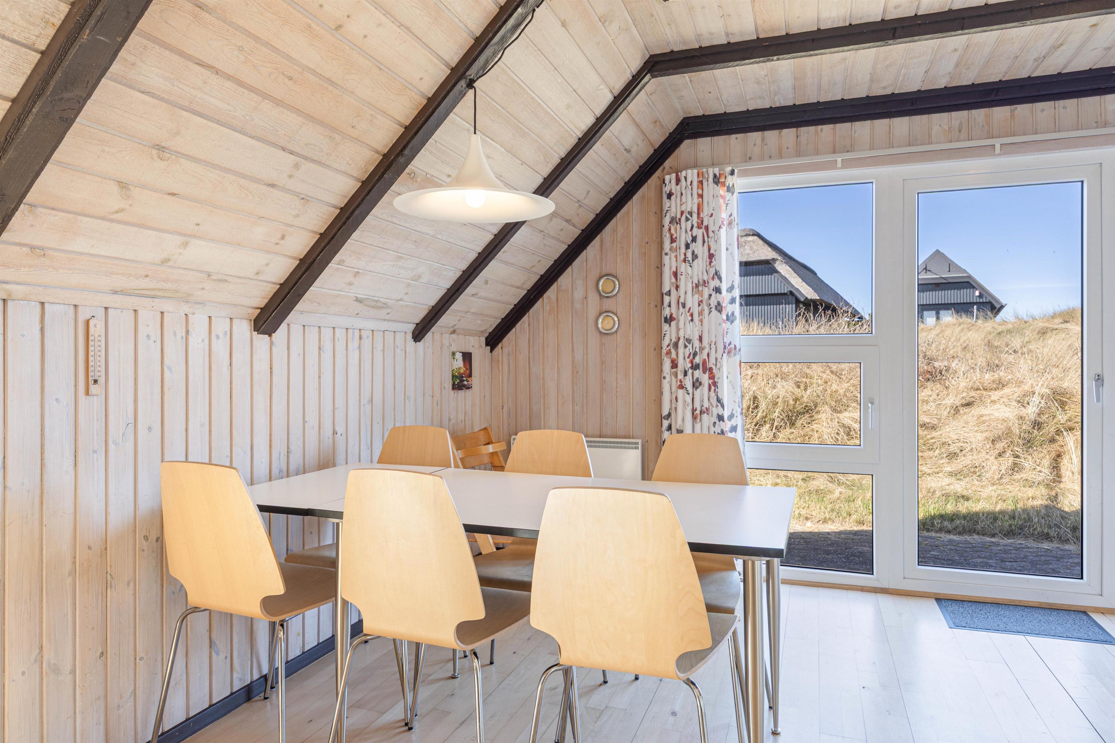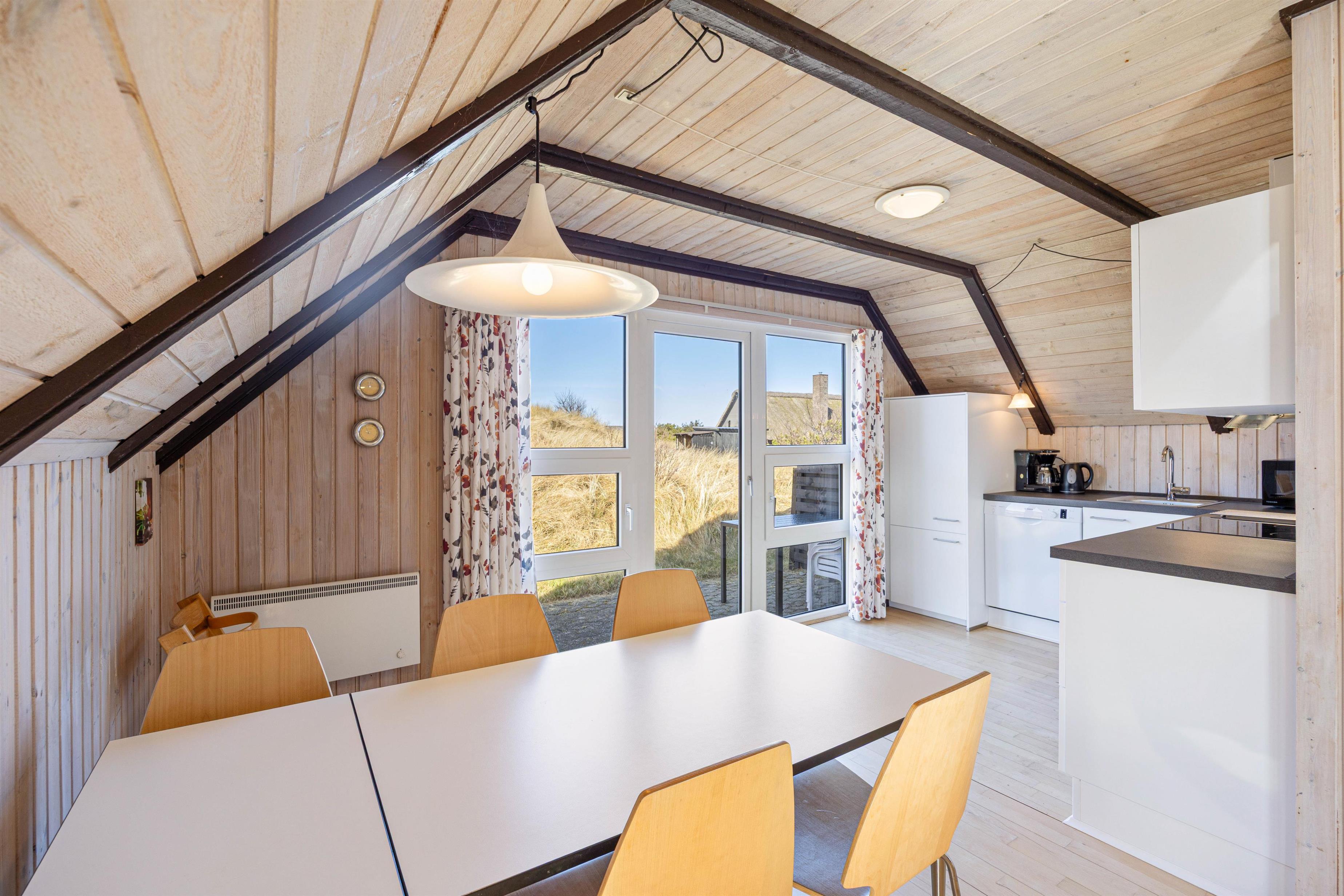 Så snart I træder ind i sommerhuset på Fyrmarken 277, vil I føle jer godt tilpas. Her bliver I mødt af lyse trævægge og lofter, synlige loftsbjælker og store vinduer, der tilsammen skaber en charmerende og hyggelig atmosfære i sommerhuset - hvem ville ikke føle sig hjemme her?