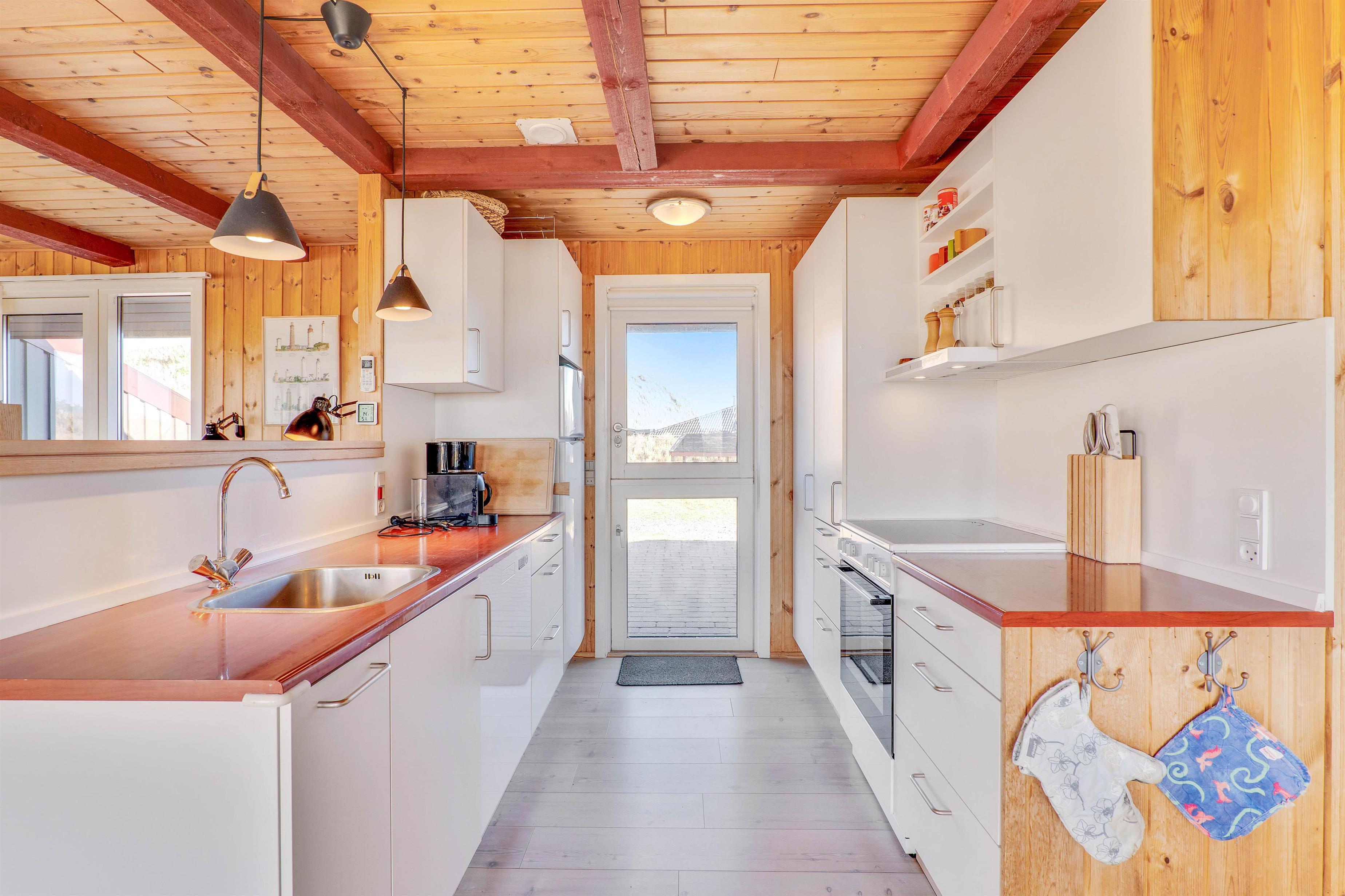 Sommerhuset på Gammeleng 21 i Nr. Lyngvig byder jer med sine få kvadratmeter velkommen og råder over plads til 6 personer. Feriehuset er derfor helt ideelt for den lille familie eller et vennepar, der ønsker at holde ferie sammen. I kan virkelig nyde nogle gode timer sammen i feriehuset. Imens nogle står for at tilberede aftensmaden, kan andre smide sig i sofaen foran brændeovnen sammen med varmen fra brændeovnen. Der er derudover fra både køkken og stue en skøn udsigt til klitterne og Nr. Lyngvig Fyr.