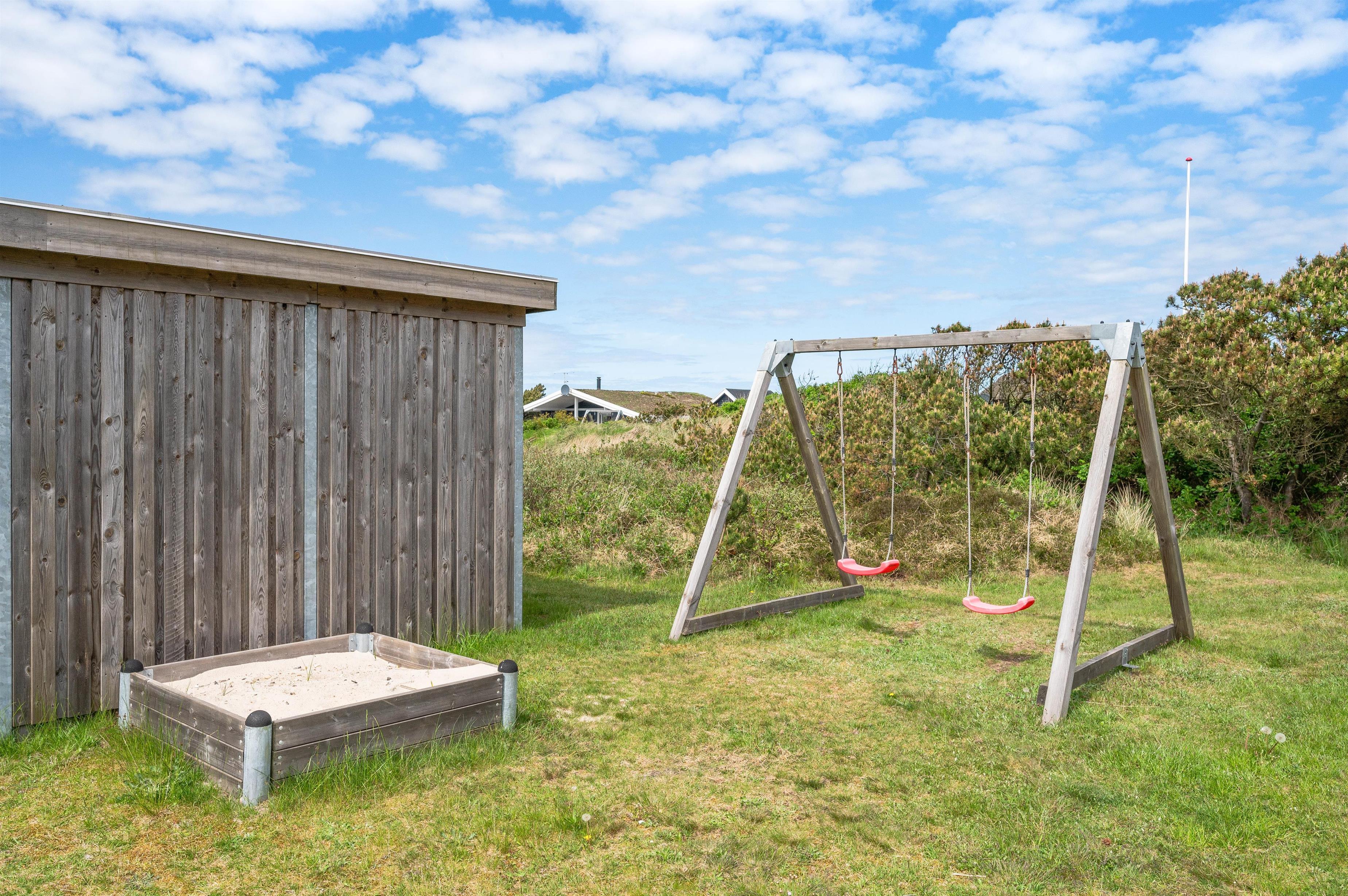På sommerhusets sydside finder I en stor, lækker træterrasse, hvor I kan tilbringe mange gode timer på feriens solrige dage. Find liggestolene og havemøblerne frem og sæt jer godt til rette i den bagende sol. Imens kan børnene lege i haven og få sus i maverne på gyngerne.