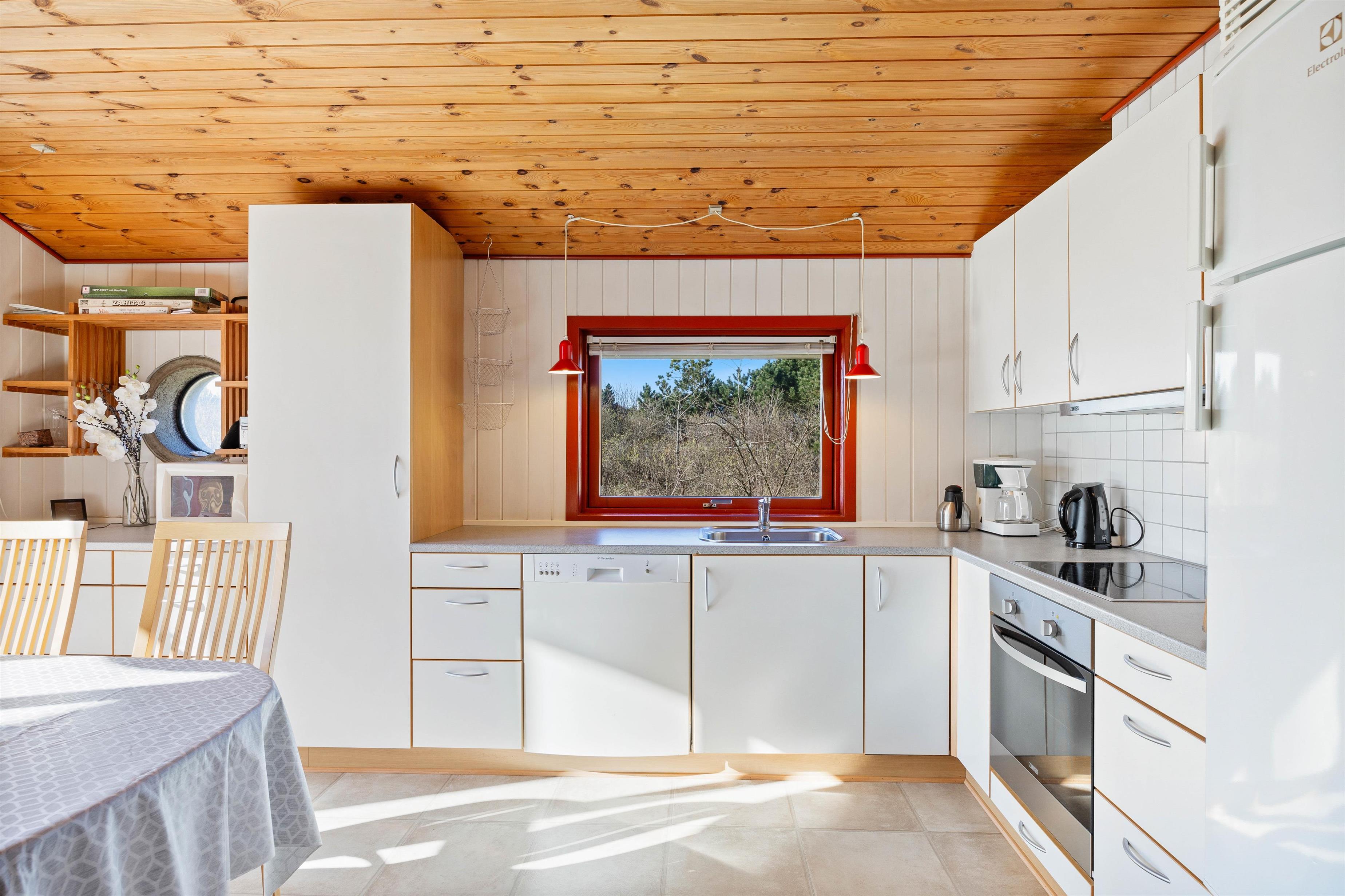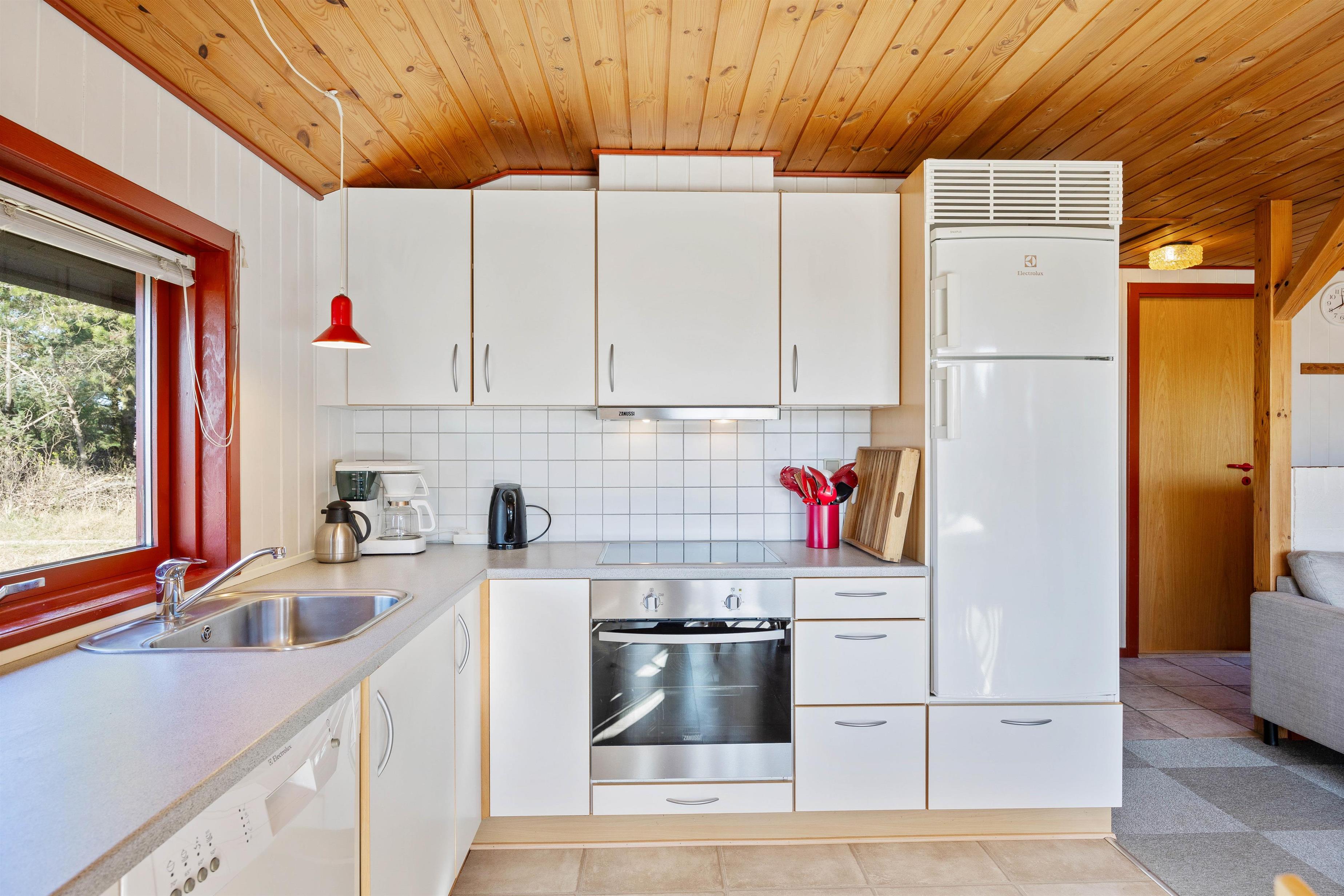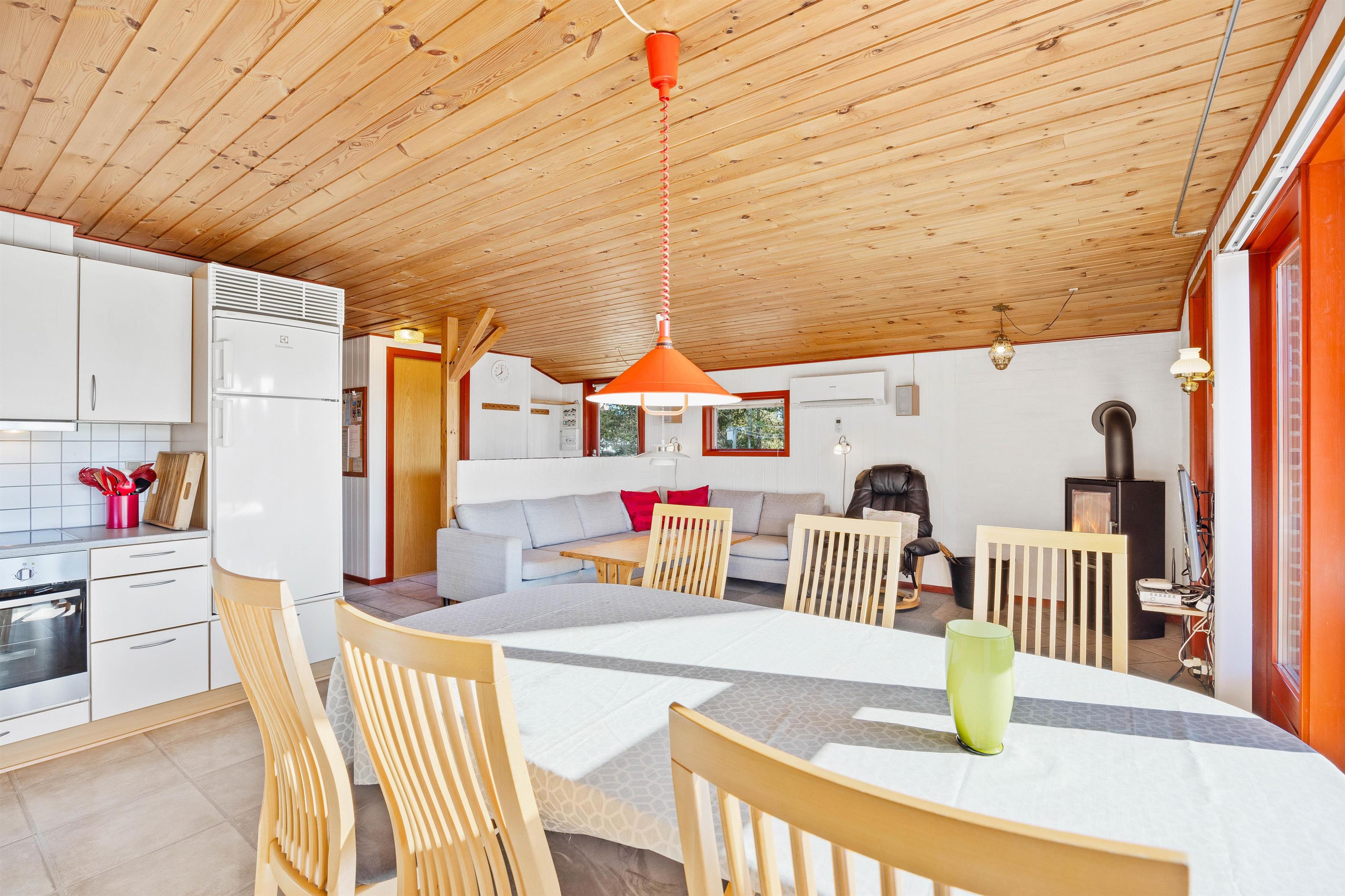 I det hyggelige køkken/alrum er der lagt op til, at I kan samles og nyde ferien. I sofaen kan I sidde sammen og spille spil eller se TV, imens I kan mærke varmen fra brændeovnen. Udover brændeovnen er der også en varmepumpe, som I kan bruge til at holde den dejlige temperatur i sommerhuset.