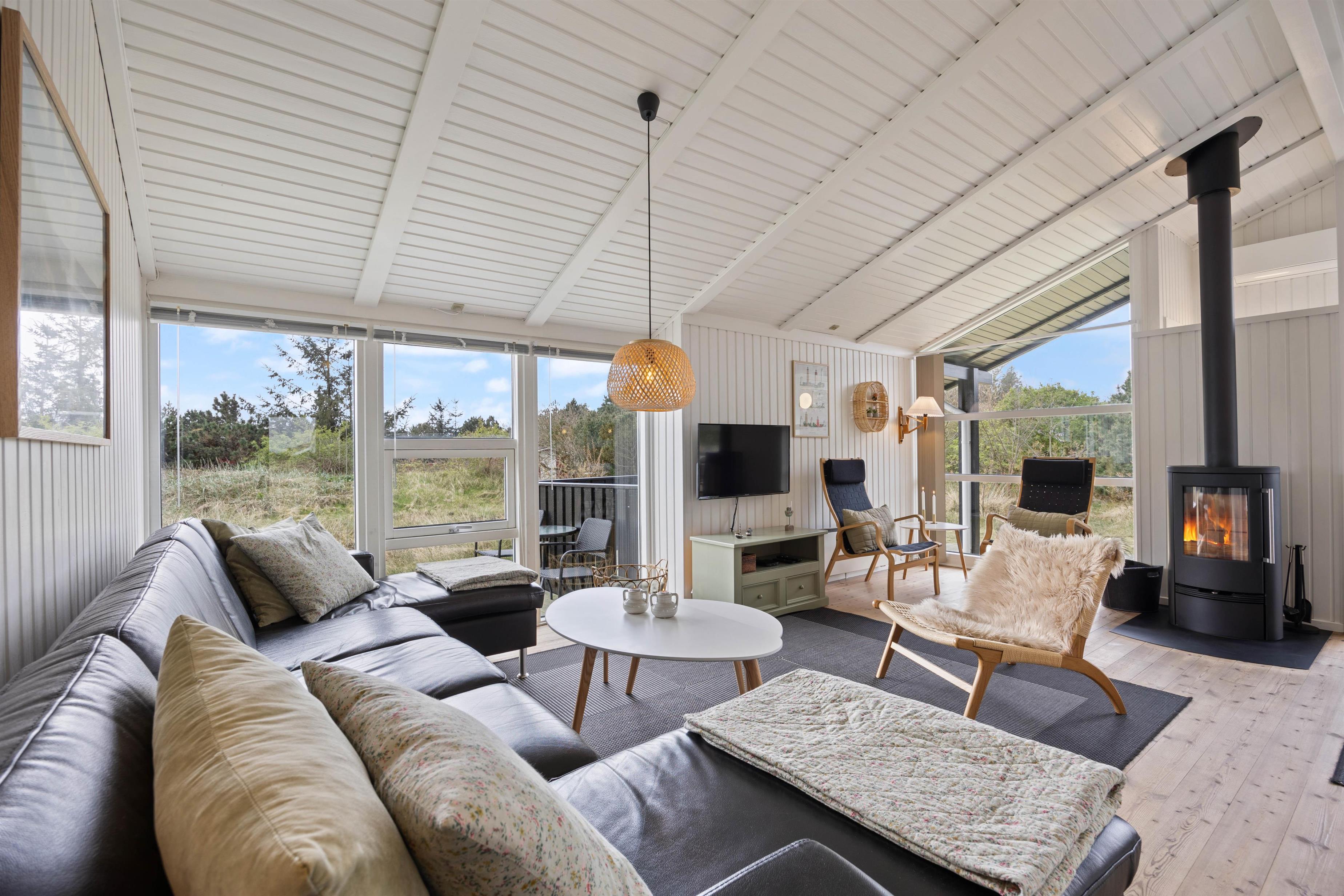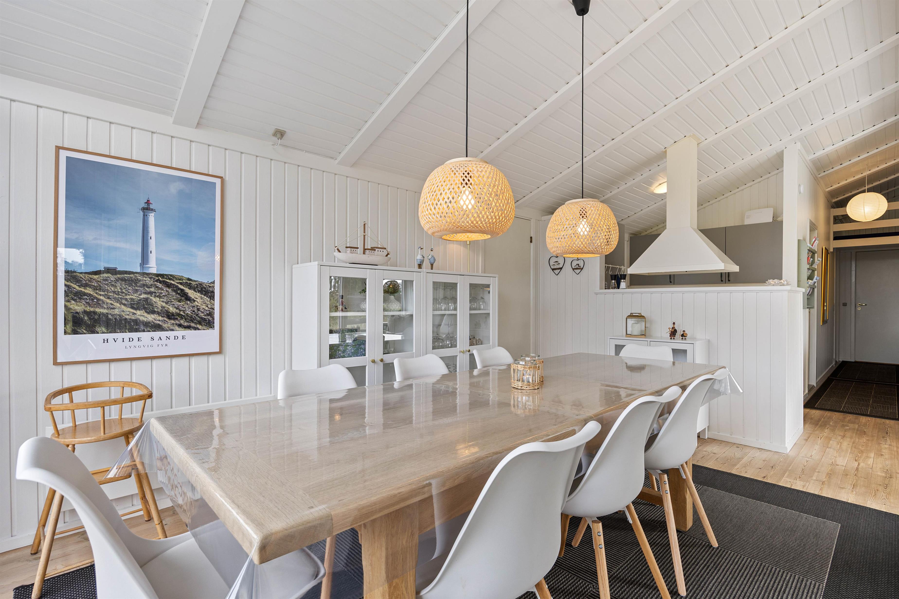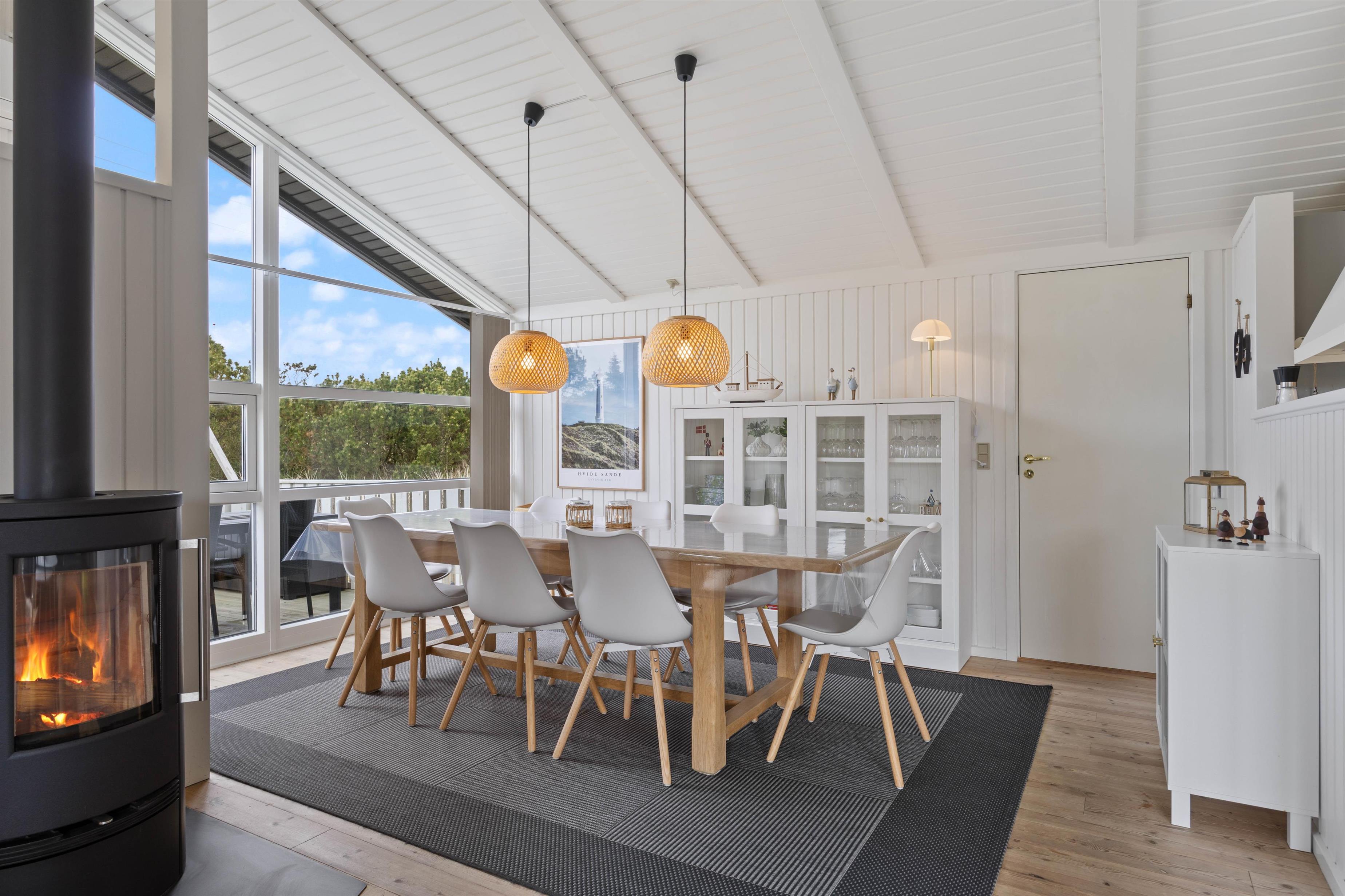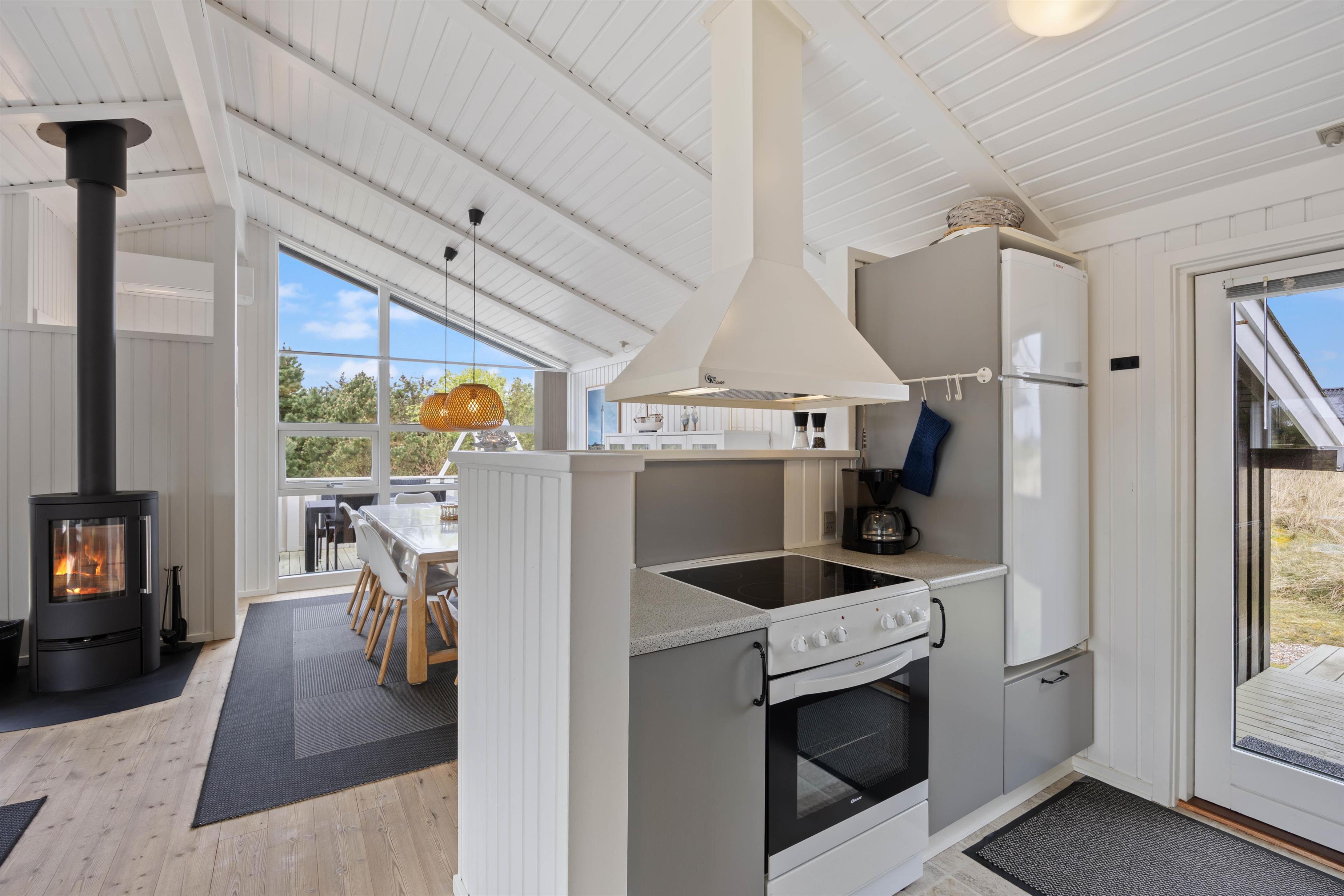 Husets hjerte er opholdsrummet, der samler stue, spiseafdeling og køkken i ét stort fællesrum, og som med sikkerhed kommer til at blive omdrejningspunktet for et hav af skønne ferieminder; gode grin rundt om middagsbordet, hyggelige filmaftener på sofaen og regnfulde dage med kortspil og brændeovnens knitren i baggrunden.