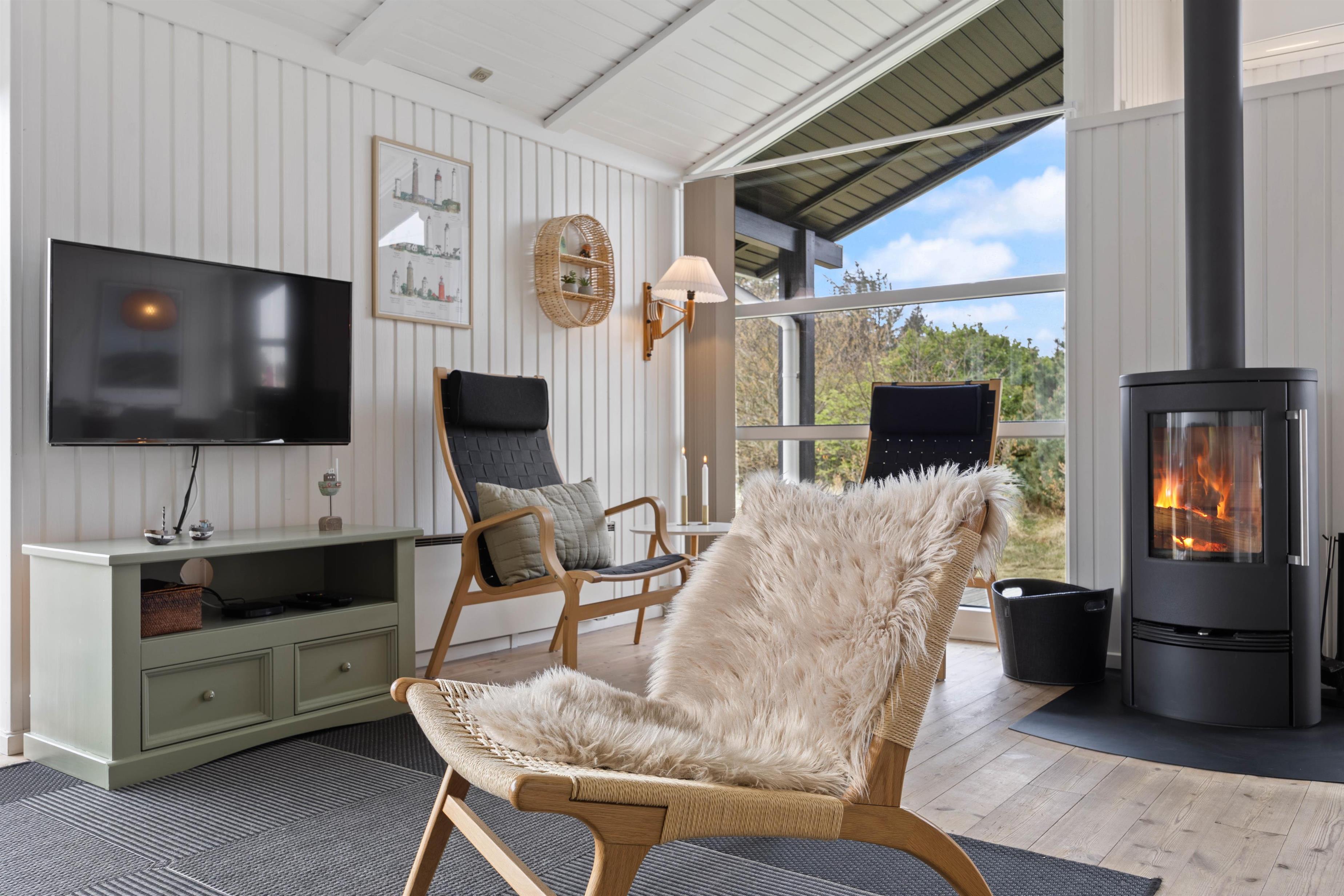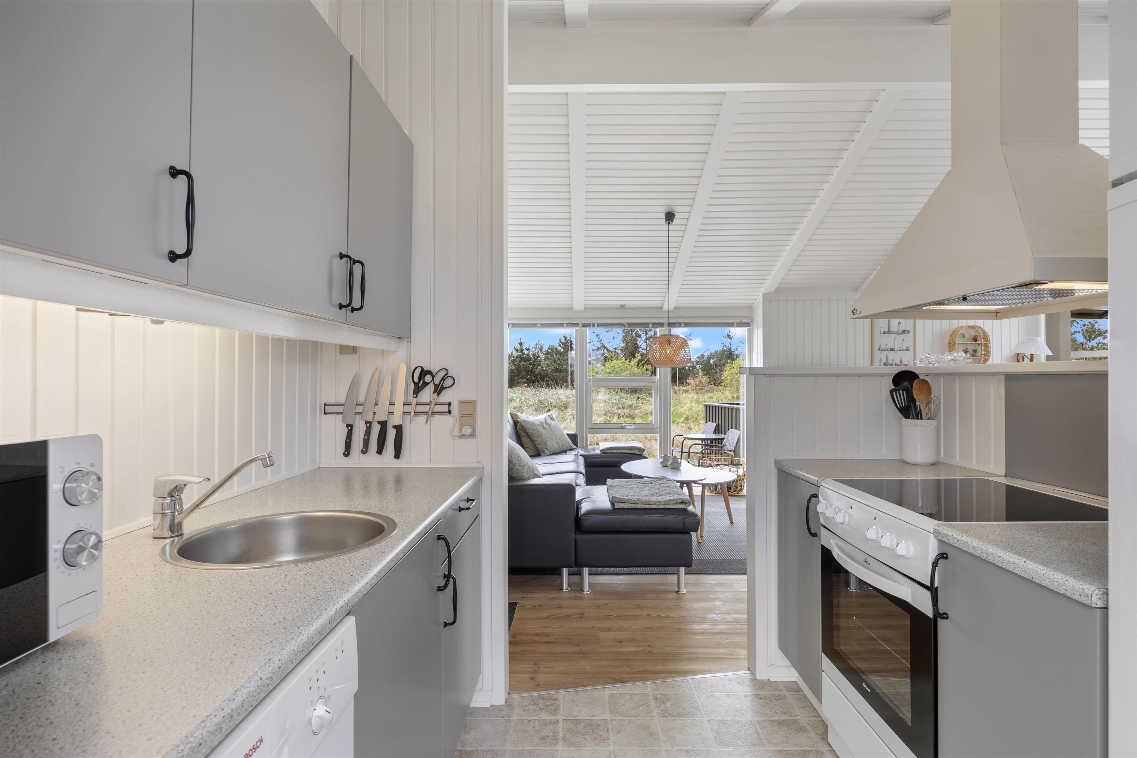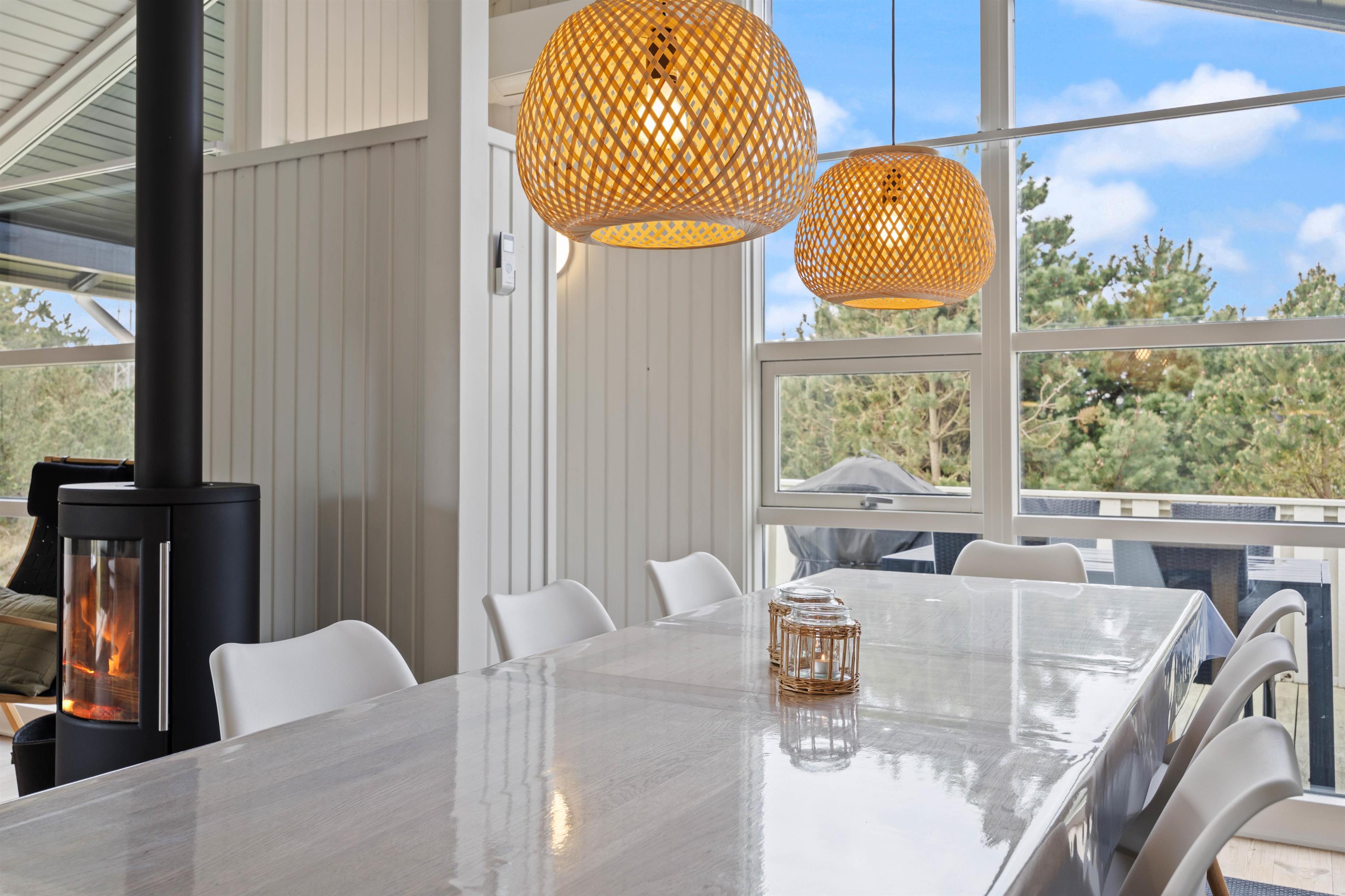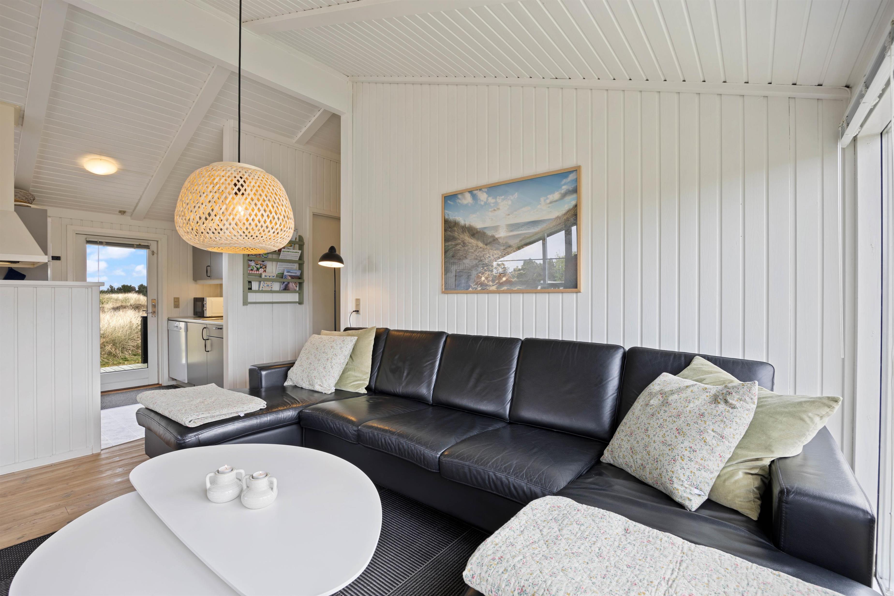 Husets hjerte er opholdsrummet, der samler stue, spiseafdeling og køkken i ét stort fællesrum, og som med sikkerhed kommer til at blive omdrejningspunktet for et hav af skønne ferieminder; gode grin rundt om middagsbordet, hyggelige filmaftener på sofaen og regnfulde dage med kortspil og brændeovnens knitren i baggrunden.