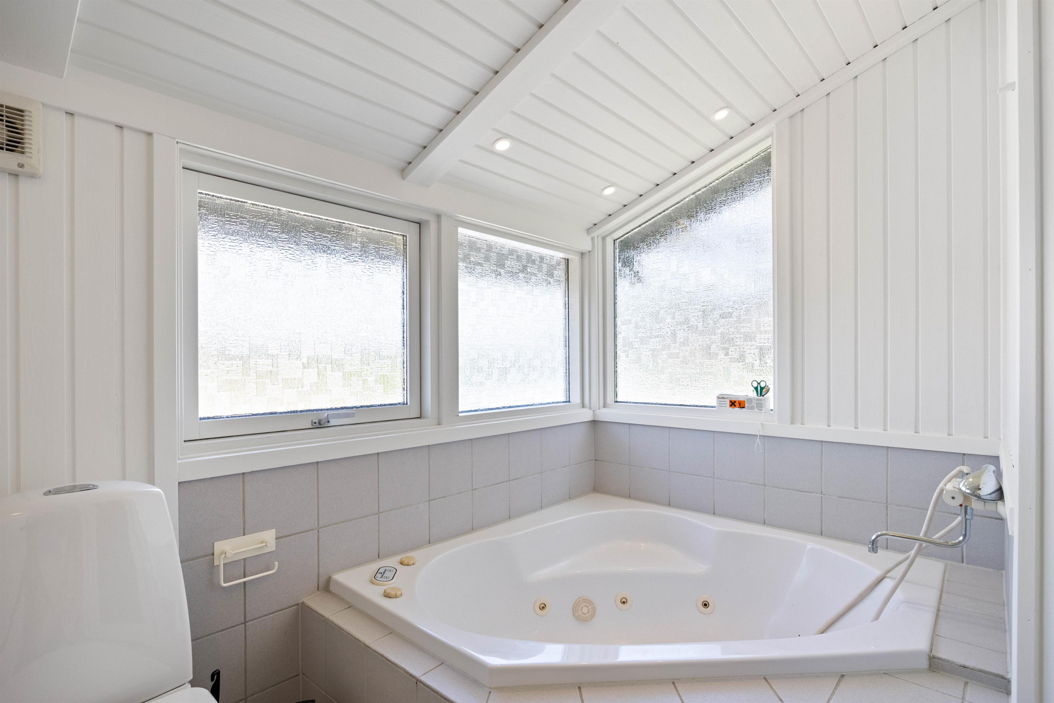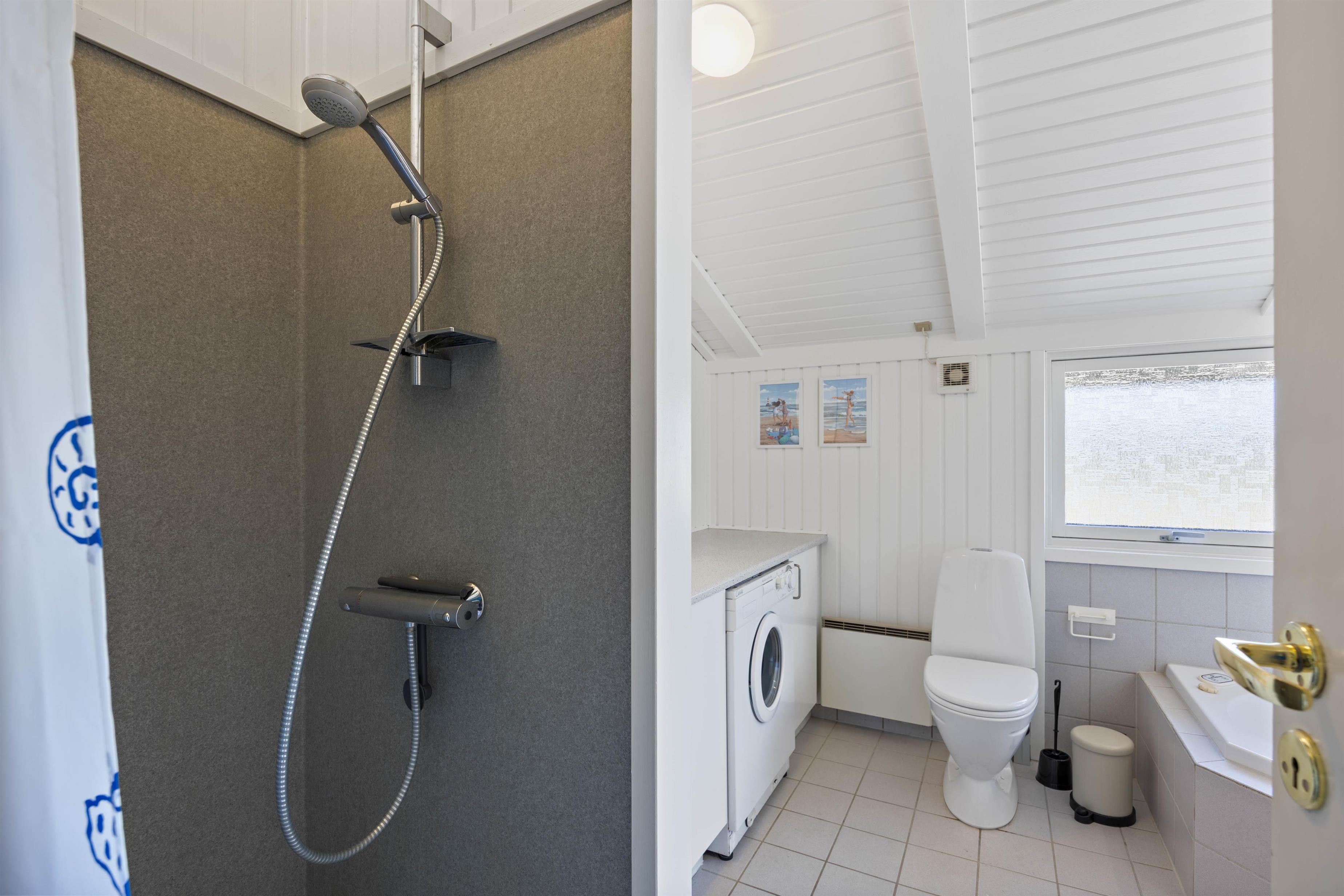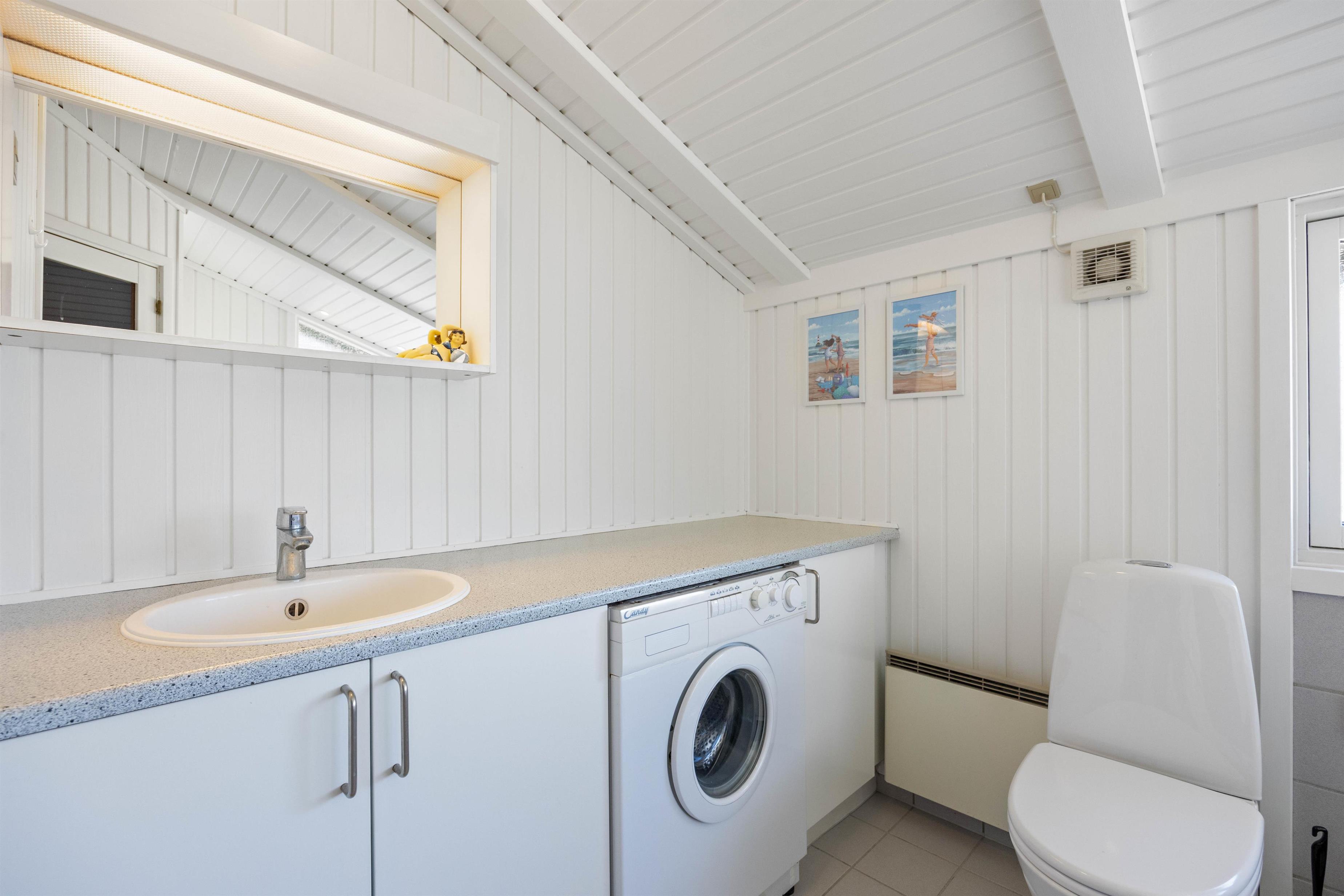 Sommerhuset er praktisk udstyret med 2 badeværelser (med gulvvarme), og det største badeværelse er desuden indrettet med både sauna og spabad. Der er altså alle muligheder for at få ladet batterierne op og vende hjem med fornyet energi efter ferien.