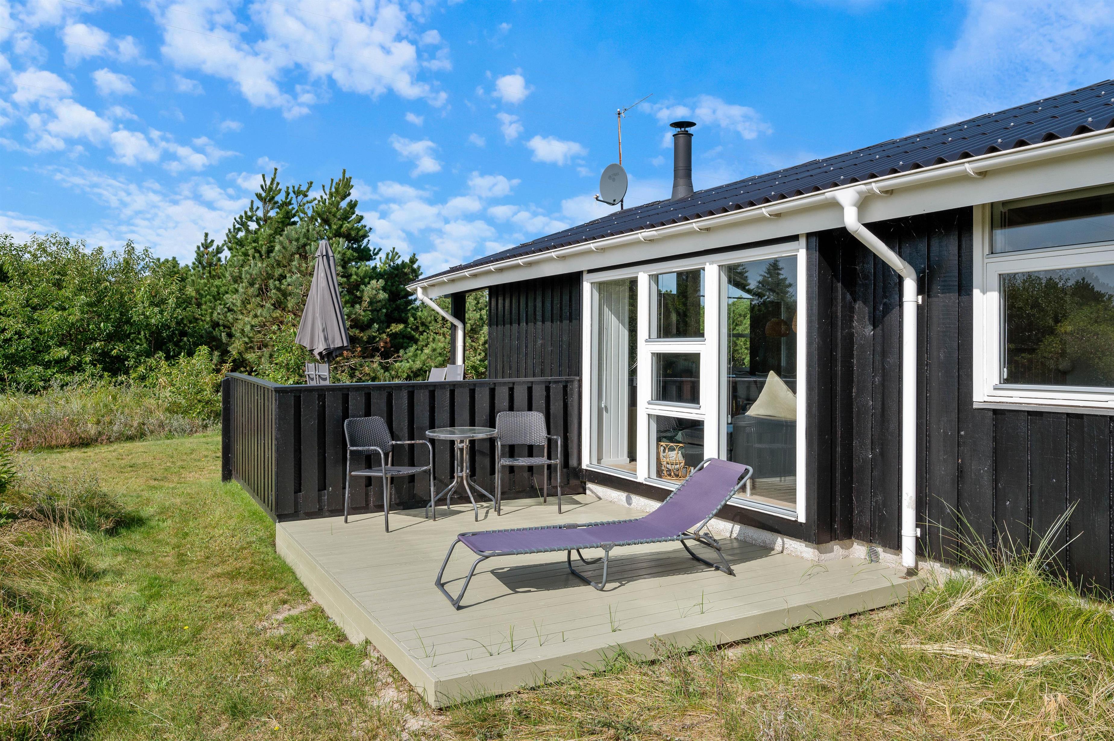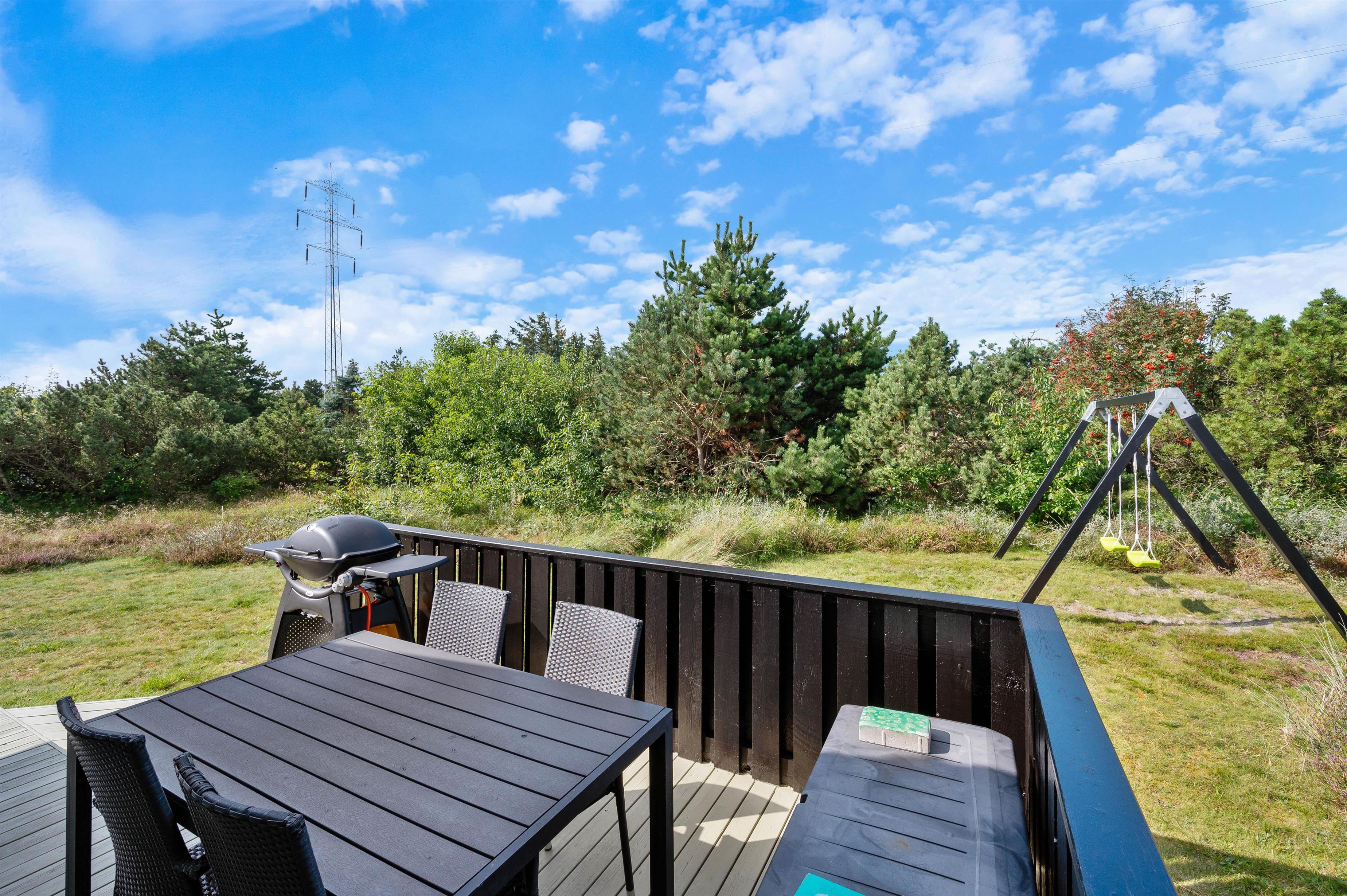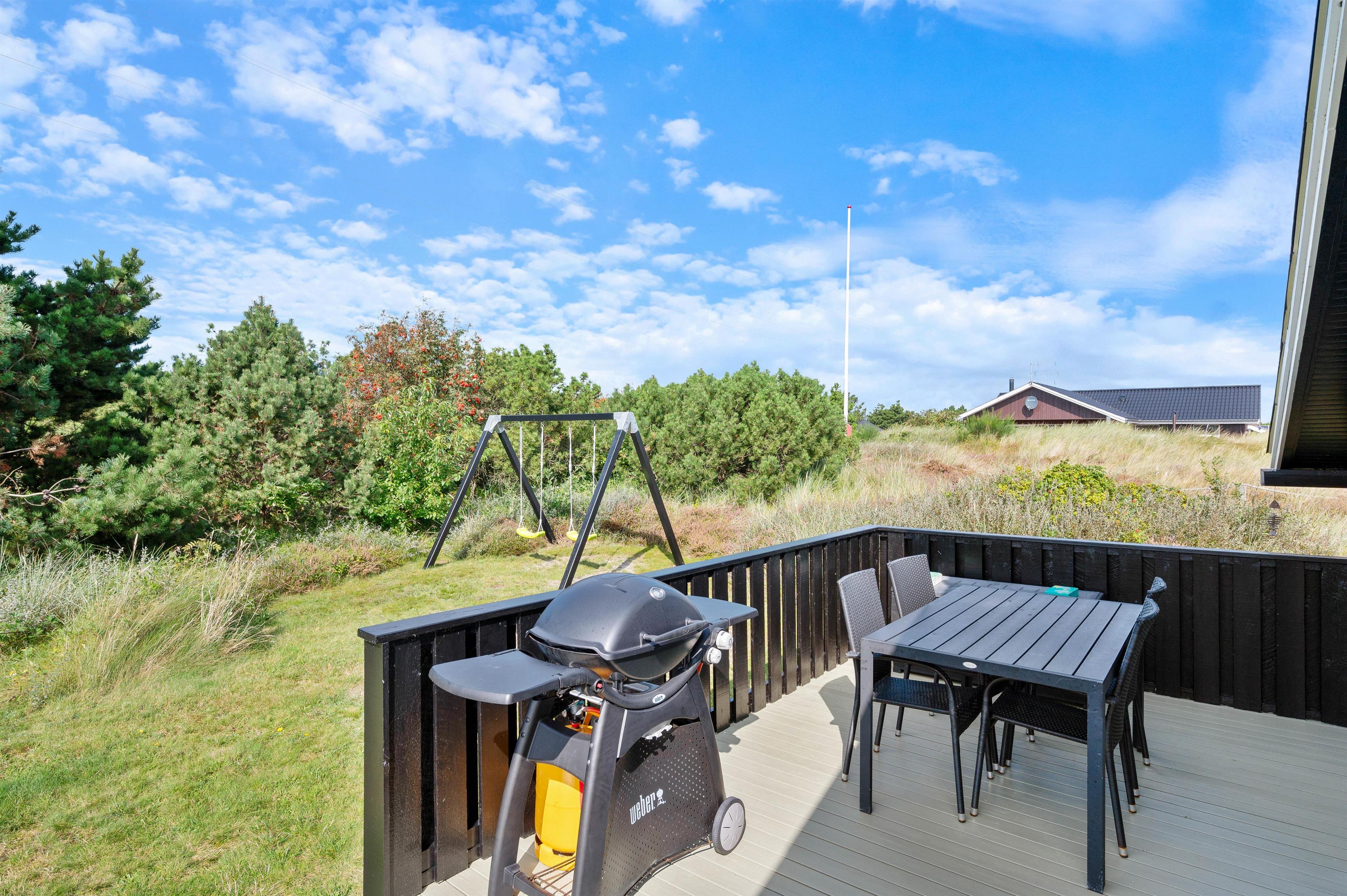Der er flere fine terrasser og hyggelige siddekroge rundt om sommerhuset. Havemøbler, liggestole og grill står klar til at assistere jer på de varme sommerdage, så I kan nyde solen dagen lang og runde af med en grillmiddag rundt om havebordet under aftenhimmelen. Der er sandkasse og gyngestativ til de yngste feriegæster, så de er godt beskæftiget, mens I daser på terrassen.