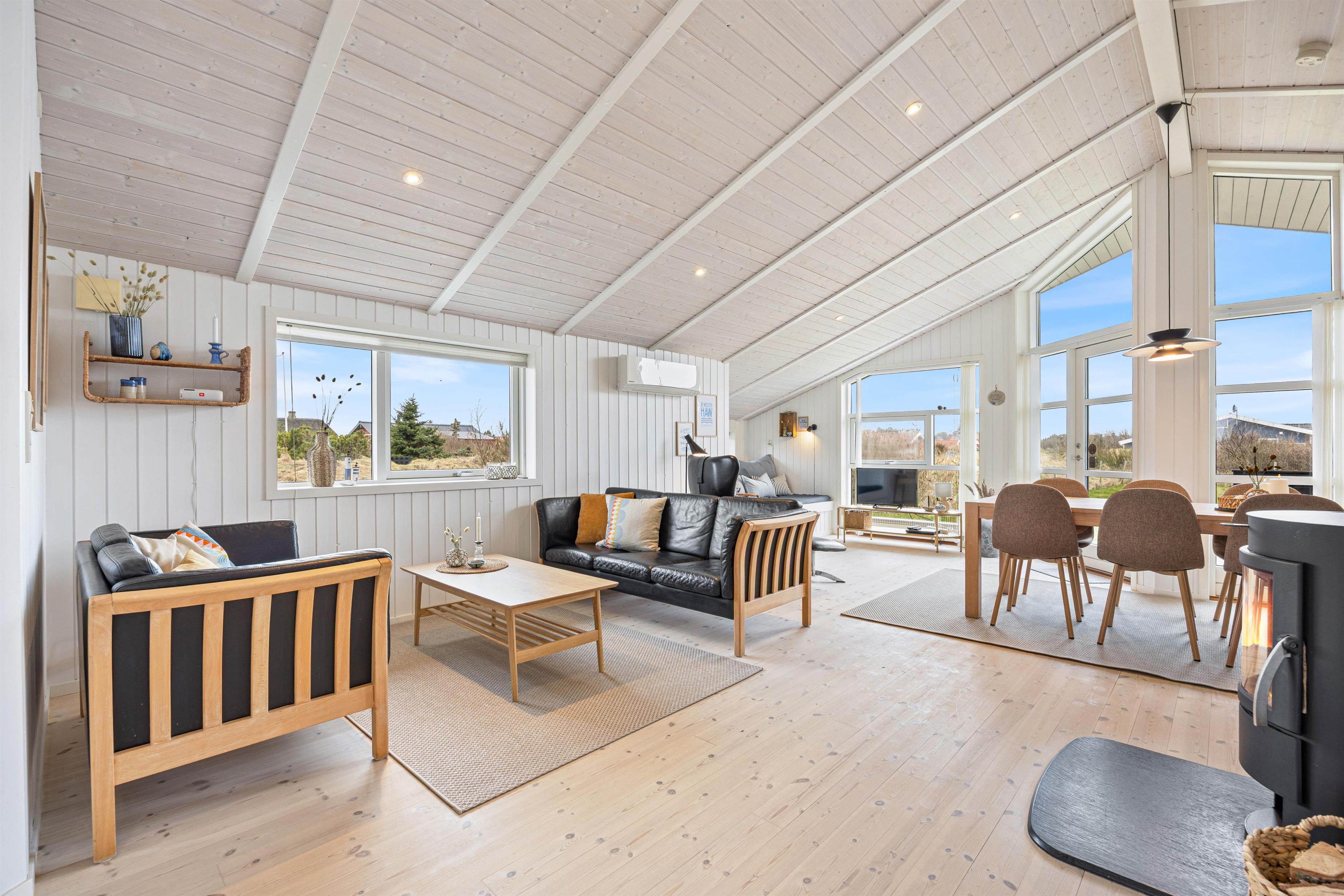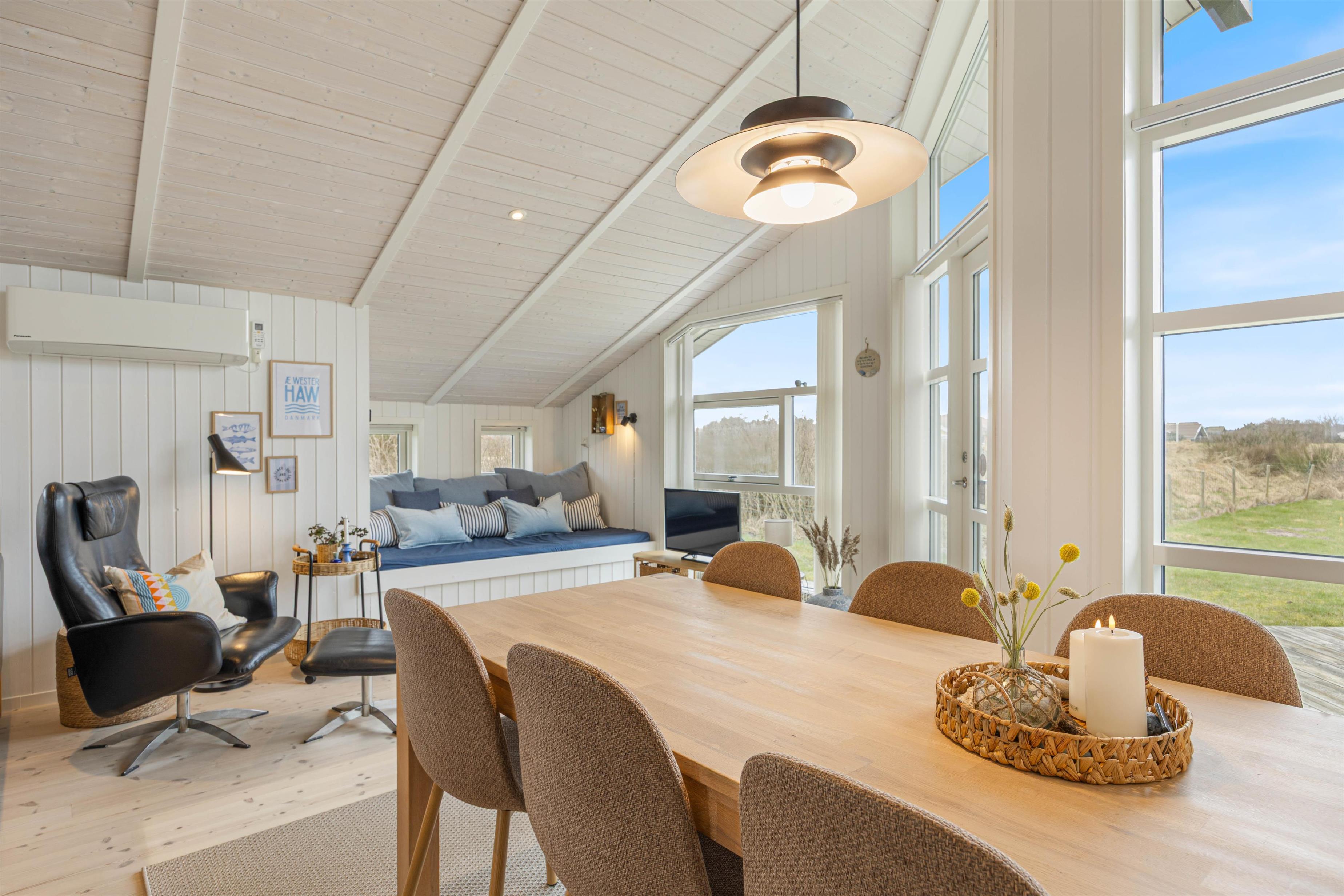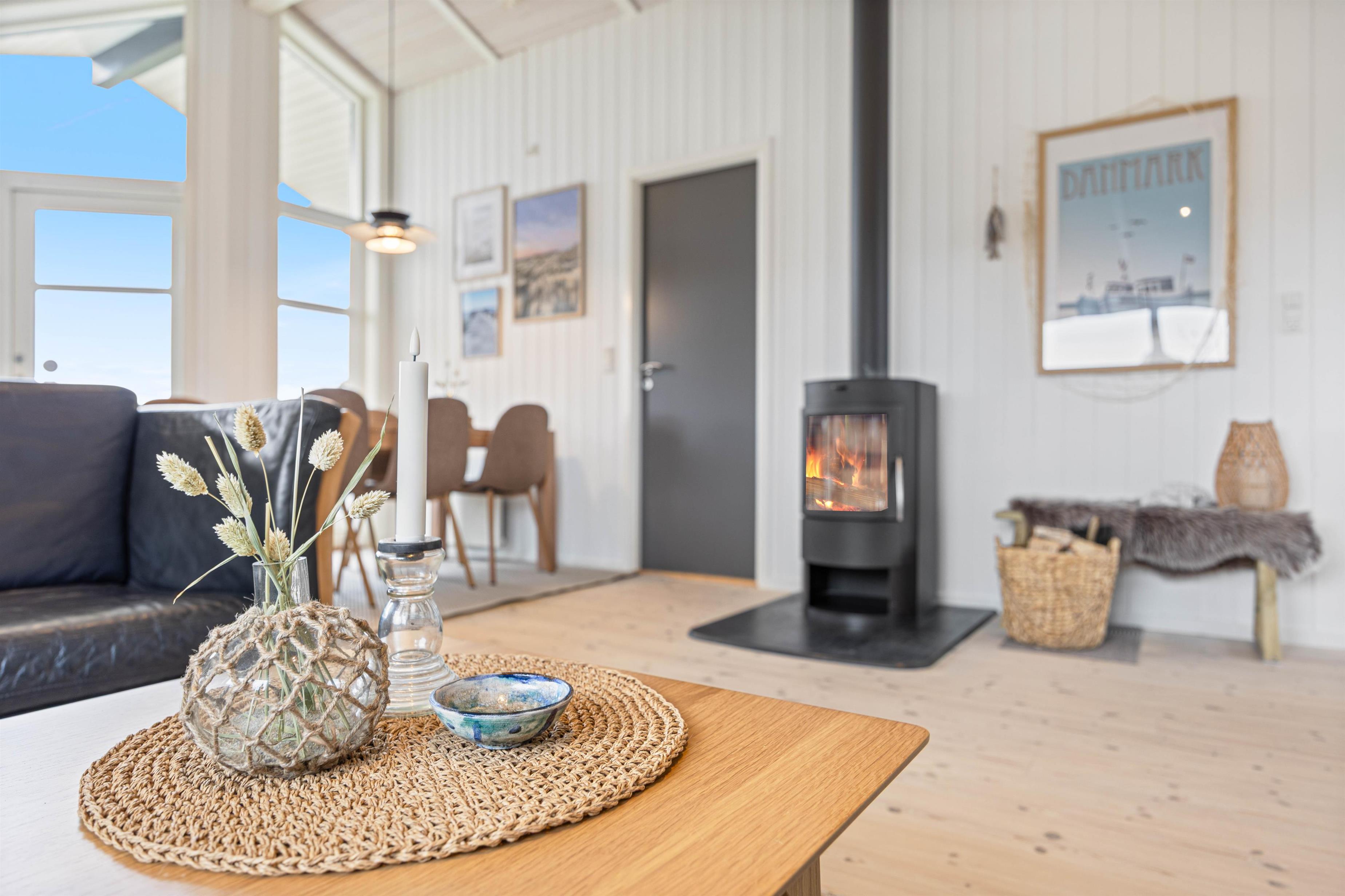 I det skønne sommerhus til 6 personer i Nr. Lyngvig er der lagt op til feriehygge med familien. Det er lyst og hyggeligt indrettet med brændeovnen i centrum. En forfriskende gåtur ved Ringkøbing Fjord eller Vesterhavet er kun et stenkast væk, og I er naturligvis velkommen til at tage hunden med.