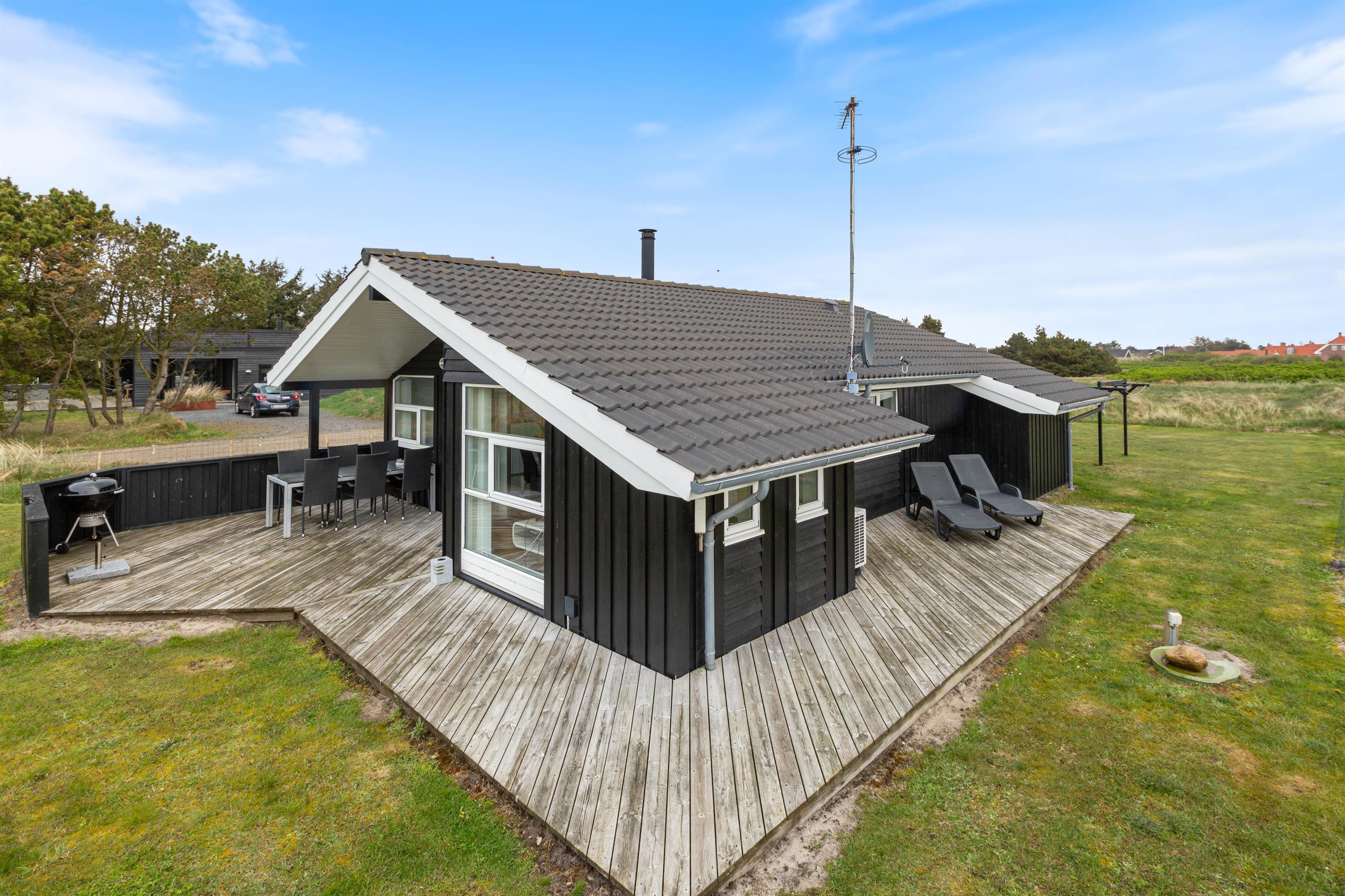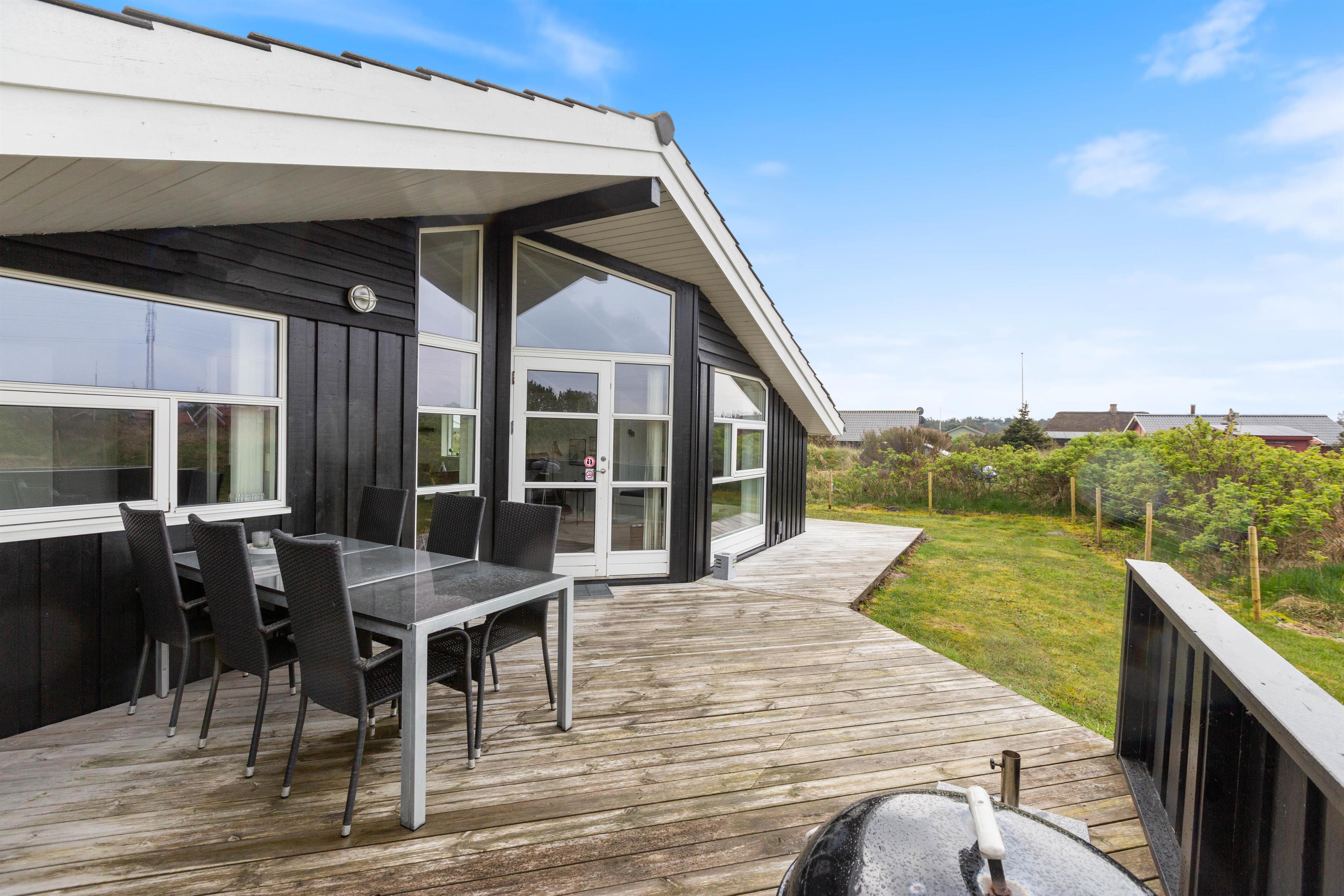 På den 1.758 kvadratmeter store grund har de yngste gæster rig mulighed for at brænde krudt af på sommerhusets græsplæne. Når børnene er trætte, og solen går ned, kan hele familien nyde god mad fra feriehusets grill, og de voksne måske et godt glas vin i anledning af ferie.