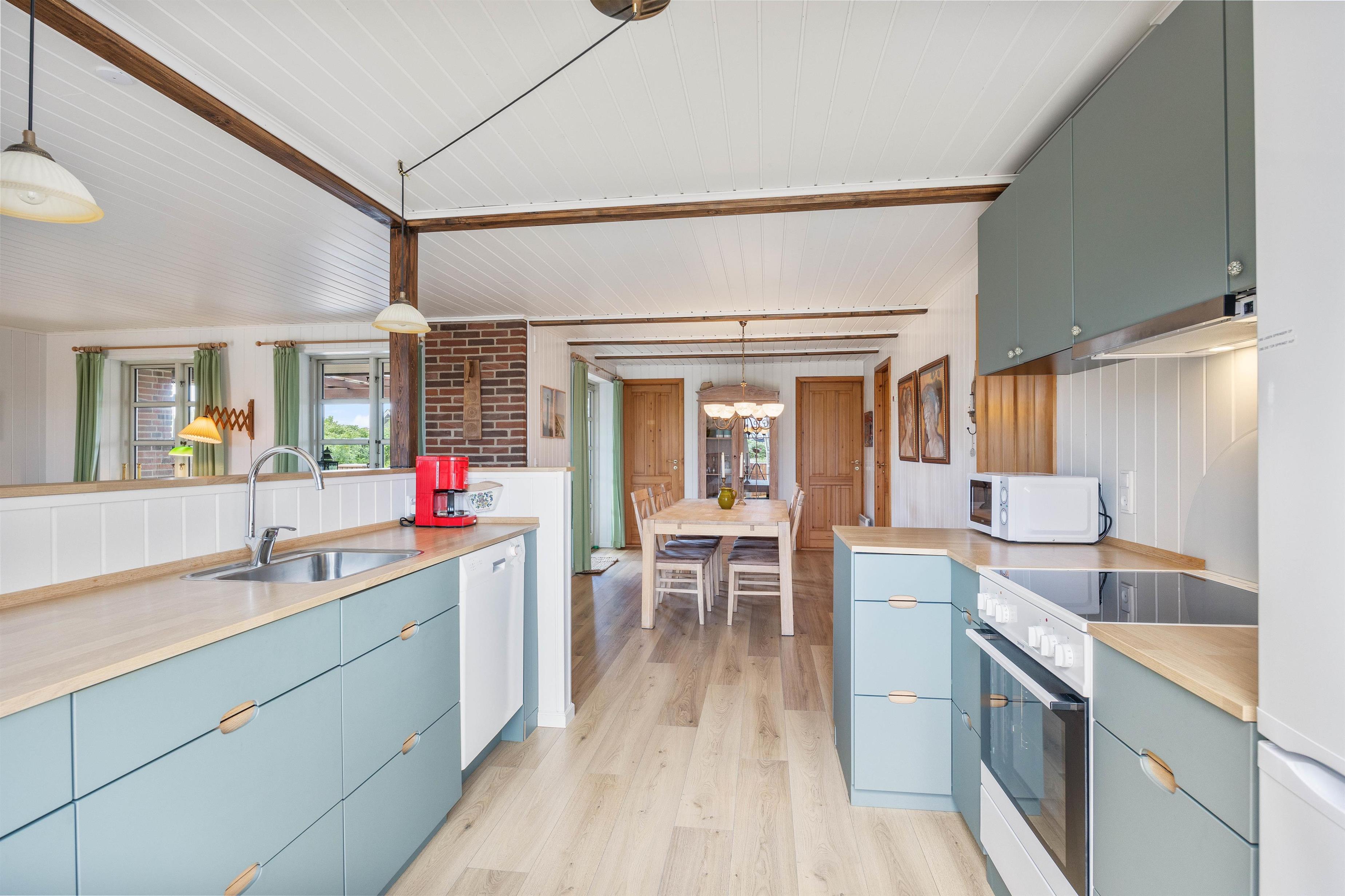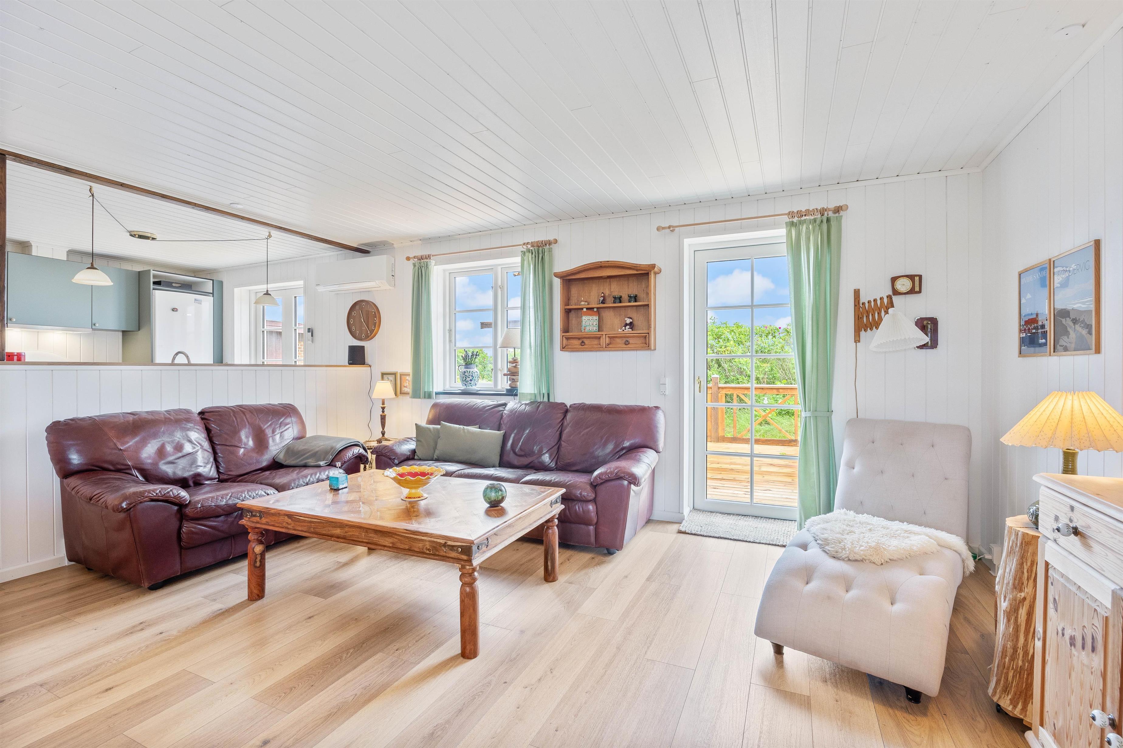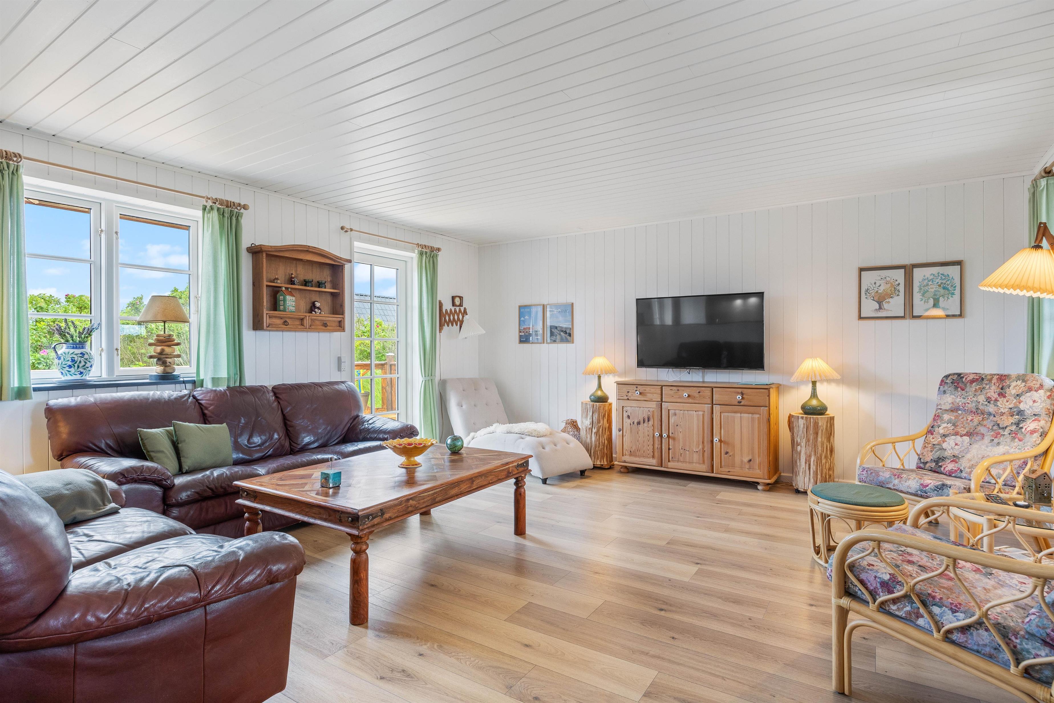 I sommerhuset er der virkelig lagt op til mange hyggelige feriestunder for hele familien. Køkken, stue og spiseplads ligger i åben forbindelse i alrummet, hvor I virkelig kan nyde hinandens selskab, selv når nogle står for madlavningen i køkken og andre slapper af i stuen. I stuen er der også en brændeovn, der spreder varme og hyggelig stemning.