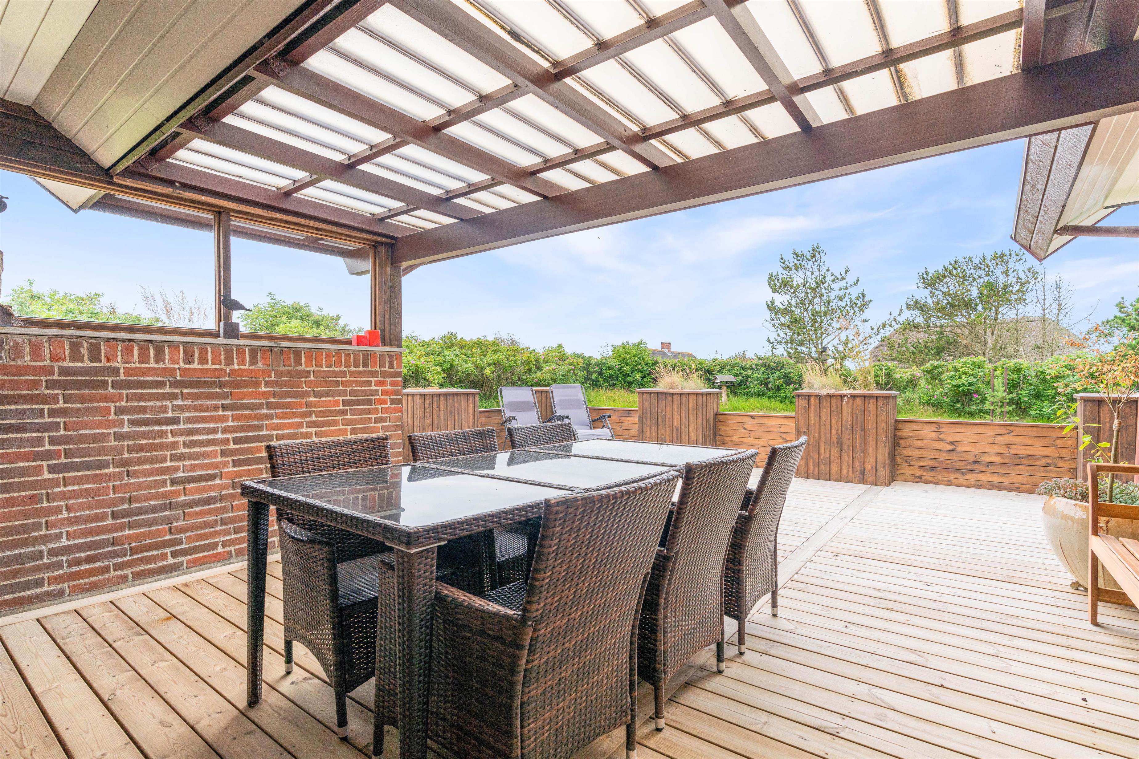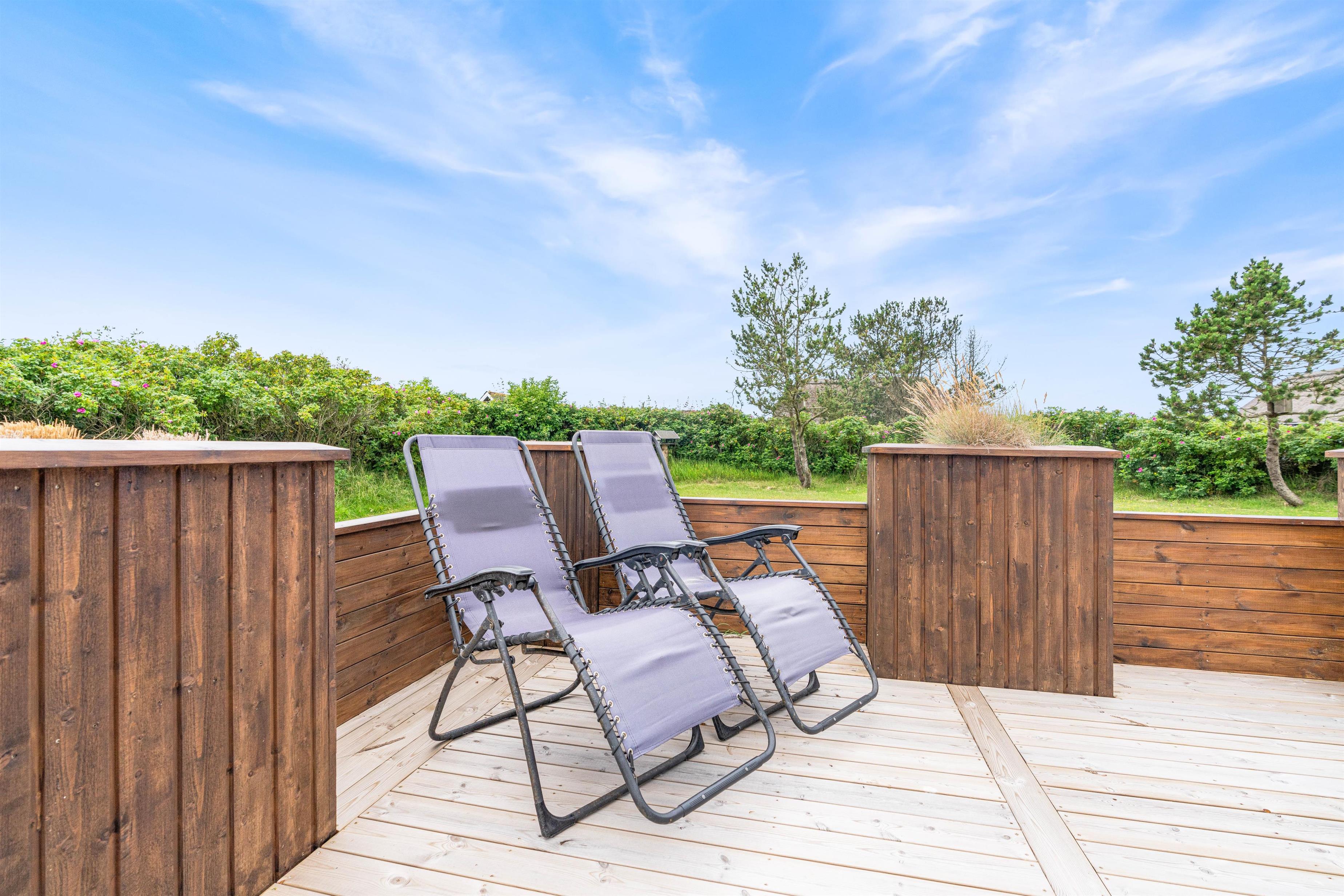 Sommerhuset er beliggende på en 1.205 kvadratmeter stor grund, hvor der er masser af plads til store og små. På terrassen har I havemøbler og liggestole til rådighed, så I kan finde jer godt til rette på en god plads i solen. Alt imens kan børnene hygge sig i haven og i sandkassen. Om aftenen kan I alle samles på terrassen til en lækker middag på sommerhusets gasgrill.