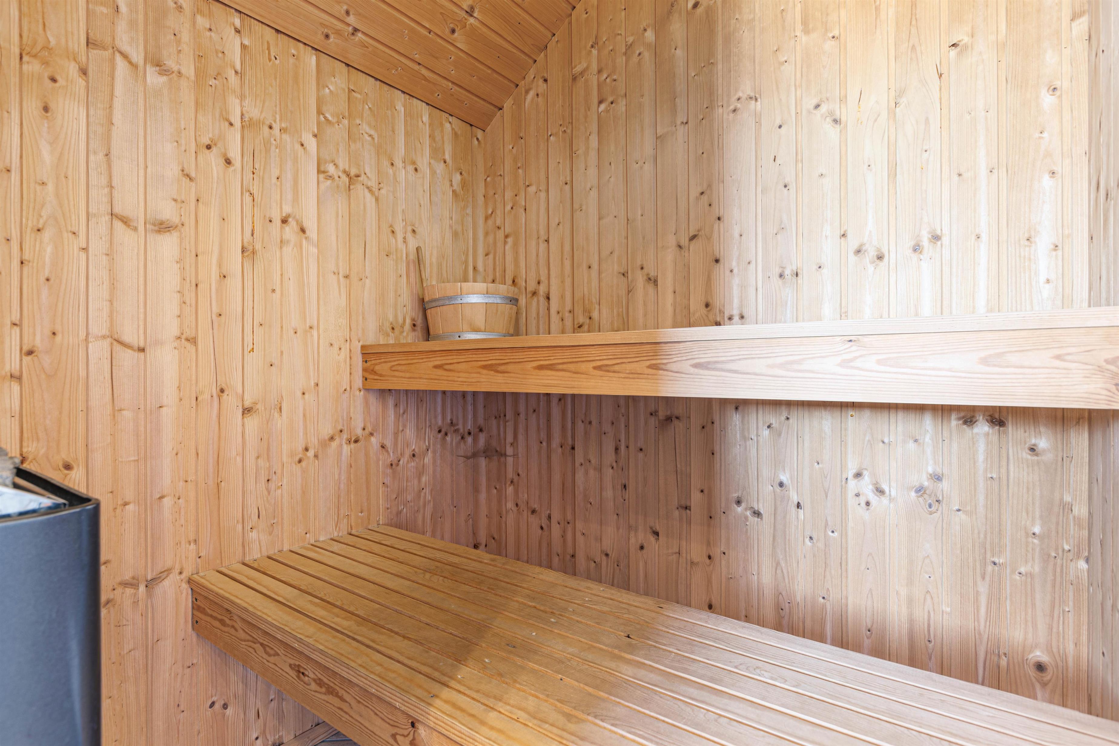 Derudover er der en rummelig stue, hvor du kan se en god film eller læse en spændende bog, mens brændeovnen spreder varme og hygge. På det store badeværelse er der også spabad og sauna, hvor du kan forkæle krop og sjæl, eller lade børnene plaske i de varme bobler.