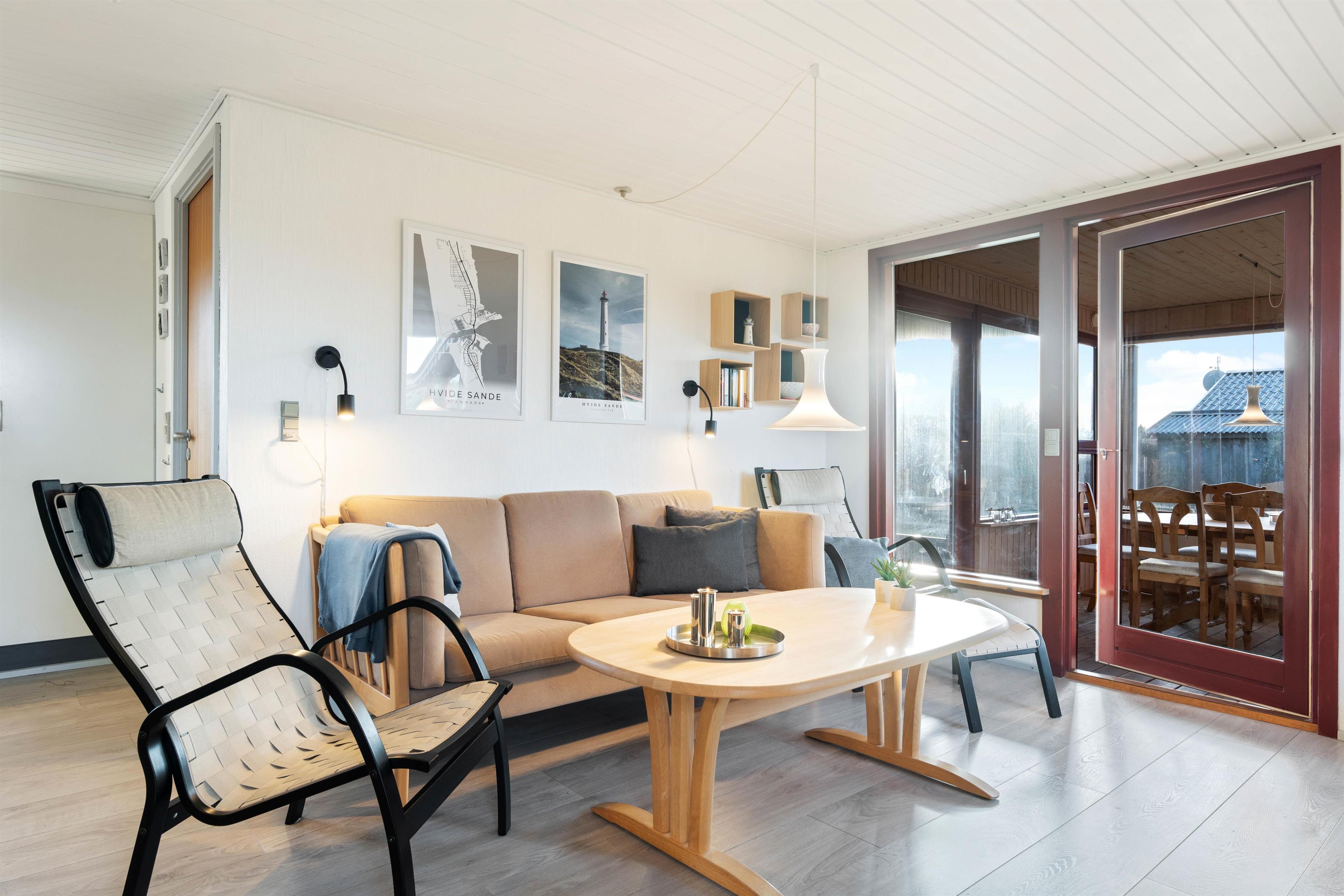 Det åbne køkken- og stueområde er husets absolutte hjerte og bliver centrum for samvær hele ferien igennem. Her vil der med garanti blive tilbragt mange herlige stunder med gode snakke over madlavningen eller et hyggeligt spil kort i de sene aftentimer rundt om sofabordet med brændeovnens knitren i baggrunden.