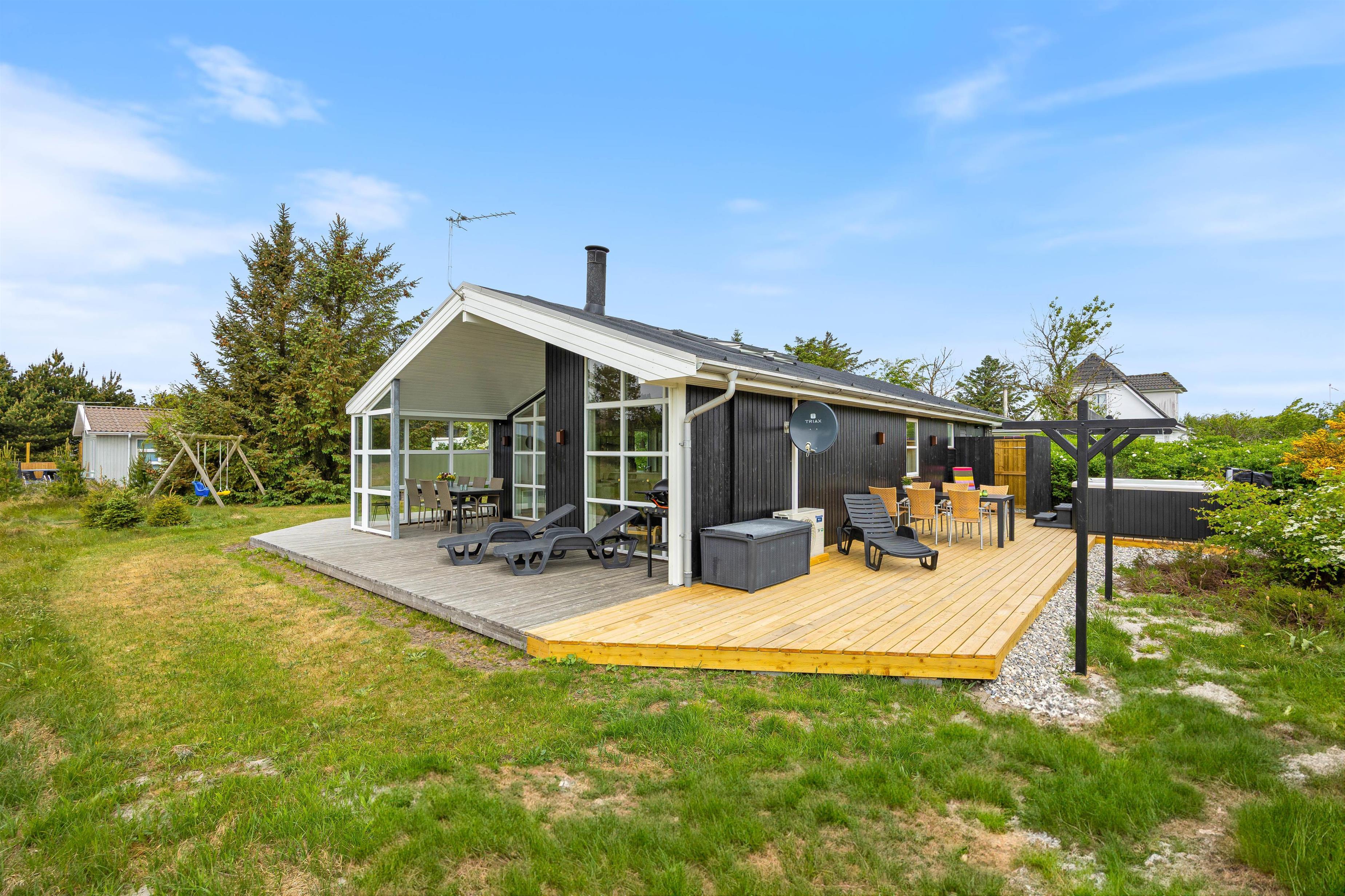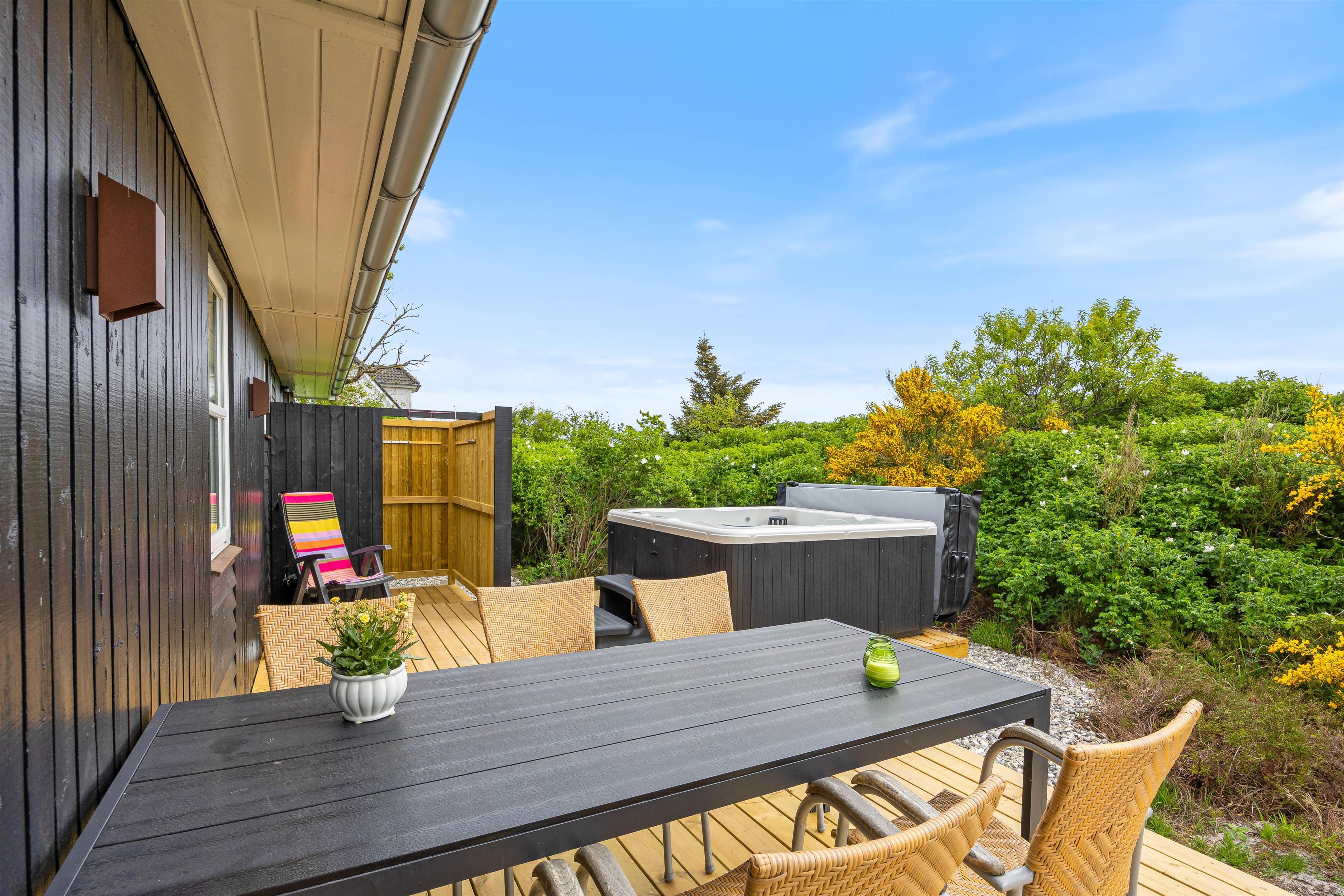 Den delviste overdækkede terrasse er udstyret med havemøbler, så I har mulighed for at sætte jer ned og nyde den friske vesterhavsluft uanset vejret. På terassen finder I også en grill, så I kan rykke aftensmaden udenfor. På grunden er der opsat en gynge og sandkasse - perfekt til børnene.