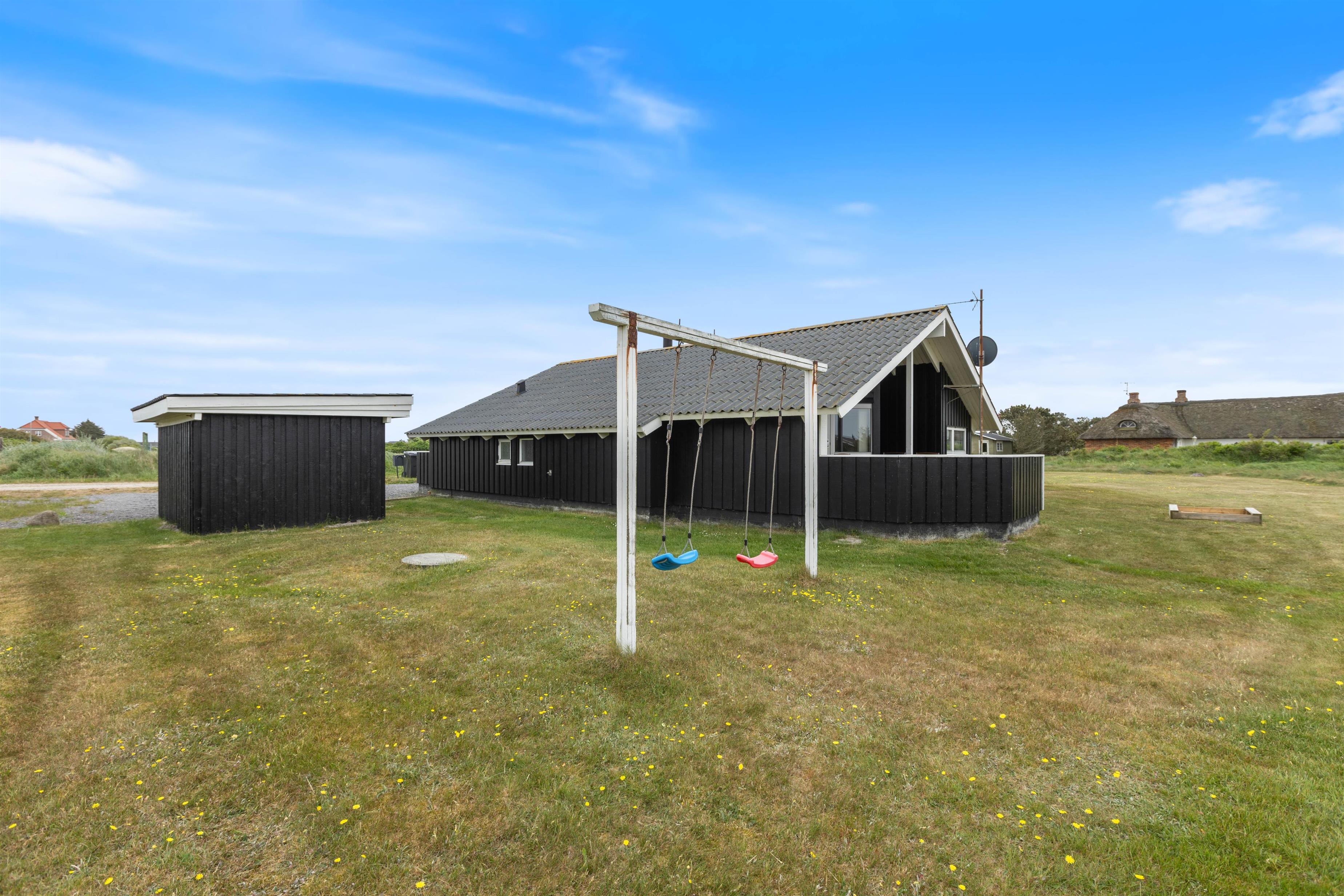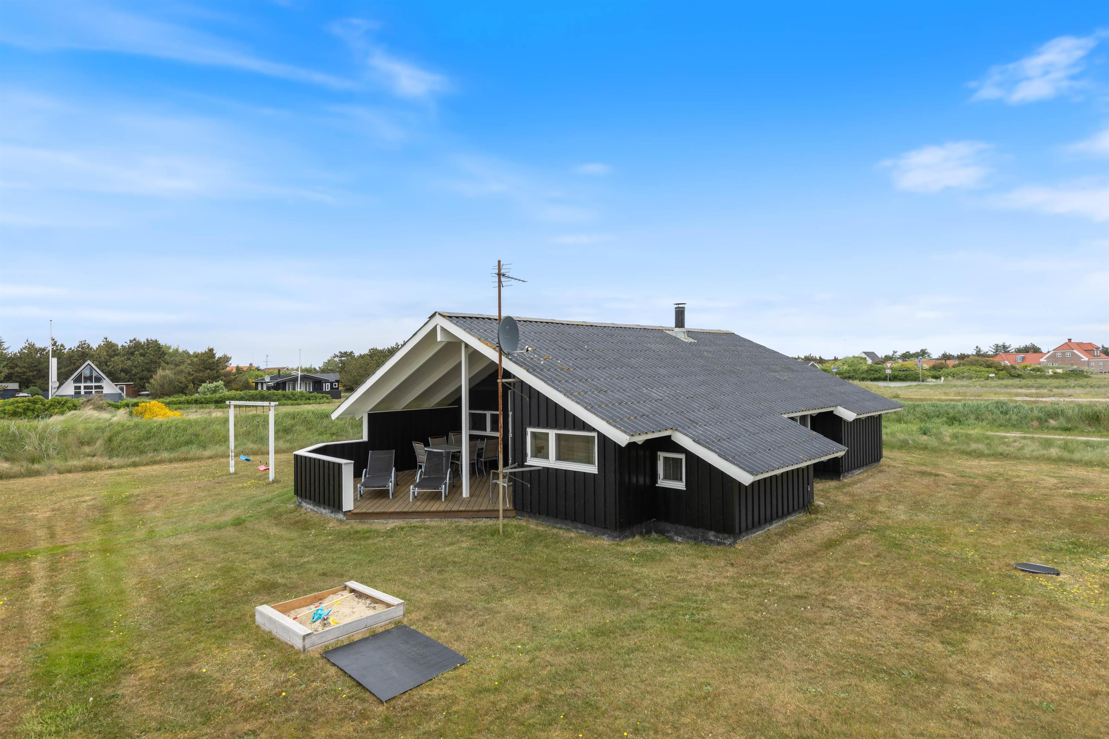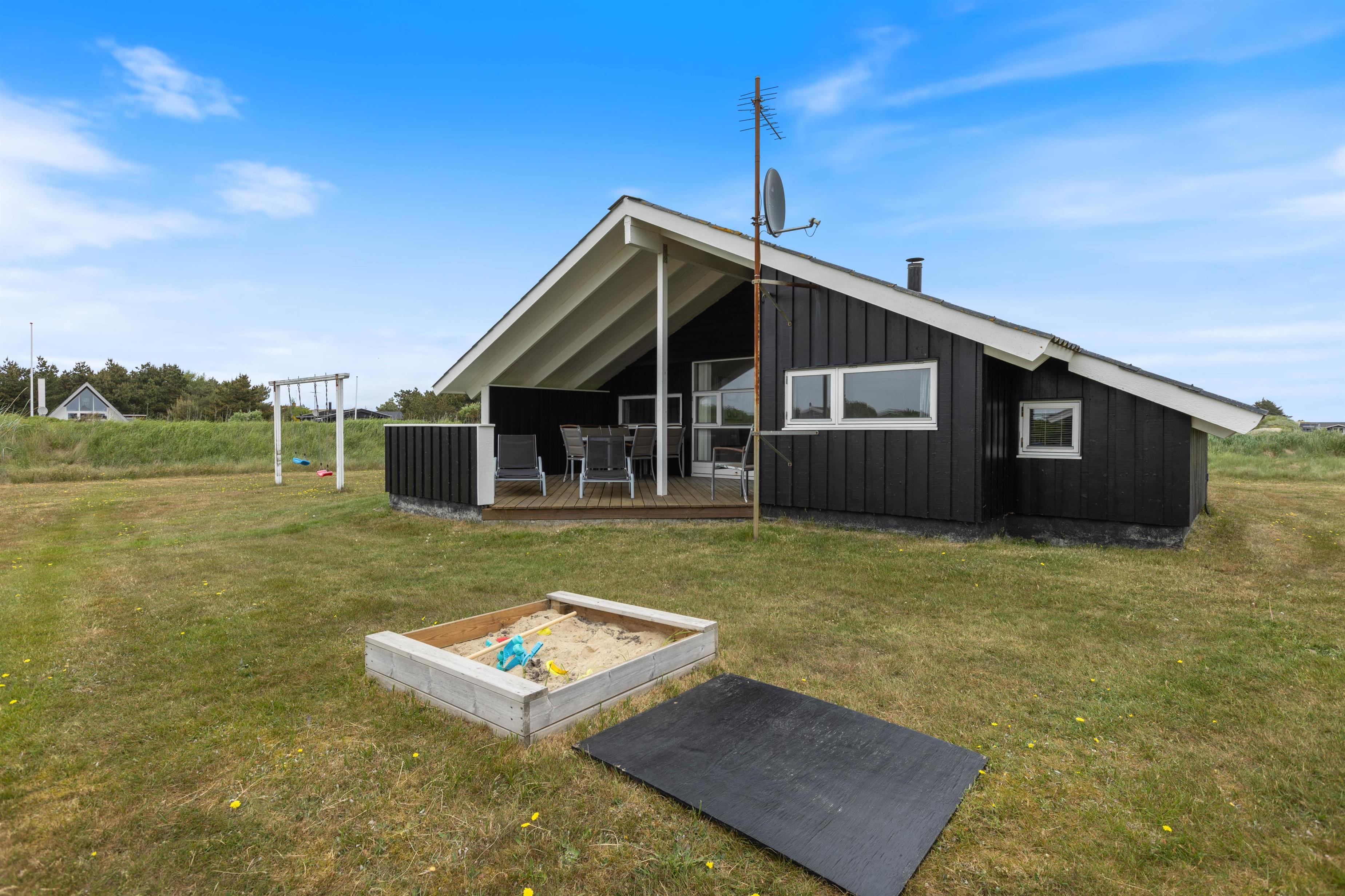 Dejligt og velholdt sommerhus beliggende i et hyggeligt sommerhusområde nord for Hvide Sande. Huset ligger på en plænegrund med gode muligheder for leg og boldspil, her er også opstillet sandkasse og gynge til de mindste.