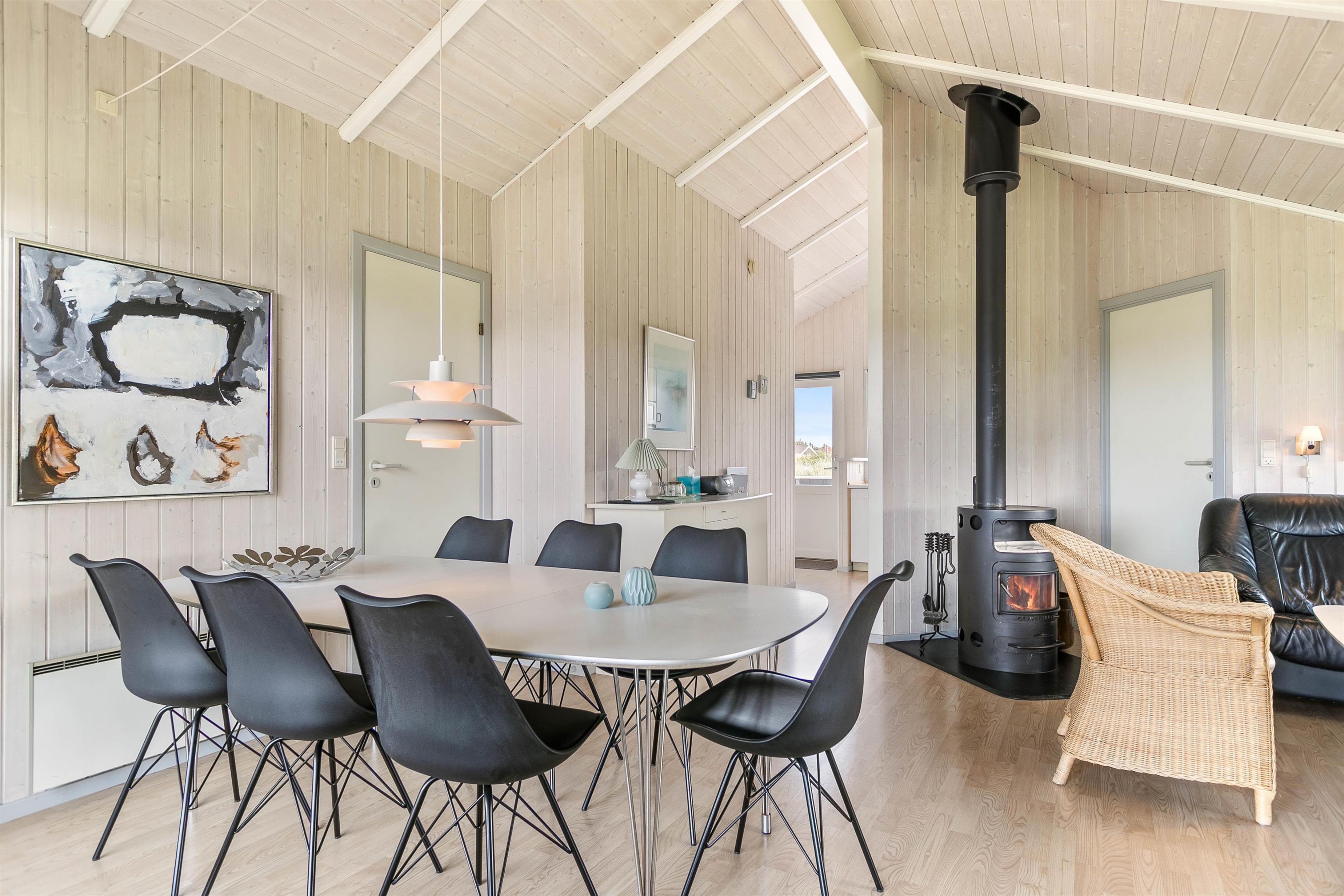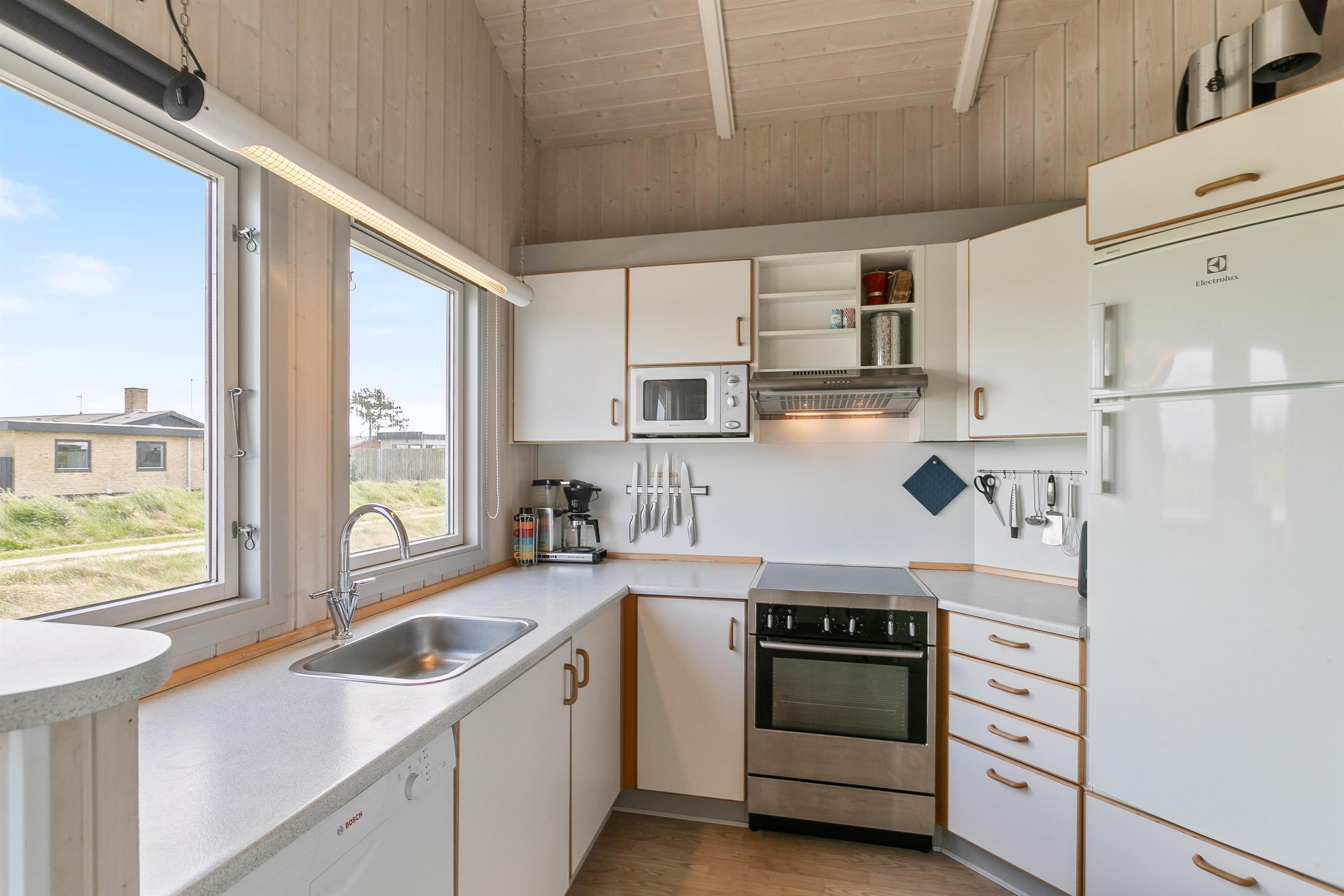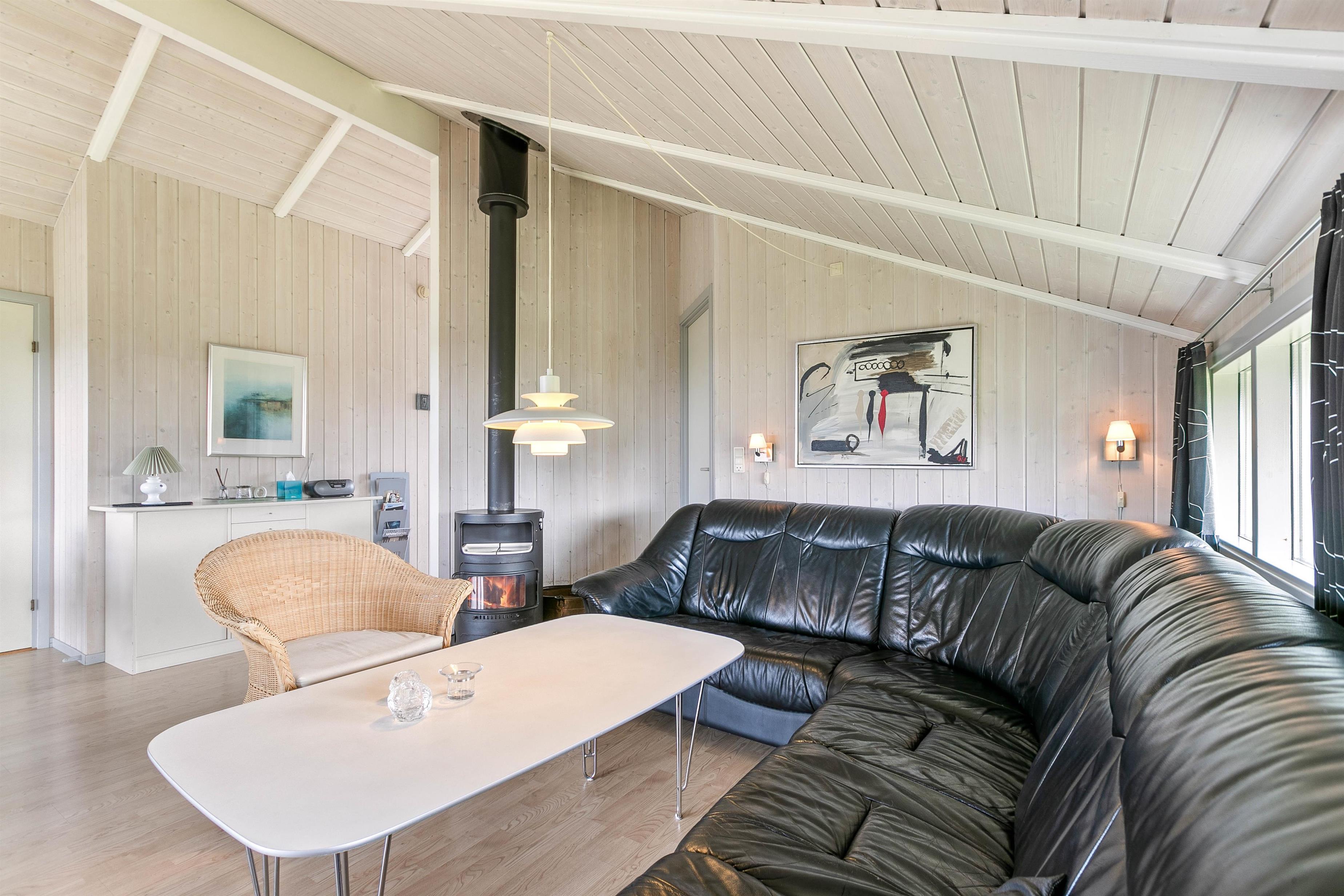 Dette velholdte sommerhus er beliggende på en plænegrund, der indbyder til leg og boldspil, og for de mindste er der opstillet gynge og sandkasse. Huset er indrettet til 6 personer og har 3 soveværelser med dobbeltsenge. Det praktisk indrettede køkken er f.eks. udstyret med opvaskemaskine og mikroovn. I den dejlige stue er der åbent til kip og masser af lysindfald, som giver et dejligt og indbydende opholdsrum. Her er trægulve, brændeovn, gode møbler og fladskærm. Du kan lade ungerne lege eller tage en middagslur i den hyggelige alkove.