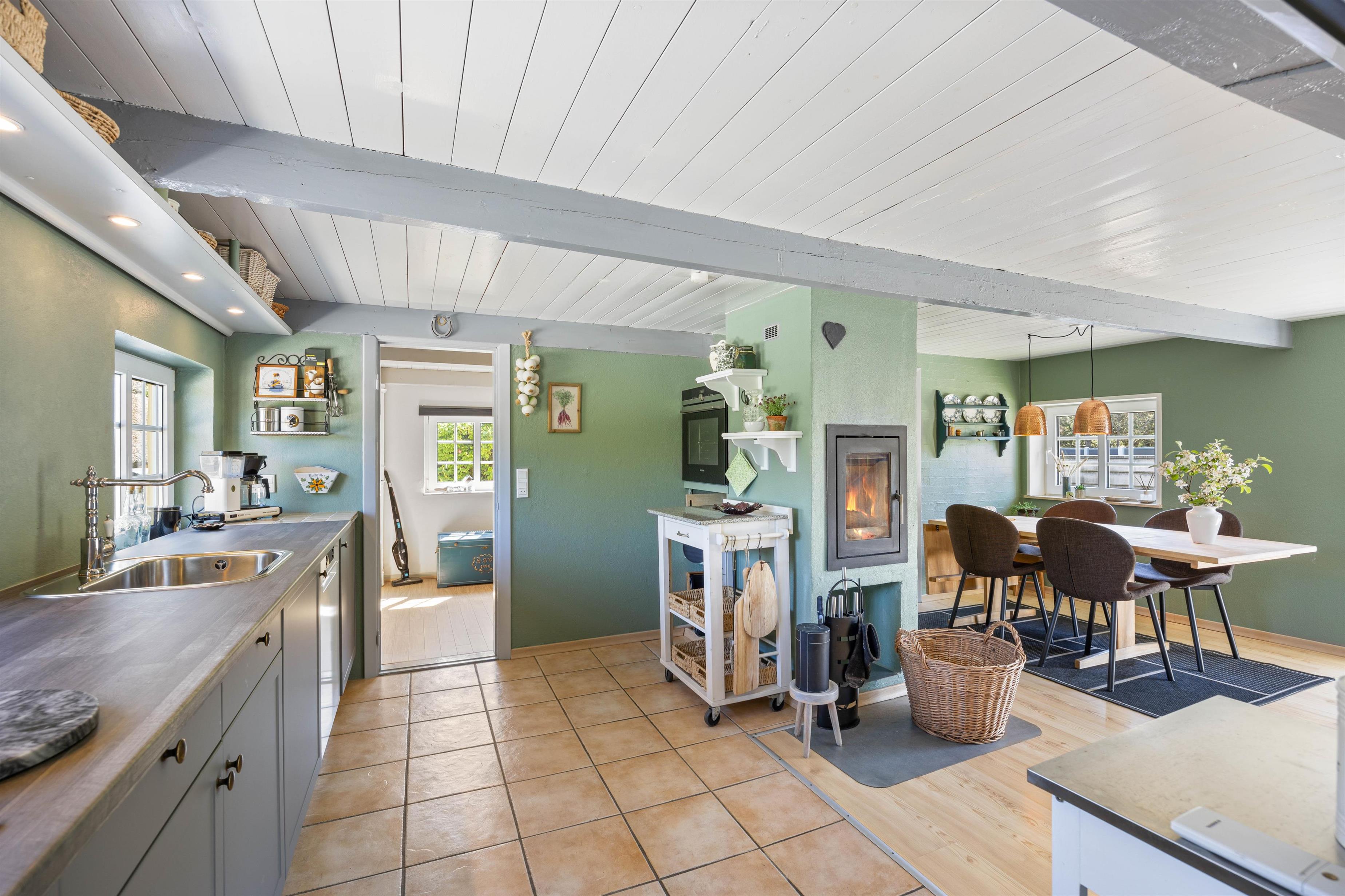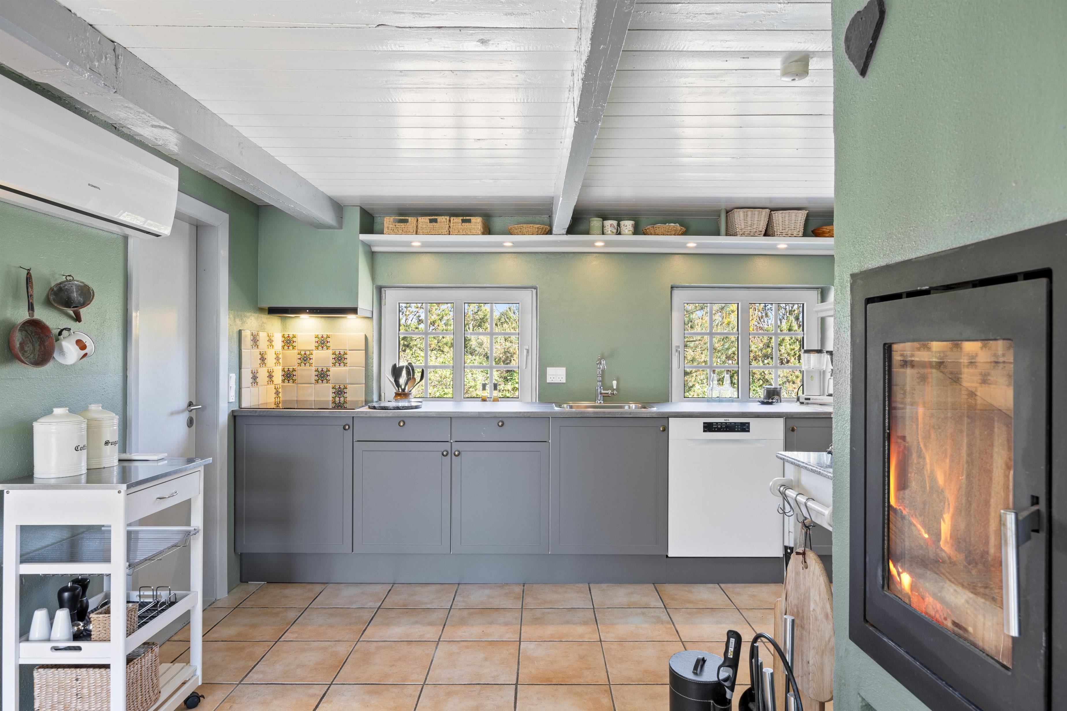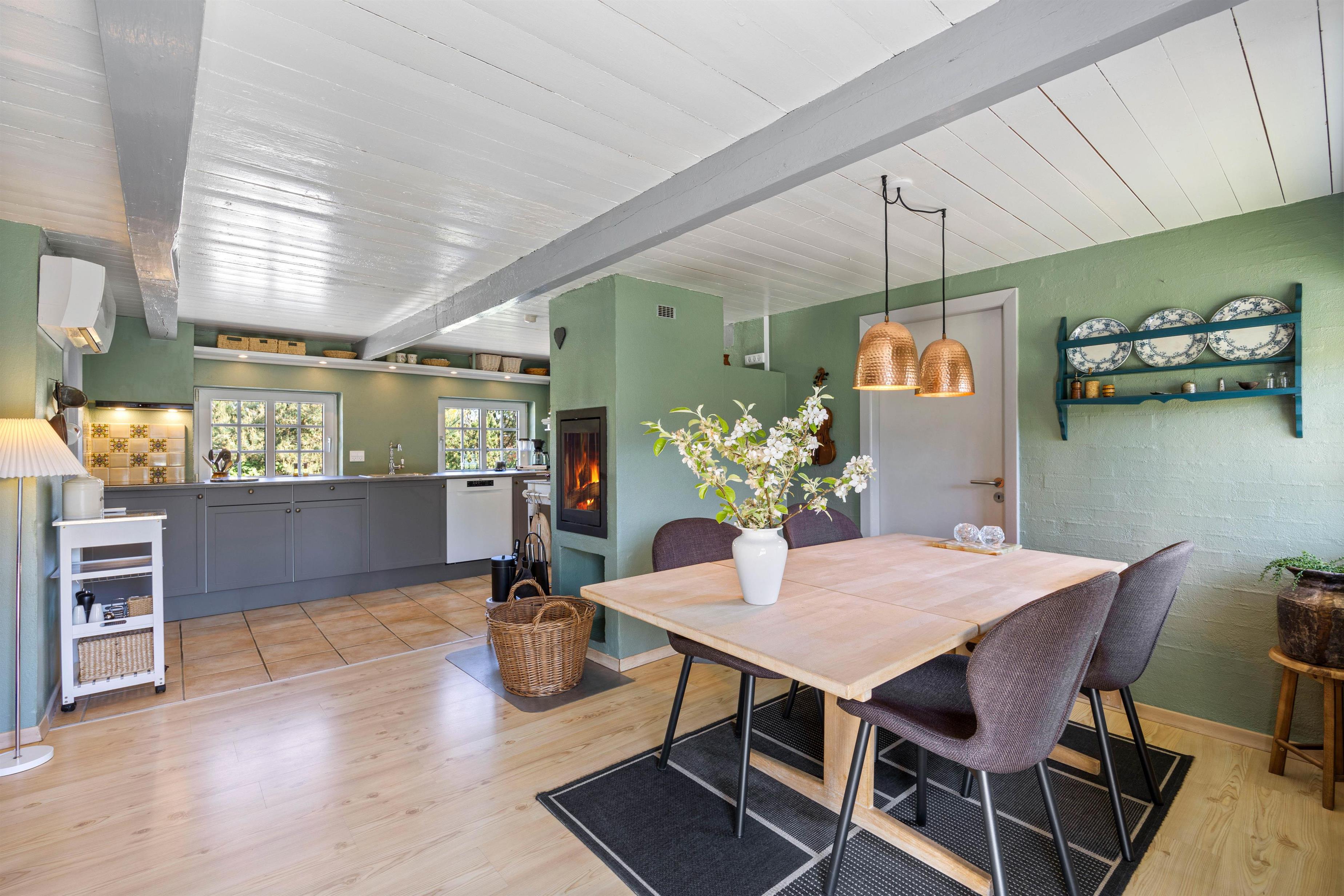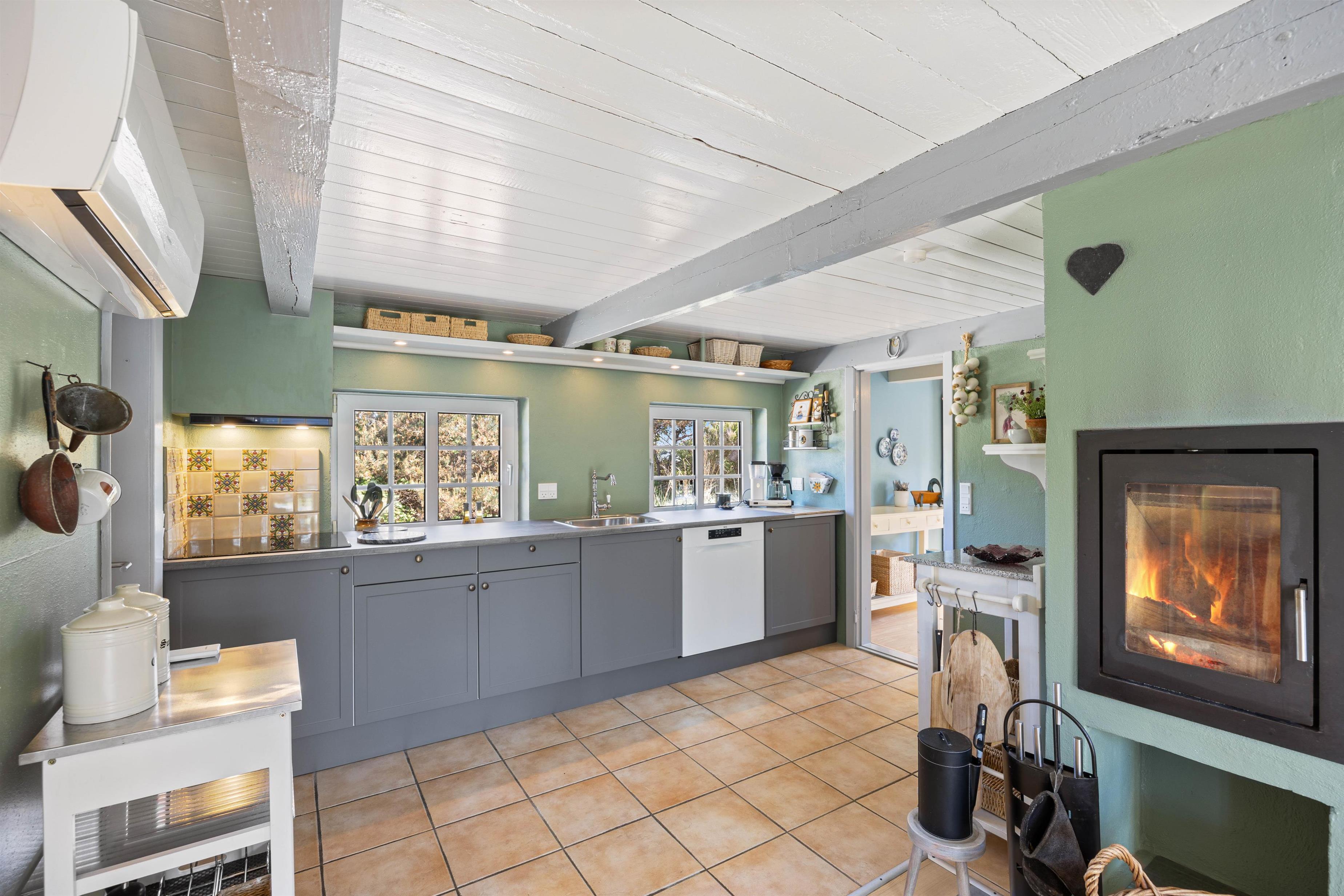 Den afslappende, indbydende og hyggelige atmosfære der rammer jer, når I træder ind i sommerhuset, vil ligge vejen for en mindeværdig ferie. Med et skønt køkkenalrum kan I foretage de daglige gøremål som madlavning og opvask. Dog uden at gå på kompromis med familiehygge og nærvær. Her kan I nyde et funktionelt køkken, et komfortabelt spiseområde og en afslappende stue med pejs og fladsskærms-TV. Udover pejsen er der en energibesparende varmepumpe, som sikrer jer en behagelig temperatur.