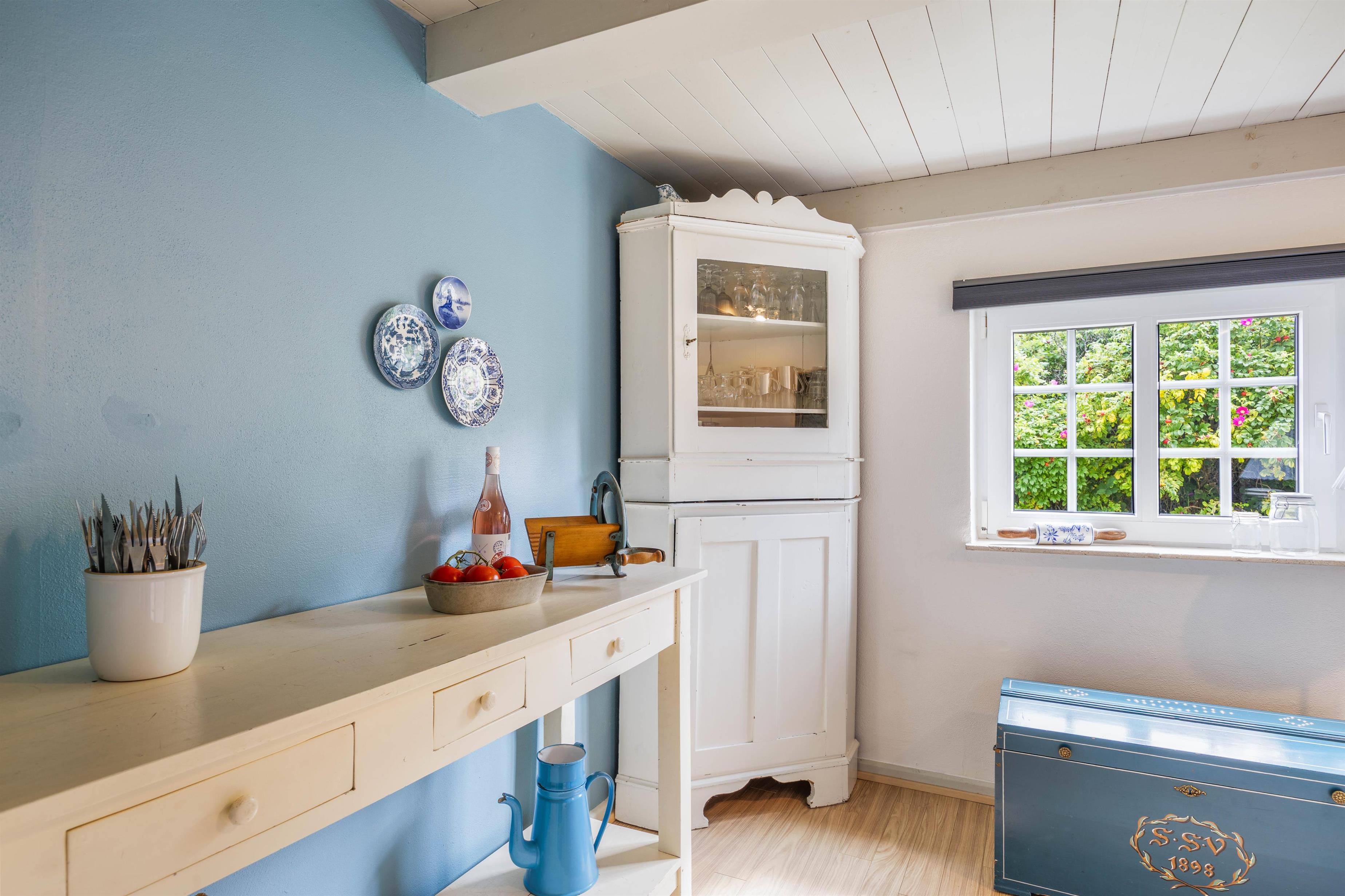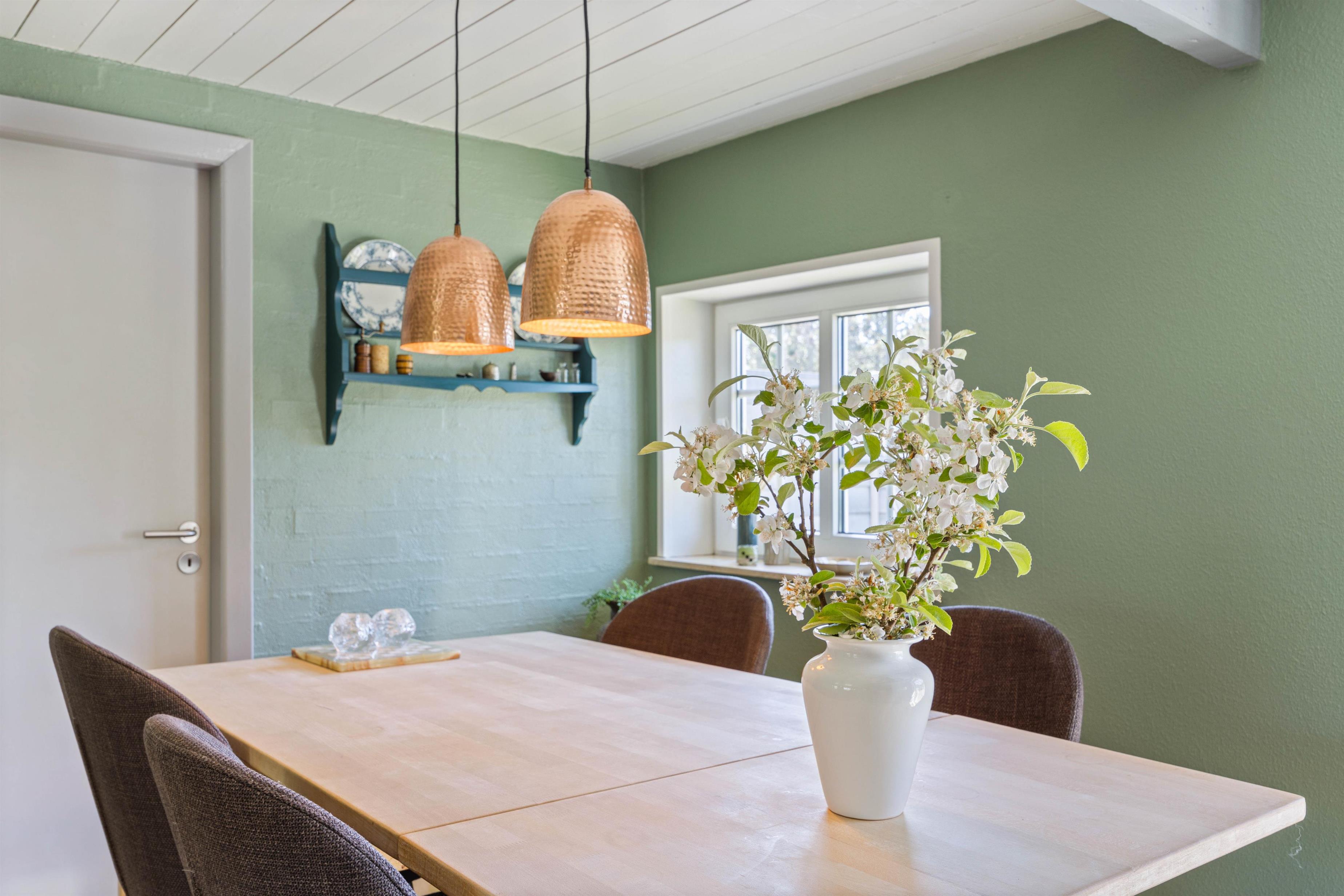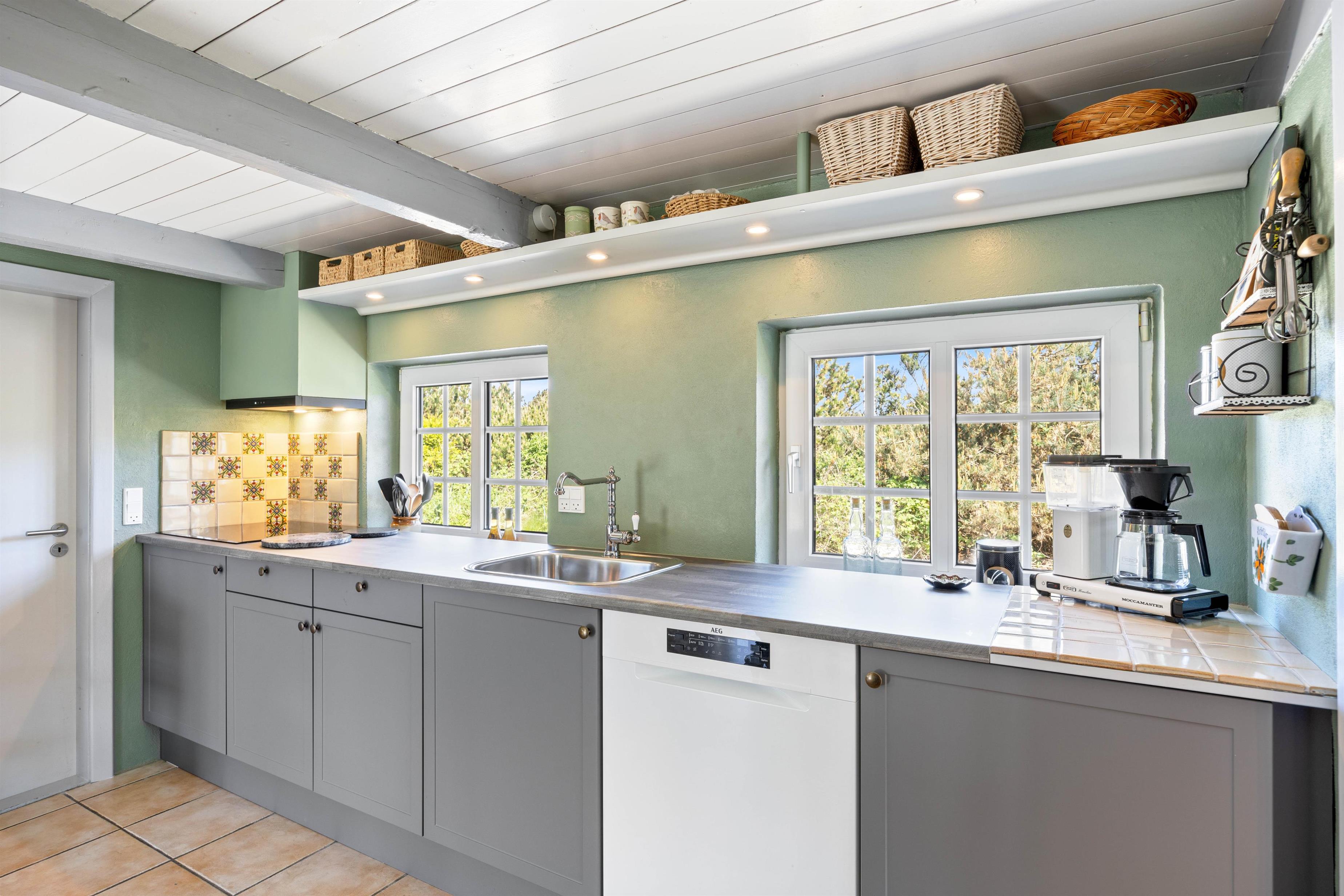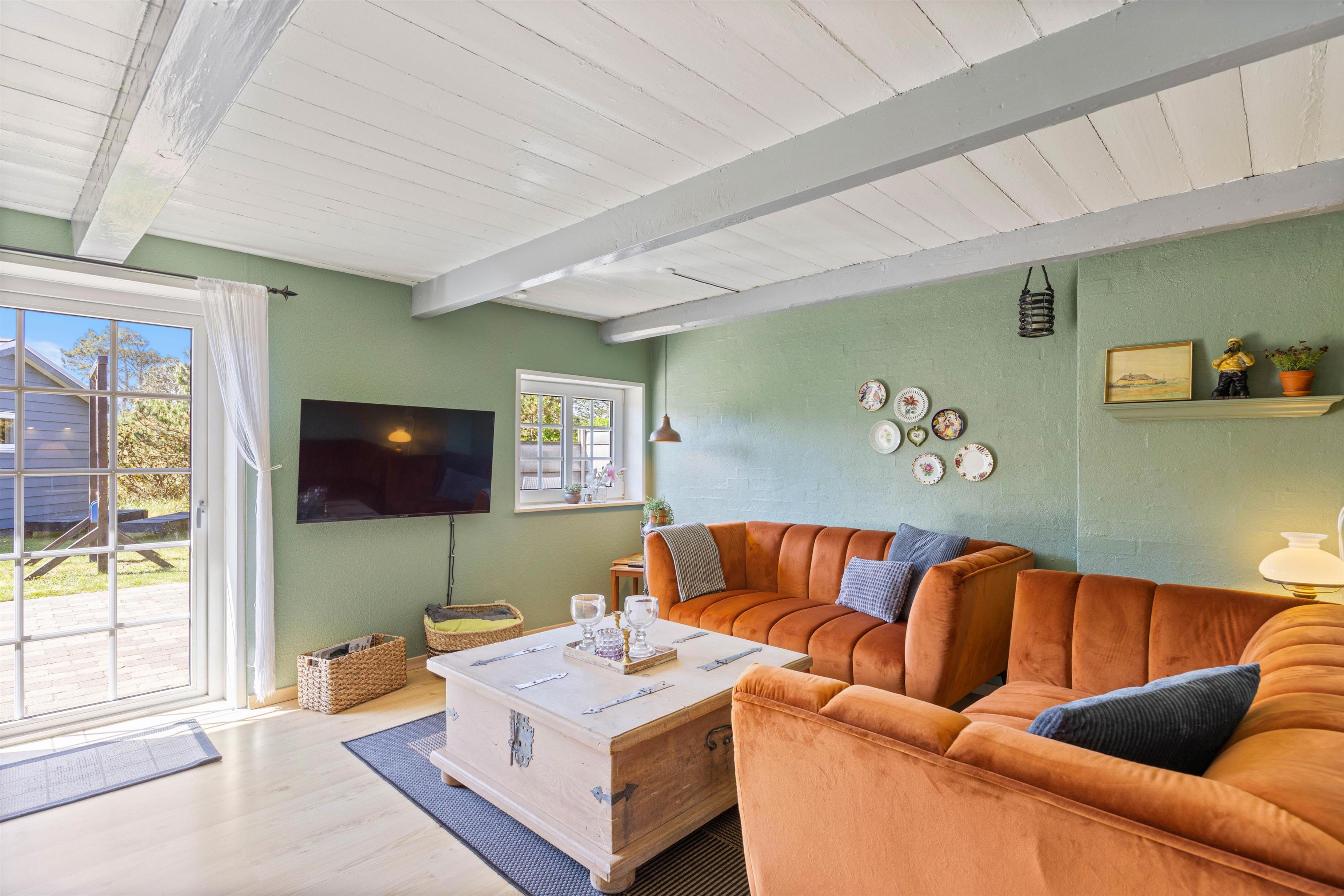 Den afslappende, indbydende og hyggelige atmosfære der rammer jer, når I træder ind i sommerhuset, vil ligge vejen for en mindeværdig ferie. Med et skønt køkkenalrum kan I foretage de daglige gøremål som madlavning og opvask. Dog uden at gå på kompromis med familiehygge og nærvær. Her kan I nyde et funktionelt køkken, et komfortabelt spiseområde og en afslappende stue med pejs og fladsskærms-TV. Udover pejsen er der en energibesparende varmepumpe, som sikrer jer en behagelig temperatur.