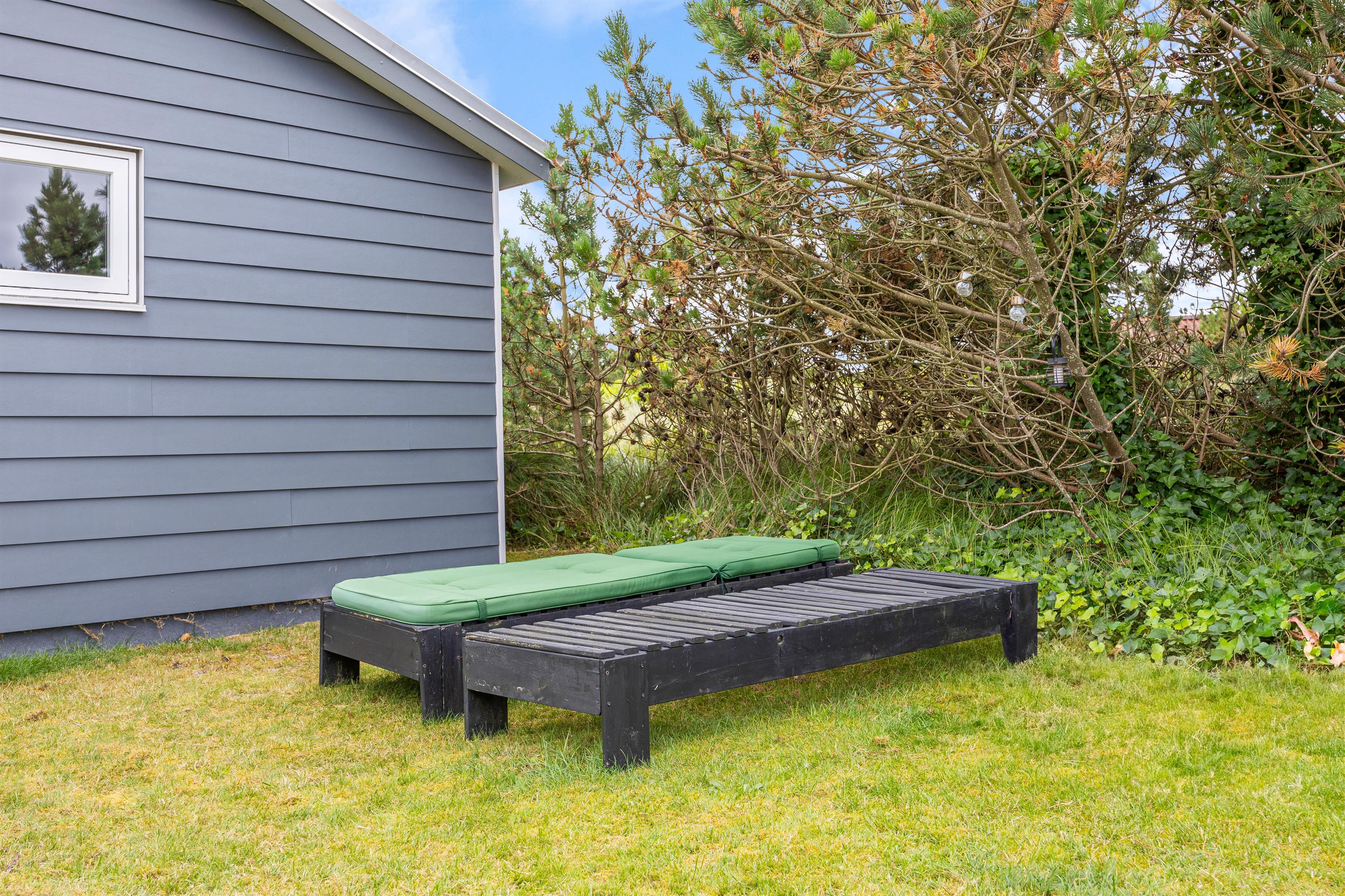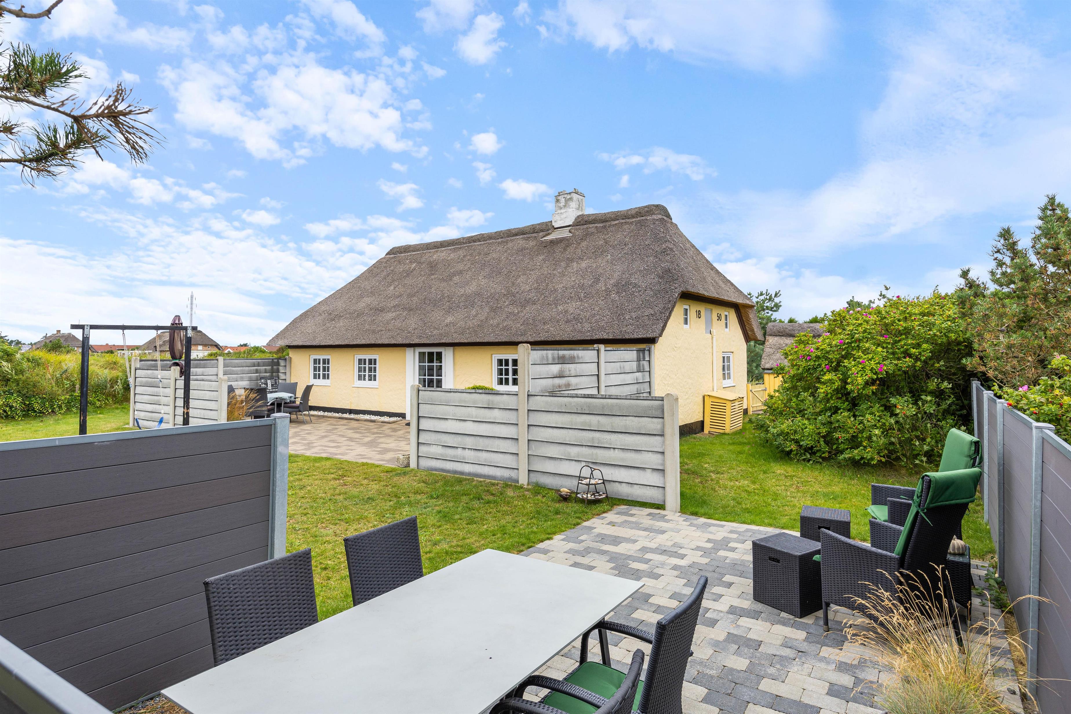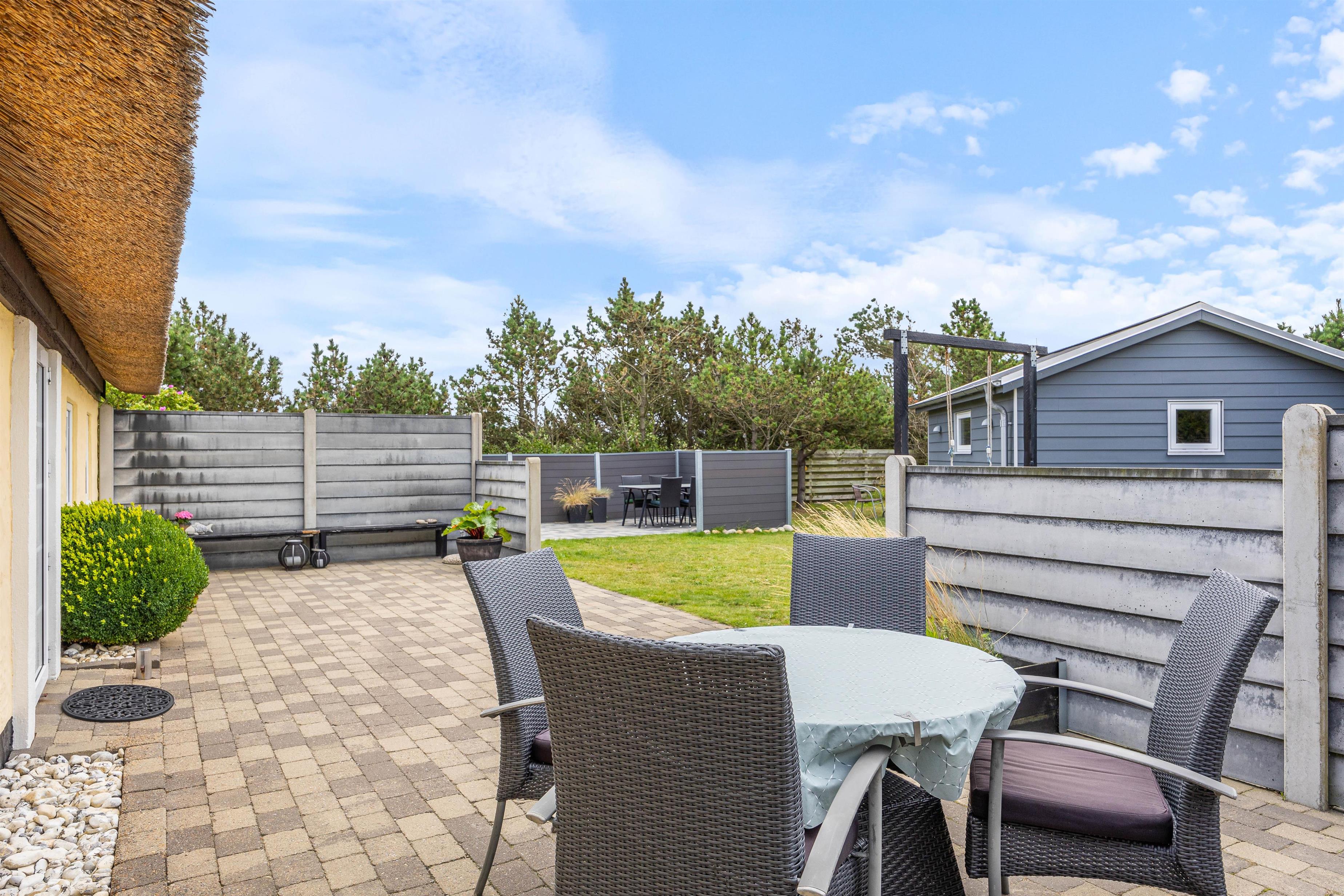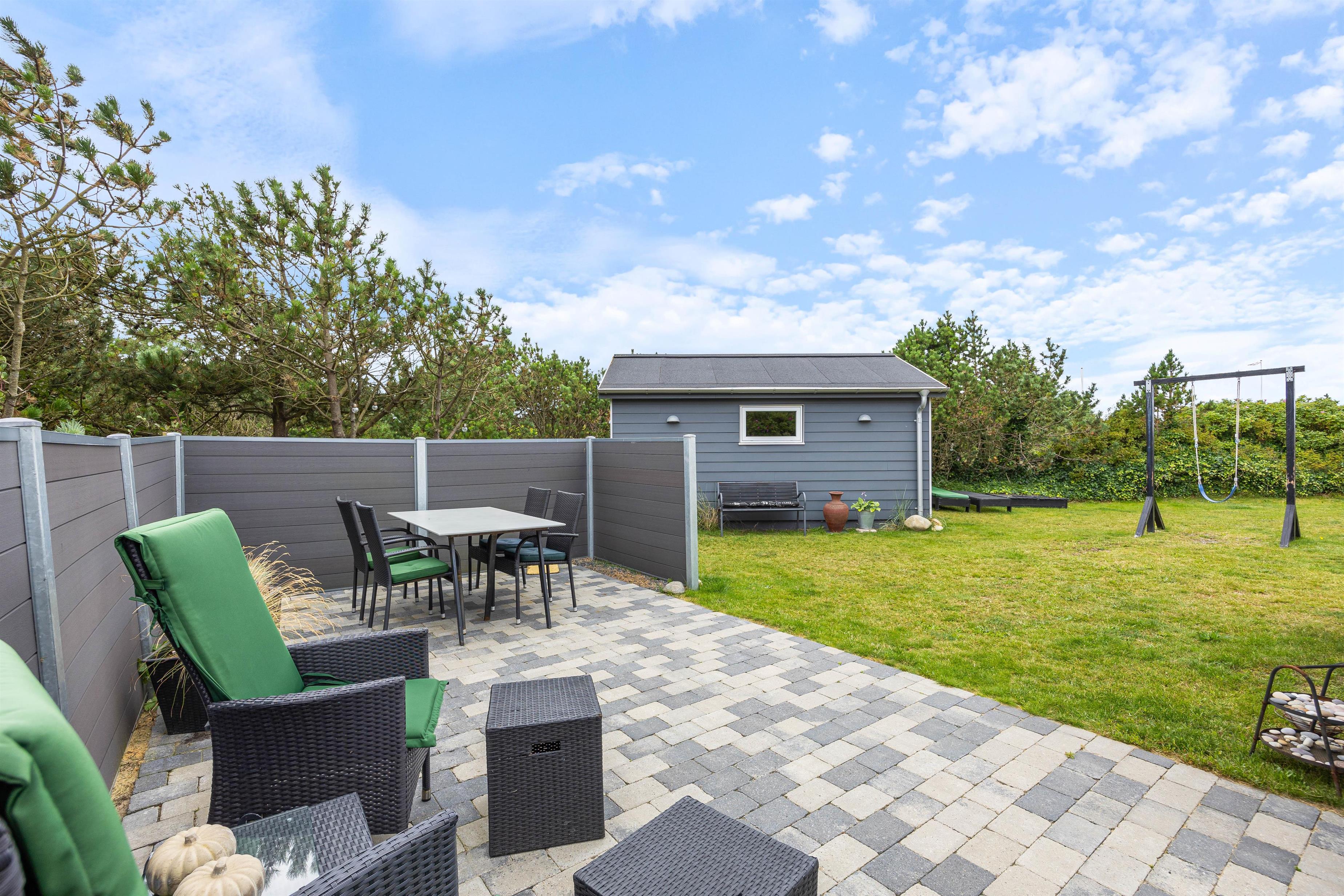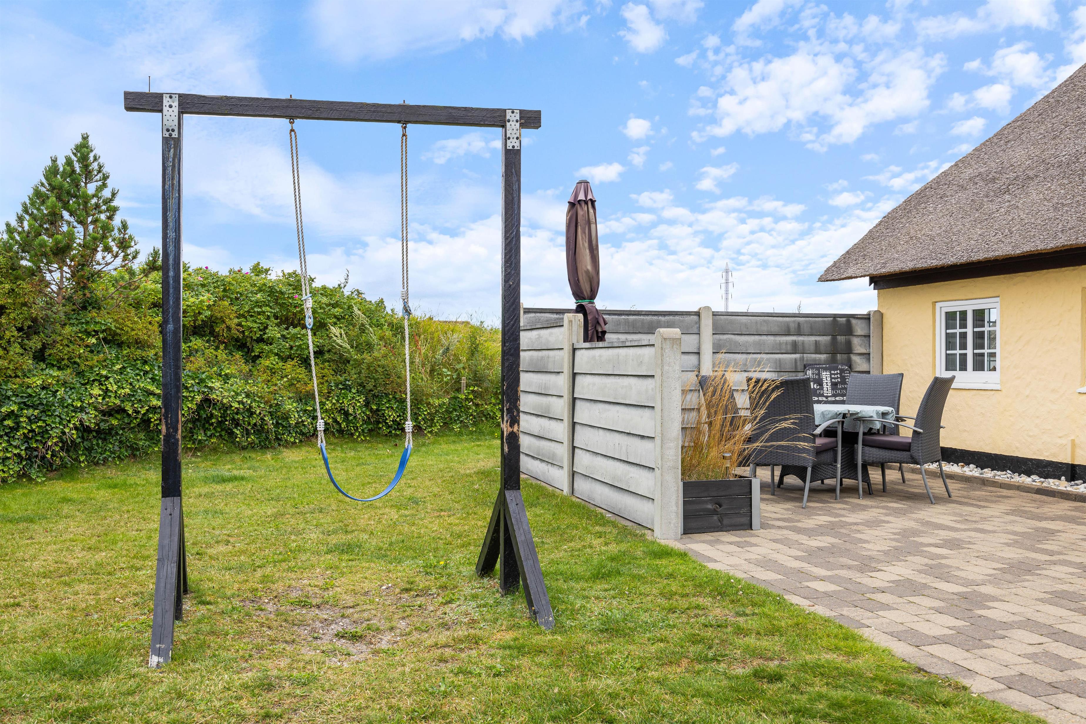 Terrassen og sommerhuset ligger på en skøn indhegnet grund, som er kombineret af en græsplæne, natur og klitlandskab. Her er der fri mulighed for at slippe mindre børn fri, så de kan undersøge området. Desuden er der også gode muligheder for underholdning til børnene, da der er et gyngestativ, og ellers kan I medbringe nogle sjove havespil, som hele familien kan være med til.