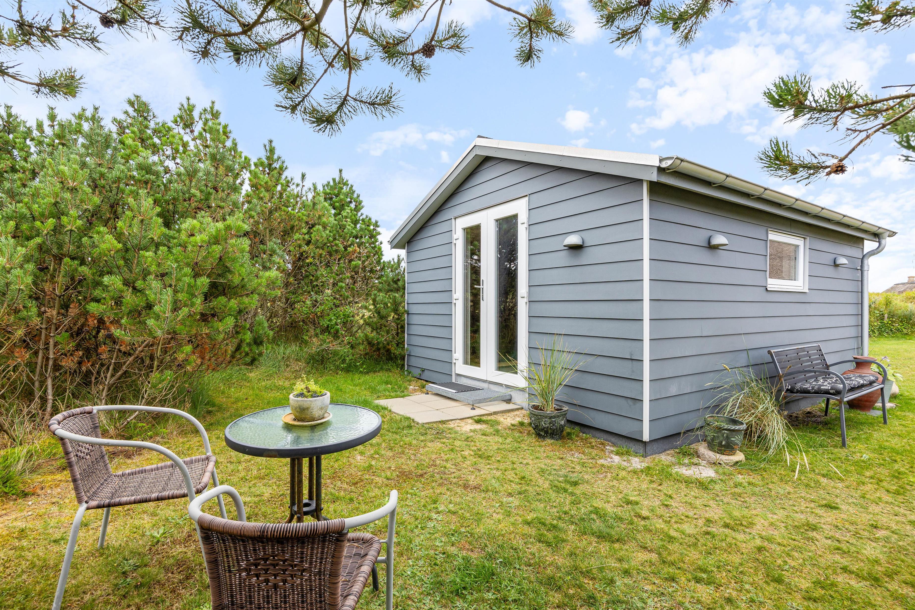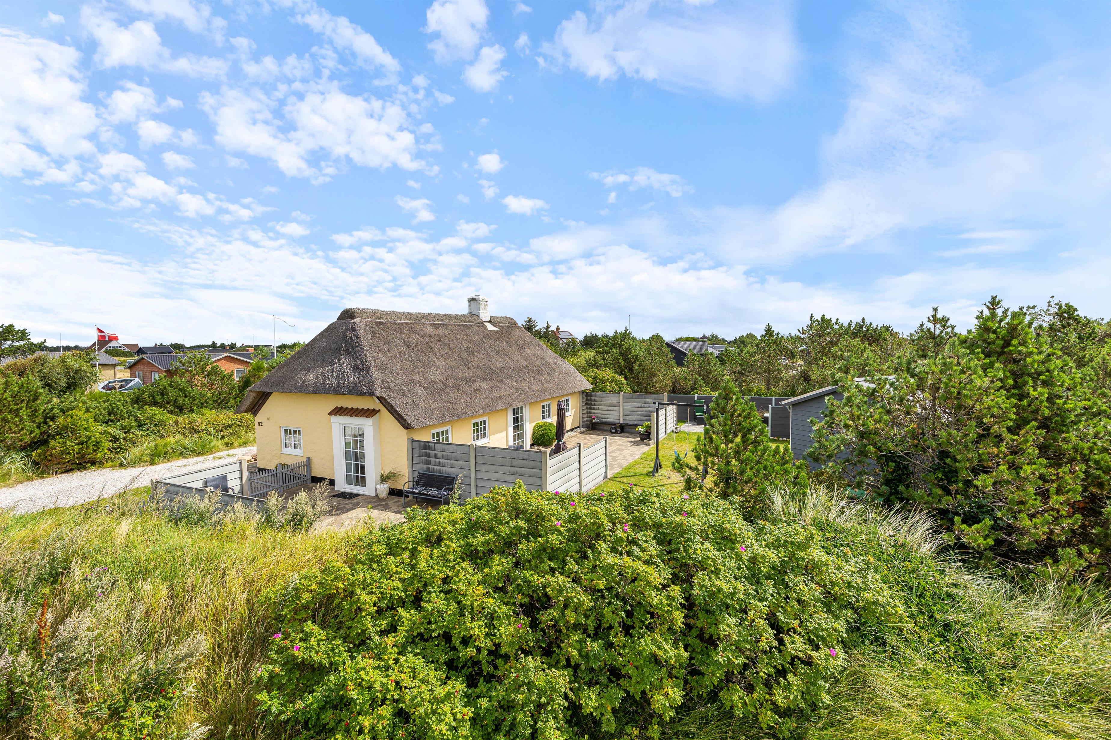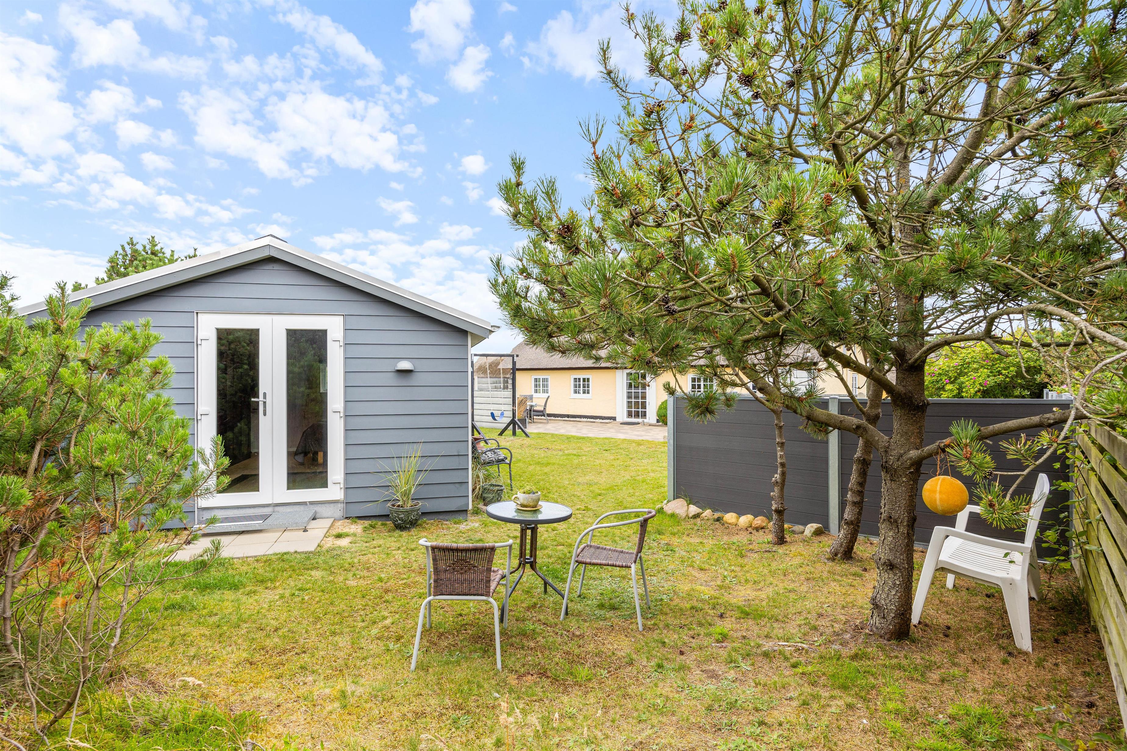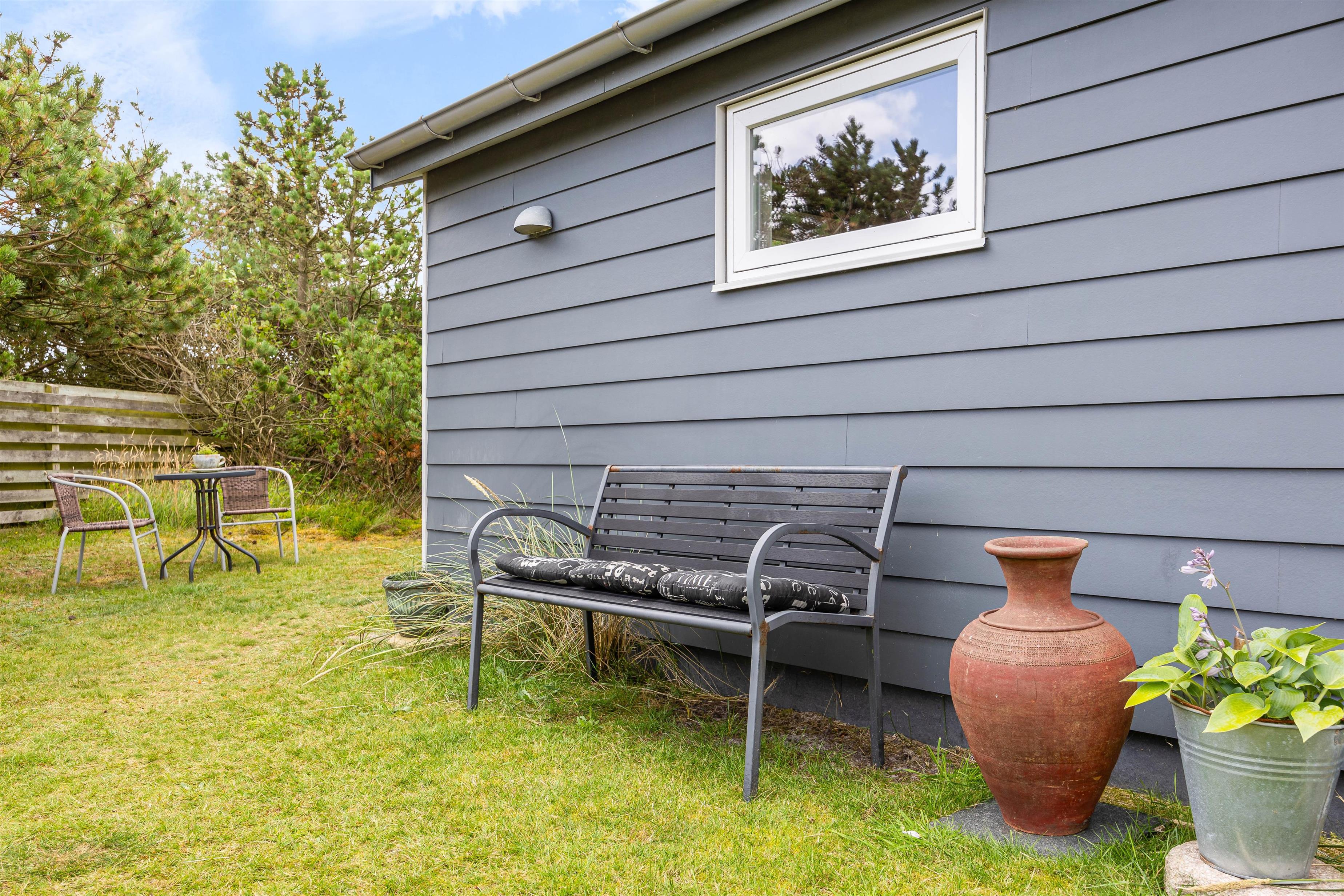 Terrassen og sommerhuset ligger på en skøn indhegnet grund, som er kombineret af en græsplæne, natur og klitlandskab. Her er der fri mulighed for at slippe mindre børn fri, så de kan undersøge området. Desuden er der også gode muligheder for underholdning til børnene, da der er et gyngestativ, og ellers kan I medbringe nogle sjove havespil, som hele familien kan være med til.