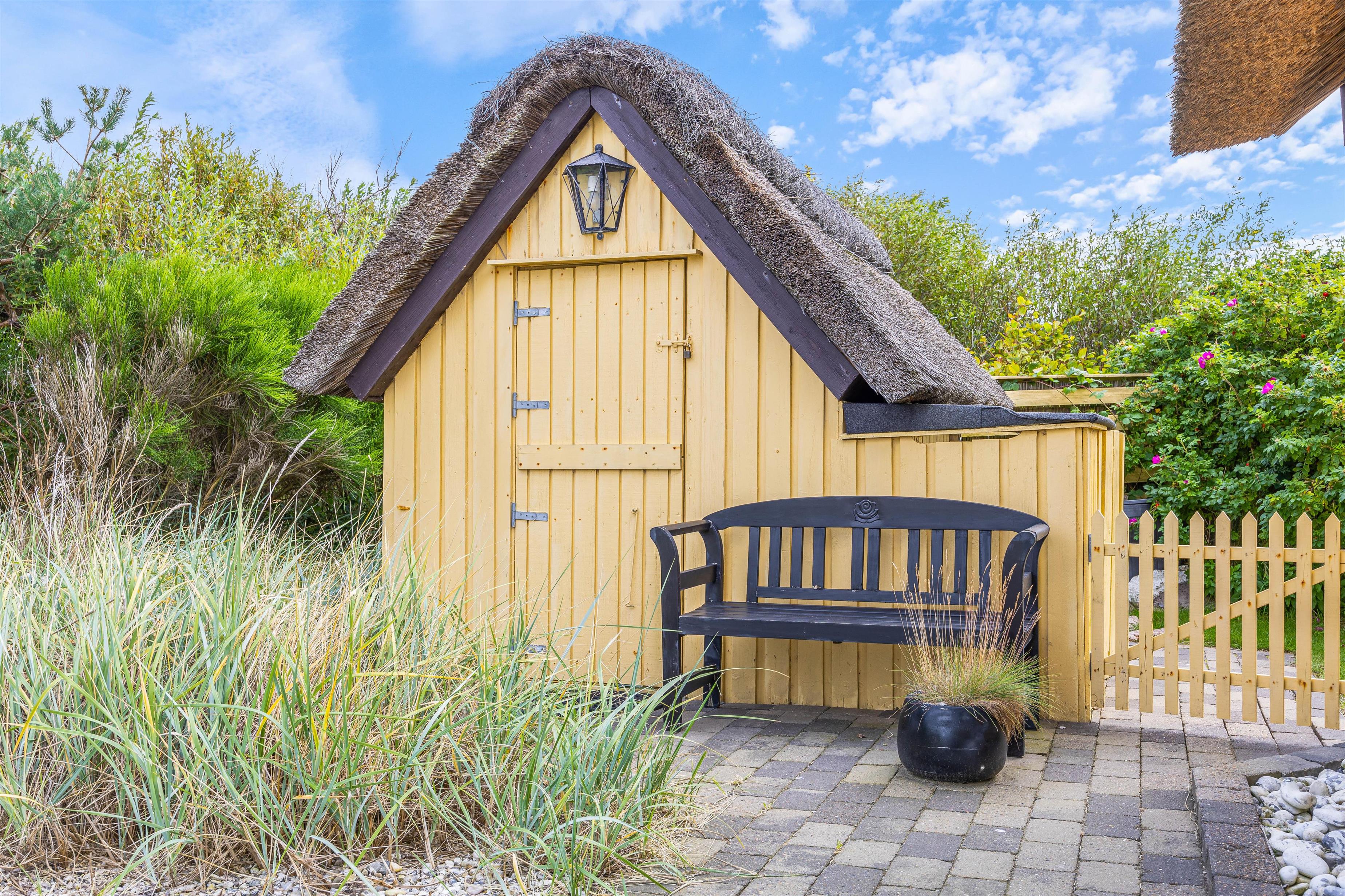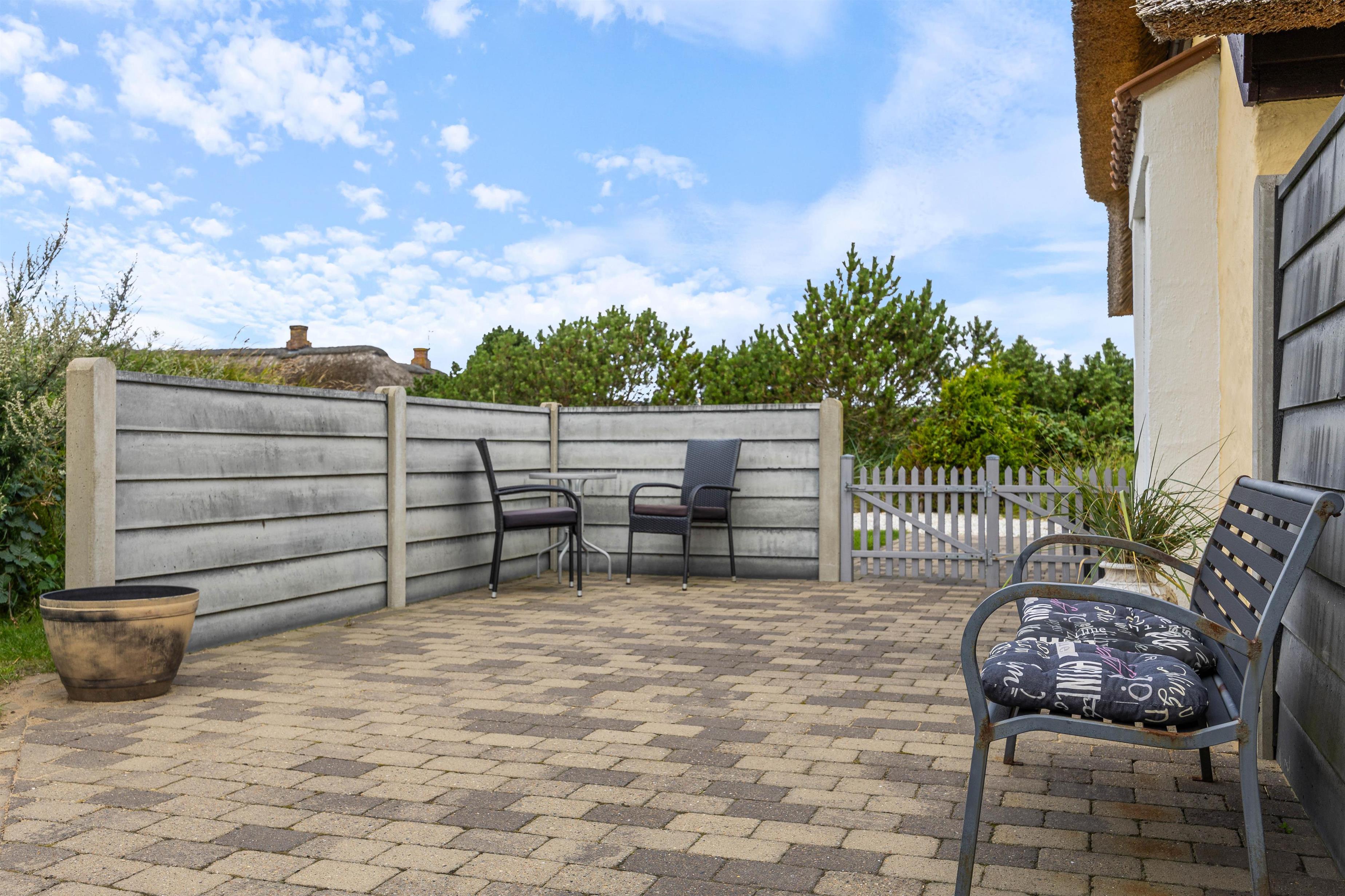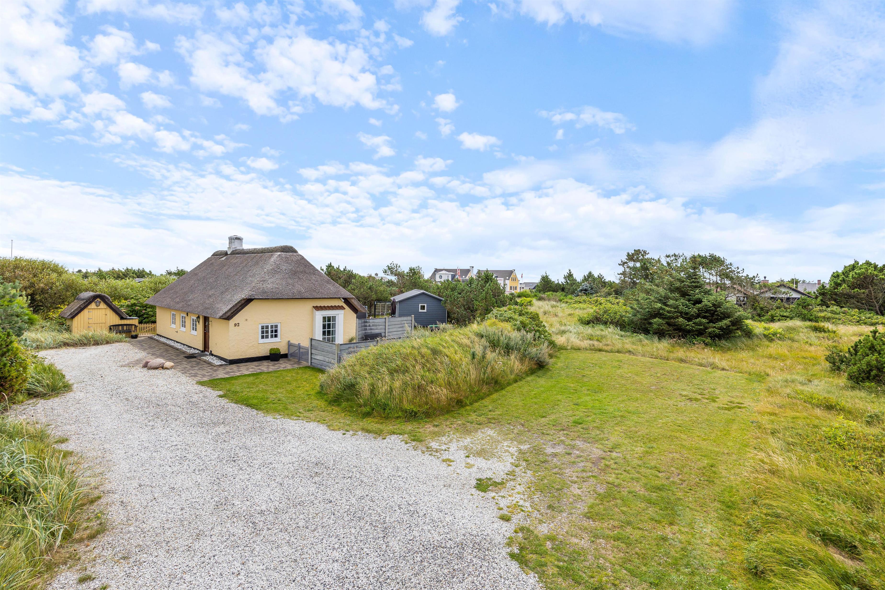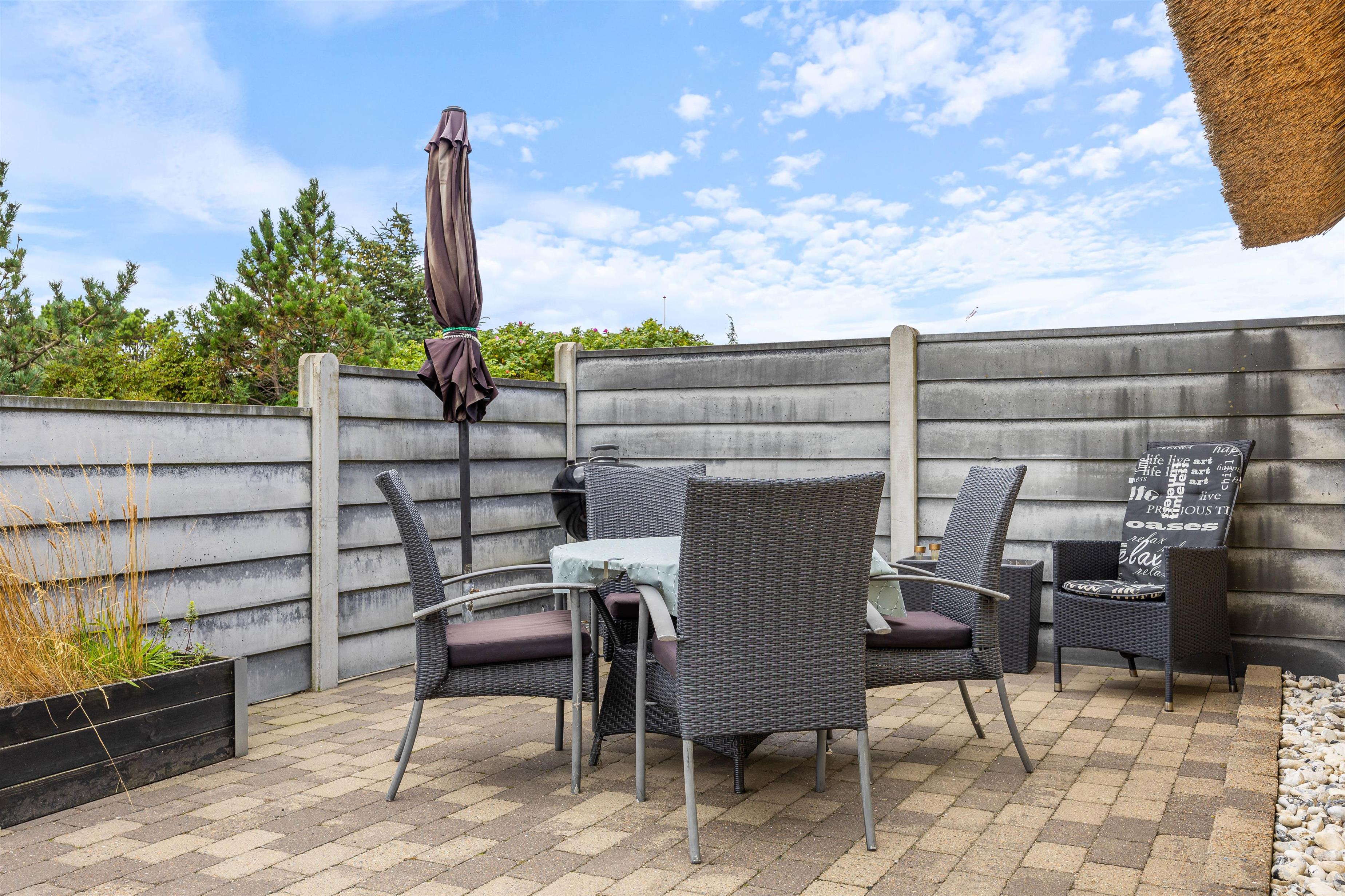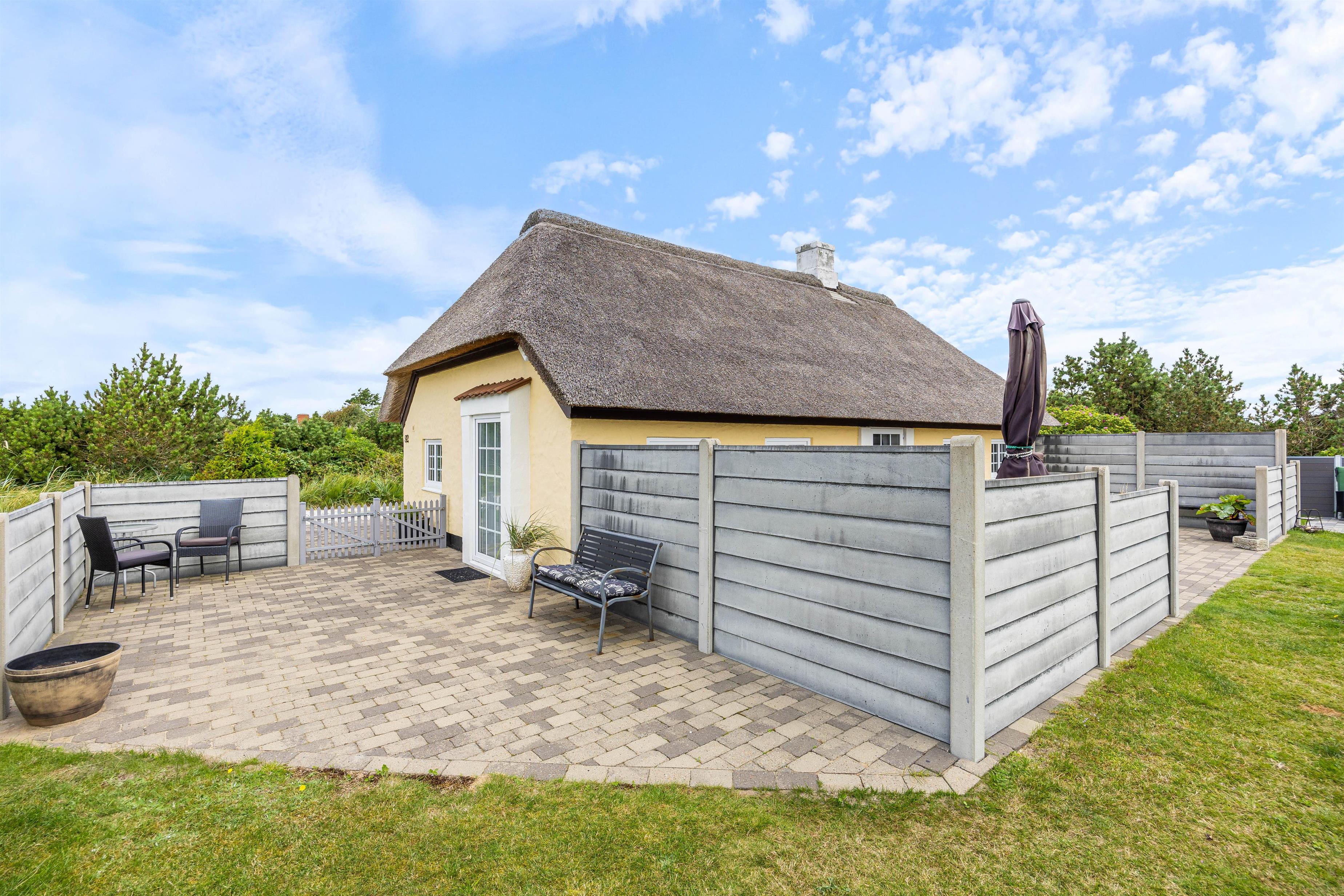 Terrassen og sommerhuset ligger på en skøn indhegnet grund, som er kombineret af en græsplæne, natur og klitlandskab. Her er der fri mulighed for at slippe mindre børn fri, så de kan undersøge området. Desuden er der også gode muligheder for underholdning til børnene, da der er et gyngestativ, og ellers kan I medbringe nogle sjove havespil, som hele familien kan være med til.