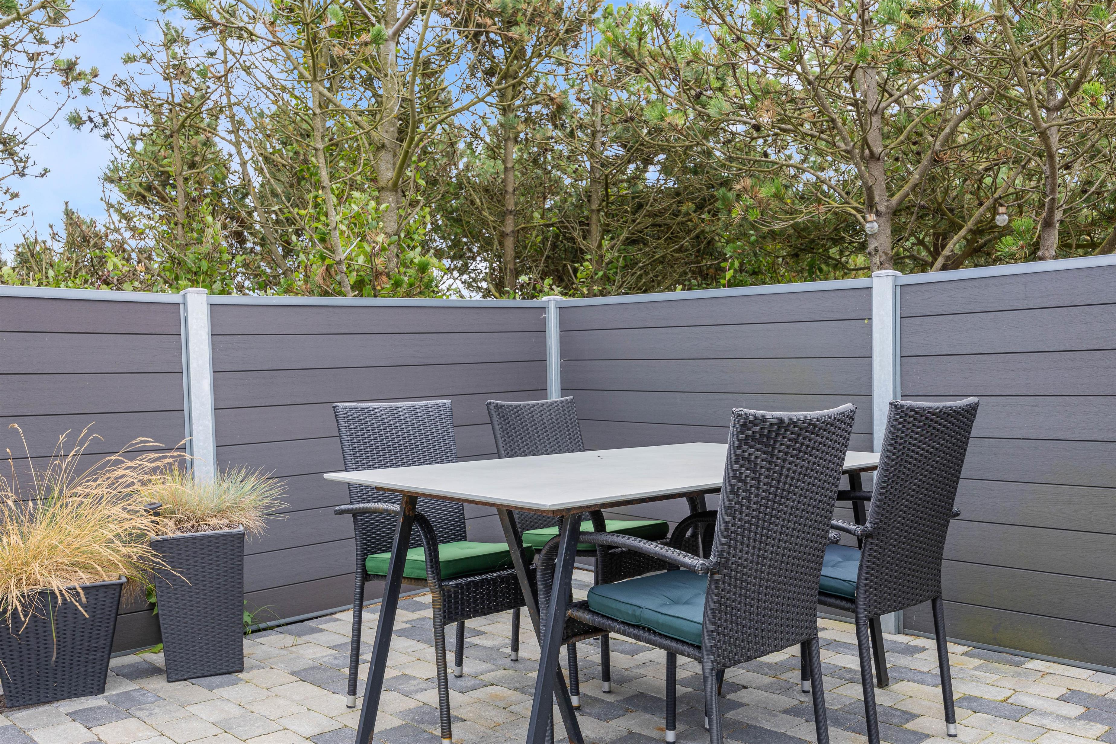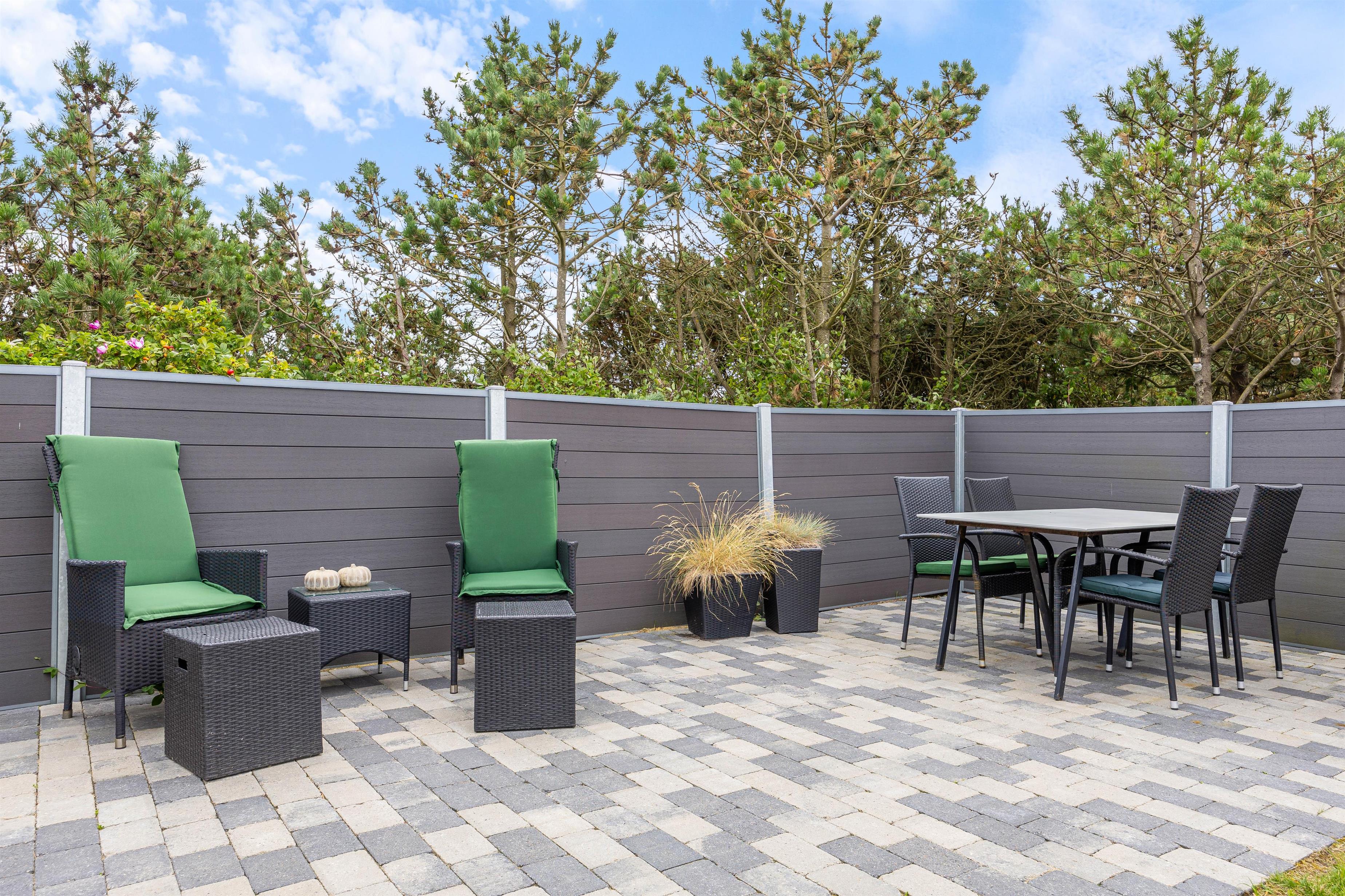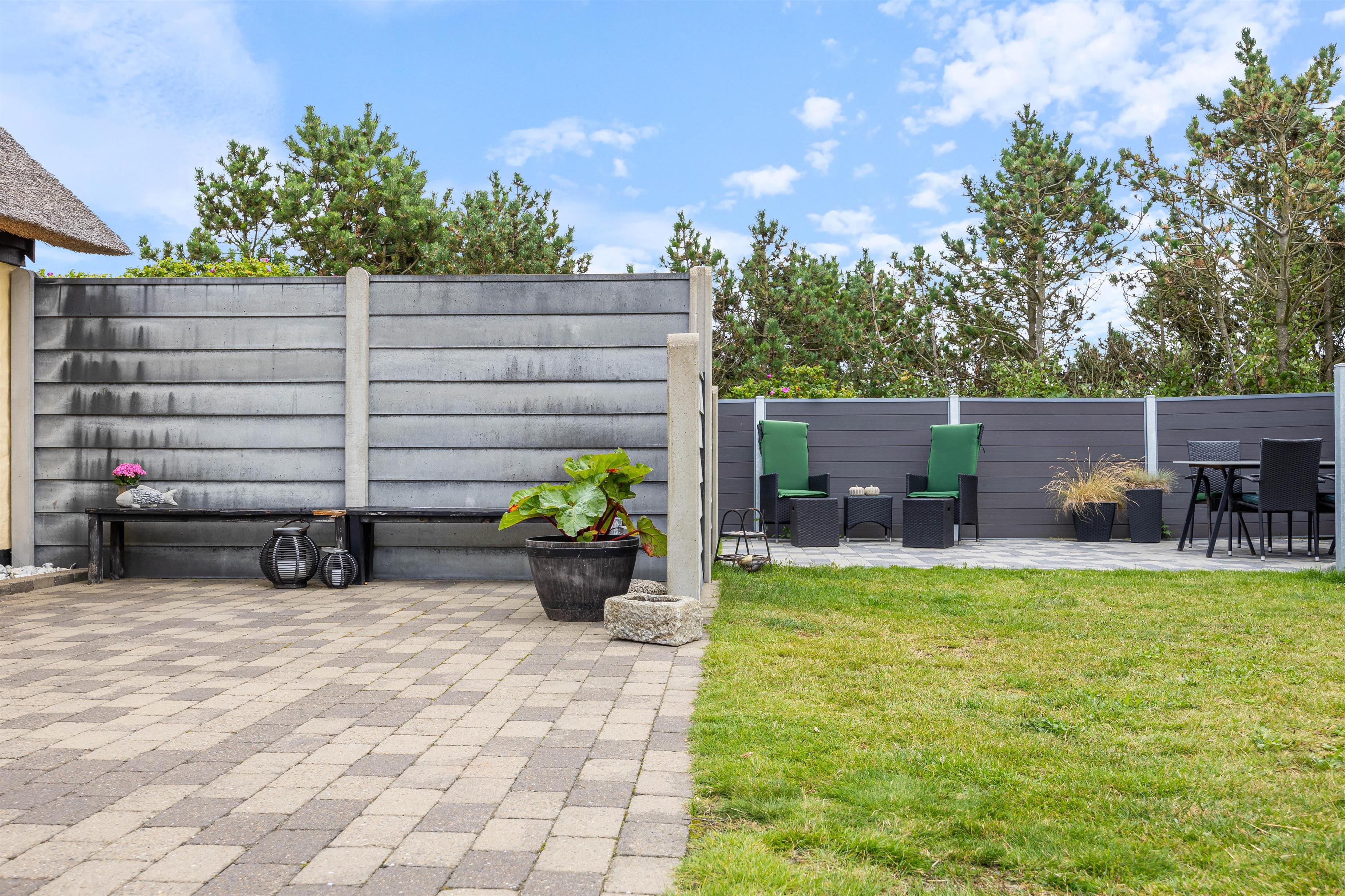 Afskærmet terrassehygge på en indhegnet plænegrund