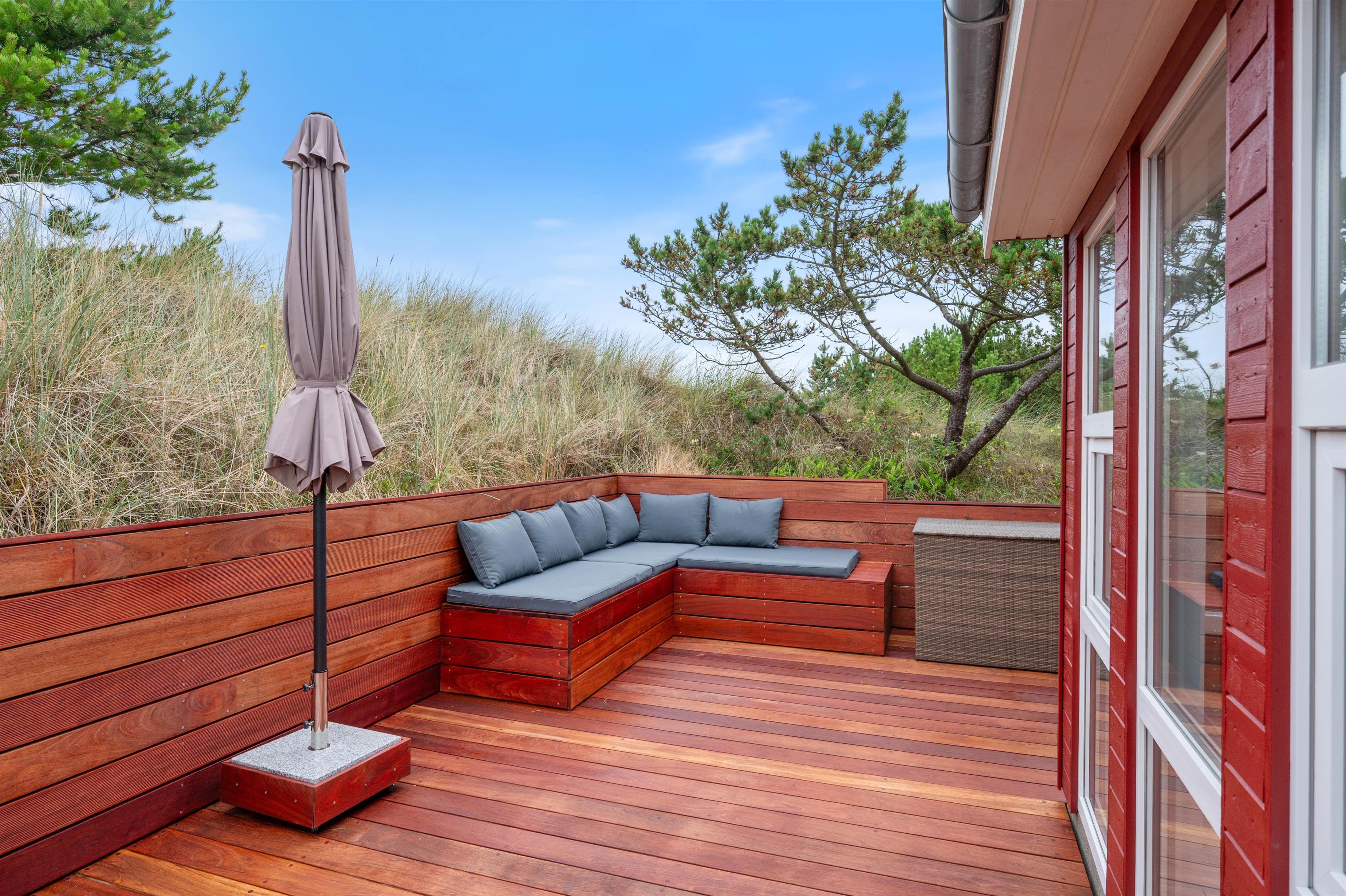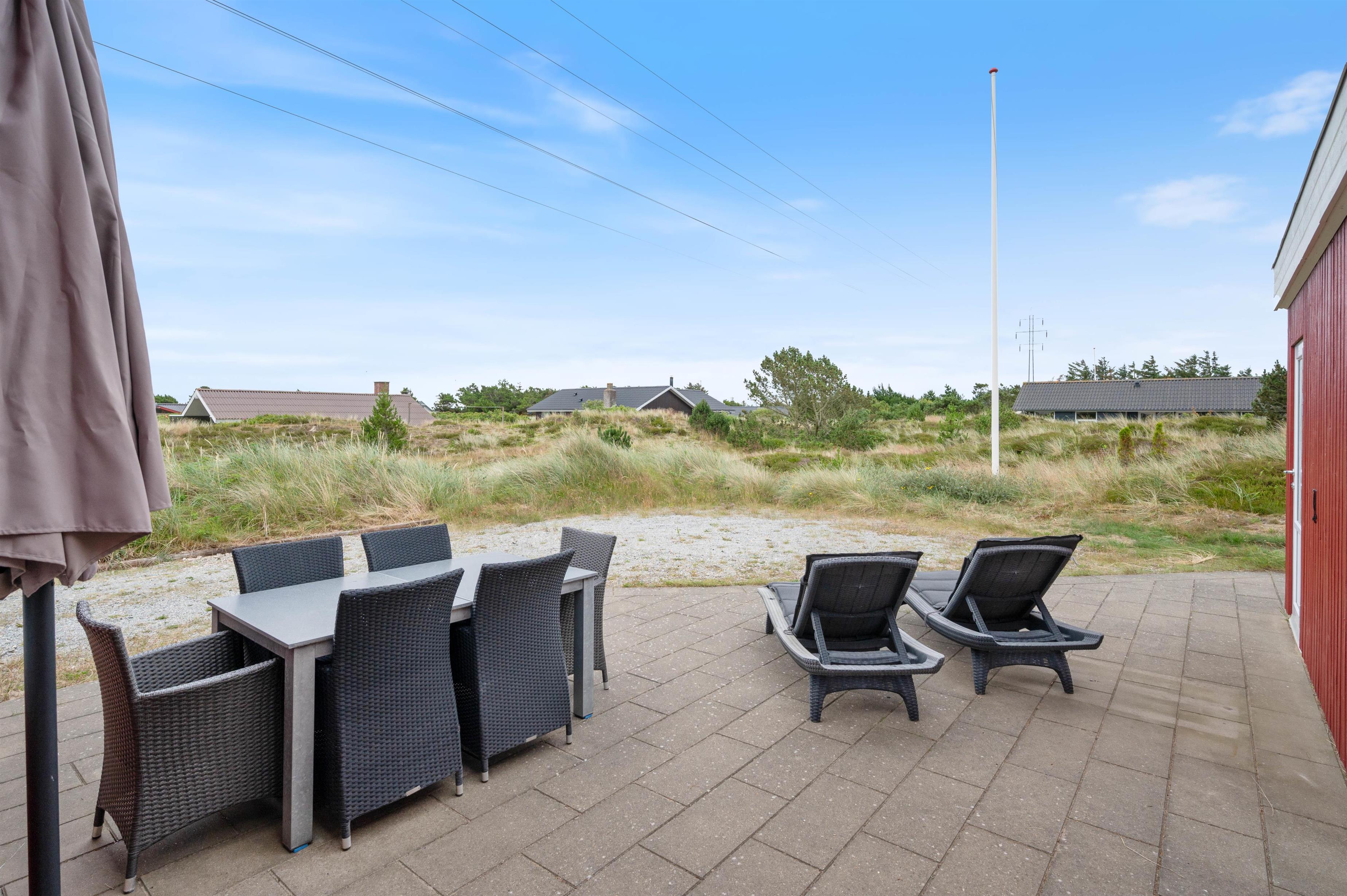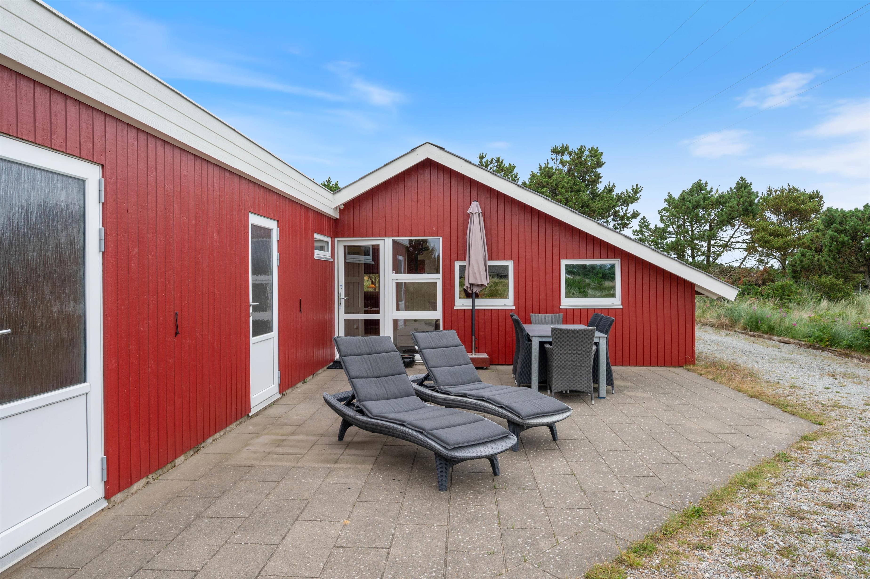 Sommerhuset er placeret med en skøn sydlig terrasse, som, sammen med den vestligt beliggende klit, giver både dejlig læ og privatliv. Terrassen mod syd er delvist afskærmet ligesom terrassen mod vest. Der er mange muligheder for skønne vandreture i det smukke landskab omkring Nr. Lyngvig Fyr, ligesom der kun er 750 m til Vesterhavet.