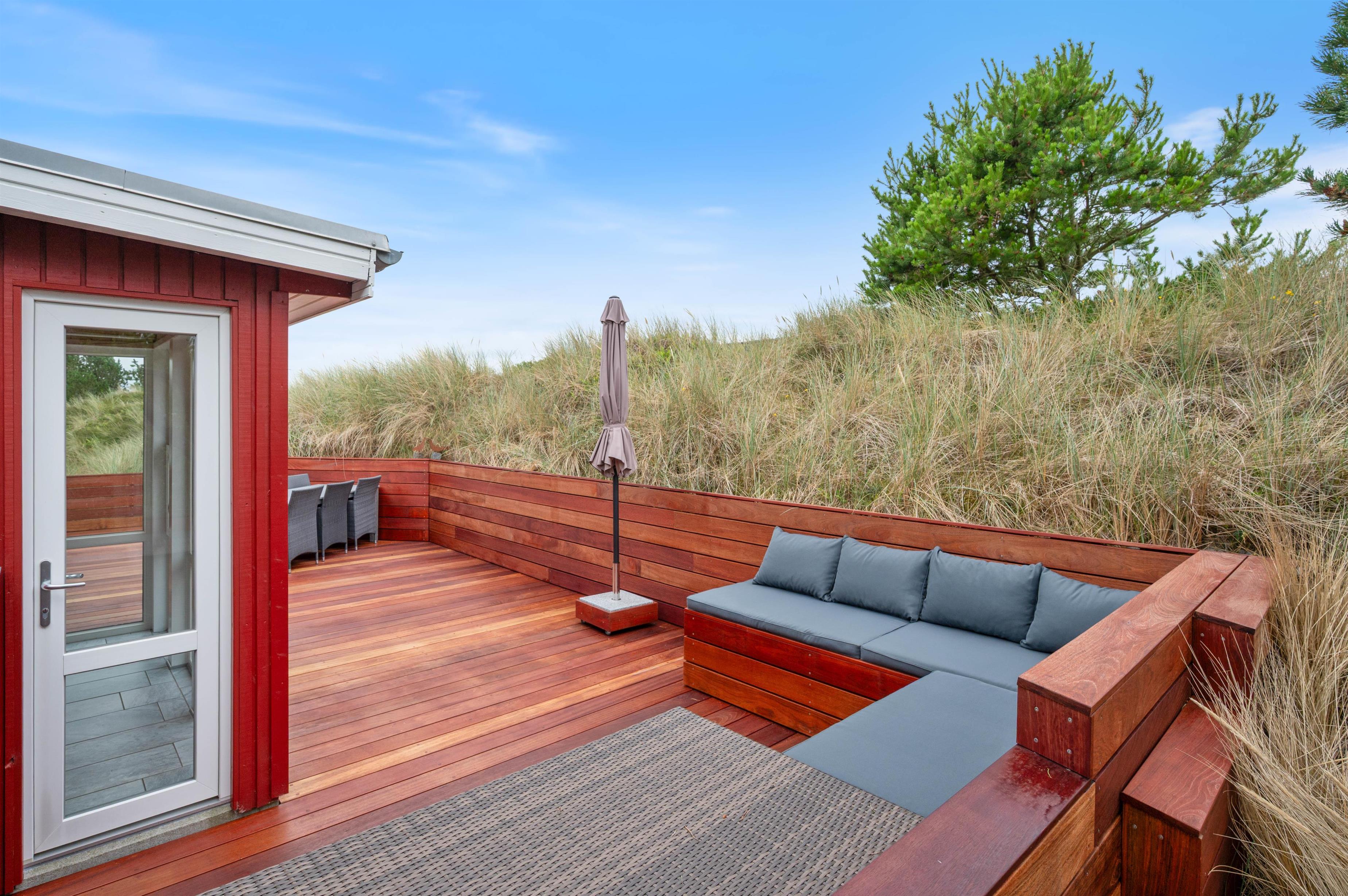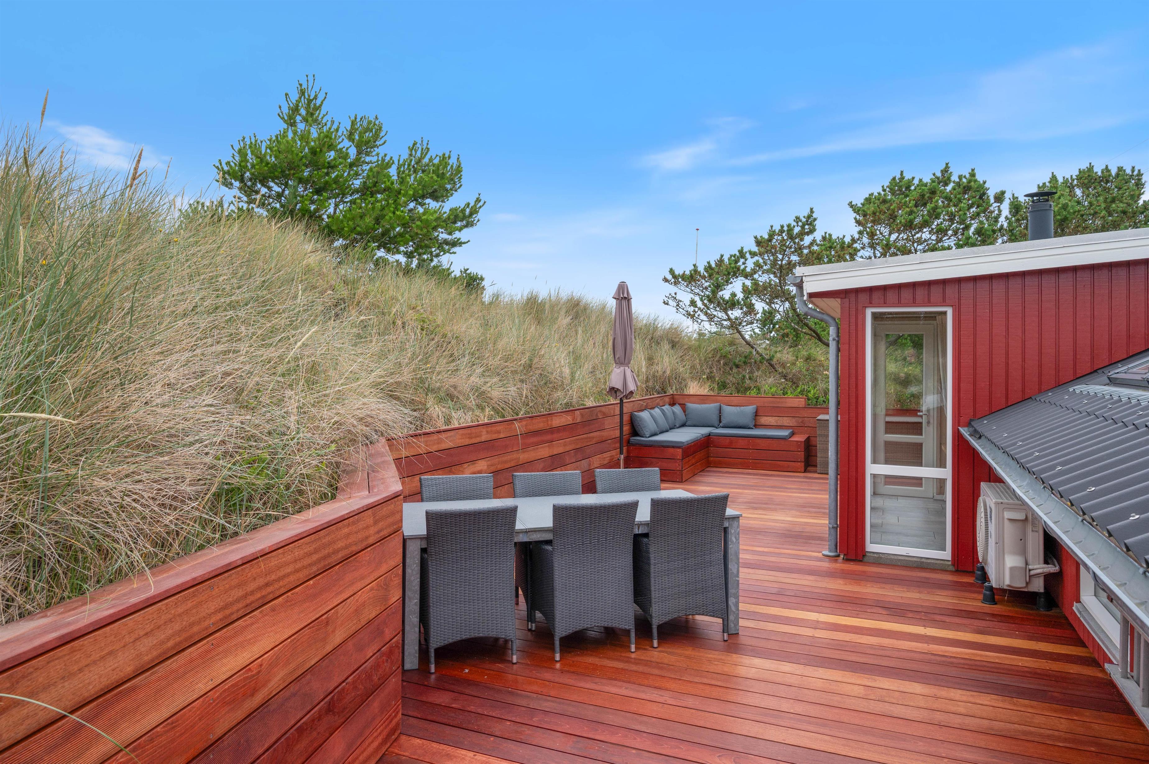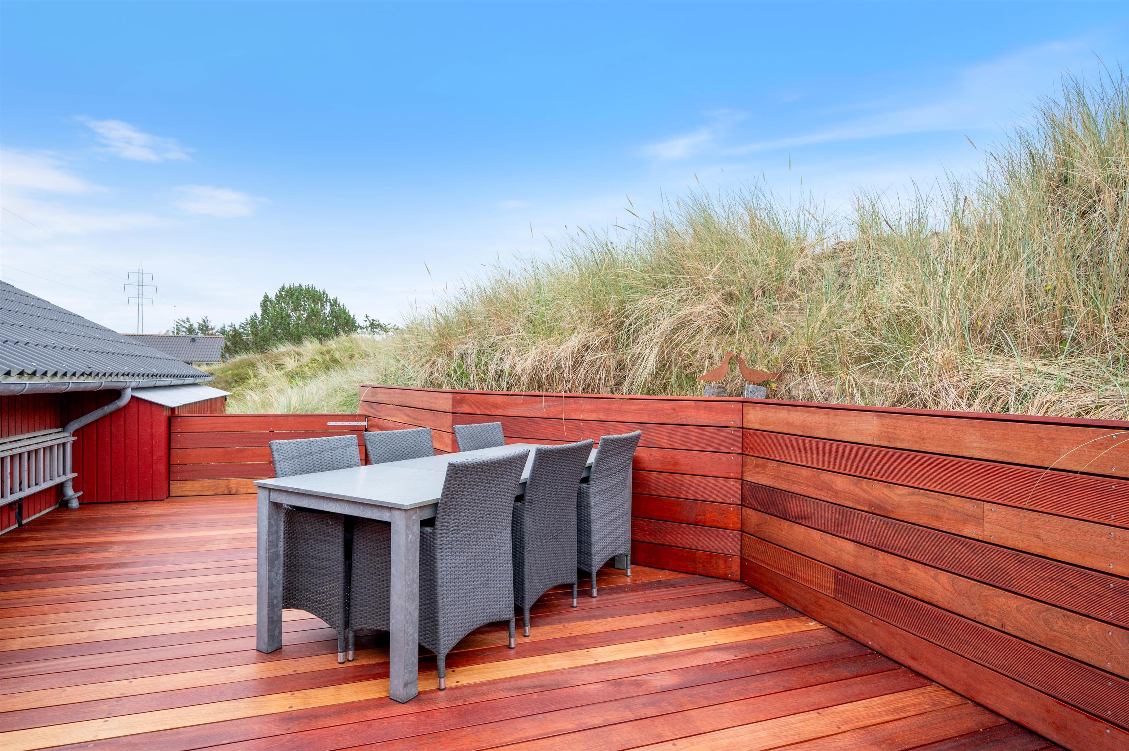 Sommerhuset er placeret med en skøn sydlig terrasse, som, sammen med den vestligt beliggende klit, giver både dejlig læ og privatliv. Terrassen mod syd er delvist afskærmet ligesom terrassen mod vest. Der er mange muligheder for skønne vandreture i det smukke landskab omkring Nr. Lyngvig Fyr, ligesom der kun er 750 m til Vesterhavet.