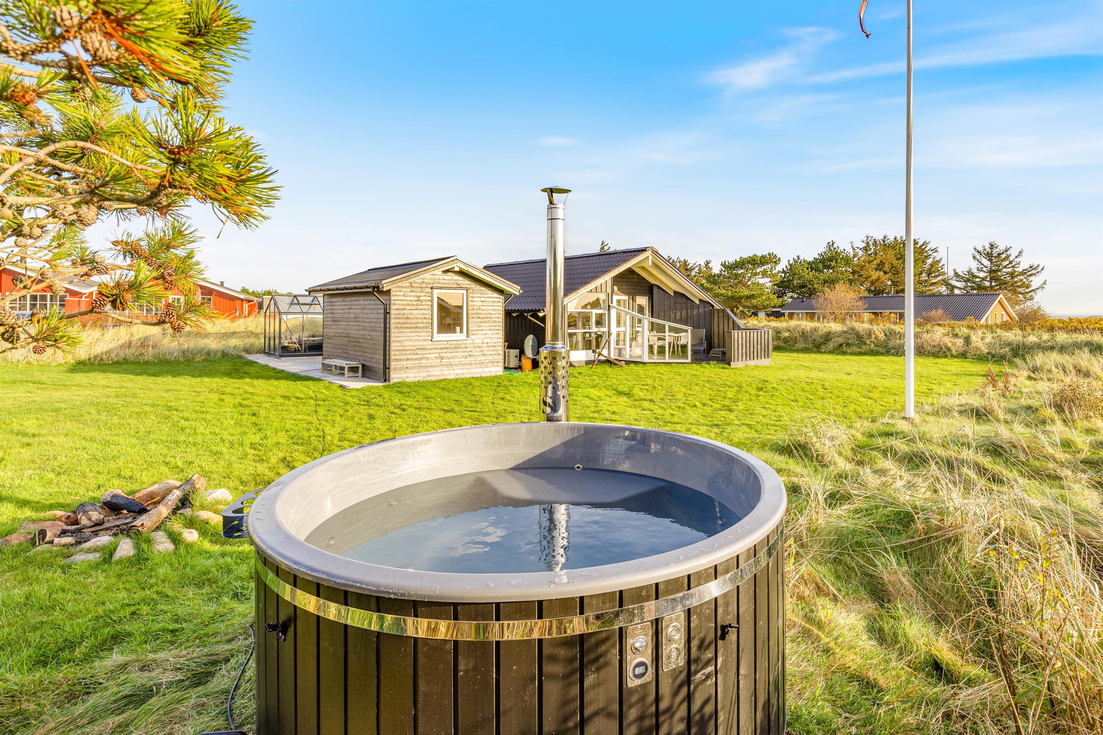 Udenfor finder I en dejlig terrasse med hyggelige kroge - her er masser af plads til at nyde solen, grille aftensmaden eller slappe af i liggestolene med en god bog. Havemøblerne er klar til udendørsmiddage, og de hyggelige kroge sikrer, at I kan finde en solplet uanset vindretningen. Når I trænger til at komme helt ned i gear, kan I sætte jer ned i vildmarksbadet og nyde roen.