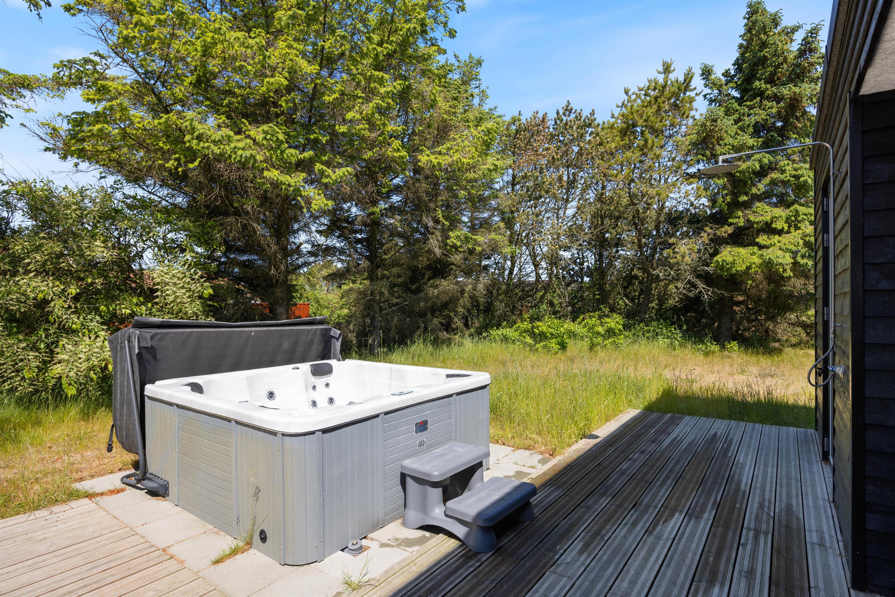 Ud over et udendørs spabad er terrassen udstyret med en udendørs bruser, så I fra april til november kan få jer et skyl i den friske luft. Indenfor kan I tænde op i sommerhusets sauna og læne jer tilbage i varmen.